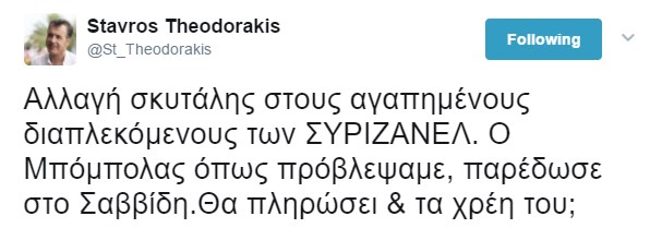 Ο κ. Θεοδωράκης σε ανάρτησή του στο Twitter σημειώνει ακόμα: «Ο Μπόμπολας όπως προβλέψαμε, παρέδωσε στο Σαββίδη.Θα πληρώσει & τα χρέη του;».