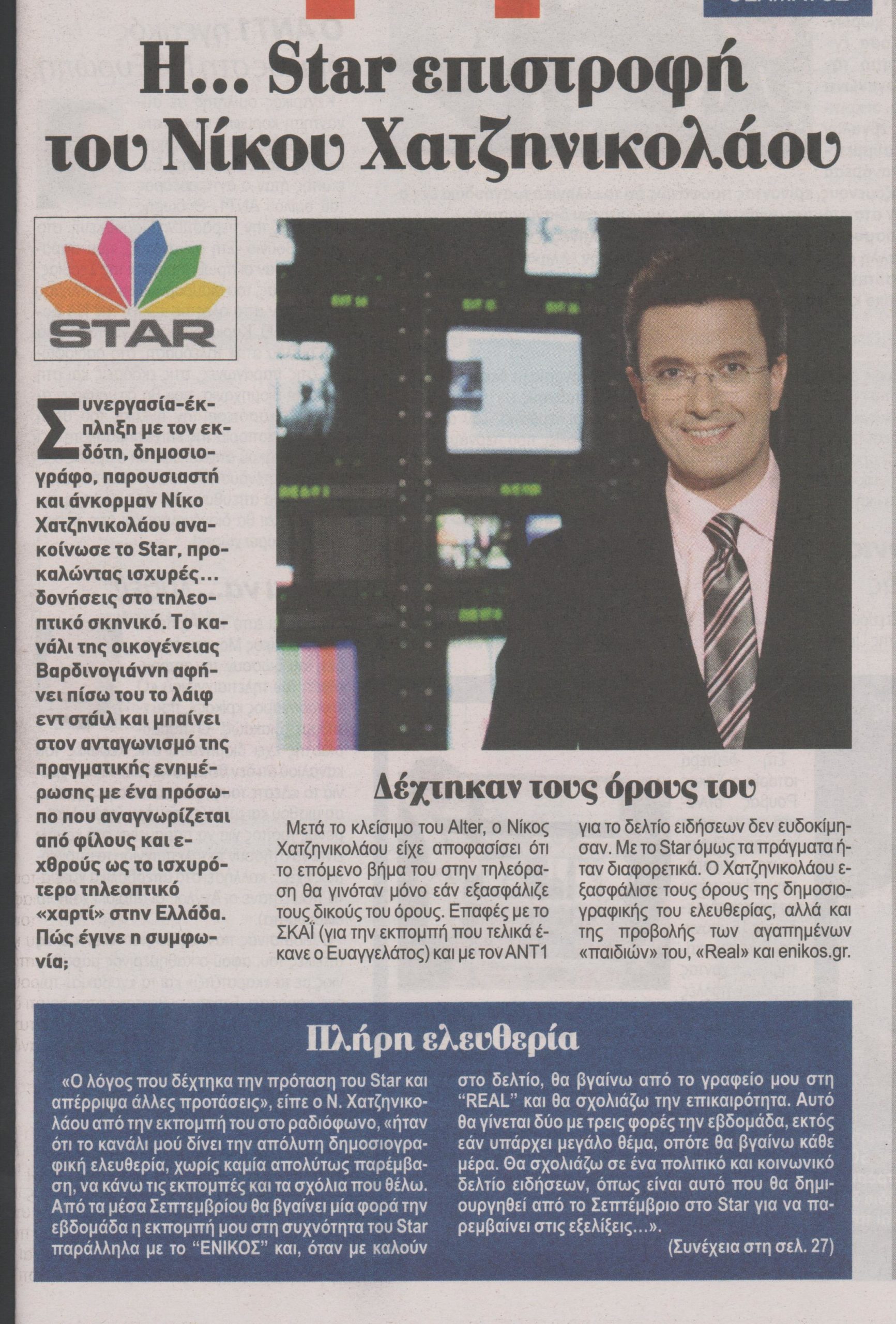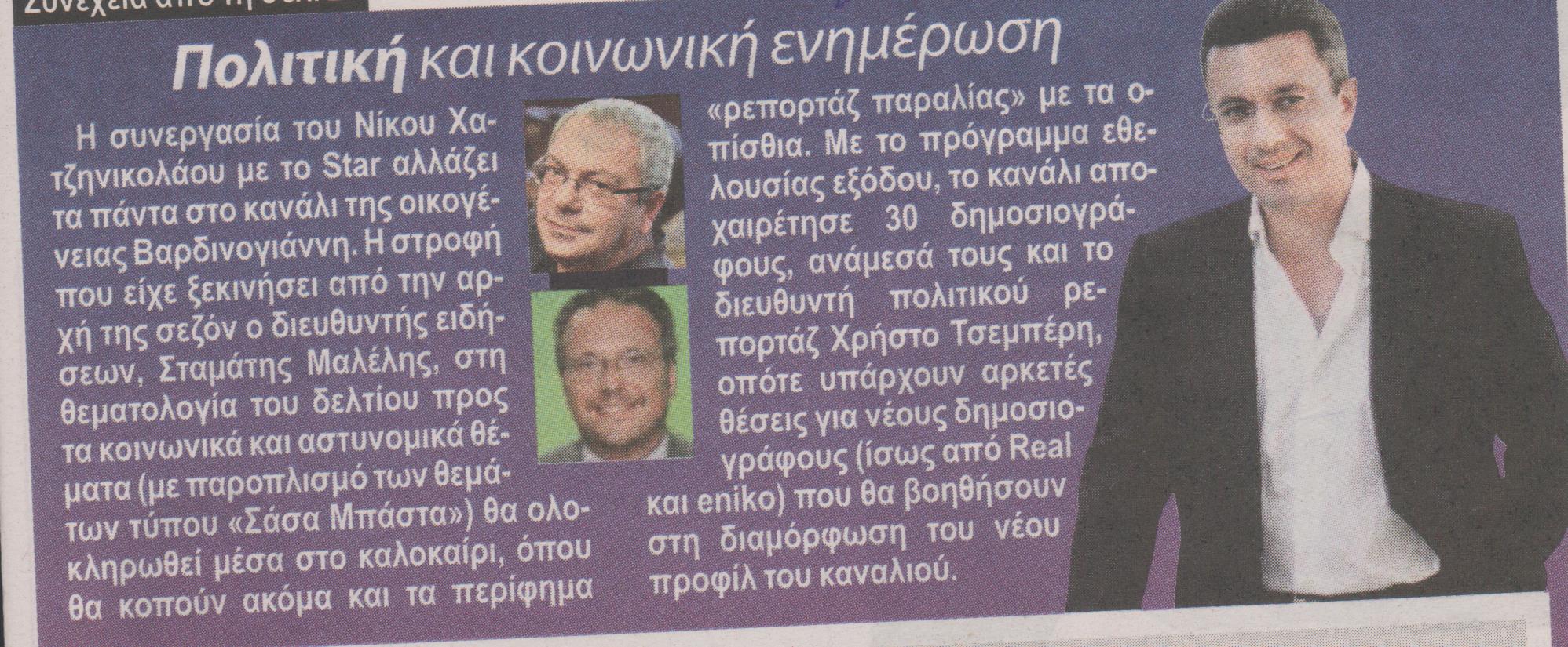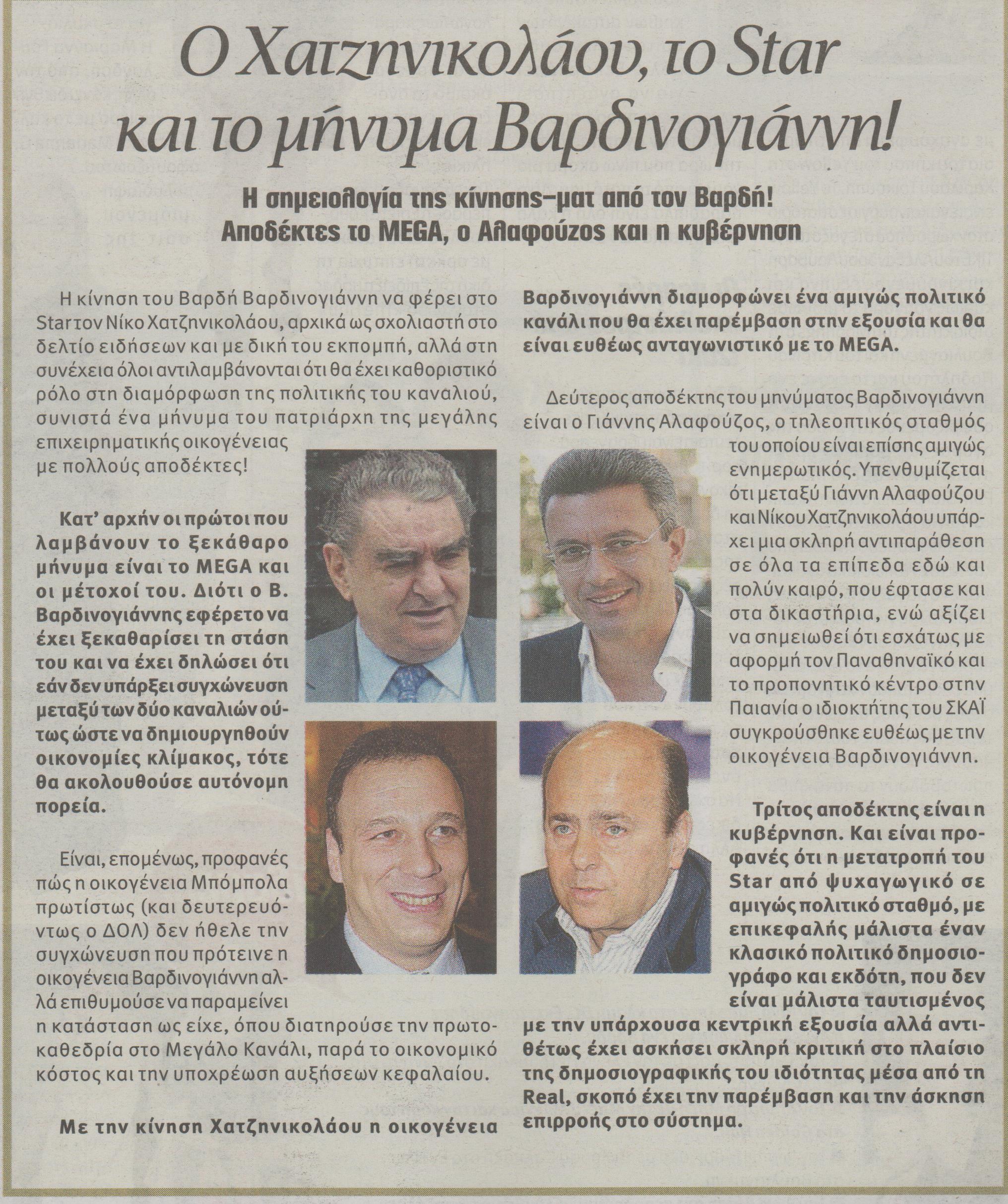 Το δημοσίευμα της εφημερίδας “Η Αξία” με τίτλο ” Ο Χατζηνικολάου, το Star και το μήνυμα Βαρδινογιάννη” αναφέρει: