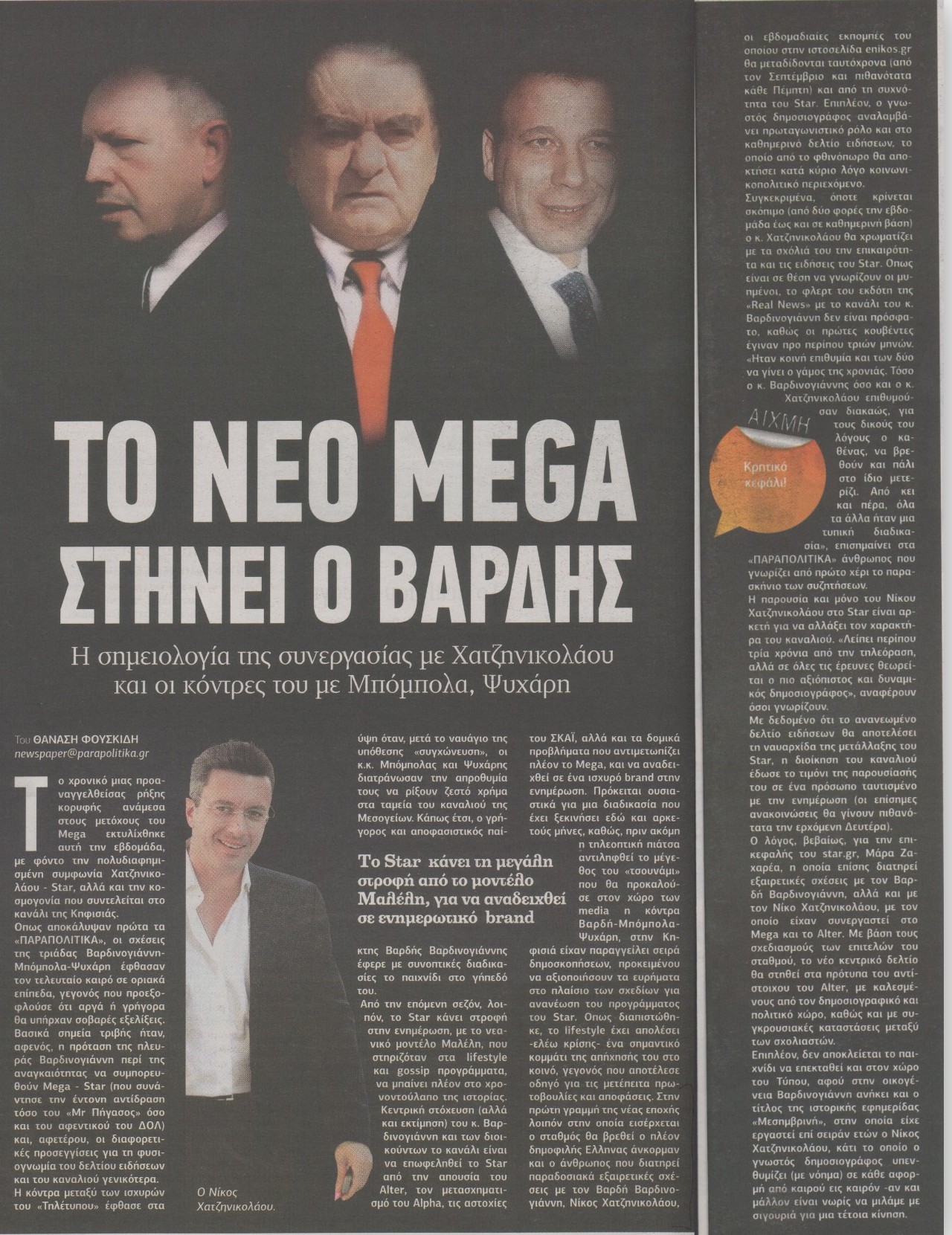 Το δημοσίευμα της εφημερίδας “Παραπολιτικά” έχει τον τίτλο”Το νέο Mega στήνει ο Βαρδής”.
