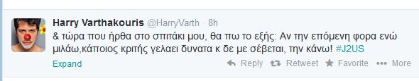 Ο Χάρης Βαρθακούρης που συμμετέχει στο σόου έγραψε στο twitter μετά το τέλος του σόου: “Και τώρα που ήρθα στο σπιτάκι μου, θα πω το εξής: Αν την επόμενη φορά ενώ μιλάω, κάποιος κριτής γελάει δυνατά και δεν με σέβεται, θα την κάνω”.