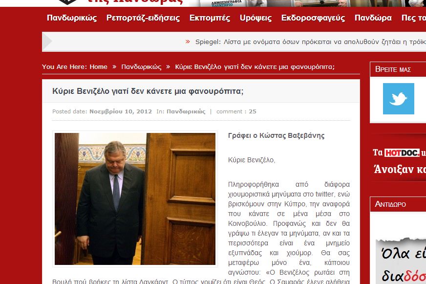 Πληροφορήθηκα από διάφορα χιουμοριστικά μηνύματα στο twitter, ενώ βρισκόμουν στην Κύπρο, την αναφορά που κάνατε σε μένα μέσα στο Κοινοβούλιο. Προφανώς και δεν θα γράψω τι έλεγαν τα μηνύματα, αν και τα περισσότερα είναι ένα μνημείο εξυπνάδας και χιούμορ. Θα σας μεταφέρω μόνο ένα, κάποιου αγνώστου: «Ο Βενιζέλος ρωτάει στη Βουλή πού βρήκες τη λίστα Λαγκάρντ. Ο τύπος νομίζει ότι είναι Θεός. Ο Σαμαράς έλεγε αλήθεια ότι μιλάει με το Θεό».