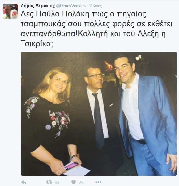 «Δες Παύλο Πολάκη πως ο πηγαίος τσαμπουκάς σου πολλές φορές σε εκθέτει ανεπανόρθωτα! Κολλητή και του Αλέξη η Τσικρίκα;», ήταν η απάντηση του Δήμου Βερύκιου, ο οποίος συνόδεψε το tweet με μία φωτογραφία της δημοσιογράφου, με τον Πρωθυπουργό, Αλέξη Τσίπρα.