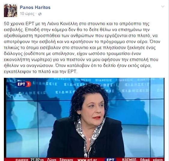 Συγκεκριμένα, ο κ. Χαρίτος έγραψε στο Facebook: «50 χρόνια ΕΡΤ με τη Λιάνα Κανέλλη στο στούντιο και το απρόοπτο της εισβολής. Επειδή στην κάμερα δεν θα το δείτε θέλω να επισημάνω την αξιοθαύμαστη προσπάθεια των ανθρώπων που εργάζονται στο πλατό, να αποτρέψουν την εισβολή και να κρατήσουν το πρόγραμμα στον αέρα. Όταν τελικώς τα άτομα εισέβαλαν στο στούντιο και με πλησίασαν ξεκίνησε ένας διάλογος (ουδέποτε με απείλησαν, είχαν ωστόσο τραυματίσει έναν εικονολήπτη νωρίτερα) για να πειστούν να μου αφήσουν την επιστολή που ήθελαν να αναγνώσουν. Όταν κατάλαβαν ότι το δελτίο ήταν εκτός αέρα, εγκατέλειψαν το πλατό και την ΕΡΤ».