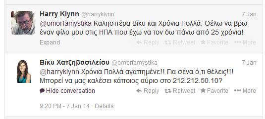 Χάρρυ Κλυνν καλεί Βίκυ Χατζηβασιλείου. Ένα παράξενο tweet έλαβε η παρουσιάστρια του Alpha “Πάμε Πακέτο” με τον δημοφιλή κωμικό να της γράφει: “Καλησπέρα Βίκυ και χρόνια πολλά. Θέλω να βρω έναν φίλο στις ΗΠΑ, που έχω να τον δω εδώ και 25 χρόνια”. Αμέσως εκείνη του απάντησε” “Χρόνια Πολλά αγαπημένε. Για σένα ό,τι θέλεις. Μπορεί να μας καλέσει κάποιος αύριο στο 212.2125010”.