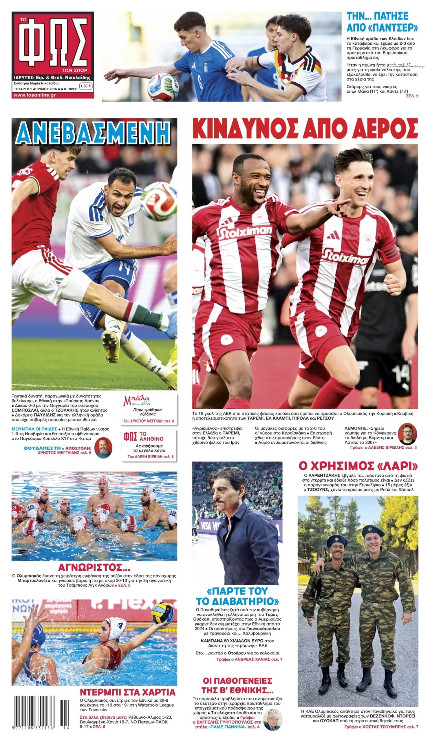 Οι αθλητικές εφημερίδες 1/4/2026 Enikos Newsroom 05:43, Τετάρτη 01 Απριλίου 2026 Media Διαβάστε τα πρωτοσέλιδα από τις αθλητικές εφημερίδες, σήμερα 1/4/2026. ΑΘΛΗΤΙΚΕΣ ΕΦΗΜΕΡΙΔΕΣ ΕΦΗΜΕΡΙΔΕΣ ΠΡΩΤΟΣΕΛΙΔΑ Μοιράσου το: Euroleague: «Τσουχτερό» πρόστιμο συνολικού ύψους 50.000 ευρώ στον Δημήτρη Γιαννακόπουλο Μουντιάλ 2026 (Playoffs): «Κάζο» για την Ιταλία που αποκλείστηκε στα πέναλτι από Βοσνία – Προκρίθηκαν Τσεχία, Τουρκία και Σουηδία – Αναλυτικά τα αποτελέσματα και οι όμιλοι Τόμας Γουόκαπ: Απάντησε και ο γκαρντ του Ολυμπιακού στον Παναθηναϊκό σχετικά με το αίτημα ανάκλησης του ελληνικού διαβατηρίου του σχολίασε κι εσύ (0 σχόλια) Ακολουθήστε το Enikos στο Google News και μάθετε πρώτοι όλες τις ειδήσεις Δείτε όλες τις τελευταίες ειδήσεις από την Ελλάδα και τον Κόσμο στο enikos.gr Ειδήσεις Ροή Ειδήσεων 23 ώρες πριν LIVE – 32η ημέρα πολέμου ΗΠΑ – Ισραήλ με Ιράν – Οι εξελίξεις στη Μέση Ανατολή 9 ώρες πριν New York Times: Η Αμερική εγκαταλείπει την ηθική; – Η στρατηγική του «θεαματικού πολέμου», οι απειλές Τραμπ και ο κίνδυνος για τους αμάχους στο Ιράν 8 ώρες πριν Νέες μαρτυρίες για το θρίλερ στου Ζωγράφου: «Αυτό με έκανε να σκεφτώ ότι οι 2 γυναίκες είναι νεκρές» – Δεν έδωσε απαντήσεις η νεκροψία, αναμένονται οι τοξικολογικές 55 λεπτά πριν ΕΕ: Πρόταση για δέσμη μέτρων όπως τηλεργασία και Κυριακές χωρίς ΙΧ λόγω της ενεργειακής κρίσης 10 ώρες πριν Αμπελόκηποι: Η στιγμή που απομακρύνουν τα κατσίκια και τα άλλα ζώα από την ταράτσα του πολυώροφου κτιρίου – Δείτε βίντεο 1 ώρα πριν Οπτική ψευδαίσθηση: Μόνο όσοι έχουν τέλεια όραση μπορούν να εντοπίσουν το φίδι μέσα σε 11 δευτερόλεπτα 1 ώρα πριν Δρεπανοκυτταρική αναιμία: Νέα μελέτη αποκαλύπτει τον τρόπο με τον οποίο επηρεάζει την λειτουργία του εγκεφάλου 4 ώρες πριν Ζώδια 1/4: Ημερήσιες προβλέψεις – Λέοντες, κάντε κουβέντες που θα σας βοηθήσουν να δείτε τα πράγματα αλλιώς 8 ώρες πριν Ανακάλυψη-έκπληξη σε εργοτάξιο – Αρχαιολόγοι εντόπισαν μεγαλιθικό τάφο 5.000 ετών 4 λεπτά πριν Οι αθλητικές μεταδόσεις της Τετάρτης (1/4) 24 λεπτά πριν Δυο ακόμα περιστατικά σεξουαλικής βίας σε Πειραιά και Κολωνό – Σύλληψη ενός «δράκου», αναζητείται ο δεύτερος (Βίντεο) 40 λεπτά πριν ΔΕΔΔΗΕ: Διακοπές ρεύματος σήμερα (1/4) στην Αθήνα και σε άλλες 7 περιοχές της Αττικής 55 λεπτά πριν ΕΕ: Πρόταση για δέσμη μέτρων όπως τηλεργασία και Κυριακές χωρίς ΙΧ λόγω της ενεργειακής κρίσης 1 ώρα πριν Οπτική ψευδαίσθηση: Μόνο όσοι έχουν τέλεια όραση μπορούν να εντοπίσουν το φίδι μέσα σε 11 δευτερόλεπτα ENIKOS NETWORK Μαθηματικός γρίφος: Βρείτε ποιον αριθμό κρύβουν τα φρούτα και τα λαχανικά και λύστε την πράξη σε 27 δευτερόλεπτα Το σκουρόχρωμο όσπριο της αρχαιότητας που είναι υπερβολικά θρεπτικό και μπορεί να ελέγξει το σάκχαρο e- ΕΦΚΑ: Παρουσίασε στη Λάρισα το νέο Ολοκληρωμένο Πληροφοριακό Σύστημα – Ψηφιακή αναβάθμιση για πολίτες και επιχειρήσεις Ε.Ε.: Προετοιμάζει ενεργειακή εργαλειοθήκη για την προστασία των νοικοκυριών καθώς το κόστος ενέργειας από τον πόλεμο του Ι... Εγκεφαλικό επεισόδιο: Η «κρυφή» αναζωογόνηση του εγκεφάλου στην προσπάθεια για ανάρρωση Κουίζ: Πόσο καλός είσαι στην ελληνική μυθολογία; Δοκίμασε τις γνώσεις σου και κάνε το 3 στα 3 περισσότερα 05:53 , Τετάρτη 01 Απριλίου 2026 Σαν σήμερα 1 Απριλίου: Τα σημαντικότερα γεγονότα της ημέρας Διαβάστε τα σημαντικότερα γεγονότα που έγιναν σαν σήμερα στην Ελλάδα και τον κόσμο. Επέτειοι: ... 05:16 , Τετάρτη 01 Απριλίου 2026 MasterChef: Ποιοι είναι οι δύο υποψήφιοι προς αποχώρηση