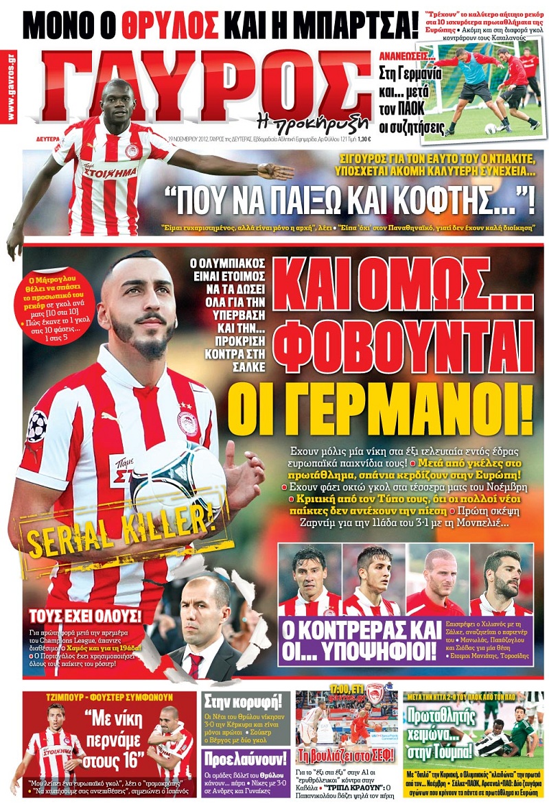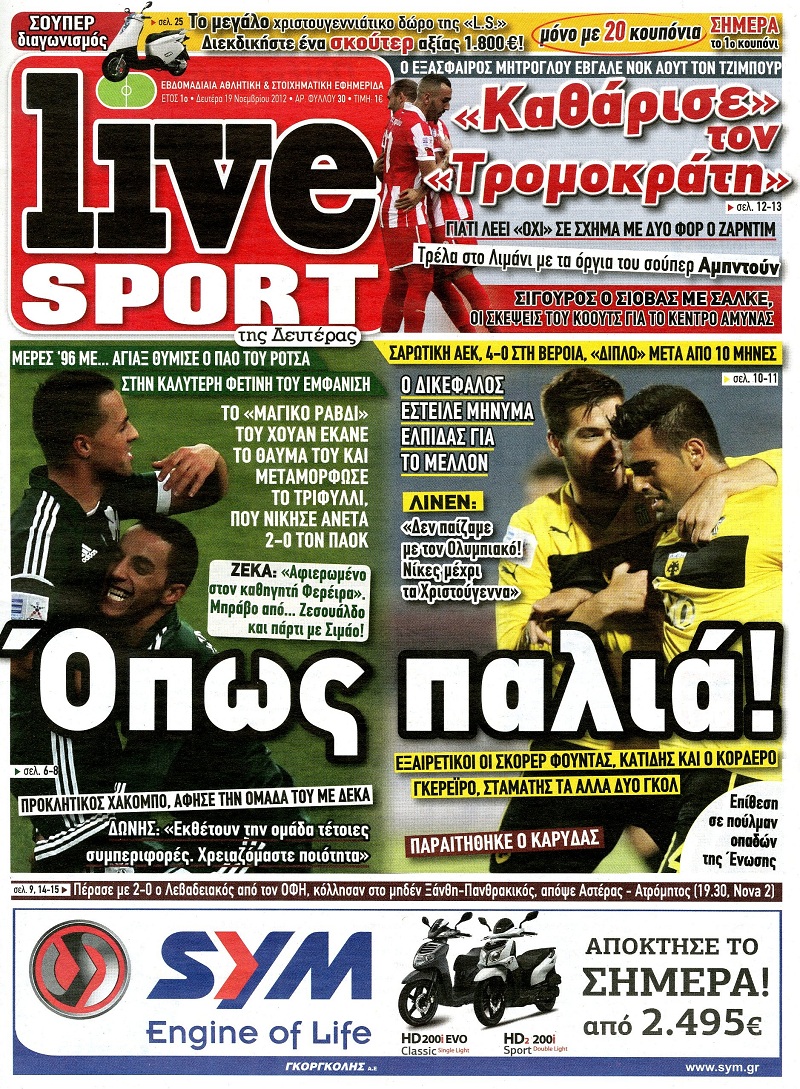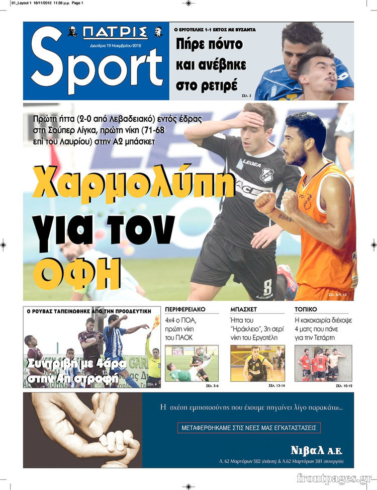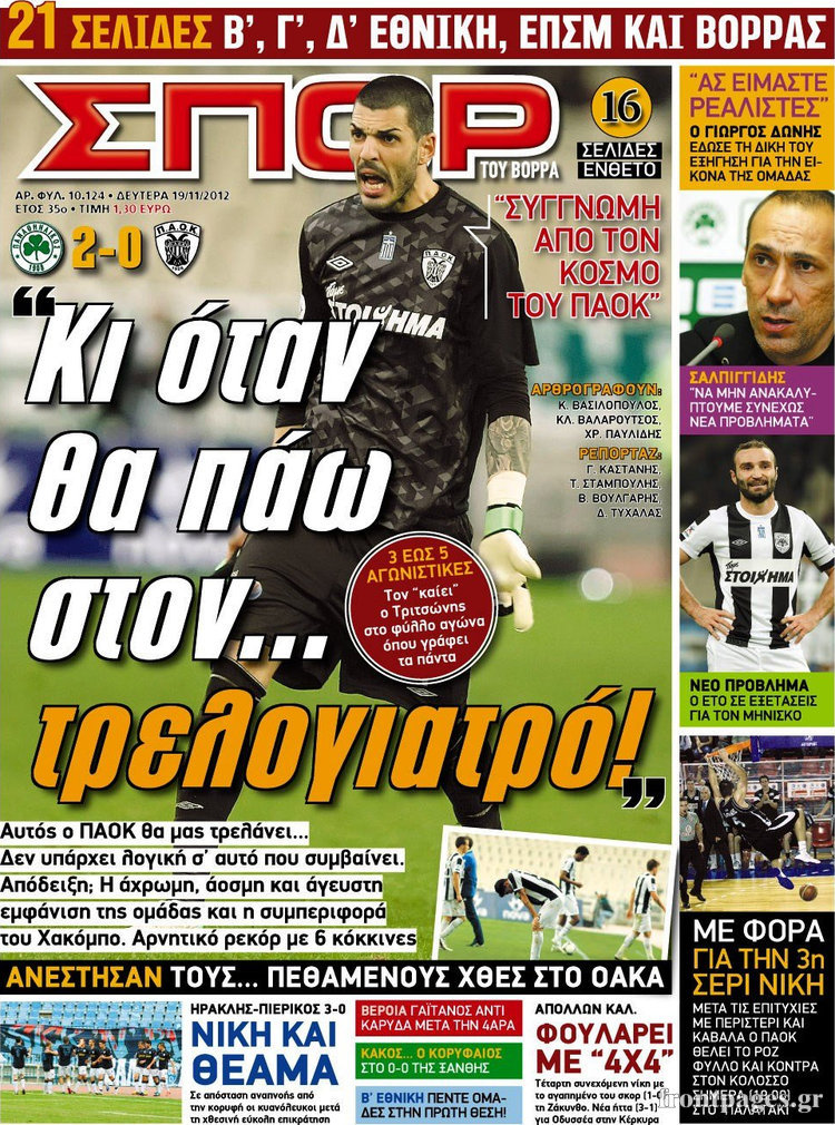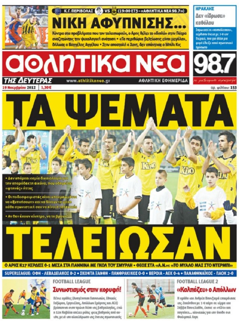 Οι αθλητικές εφημερίδες Enikos Newsroom 08:56, Δευτέρα 19 Νοεμβρίου 2012 Media Οι αθλητικές εφημερίδες Τα σημερινά πρωτοσέλιδα των αθλητικών εφημερίδων. ΑΘΛΗΤΙΚΑ ΑΘΛΗΤΙΚΕΣ ΕΦΗΜΕΡΙΔΕΣ ΕΦΗΜΕΡΙΔΕΣ ΠΡΩΤΟΣΕΛΙΔΑ Μοιράσου το: σχολίασε κι εσύ (0 σχόλια) Ακολουθήστε το enikos.gr στο Google News και μάθετε πρώτοι όλες τις ειδήσεις Δείτε όλες τις τελευταίες ειδήσεις από την Ελλάδα και τον Κόσμο στο enikos.gr Ειδήσεις Ροή Ειδήσεων 2 ώρες πριν Νίκος Παππάς: «Είχα λάθος αντίδραση στη δική του δράση-πρόκληση – Δεν θα αναλύσω σε τι κατάσταση ήταν ο δημοσιογράφος» 33 λεπτά πριν Αλεξανδρούπολη: Πολυοργανική ανεπάρκεια λόγω υποσιτισμού η αιτία θανάτου του 3χρονου αγοριού 1 ώρα πριν Δημοσκόπηση Pulse: Η διαφορά ΝΔ-ΠΑΣΟΚ – Με ποια κριτήρια θα ψηφίσουν οι πολίτες στις επόμενες εκλογές 1 ώρα πριν Αγρότες: Άνοιξαν τον μεθοριακό σταθμό του Προμαχώνα – Κανονικά περνούν τα φορτηγά 3 ώρες πριν Συγκλονιστικό βίντεο: Τρόμος για τουρίστες που σώθηκαν την τελευταία στιγμή από λεωφορείο που κατρακυλούσε σε φαράγγι 1 ώρα πριν Αριθμολογία: Οι άνθρωποι που έχουν γεννηθεί αυτές τις 4 ημερομηνίες, είναι τρυφεροί και αγαπούν ανιδιοτελώς 3 ώρες πριν Οι άνθρωποι που θυμούνται τα όνειρά τους, συνήθως μοιράζονται αυτά τα 6 σπάνια χαρακτηριστικά 2 ώρες πριν Καθρέφτες μπάνιου: Το απλό κόλπο με την οδοντόκρεμα για να μην θολώνουν 13 ώρες πριν 20 χρόνια τα Χριστούγεννα ξεκινούν στα Public με μεγάλη ποικιλία σε δώρα! 41 δευτερόλεπτα πριν Συγγενείς θυμάτων τρομοκρατίας: «Ο Κουφοντίνας να μην πάρει με κρατικά χρήματα, αυτό που κάποτε “αγόραζε” με αίμα» 5 λεπτά πριν Ύπνος: Ειδικός εξηγεί τον πραγματικό λόγο που ξυπνάτε στις 4 τα ξημερώματα – Ο ρόλος των ορμονών και του κιρκάδιου ρυθμού 17 λεπτά πριν Μαρίζα Ρίζου: «Θυμάμαι ότι ενώ ο μπαμπάς μου δεν πίνει, ερχόταν οριακά μεθυσμένος στο live από το άγχος του» 26 λεπτά πριν Δημοσκόπηση MRB: Πρώτη η ΝΔ με 22,6%, στο 10,9% το ΠΑΣΟΚ – Το 80% των πολιτών στηρίζει τους αγρότες, τι λένε για Τσίπρα και Καρυστιανού 33 λεπτά πριν Αλεξανδρούπολη: Πολυοργανική ανεπάρκεια λόγω υποσιτισμού η αιτία θανάτου του 3χρονου αγοριού ENIKOS NETWORK Αϋπνία: Το κόλπο που θα σας βοηθήσει να κοιμηθείτε απόψε – Είναι απλό και έχει αποτέλεσμα 2,6 εκατομμύρια πολίτες έχουν ήδη εμβολιαστεί κατά της γρίπης ΑΑΔΕ: Καταβλήθηκε η τέταρτη δόση επιστροφής ΕΦΚ αγροτικού πετρελαίου – Οδηγίες για τη διόρθωση παραστατικών Πώς θα γίνει η πληρωμή αγροτεμαχίων έως 20 στρέμματα παρά τα ζητήματα ΚΑΕΚ Χαρτογραφώντας το «σημείο χωρίς επιστροφή»: Για πρώτη φορά αποκαλύπτεται με λεπτομέρεια το ακανθώδες όριο της ατμόσφαιρας τ... Η Google καταργεί τη λειτουργία «dark web report» – Πώς θα μπορούν οι χρήστες να διαγράφουν τα δεδομένα τους περισσότερα 21:14 , Τετάρτη 17 Δεκεμβρίου 2025 Παιχνίδια Εκδίκησης: Θα καταφέρει ο Χρήστος να κλονίσει την εμπιστοσύνη της Μάγιας απέναντι στον Άγη; Τα «Παιχνίδια Εκδίκησης» έρχονται απόψε στις 22:30, στον Αντ1, με το τελευταίο επεισόδιο της χ... 20:57 , Τετάρτη 17 Δεκεμβρίου 2025 Άγιος Έρωτας: Η Χλόη καταθέτει εναντίον του πατέρα της και ο Χάρης αποκαλύπτει στον Κλεάνθη ότι δεν είναι ο βιολογικός του πατέρας. Γεμάτο αποκαλύψεις είναι το νέο επεισόδιο της σειράς “Άγιος Έρωτας” απόψε στις 21:... 20:15 , Τετάρτη 17 Δεκεμβρίου 2025 Η ανακοίνωση της ΕΣΗΕΑ για την επίθεση του Ευρωβουλευτή Νίκου Παππά κατά του δημοσιογράφου Νίκου Γιαννόπουλου «Το Δ.Σ. της ΕΣΗΕΑ καταδικάζει απερίφραστα την ενέργεια του Ευρωβουλευτή του ΣΥΡΙΖΑ Νίκου Παππ... 12:35 , Τετά