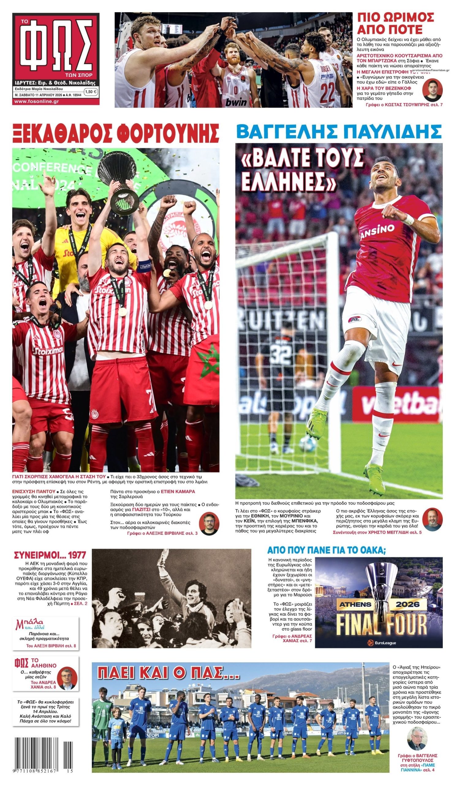 Οι αθλητικές εφημερίδες 11/4/2026 Enikos Newsroom 05:43, Σάββατο 11 Απριλίου 2026 Media & Τηλεοπτικά Νέα Διαβάστε τα πρωτοσέλιδα από τις αθλητικές εφημερίδες, σήμερα 11/4/2026. ΑΘΛΗΤΙΚΕΣ ΕΦΗΜΕΡΙΔΕΣ ΕΦΗΜΕΡΙΔΕΣ ΠΡΩΤΟΣΕΛΙΔΑ Μοιράσου το: Εθνική πόλο: Παίζει σήμερα με την Ουγγαρία για πλασάρισμα στην 4άδα EuroLeague: «Κλείδωσε» θέση στα play in ο Ερυθρός Αστέρας, παρέμεινε έκτη η Ζαλγκίρις – Όλα τα αποτελέσματα και η βαθμολογία Light: Αγκαλιά με τον έξι μηνών γιο του – Η νέα φωτογραφία που δημοσίευσε σχολίασε κι εσύ (0 σχόλια) Ακολουθήστε το Enikos στο Google News και μάθετε πρώτοι όλες τις ειδήσεις Δείτε όλες τις τελευταίες ειδήσεις από την Ελλάδα και τον Κόσμο στο enikos.gr Ειδήσεις Ροή Ειδήσεων 4 ώρες πριν LIVE – 43η ημέρα πολέμου ΗΠΑ – Ισραήλ με Ιράν – Όλες οι εξελίξεις στη Μέση Ανατολή 1 ώρα πριν Μοτζτάμπα Χαμενεΐ: Εξακολουθεί να αναρρώνει από τα σοβαρά τραύματα που υπέστη – Ερωτήματα για την κατάστασή του και τον ρόλο του 31 λεπτά πριν Χίος: Κανονικά θα γίνει ο ρουκετοπόλεμος στον Βροντάδο – Η απόφαση μετά το ατύχημα με τους 7 εγκαυματίες 2 ώρες πριν ΗΠΑ – Ιράν: Προσωρινή εκεχειρία, μόνιμη ένταση – Άρθρο του Μάριου Ευθυμιόπουλου 6 λεπτά πριν Το Πάσχα των πολιτικών – Στη Σύρο ο Κωνσταντίνος Τασούλας, στα Χανιά ο Κυριάκος Μητσοτάκης 1 ώρα πριν «Πάλεψα με τον καρκίνο δύο φορές πριν από τα 30» – Γυναίκα μοιράζεται τα συμπτώματα που οι νέοι δεν πρέπει να αγνοούν 2 ώρες πριν Τα 3 ζώδια που μπαίνουν σε τροχιά τύχης και εύνοιας – «Έχετε τη δύναμη στα χέρια σας και προχωράτε μπροστά» 3 ώρες πριν O 91χρονος πατέρας της κρατούσε κρυφή τη δεύτερη οικογένειά του – «Το ανακάλυψα όταν τον βοήθησα με τη φορολογική δήλωσή του» 4 ώρες πριν Στο φως ο μεγαλοπρεπής ναός αρχαίου Θεού: Ένα αρχιτεκτονικό στολίδι που παρέμενε για αιώνες θαμμένο κάτω από την άμμο 1 λεπτό πριν Θεσσαλονίκη: Συνελήφθη 20χρονος «γκαζιάρης» οδηγός στη Μουδανιών – Έτρεχε με 177 χλμ./ώρα 6 λεπτά πριν Το Πάσχα των πολιτικών – Στη Σύρο ο Κωνσταντίνος Τασούλας, στα Χανιά ο Κυριάκος Μητσοτάκης 15 λεπτά πριν Δανάη Μπάρκα: Η συγκινητική ανάρτηση για τον παππού της που έχει φύγει από τη ζωή – «Αυτές οι μέρες…» 23 λεπτά πριν Η ανάρτηση ασθενούς που περιγράφει όσα βίωσε στο ΚΑΤ – Άδωνις Γεωργιάδης: «Συγκινήθηκα» 31 λεπτά πριν Χίος: Κανονικά θα γίνει ο ρουκετοπόλεμος στον Βροντάδο – Η απόφαση μετά το ατύχημα με τους 7 εγκαυματίες ENIKOS NETWORK Συγκίνηση Άδωνι Γεωργιάδη για μαρτυρία ασθενούς στο νοσοκομείο ΚΑΤ Η υγεία των Ελλήνων σε αριθμούς: Τι δείχνουν τα νέα στοιχεία της ΕΛΣΤΑΤ Καύσιμα: Αποκλιμάκωση των τιμών βλέπουν οι πρατηριούχοι – Τι εκτιμούν για το πετρέλαιο κίνησης Ο δρόμος για την αναβάθμιση του ελληνικού αξιόχρεου – Τι εκτιμά η Τράπεζα της Ελλάδος Νέα τεχνολογία απεικόνισης υπερταχέων μικροσκοπικών διεργασιών Νέο τείχος προστασίας από τη Google κατά της παράκαμψης του 2FA στον Chrome περισσότερα 11:34 , Σάββατο 11 Απριλίου 2026 Εκτάκτως σήμερα με τη Realnews: Στις μυστικές υπηρεσίες της Μαρίας Αντουανέτας – Η γυναίκα με το χρυσό πιστόλι, του Frédéric Lenormand – Μαζί Food & Travel και Ειδική Έκδοση Drive Away Εκτάκτως το Μ. Σάββατο με τη Realnews: Στις μυστικές υπηρεσίες της Μαρίας Αντουανέτας –... 11:17 , Σάββατο 11 Απριλίου 2026 Τηλεθέαση (10/4): Τι παρακολούθησε το κοινό το βράδυ της Μεγάλης Παρασκευής; Συνεχίστηκε η «μάχη» για την τηλεθέαση στην prime time ζώνη των τηλεοπτικών καναλιών το βράδυ ... 09:49 , Σάββατο 11 Απριλίου 2026 «Από Ήλιο σε Ήλιο»: Η Κατερινέτα γοητεύεται από τον Γκέοργκ και νιώθει εν