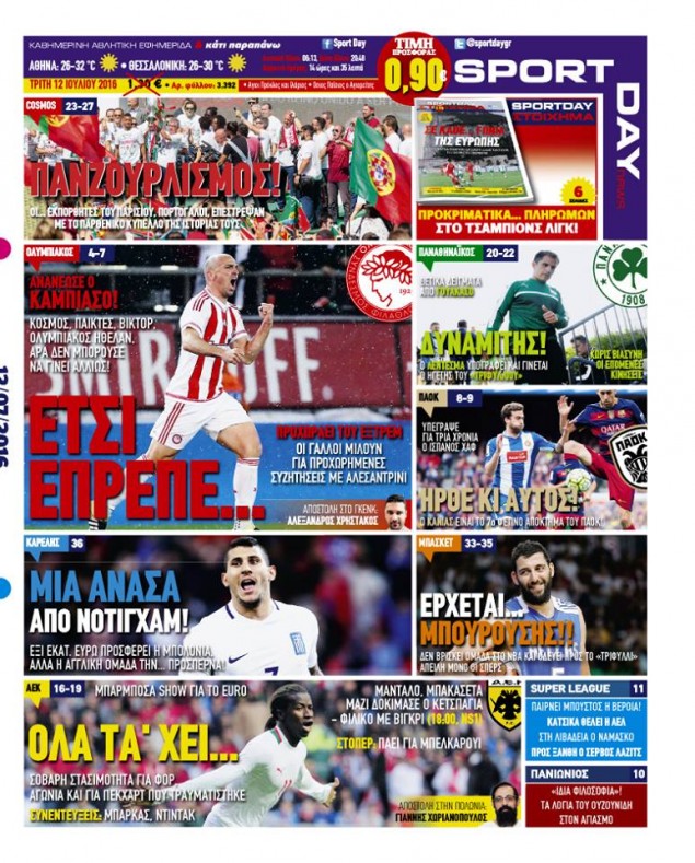 Οι αθλητικές εφημερίδες 12/7/2016 Enikos Newsroom 06:00, Τρίτη 12 Ιουλίου 2016 Media Διαβάστε τα σημερινά πρωτοσέλιδα των αθλητικών εφημερίδων: ΑΘΛΗΤΙΚΕΣ ΕΦΗΜΕΡΙΔΕΣ ΠΡΩΤΟΣΕΛΙΔΑ Μοιράσου το: σχολίασε κι εσύ (0 σχόλια) Ακολουθήστε το enikos.gr στο Google News και μάθετε πρώτοι όλες τις ειδήσεις Δείτε όλες τις τελευταίες ειδήσεις από την Ελλάδα και τον Κόσμο στο enikos.gr Ειδήσεις Ροή Ειδήσεων 1 ώρα πριν Δημοσκόπηση Metron Analysis: Στις 10 μονάδες η διαφορά ΝΔ-ΠΑΣΟΚ, στην 3η θέση η Πλεύση Ελευθερίας – 8 στους 10 στηρίζουν τον αγώνα των αγροτών 6 ώρες πριν Αγρότες: «Όχι στον διάλογο, μας εμπαίζει η κυβέρνηση» – Αποφάσισαν κλιμάκωση των κινητοποιήσεων, τι θα γίνει τα Χριστούγεννα 1 ώρα πριν Νίκος Παππάς στον ΑΝΤ1: «Δεν κρύβομαι – Μετά το συμβάν ακολούθησα κανονικά το πρόγραμμά μου» – ΒΙΝΤΕΟ 3 ώρες πριν Αθήνα: Εξαρθρώθηκε εγκληματική οργάνωση που διακινούσε ναρκωτικά σε μορφή σοκολάτας – Δύο τράπερ ανάμεσα στους 4 συλληφθέντες – ΒΙΝΤΕΟ 1 ώρα πριν Διαμαντής Καραναστάσης: Οδηγούσε υπό την επήρεια αλκοόλ – Του αφαιρέθηκε το δίπλωμα και του επιβλήθηκε πρόστιμο 350 ευρώ 2 ώρες πριν Manifesting: Πώς να συναντήσετε τον σύντροφο της ζωής σας, ανάλογα με τον μήνα γέννησής σας 4 ώρες πριν Γάμος: 11 ψυχρές αλλά ευγενικές φράσεις, που λέει ένας άνδρας όταν σκέφτεται τον χωρισμό 3 ώρες πριν Σφουγγάρισμα: Η συνήθεια που θα σας βοηθήσει να διατηρήσετε το σπίτι σας καθαρό και τακτοποιημένο 2 ημέρες πριν 20 χρόνια τα Χριστούγεννα ξεκινούν στα Public με μεγάλη ποικιλία σε δώρα! 6 λεπτά πριν Κρήτη: Νέες αποκαλύψεις για τον 54χρονο που κατηγορείται ότι εξαπάτησε τους γονείς του 33χρονου – Ζητούσε τρίχες αγνοουμένων 13 λεπτά πριν Τσιάρας: Δεν θα κινδυνέψουν οι πληρωμές των αγροτών – Χρειαζόμαστε μια νέα πολιτική, ένα restart 20 λεπτά πριν Δέσποινα Βανδή: Το βίντεο που δημοσίευσε με τον Γιώργο Νικολαΐδη – «Έχουμε καταστραφεί από τα μελομακάρονά σου» 25 λεπτά πριν Κλήρωση ΤΖΟΚΕΡ 18/12/2025: Αυτοί είναι οι τυχεροί αριθμοί 28 λεπτά πριν Τραμπ: Ζητεί από την Ουκρανία να “κινηθεί γρήγορα” στις διαπραγματεύσεις για το τέλος της σύγκρουσης ENIKOS NETWORK Σε περίοδο αυξημένης δραστηριότητας η γρίπη στην Ελλάδα-Μέτρα προστασίας από τον ΕΟΔΥ Σκέφτεστε συνέχεια συζητήσεις που έχετε κάνει; Τι σημαίνει αυτό, σύμφωνα με ειδικό ΑΣΕΠ 2ΓΒ/2025: Σήμερα αρχίζει η υποβολή ενστάσεων – Πότε θα βγουν τα οριστικά αποτελέσματα ΕΛΤΑ: Αυτό είναι το νέο σχέδιο μετασχηματισμού του Οργανισμού- Τι δήλωσαν Πιερρακάκης και Παπαστεργίου Χαρτογραφώντας το «σημείο χωρίς επιστροφή»: Για πρώτη φορά αποκαλύπτεται με λεπτομέρεια το ακανθώδες όριο της ατμόσφαιρας τ... Η Google καταργεί τη λειτουργία «dark web report» – Πώς θα μπορούν οι χρήστες να διαγράφουν τα δεδομένα τους περισσότερα 17:45 , Πέμπτη 18 Δεκεμβρίου 2025 ROUK ZOUK: Εορταστικό επεισόδιο με καλεσμένους τους πρωταγωνιστές του «Γιατί ρε πατέρα» Το Σάββατο 20 Δεκεμβρίου στις 21:00, η Ζέτα Μακρυπούλια υποδέχεται εκλεκτούς ηθοποιούς που όλο... 17:20 , Πέμπτη 18 Δεκεμβρίου 2025 Άγιος έρωτας: Η Χριστίνα εξομολογείται στον πατέρα Νικόλαο, απόψε στις 21:00 στον Alpha Η Νότα αποφασίζει να εκδικηθεί τον Πέτρο και τον Στέφανο, για χάρη του Λούη, όμως τα πράγματα ... 16:50 , Πέμπτη 18 Δεκεμβρίου 2025 Να μ’ αγαπάς: Ζωή και Φωτεινή συμφιλιώνονται ως μάνα με κόρη, απόψε στις 20:00 Η ταυτότητα του Άγγελου αποκαλύπτεται στο νέο επεισόδιο της σειράς “Να μ’ αγαπάς... 15:52 , Πέμπτη 18 Δεκεμβρίου 2025 Το Σπίτι Δίπλα Στο Ποτάμι: Το καθηλωτικό τελευταίο επεισόδιο για το 2025 απόψε στις 2