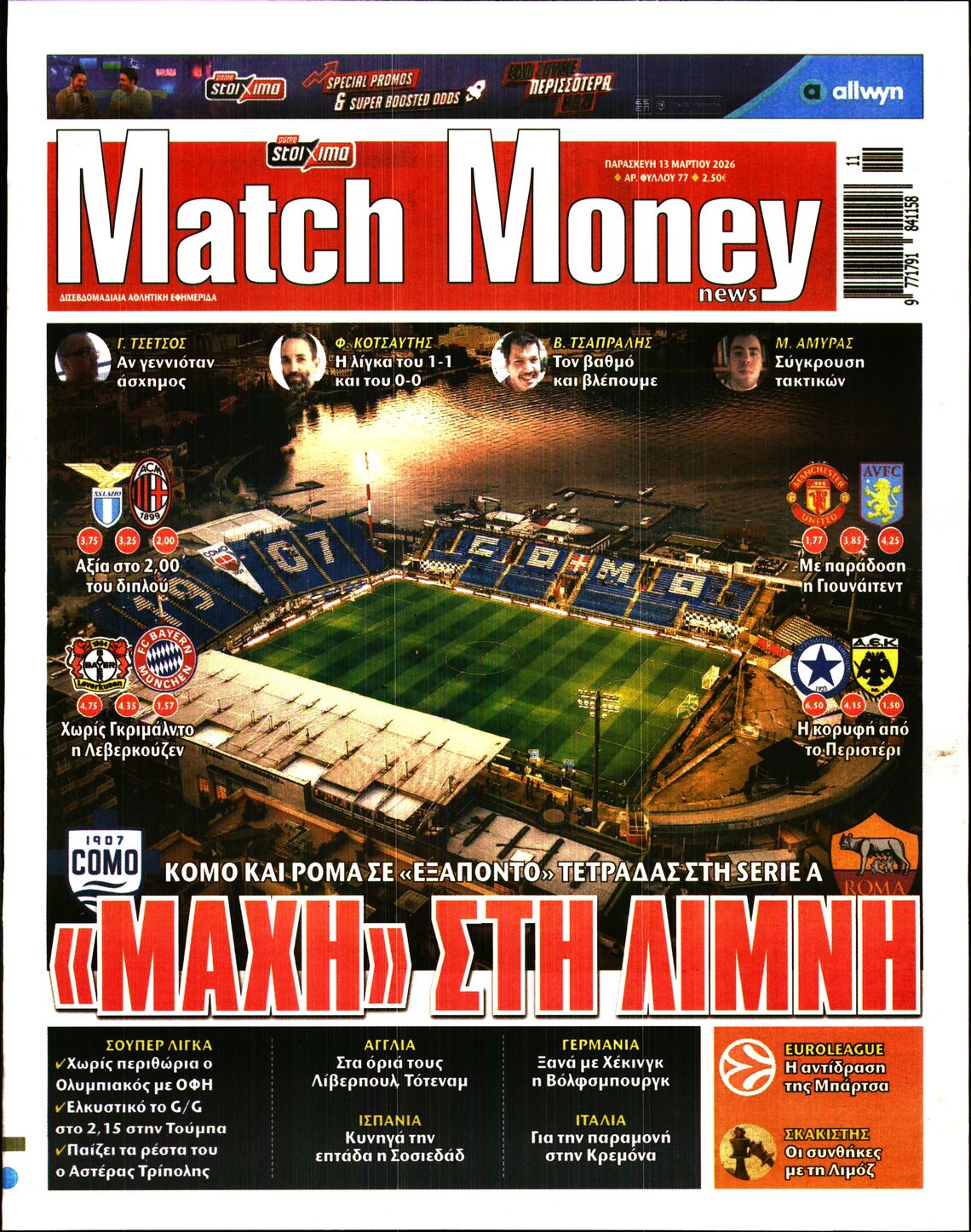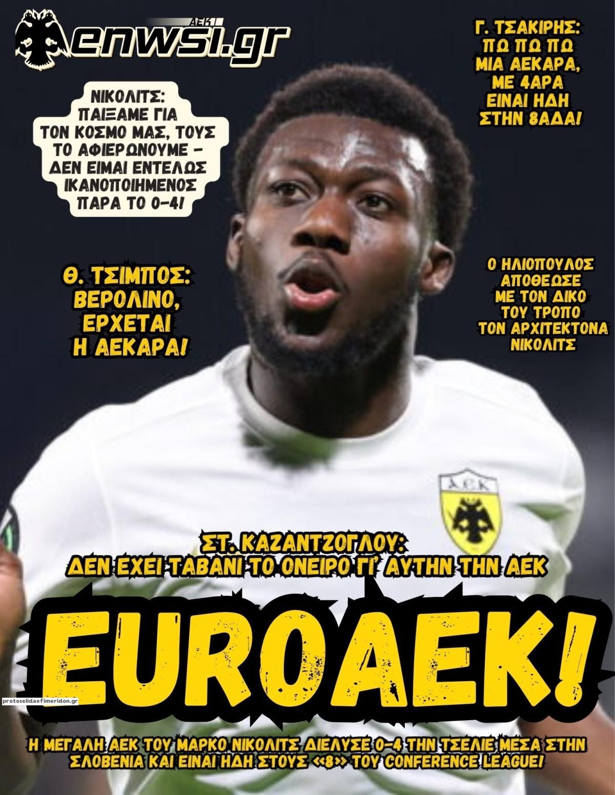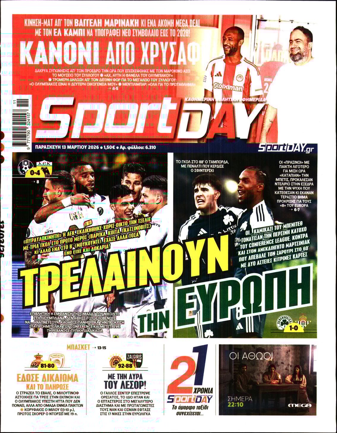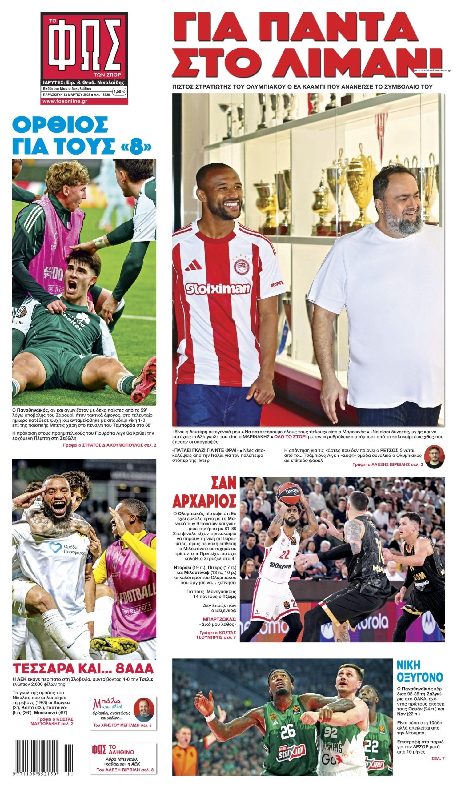 Οι αθλητικές εφημερίδες 13/3/2026 Γιωργος Λαμπρόπουλος 05:43, Παρασκευή 13 Μαρτίου 2026 Media Διαβάστε τα πρωτοσέλιδα από τις αθλητικές εφημερίδες, σήμερα 13/3/2026. ΑΘΛΗΤΙΚΕΣ ΕΦΗΜΕΡΙΔΕΣ ΕΦΗΜΕΡΙΔΕΣ ΠΡΩΤΟΣΕΛΙΔΑ Μοιράσου το: Ιρανοί διεθνείς ποδοσφαιριστές προς Τραμπ: «Κανείς δεν μπορεί να μας αποκλείσει από το Παγκόσμιο Κύπελλο» Euroleague: Η Παρί επέστρεψε στα θετικά αποτελέσματα – Όλα τα αποτελέσματα και η βαθμολογία Conference League: Τσεκάρουν εισιτήρια Βαγιεκάνο, Σαχτάρ και Στρασμπούρ – Μεγάλο «Χ» της ΑΕΚ Λάρνακας με την Κρίσταλ Πάλας – Όλα τα αποτελέσματα σχολίασε κι εσύ (0 σχόλια) Ακολουθήστε το enikos.gr στο Google News και μάθετε πρώτοι όλες τις ειδήσεις Δείτε όλες τις τελευταίες ειδήσεις από την Ελλάδα και τον Κόσμο στο enikos.gr Ειδήσεις Ροή Ειδήσεων 23 ώρες πριν LIVE – 13η ημέρα πολέμου ΗΠΑ – Ισραήλ με Ιράν – Οι εξελίξεις 8 ώρες πριν Τραμπ: Γιατί δεν έχει εύκολες λύσεις για τον τερματισμό του πολέμου – Τα λάθη, η υποτίμηση του αντιπάλου και η κόλαση στο Ορμούζ 8 ώρες πριν Οδυσσέας Κωνσταντινόπουλος: Η πρώτη αντίδραση για τη διαγραφή του – «Το τελευταίο καταφύγιο μιας φοβικής ηγεσίας» 9 ώρες πριν Κατασκοπεία στη Σούδα: Βρέθηκαν φωτογραφίες πολεμικών πλοίων στο κινητό του Πολωνού – Αρνείται τις κατηγορίες ο ίδιος 10 ώρες πριν Παναθηναϊκός – Μπέτις 1-0: Μεγάλη νίκη και προβάδισμα για την πρόκριση 58 λεπτά πριν Οπτική ψευδαίσθηση: Μόνο αν είσαι ο Σέρλοκ Χολμς θα βρεις την λεοπάρδαλη σε 15 δευτερόλεπτα 1 ώρα πριν Έλλειψη βιταμίνης D: Πώς συνδέεται με τη χρόνια φλεγμονή, σύμφωνα με νέα μελέτη 4 ώρες πριν Ζώδια 13/3: Ημερήσιες προβλέψεις – Κριοί, φτιάχνετε κάτι που θα κρατήσει 9 ώρες πριν Παγκόσμια Ημέρα Ύπνου 2026: 5 απλές συνήθειες που θα σας βοηθήσουν να κοιμάστε καλύτερα 48 λεπτά πριν Αυτή την Κυριακή με τη Realnews: «Στις μυστικές υπηρεσίες της Μαρίας Αντουανέτας – Τα διαμάντια του θανάτου» – Μυστικά και ίντριγκες στα ανάκτορα των Βερσαλλιών – Από τον συγγραφέα Frédéric Lenormand 2 λεπτά πριν Οι αθλητικές μεταδόσεις της Παρασκευής 13/3/2026 – Παναθηναϊκός-Ολυμπιακός, Euroleague & Ποδόσφαιρο 13 λεπτά πριν Την Κυριακή με τη Realnews: Ό,τι και αν αγοράσεις, σκανάρεις και κερδίζεις! 22 λεπτά πριν UNESCO: Καταστροφές σε μνημεία παγκόσμιας πολιτιστικής κληρονομιάς στο Ιράν λόγω του πολέμου 38 λεπτά πριν ΔΕΔΔΗΕ: Διακοπές ρεύματος σήμερα (13/3) στην Αθήνα και σε άλλες 9 περιοχές της Αττικής ENIKOS NETWORK Είστε τόσο παρατηρητικοί ώστε να βρείτε τις 3 διαφορές στην εικόνα με τον ζωγράφο σε 79 δευτερόλεπτα; Το αρωματικό λαχανικό των Νεμεών που μπορεί να βελτιώσει τη χώνευση και να μειώσει τη φλεγμονή Πώς θα εφαρμοστεί το πλαφόν στα τρόφιμα – Αναλυτικά παραδείγματα Στουρνάρας: Στα επίπεδα του 2025 η ανάπτυξη αν η κρίση στη Μέση Ανατολή κρατήσει ένα μήνα Ευπάθεια στο moltbook ai αποκαλύπτει email, tokens σύνδεσης και api keys Αυτός είναι ο ρόλος της μικρής τρύπας στους νυχοκόπτες – «Είμαι ο μόνος που δεν το ήξερε;»» περισσότερα 07:11 , Παρασκευή 13 Μαρτίου 2026 Οι αθλητικές μεταδόσεις της Παρασκευής 13/3/2026 – Παναθηναϊκός-Ολυμπιακός, Euroleague & Ποδόσφαιρο Το ματς Παναθηναϊκός – Ολυμπιακός για τη Volley League Ανδρών, τα παιχνίδια της Ευρωλίγκας και... 05:38 , Παρασκευή 13 Μαρτίου 2026 Οι πολιτικές εφημερίδες 13/3/2026 Διαβάστε τα πρωτοσέλιδα από τις πολιτικές εφημερίδες, σήμερα 13/3/2026. 20:42 , Πέμπτη 12 Μαρτίου 2026 Μπαμπά, σ’ αγαπώ: Τι θα κάνουν τα «τρία μπαμπαδάκια» όταν η ζωή θα τους δώσει… λεμόνια; Στο νέο επεισόδιο της οικογενειακής σειράς του Alpha «Μπαμπά, σ’ αγαπώ» απόψε στις 