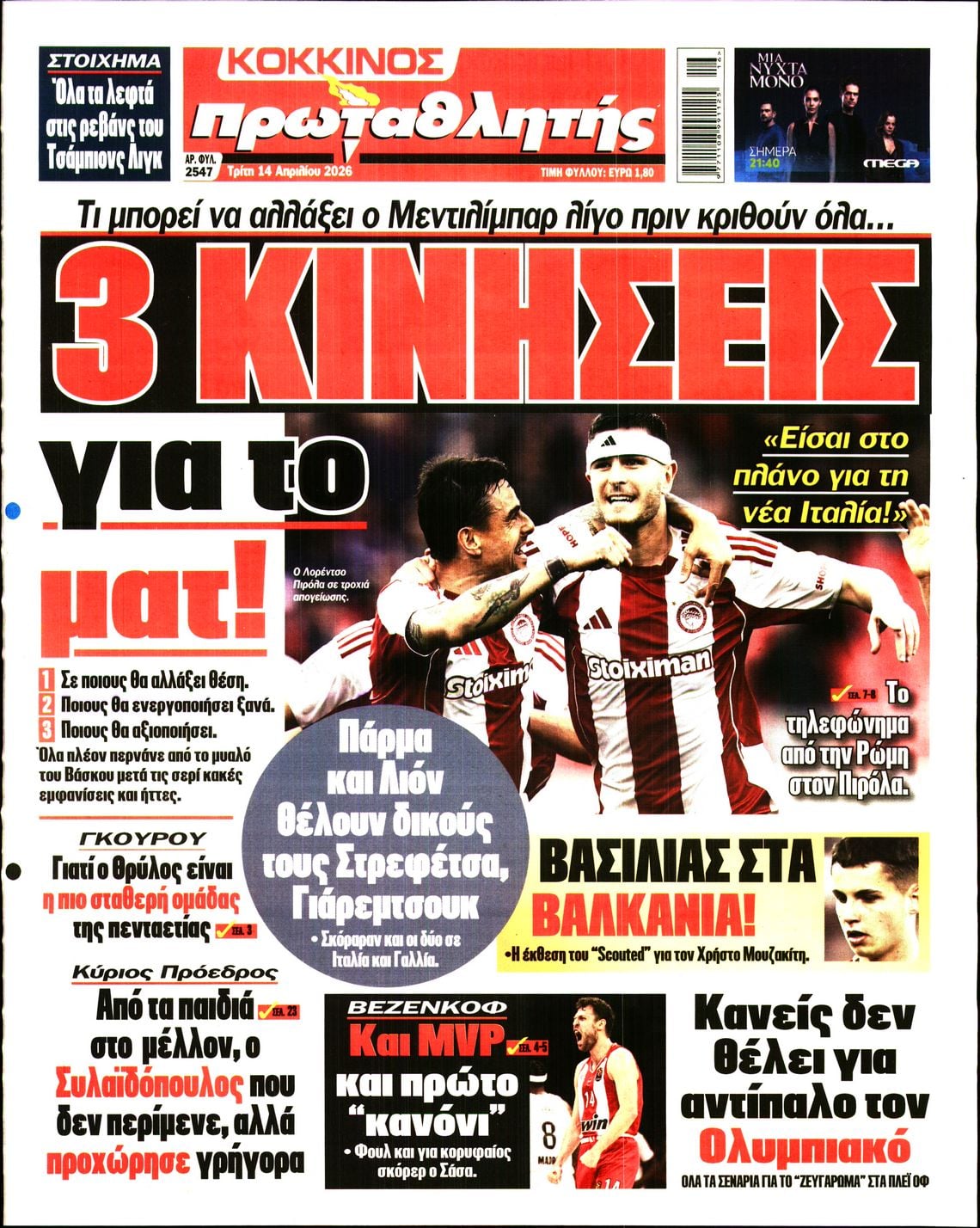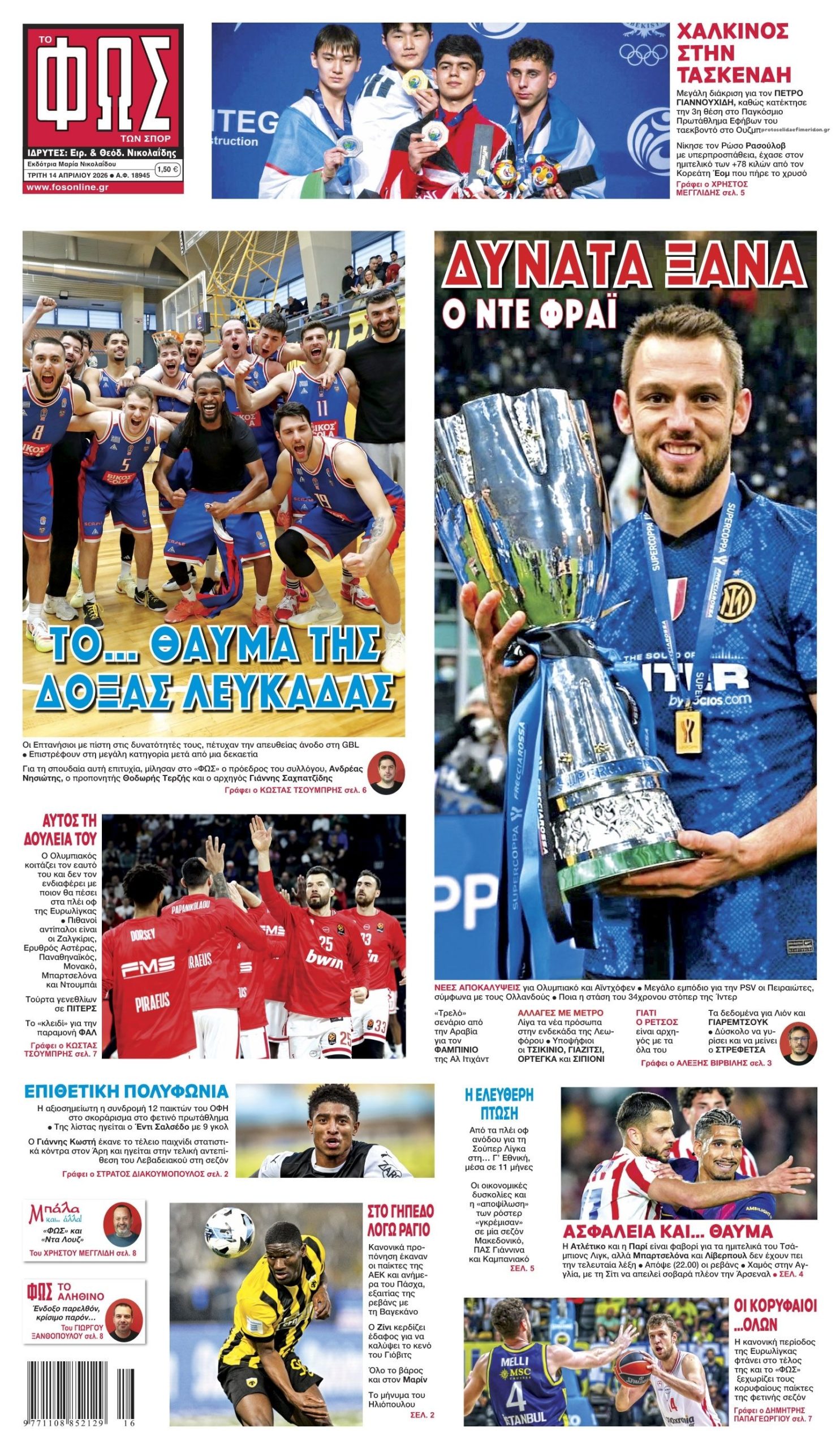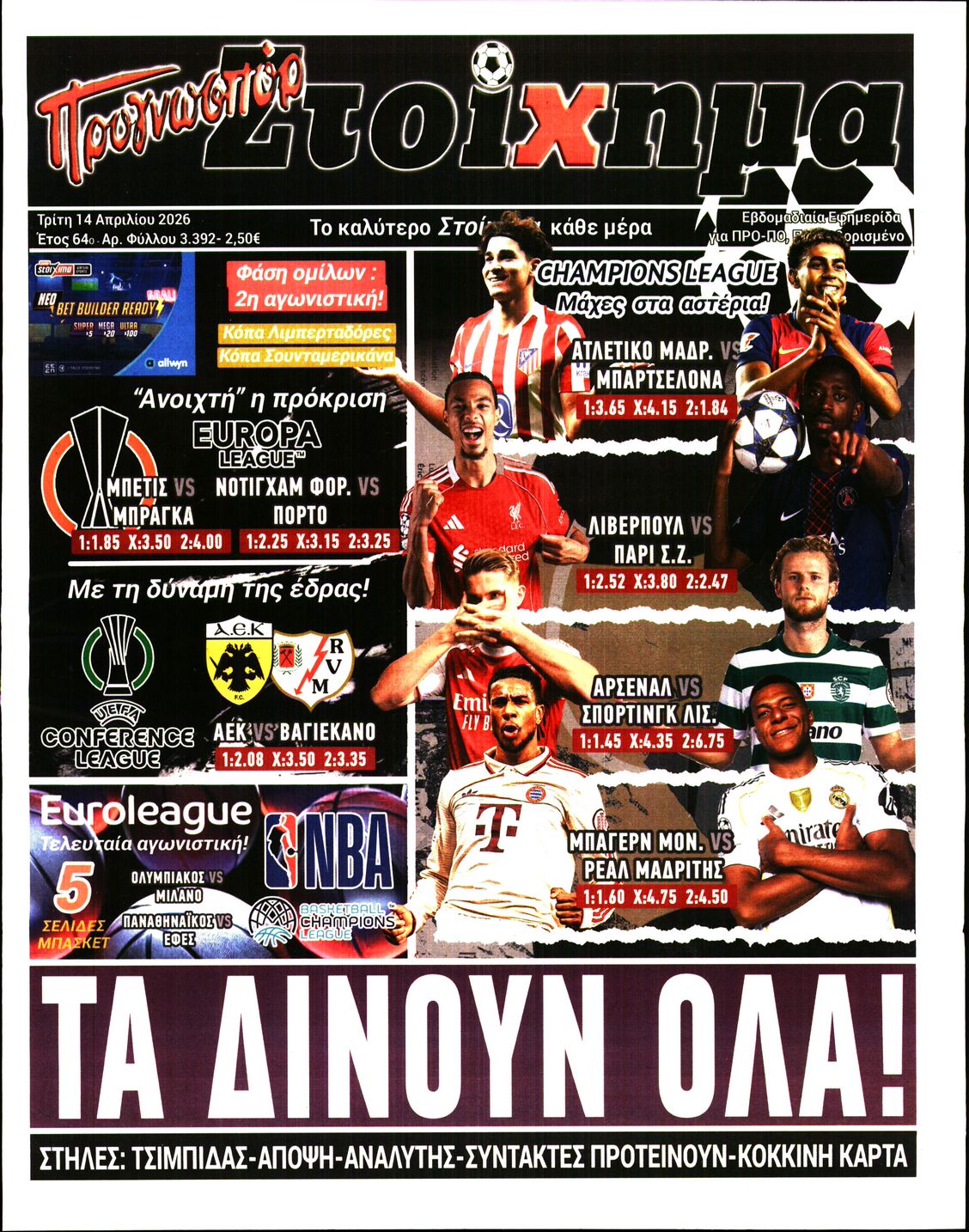 Οι αθλητικές εφημερίδες 14/4/2026 Enikos Newsroom 05:43, Τρίτη 14 Απριλίου 2026 Media & Τηλεοπτικά Νέα Διαβάστε τα πρωτοσέλιδα από τις αθλητικές εφημερίδες, σήμερα 14/4/2026. ΑΘΛΗΤΙΚΕΣ ΕΦΗΜΕΡΙΔΕΣ ΕΦΗΜΕΡΙΔΕΣ ΠΡΩΤΟΣΕΛΙΔΑ Μοιράσου το: Γιαμάλ: «Είμαστε εδώ για την ανατροπή» με την Ατλέτικο Μαδρίτης στο Champions League Serie A: Νίκη «παραμονής» για τη Φιορεντίνα με 1-0 επί της Λάτσιο (Βίντεο) Premier League: Η Λιντς «άλωσε» το Ολντ Τράφορντ με 1-2 και έκανε άλμα σωτηρίας σχολίασε κι εσύ (0 σχόλια) Ακολουθήστε το Enikos στο Google News και μάθετε πρώτοι όλες τις ειδήσεις Δείτε όλες τις τελευταίες ειδήσεις από την Ελλάδα και τον Κόσμο στο enikos.gr Ειδήσεις Ροή Ειδήσεων 6 λεπτά πριν LIVE – 46η ημέρα πολέμου ΗΠΑ – Ισραήλ με Ιράν – Όλες οι εξελίξεις στη Μέση Ανατολή 25 λεπτά πριν Βενζίνη: «Πονοκέφαλο» προκαλούν οι τιμές της αμόλυβδης – Μπορεί να φτάσει τα 3 ευρώ το λίτρο; 9 ώρες πριν Ορμούζ: Το νέο γεωπολιτικό ρίσκο του Τραμπ για να «γονατίσει» το Ιράν – Δοκιμασία αντοχής για το ποιος θα λυγίσει πρώτος 9 ώρες πριν Παξοί: Συγκινεί η αδελφή του 15χρονου που σκοτώθηκε σε τροχαίο – «Θέλω να τον ξαναδώ για να του πω ό,τι δεν του έχω πει» 9 ώρες πριν Τι σηματοδοτεί ο θρίαμβος του Μάγιαρ για την Ευρώπη, την Ουκρανία και τον… Τραμπ – Τα σχέδια του νέου ηγέτη της Ουγγαρίας 2 ώρες πριν Οπτική ψευδαίσθηση: Μόνο αν είσαι ο Σέρλοκ Χολμς θα βρεις το δαχτυλίδι σε 12 δευτερόλεπτα 2 ώρες πριν Σύνδρομο Ευερέθιστου Εντέρου: Τα μικρά και συχνά γεύματα μπορούν να ανακουφίσουν τα συμπτώματα, σύμφωνα με μελέτη 5 ώρες πριν Ζώδια 14/4: Ημερήσιες προβλέψεις – Παρθένοι, μείνετε ανοιχτοί σε εκπλήξεις 9 ώρες πριν Στο φως η «σφραγίδα» του Ραμσή Β’: Σπουδαία αρχαιολογική ανακάλυψη 3.300 ετών 6 λεπτά πριν LIVE – 46η ημέρα πολέμου ΗΠΑ – Ισραήλ με Ιράν – Όλες οι εξελίξεις στη Μέση Ανατολή 7 λεπτά πριν e- ΕΦΚΑ και ΔΥΠΑ: Αρχίζουν από σήμερα οι πληρωμές – Ποιοι θα δουν χρήματα στους λογαριασμούς τους 15 λεπτά πριν Καιρός: Λασποβροχές, αφρικανική σκόνη και ισχυροί νοτιάδες – Η πρόγνωση ανά περιοχή 24 λεπτά πριν Η ελληνική τεχνολογία PHYLAX στην «καρδιά» σύγχρονων οπλικών συστημάτων 25 λεπτά πριν Βενζίνη: «Πονοκέφαλο» προκαλούν οι τιμές της αμόλυβδης – Μπορεί να φτάσει τα 3 ευρώ το λίτρο; ENIKOS NETWORK Μόνο αν έχετε μάτια σαν κιάλια θα εντοπίσετε τέσσερα καβούρια ανάμεσα σε αστακούς σε 45 δευτερόλεπτα! Το φρούτο της αγνότητας που μπορεί να μειώσει τον κίνδυνο για καρδιακό και να προστατεύσει τον εγκέφαλο Βενζίνη: Μπορεί η τιμή της να φτάσει τα 3 ευρώ το λίτρο; «Τουρισμός για Όλους 2026»: Τα κριτήρια και το ύψος των vouchers Νεάντερταλ: Κυνηγούσαν και έτρωγαν κανιβαλικά «ξένους» σύμφωνα με μελέτη-σοκ Κουίζ: Πόσο καλά θυμάστε την ελληνική μυθολογία; Μπορείτε να απαντήσετε σωστά και στις 3 ερωτήσεις; περισσότερα 07:18 , Τρίτη 14 Απριλίου 2026 Αυτή την Κυριακή δύο βιβλία με τη Realnews: Δύο αλήθειες και ένας φόνος της Colleen Cambridge – Μαζί αστυνομικά best sellers Αυτή την Κυριακή δύο βιβλία με τη Realnews: Δύο αλήθειες και ένας φόνος της Colleen Cambridge ... 11:21 , Δευτέρα 13 Απριλίου 2026 Τηλεθέαση (12/4): Πώς κινήθηκαν τα προγράμματα στην prime time ζώνη της Κυριακής του Πάσχα Τα προγράμματα της prime time ζώνης έδωσαν για ακόμη μία φορά τη «μάχη» τους, για την επικράτη... 08:02 , Δευτέρα 13 Απριλίου 2026 Με τη Realnews που κυκλοφορεί: Ό,τι και αν αγοράσεις, σκανάρεις και κερδίζεις! Εκτάκτως το Μ. Σάββατο με τη Realnews: Ό,τι και αν αγοράσεις, σκανάρεις και κερδίζεις! Με το P... 14:36 , Κυριακή 12 Απριλίου 2026 Η Realnews στο www.pressreader.com Διαβάστε την ψηφιακή έκδοση της