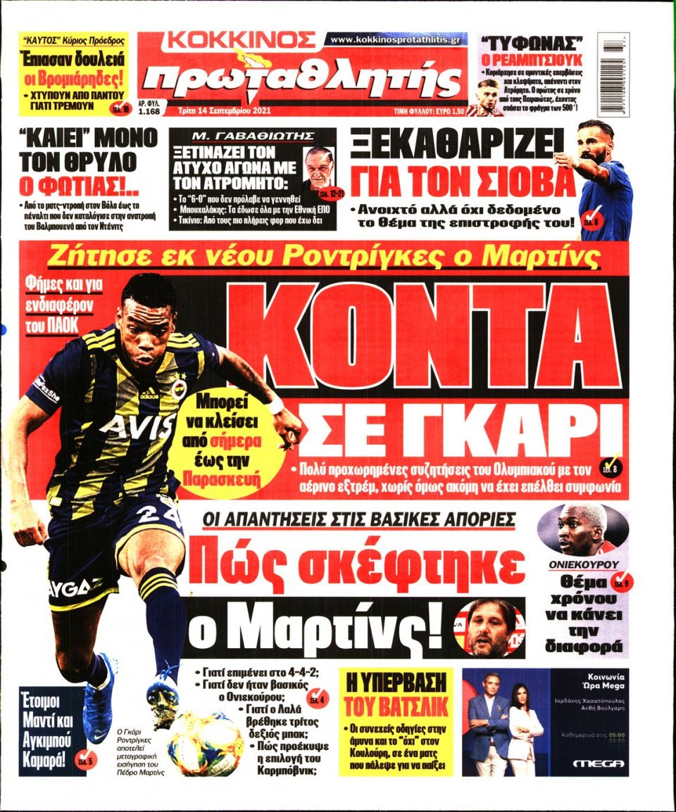 Οι αθλητικές εφημερίδες 14/9/2021 Σήφης Γαρυφαλάκης 06:21, Τρίτη 14 Σεπτεμβρίου 2021 Media Διαβάστε τα πρωτοσέλιδα των αθλητικών εφημερίδων. ΑΘΛΗΤΙΚΕΣ ΕΦΗΜΕΡΙΔΕΣ ΕΦΗΜΕΡΙΔΕΣ ΠΡΩΤΟΣΕΛΙΔΑ Μοιράσου το: σχολίασε κι εσύ (0 σχόλια) Ακολουθήστε το enikos.gr στο Google News και μάθετε πρώτοι όλες τις ειδήσεις Δείτε όλες τις τελευταίες ειδήσεις από την Ελλάδα και τον Κόσμο στο enikos.gr Ειδήσεις Ροή Ειδήσεων 3 ώρες πριν ΑΑΔΕ: Στον Εισαγγελέα οι πρώτες 50 μαζικές διαγραφές αγρών στο Ε9 – Εξετάζονται συνολικά 3.000 περιπτώσεις 60 λεπτά πριν Τουρκία: Σε ουδέτερη χώρα θα αναλυθεί το μαύρο κουτί του αεροσκάφους που συνετρίβη 22 λεπτά πριν Αττική: Προβλήματα σε κεντρικούς δρόμους από την ισχυρή βροχόπτωση και το χαλάζι – ΒΙΝΤΕΟ 2 ώρες πριν Αττική: Έπεσε από πατίνι η 14χρονη που εντοπίστηκε τραυματισμένη – Νοσηλεύεται στη νευροχειρουργική κλινική 3 ώρες πριν Ζελένσκι: Πέρασε στην αντεπίθεση με το σχέδιο ειρήνης – Ζητεί συνάντηση με Τραμπ για το εδαφικό 2 ώρες πριν Τα 5 ζώδια που έχουν μεγάλες πιθανότητες να πλουτίσουν το 2026 – «Οι οικονομικές δυσκολίες ανήκουν στο παρελθόν» 3 ώρες πριν Επιστήμονες ανακάλυψαν κάτι συγκλονιστικό – Η μάζα μπορεί να προέρχεται από αόρατες διαστάσεις 7 ώρες πριν Γυναίκα που έχασε 30 κιλά αποκαλύπτει τα μυστικά της επιτυχίας της – «Οι υδατάνθρακες είναι καύσιμο του οργανισμού, όχι εχθρός» 6 ώρες πριν Οι άνθρωποι που αποφεύγουν να γιορτάσουν τα Χριστούγεννα με την οικογένειά τους, συνήθως είχαν αυτές τις 8 εμπειρίες στην παιδική ηλικία 1 λεπτό πριν Ηλεία: 16χρονος έπεσε θύμα ξυλοδαρμού από συνομήλικό του – Μεταφέρθηκε στο νοσοκομείο 8 λεπτά πριν Ρωσία: Οι μυστικές υπηρεσίες ανακοίνωσαν ότι απέτρεψαν «τρομοκρατική επίθεση» σε εγκατάσταση αγωγού πετρελαίου 14 λεπτά πριν Ομοβροντία πυρών από τους Ευρωπαίους για τις αμερικανικές κυρώσεις – «Θα συνεχίσουμε να προστατεύουμε την ελευθερία της έκφρασης» 19 λεπτά πριν Χριστούγεννα σημαίνουν… Ευχοστολίδια! Μαζί με τον ΟΠΑΠ διπλασιάζουμε την προφορά στα παιδιά και κάνουμε τις ευχές τους πραγματικότητα 22 λεπτά πριν Αττική: Προβλήματα σε κεντρικούς δρόμους από την ισχυρή βροχόπτωση και το χαλάζι – ΒΙΝΤΕΟ ENIKOS NETWORK ΕΟΔΥ: Οι «χρυσές» συμβουλές για να απολαύσουμε το Χριστουγεννιάτικο τραπέζι χωρίς υπερβολές New Year’s Resolutions: Μικρές αποφάσεις για μια καλή χρονιά «Κινούμαι Ηλεκτρικά ΙΙΙ»: Έρχεται νέα ΚΥΑ για το πρόγραμμα – Τι θα αναφέρει ΕΒΕA: Ποιοι μπορούν να υποβάλουν αίτηση για τη Θερμοκοιτίδα Νεοφυών Επιχειρήσεων Αθήνας και μέχρι πότε Ο Google Assistant θα παραμείνει λίγο περισσότερο για ορισμένους χρήστες Android Τεστ προσωπικότητας: Το βάζο που θα επιλέξετε αποκαλύπτει πώς λύνετε προβλήματα στη ζωή σας περισσότερα 16:12 , Τετάρτη 24 Δεκεμβρίου 2025 ALPHA: Παραμονή Χριστουγέννων με τον Κωνσταντίνο Αργυρό Ο Alpha παρουσιάζει απόψε σε πρώτη τηλεοπτική μετάδοση τη συναρπαστική και sold out εμφάνιση ... 15:51 , Τετάρτη 24 Δεκεμβρίου 2025 ‘Αγιος Έρωτας: Ο σεισμός που έκοψε την ανάσα – Δείτε τις συγκλονιστικές σκηνές Με έναν συγκλονιστικό τρόπο έκλεισε χθες βράδυ το τελευταίο επεισόδιο του 2025 της σειράς R... 13:27 , Τετάρτη 24 Δεκεμβρίου 2025 Ο Χριστουγεννιάτικος Τηλεμαραθώνιος του ΑΝΤ1 ένωσε τους πολιτικούς αρχηγούς – Τα εγκωμιαστικά σχόλια για τον Θοδωρή Κυριακού Σπάνια ομοφωνία: Όλοι οι πολιτικοί αρχηγοί αποθεώνουν τον Θοδωρή Κυριακού Ο Χριστουγεννιάτικος... 12:05 , Τετάρτη 24 Δεκεμβρίου 2025 Έξοδος εκδρομέων για τα Χριστούγεννα: Στείλε βίντεο ή φωτογρ