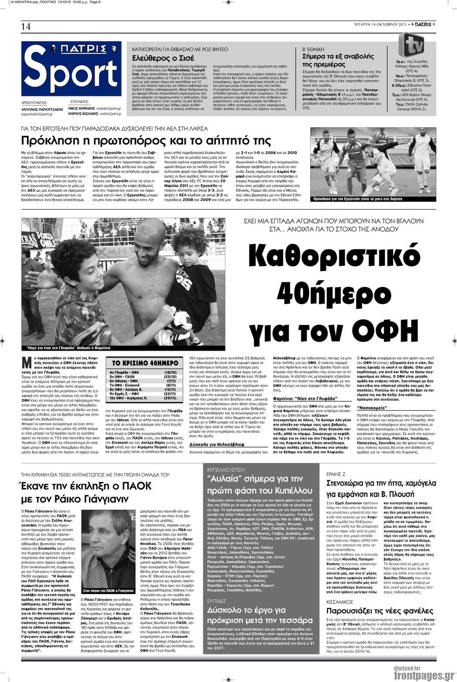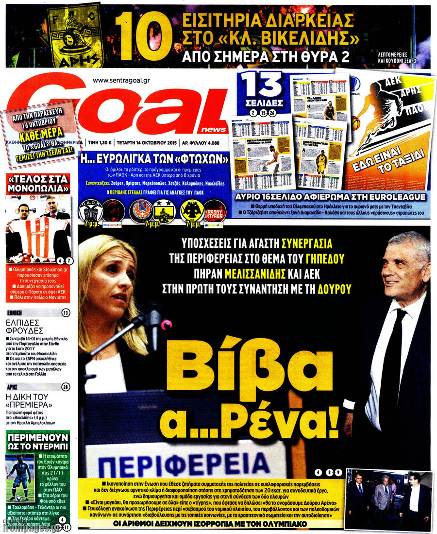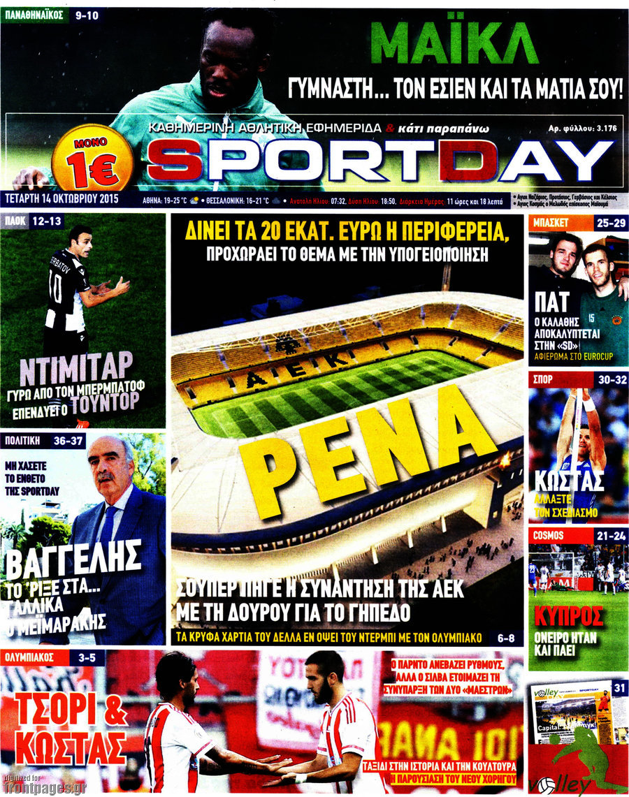 Οι αθλητικές εφημερίδες 14/10/2015 Enikos Newsroom 08:15, Τετάρτη 14 Οκτωβρίου 2015 Media Διαβάστε τα σημερινά πρωτοσέλιδα των αθλητικών εφημερίδων: ΑΘΛΗΤΙΚΕΣ ΕΦΗΜΕΡΙΔΕΣ ΠΡΩΤΟΣΕΛΙΔΑ Μοιράσου το: σχολίασε κι εσύ (0 σχόλια) Ακολουθήστε το enikos.gr στο Google News και μάθετε πρώτοι όλες τις ειδήσεις Δείτε όλες τις τελευταίες ειδήσεις από την Ελλάδα και τον Κόσμο στο enikos.gr Ειδήσεις Ροή Ειδήσεων 4 ώρες πριν Χριστούγεννα στα μπλόκα: Επιμένουν στις κινητοποιήσεις τους οι αγρότες – Ανοίγουν τα διόδια το Σαββατοκύριακο 4 ώρες πριν Ουκρανία: Η άνευ προηγουμένου επίθεση σε ρωσικό τάνκερ στη Μεσόγειο και το μήνυμα προς στον Πούτιν – Το «μακρύ χέρι» του Κιέβου 3 ώρες πριν Πούτιν: Τα μηνύματα σε Ευρώπη και ΝΑΤΟ από το μαραθώνιο «σόου» του – Η απαίτηση για «σεβασμό» και η ειρήνη «με τους όρους» της Μόσχας 4 ώρες πριν Τραμπ: Δεν αποκλείει την πιθανότητα ενός πολέμου στη Βενεζουέλα – «Ο Μαδούρο ξέρει καλύτερα από τον καθένα τι ακριβώς θέλω» 5 ώρες πριν Συνεχίζει να προκαλεί ο Μίτσκοσκι: «Για μένα το όνομα Μακεδονία είναι ιερό» 3 ώρες πριν Ανακαλύφθηκαν αρχαία χρυσά νομίσματα 2.200 ετών που απεικονίζουν τον θεό Απόλλωνα – Η άγνωστη σύνδεση με τον Φίλιππο Β΄ της Μακεδονίας 4 ώρες πριν Ύπνος: Μια κρυφή κατάσταση του εγκεφάλου πριν από τον ύπνο μπορεί να είναι το “κλειδί” για υψηλή ευφυΐα και δημιουργικότητα 5 ώρες πριν Αριθμολογία: Οι άνθρωποι που έχουν γεννηθεί αυτές τις 4 ημερομηνίες, συχνά παρεξηγούνται – «Η καλοσύνη τους κρύβει τεράστια δύναμη» 6 ώρες πριν Ξεχάστε το καθάρισμα το Σαββατοκύριακο: Ο «κανόνας των 20 λεπτών» που θα σας λύσει τα χέρια 8 λεπτά πριν Εξάρχεια: Ένταση με μολότοφ, χημικά και κρότου λάμψης 24 λεπτά πριν ΗΠΑ: Τραγωδία στην Αλαμπάμα – Σκότωσε την δημοσιογράφο σύζυγό του και αυτοκτόνησε μπροστά στον 3χρονο γιο τους 38 λεπτά πριν Πρόταση γάμου στο ΣΕΦ κατά την διάρκεια του αγώνα Ολυμπιακός-Βιλερμπάν – Δείτε βίντεο 53 λεπτά πριν Euroleague: Επέστρεψε στις νίκες ο Ολυμπιακός, πήρε την ματσάρα της χρονιάς η Μπάρτσα – Τα αποτελέσματα και η βαθμολογία 1 ώρα πριν Συρία: Μαζικά πλήγματα των ΗΠΑ σε θέσεις του Ισλαμικού Κράτους – Χέγκσεθ: «Δεν είναι αρχή πολέμου, είναι μια δήλωση εκδίκησης» για το θάνατο των στρατιωτών μας ENIKOS NETWORK Το ΕΚΑΒ τιμήθηκε από την Ακαδημία Αθηνών για τα 40 χρόνια προσφοράς του Έχετε πραγματικά μεγάλη καρδιά; 10 χαρακτηριστικά όσων έχουν καλοσύνη Αναστολή μέτρων αναγκαστικής εκτέλεσης για κτηνοτρόφους που πλήττονται από την ευλογιά των αιγοπροβάτων Πλήρης επάρκεια προϊόντων στις λαϊκές της Αττικής, παρά τις αγροτικές κινητοποιήσεις – Τι απαντούν οι πωλητές Χαρτογραφώντας το «σημείο χωρίς επιστροφή»: Για πρώτη φορά αποκαλύπτεται με λεπτομέρεια το ακανθώδες όριο της ατμόσφαιρας τ... Η Google καταργεί τη λειτουργία «dark web report» – Πώς θα μπορούν οι χρήστες να διαγράφουν τα δεδομένα τους περισσότερα 22:42 , Παρασκευή 19 Δεκεμβρίου 2025 Γιώργος Γιαννόπουλος για “Το σόι σου”: “Είναι ευτυχία και ευλογία αυτή η σειρά” «Είναι ευτυχία και ευλογία η συγκυρία αυτής της σειράς», θα πει ο Γιώργος Γιαννόπουλος -ο αγαπ... 20:37 , Παρασκευή 19 Δεκεμβρίου 2025 Don’t Forget The Lyrics: Η Έλλη Κοκκίνου υποδέχεται 4 παίκτες που θα κάνουν τα πάντα για να μη χάσουν ούτε… μισή λέξη από τους στίχους Το «Don’t Forget The Lyrics» επιστρέφει απόψε, Παρασκευή 19 Δεκεμβρίου, στις 21:00 με νέο επει... 19:31 , Παρασκευή 19 Δεκεμβρίου 2025 GNTM: Απόψε ο μεγάλος τελικός για τους 4 φιναλίστ Έπειτα από μήνες γεμάτους μόδα, δημιουργία και