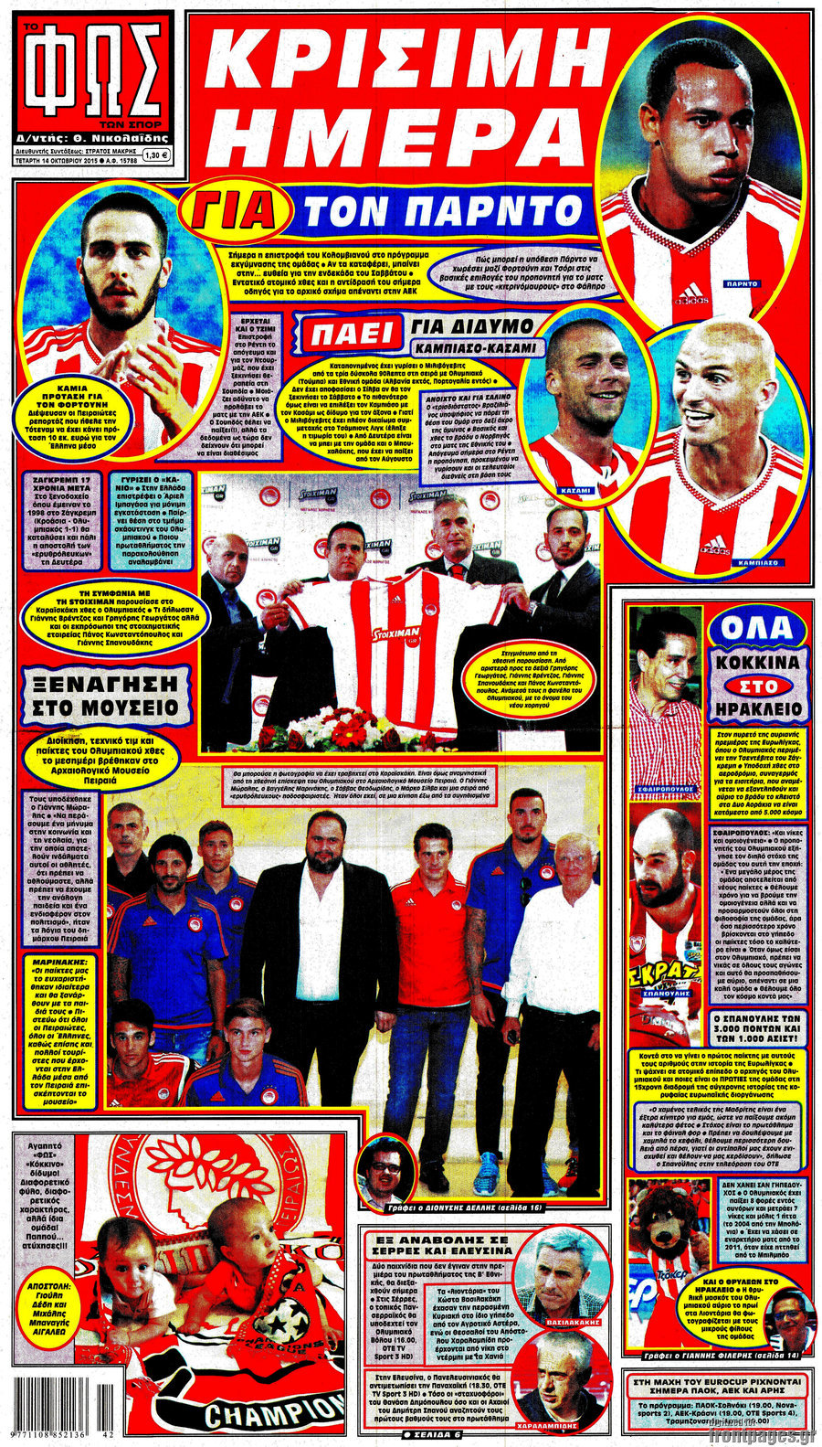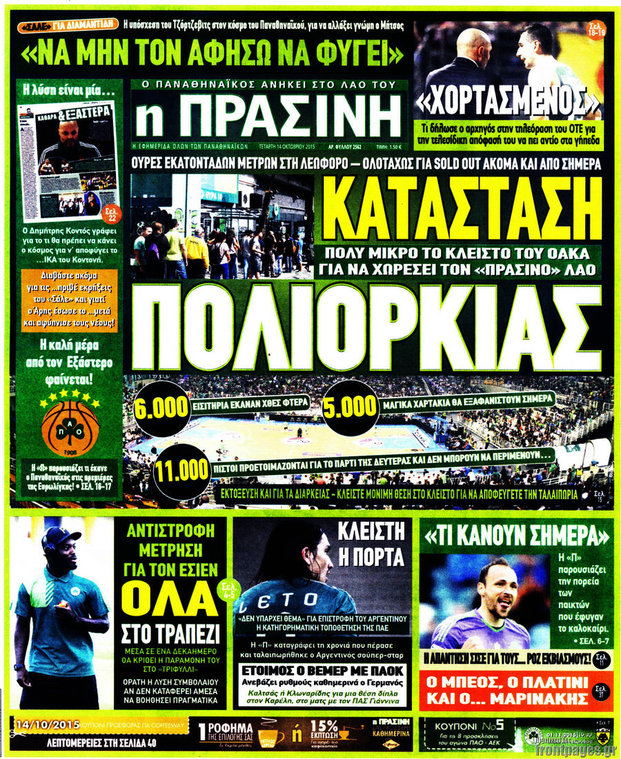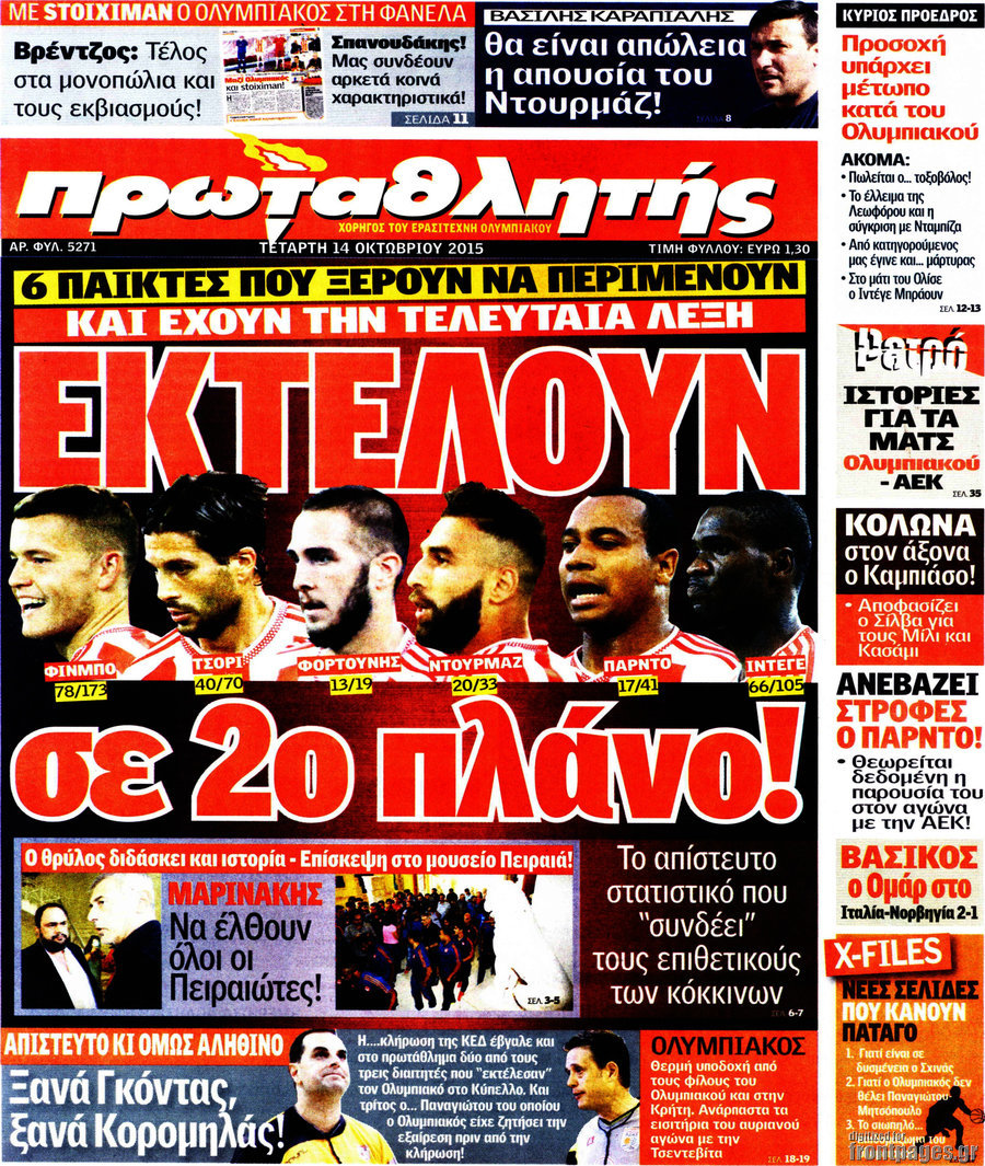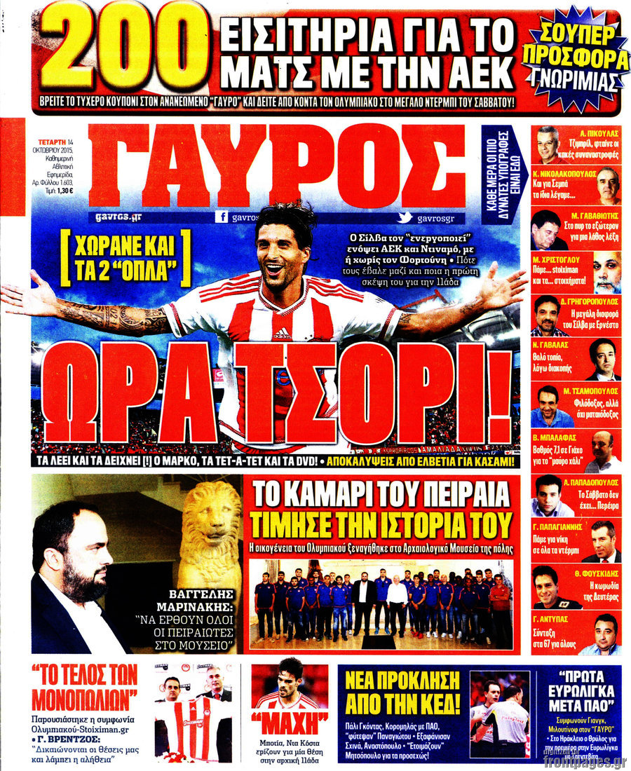 Οι αθλητικές εφημερίδες 14/10/2015 Enikos Newsroom 08:15, Τετάρτη 14 Οκτωβρίου 2015 Media Διαβάστε τα σημερινά πρωτοσέλιδα των αθλητικών εφημερίδων: ΑΘΛΗΤΙΚΕΣ ΕΦΗΜΕΡΙΔΕΣ ΠΡΩΤΟΣΕΛΙΔΑ Μοιράσου το: σχολίασε κι εσύ (0 σχόλια) Ακολουθήστε το enikos.gr στο Google News και μάθετε πρώτοι όλες τις ειδήσεις Δείτε όλες τις τελευταίες ειδήσεις από την Ελλάδα και τον Κόσμο στο enikos.gr Ειδήσεις Ροή Ειδήσεων 4 ώρες πριν Χριστούγεννα στα μπλόκα: Επιμένουν στις κινητοποιήσεις τους οι αγρότες – Ανοίγουν τα διόδια το Σαββατοκύριακο 4 ώρες πριν Ουκρανία: Η άνευ προηγουμένου επίθεση σε ρωσικό τάνκερ στη Μεσόγειο και το μήνυμα προς στον Πούτιν – Το «μακρύ χέρι» του Κιέβου 3 ώρες πριν Πούτιν: Τα μηνύματα σε Ευρώπη και ΝΑΤΟ από το μαραθώνιο «σόου» του – Η απαίτηση για «σεβασμό» και η ειρήνη «με τους όρους» της Μόσχας 4 ώρες πριν Τραμπ: Δεν αποκλείει την πιθανότητα ενός πολέμου στη Βενεζουέλα – «Ο Μαδούρο ξέρει καλύτερα από τον καθένα τι ακριβώς θέλω» 5 ώρες πριν Συνεχίζει να προκαλεί ο Μίτσκοσκι: «Για μένα το όνομα Μακεδονία είναι ιερό» 3 ώρες πριν Ανακαλύφθηκαν αρχαία χρυσά νομίσματα 2.200 ετών που απεικονίζουν τον θεό Απόλλωνα – Η άγνωστη σύνδεση με τον Φίλιππο Β΄ της Μακεδονίας 4 ώρες πριν Ύπνος: Μια κρυφή κατάσταση του εγκεφάλου πριν από τον ύπνο μπορεί να είναι το “κλειδί” για υψηλή ευφυΐα και δημιουργικότητα 5 ώρες πριν Αριθμολογία: Οι άνθρωποι που έχουν γεννηθεί αυτές τις 4 ημερομηνίες, συχνά παρεξηγούνται – «Η καλοσύνη τους κρύβει τεράστια δύναμη» 6 ώρες πριν Ξεχάστε το καθάρισμα το Σαββατοκύριακο: Ο «κανόνας των 20 λεπτών» που θα σας λύσει τα χέρια 8 λεπτά πριν Εξάρχεια: Ένταση με μολότοφ, χημικά και κρότου λάμψης 24 λεπτά πριν ΗΠΑ: Τραγωδία στην Αλαμπάμα – Σκότωσε την δημοσιογράφο σύζυγό του και αυτοκτόνησε μπροστά στον 3χρονο γιο τους 38 λεπτά πριν Πρόταση γάμου στο ΣΕΦ κατά την διάρκεια του αγώνα Ολυμπιακός-Βιλερμπάν – Δείτε βίντεο 53 λεπτά πριν Euroleague: Επέστρεψε στις νίκες ο Ολυμπιακός, πήρε την ματσάρα της χρονιάς η Μπάρτσα – Τα αποτελέσματα και η βαθμολογία 1 ώρα πριν Συρία: Μαζικά πλήγματα των ΗΠΑ σε θέσεις του Ισλαμικού Κράτους – Χέγκσεθ: «Δεν είναι αρχή πολέμου, είναι μια δήλωση εκδίκησης» για το θάνατο των στρατιωτών μας ENIKOS NETWORK Το ΕΚΑΒ τιμήθηκε από την Ακαδημία Αθηνών για τα 40 χρόνια προσφοράς του Έχετε πραγματικά μεγάλη καρδιά; 10 χαρακτηριστικά όσων έχουν καλοσύνη Αναστολή μέτρων αναγκαστικής εκτέλεσης για κτηνοτρόφους που πλήττονται από την ευλογιά των αιγοπροβάτων Πλήρης επάρκεια προϊόντων στις λαϊκές της Αττικής, παρά τις αγροτικές κινητοποιήσεις – Τι απαντούν οι πωλητές Χαρτογραφώντας το «σημείο χωρίς επιστροφή»: Για πρώτη φορά αποκαλύπτεται με λεπτομέρεια το ακανθώδες όριο της ατμόσφαιρας τ... Η Google καταργεί τη λειτουργία «dark web report» – Πώς θα μπορούν οι χρήστες να διαγράφουν τα δεδομένα τους περισσότερα 22:42 , Παρασκευή 19 Δεκεμβρίου 2025 Γιώργος Γιαννόπουλος για “Το σόι σου”: “Είναι ευτυχία και ευλογία αυτή η σειρά” «Είναι ευτυχία και ευλογία η συγκυρία αυτής της σειράς», θα πει ο Γιώργος Γιαννόπουλος -ο αγαπ... 20:37 , Παρασκευή 19 Δεκεμβρίου 2025 Don’t Forget The Lyrics: Η Έλλη Κοκκίνου υποδέχεται 4 παίκτες που θα κάνουν τα πάντα για να μη χάσουν ούτε… μισή λέξη από τους στίχους Το «Don’t Forget The Lyrics» επιστρέφει απόψε, Παρασκευή 19 Δεκεμβρίου, στις 21:00 με νέο επει... 19:31 , Παρασκευή 19 Δεκεμβρίου 2025 GNTM: Απόψε ο μεγάλος τελικός για τους 4 φιναλίστ Έπειτα από μήνες γεμάτους μόδα, δημιουργία και
