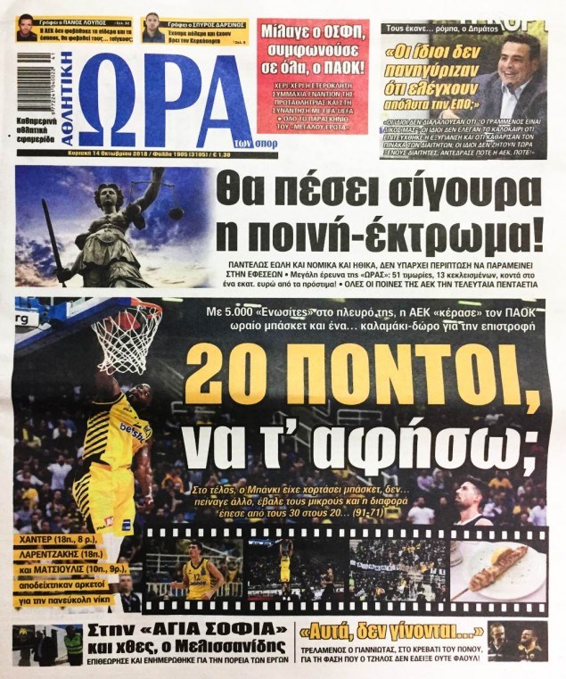 Οι αθλητικές εφημερίδες 14/10/2018 Κώστας Τεό 06:52, Κυριακή 14 Οκτωβρίου 2018 Media Διαβάστε τα σημερινά πρωτοσέλιδα των αθλητικών εφημερίδων: ΑΘΛΗΤΙΚΕΣ ΕΦΗΜΕΡΙΔΕΣ ΠΡΩΤΟΣΕΛΙΔΑ Μοιράσου το: σχολίασε κι εσύ (0 σχόλια) Ακολουθήστε το enikos.gr στο Google News και μάθετε πρώτοι όλες τις ειδήσεις Δείτε όλες τις τελευταίες ειδήσεις από την Ελλάδα και τον Κόσμο στο enikos.gr Ειδήσεις Ροή Ειδήσεων 4 ώρες πριν Χριστούγεννα στα μπλόκα: Επιμένουν στις κινητοποιήσεις τους οι αγρότες – Ανοίγουν τα διόδια το Σαββατοκύριακο 4 ώρες πριν Ουκρανία: Η άνευ προηγουμένου επίθεση σε ρωσικό τάνκερ στη Μεσόγειο και το μήνυμα προς στον Πούτιν – Το «μακρύ χέρι» του Κιέβου 3 ώρες πριν Πούτιν: Τα μηνύματα σε Ευρώπη και ΝΑΤΟ από το μαραθώνιο «σόου» του – Η απαίτηση για «σεβασμό» και η ειρήνη «με τους όρους» της Μόσχας 4 ώρες πριν Τραμπ: Δεν αποκλείει την πιθανότητα ενός πολέμου στη Βενεζουέλα – «Ο Μαδούρο ξέρει καλύτερα από τον καθένα τι ακριβώς θέλω» 5 ώρες πριν Συνεχίζει να προκαλεί ο Μίτσκοσκι: «Για μένα το όνομα Μακεδονία είναι ιερό» 3 ώρες πριν Ανακαλύφθηκαν αρχαία χρυσά νομίσματα 2.200 ετών που απεικονίζουν τον θεό Απόλλωνα – Η άγνωστη σύνδεση με τον Φίλιππο Β΄ της Μακεδονίας 4 ώρες πριν Ύπνος: Μια κρυφή κατάσταση του εγκεφάλου πριν από τον ύπνο μπορεί να είναι το “κλειδί” για υψηλή ευφυΐα και δημιουργικότητα 5 ώρες πριν Αριθμολογία: Οι άνθρωποι που έχουν γεννηθεί αυτές τις 4 ημερομηνίες, συχνά παρεξηγούνται – «Η καλοσύνη τους κρύβει τεράστια δύναμη» 6 ώρες πριν Ξεχάστε το καθάρισμα το Σαββατοκύριακο: Ο «κανόνας των 20 λεπτών» που θα σας λύσει τα χέρια 2 λεπτά πριν Ντόναλντ Τραμπ: «Πολύ βαριά αντίποινα» στη Συρία – «Πλήττουμε πολύ δυνατά οχυρά του Ισλαμικού Κράτους» 17 λεπτά πριν Εξάρχεια: Ένταση με μολότοφ, χημικά και κρότου λάμψης 32 λεπτά πριν ΗΠΑ: Τραγωδία στην Αλαμπάμα – Σκότωσε την δημοσιογράφο σύζυγό του και αυτοκτόνησε μπροστά στον 3χρονο γιο τους 47 λεπτά πριν Πρόταση γάμου στο ΣΕΦ κατά την διάρκεια του αγώνα Ολυμπιακός-Βιλερμπάν – Δείτε βίντεο 1 ώρα πριν Euroleague: Επέστρεψε στις νίκες ο Ολυμπιακός, πήρε την ματσάρα της χρονιάς η Μπάρτσα – Τα αποτελέσματα και η βαθμολογία ENIKOS NETWORK Το ΕΚΑΒ τιμήθηκε από την Ακαδημία Αθηνών για τα 40 χρόνια προσφοράς του Έχετε πραγματικά μεγάλη καρδιά; 10 χαρακτηριστικά όσων έχουν καλοσύνη Αναστολή μέτρων αναγκαστικής εκτέλεσης για κτηνοτρόφους που πλήττονται από την ευλογιά των αιγοπροβάτων Πλήρης επάρκεια προϊόντων στις λαϊκές της Αττικής, παρά τις αγροτικές κινητοποιήσεις – Τι απαντούν οι πωλητές Χαρτογραφώντας το «σημείο χωρίς επιστροφή»: Για πρώτη φορά αποκαλύπτεται με λεπτομέρεια το ακανθώδες όριο της ατμόσφαιρας τ... Η Google καταργεί τη λειτουργία «dark web report» – Πώς θα μπορούν οι χρήστες να διαγράφουν τα δεδομένα τους περισσότερα 22:42 , Παρασκευή 19 Δεκεμβρίου 2025 Γιώργος Γιαννόπουλος για “Το σόι σου”: “Είναι ευτυχία και ευλογία αυτή η σειρά” «Είναι ευτυχία και ευλογία η συγκυρία αυτής της σειράς», θα πει ο Γιώργος Γιαννόπουλος -ο αγαπ... 20:37 , Παρασκευή 19 Δεκεμβρίου 2025 Don’t Forget The Lyrics: Η Έλλη Κοκκίνου υποδέχεται 4 παίκτες που θα κάνουν τα πάντα για να μη χάσουν ούτε… μισή λέξη από τους στίχους Το «Don’t Forget The Lyrics» επιστρέφει απόψε, Παρασκευή 19 Δεκεμβρίου, στις 21:00 με νέο επει... 19:31 , Παρασκευή 19 Δεκεμβρίου 2025 GNTM: Απόψε ο μεγάλος τελικός για τους 4 φιναλίστ Έπειτα από μήνες γεμάτους μόδα, δημιουργία και έντονες αναμετρήσεις, το GNTM 2025 κορυφώνεται,... 18:11 , Πα