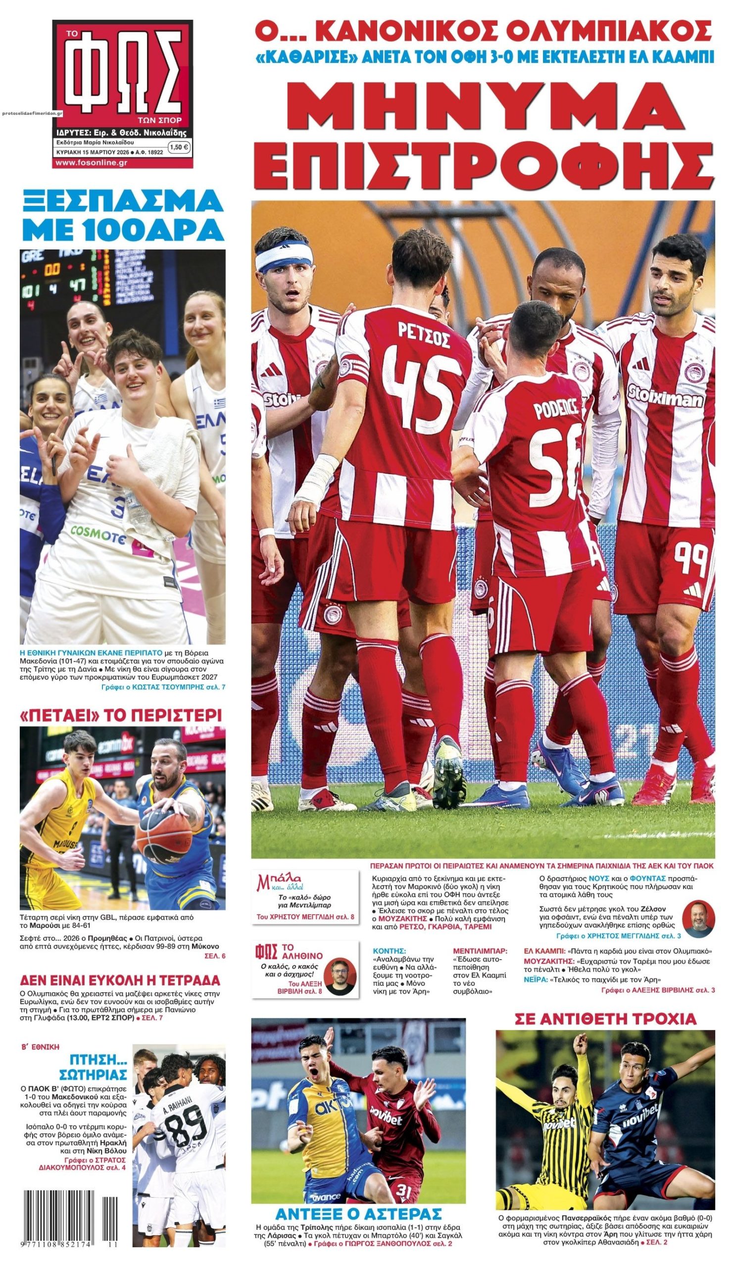 Οι αθλητικές εφημερίδες 15/3/2026 Enikos Newsroom 05:43, Κυριακή 15 Μαρτίου 2026 Media Διαβάστε τα πρωτοσέλιδα από τις αθλητικές εφημερίδες, σήμερα 15/3/2026. ΑΘΛΗΤΙΚΕΣ ΕΦΗΜΕΡΙΔΕΣ ΕΦΗΜΕΡΙΔΕΣ ΠΡΩΤΟΣΕΛΙΔΑ Μοιράσου το: Τρεις από τις Ιρανές ποδοσφαιρίστριες που ζήτησαν άσυλο στην Αυστραλία αποφάσισαν να επιστρέψουν στην πατρίδα τους Φόρμουλα 1: Ακυρώνονται οι αγώνες σε Μπαχρέιν και Σαουδική Αραβία λόγω του πολέμου στη Μέση Ανατολή Premier League: Βαθμός από χρυσάφι για την Γουέστ Χαμ απέναντι στην Σίτι, που χάνει έδαφος για τον τίτλο – Όλα τα αποτελέσματα και η βαθμολογία σχολίασε κι εσύ (0 σχόλια) Ακολουθήστε το enikos.gr στο Google News και μάθετε πρώτοι όλες τις ειδήσεις Δείτε όλες τις τελευταίες ειδήσεις από την Ελλάδα και τον Κόσμο στο enikos.gr Ειδήσεις Ροή Ειδήσεων 23 ώρες πριν LIVE – 15η ημέρα πολέμου ΗΠΑ – Ισραήλ με Ιράν – Όλες οι εξελίξεις στη Μέση Ανατολή 9 ώρες πριν Πόσο σημαντικό είναι το νησί Χαργκ για το Ιράν – Γιατί οι ΗΠΑ το έβαλαν στο στόχαστρο, αλλά δεν χτύπησαν τις πετρελαϊκές εγκαταστάσεις του 8 ώρες πριν Δολοφονία 20χρονου στη Θεσσαλονίκη: «Κλειδί» οι καταθέσεις των δύο ατόμων που ήταν μαζί με το θύμα – «Μου σκότωσαν το παιδί μου στο πεζοδρόμιο» 12 ώρες πριν Σοφία Μητσοτάκη: «Ελπίζω ότι εδώ ολοκληρώνεται αυτή η αθλιότητα» – Δημοσίευσε το εισιτήριό της από την πτήση της από το αεροδρόμιο του Μουσκάτ 8 ώρες πριν ΠΑΣΟΚ: Στις κάλπες για την εκλογή συνέδρων εν μέσω «τρικυμίας» – Προσπάθεια να πέσουν οι τόνοι μετά τη διαγραφή Κωνσταντινόπουλου 52 λεπτά πριν Οπτική ψευδαίσθηση: Μόνο αν έχετε παρατηρητικότητα ντετέκτιβ, θα εντοπίσετε το κοριτσάκι στην εικόνα σε 11 δευτερόλεπτα 1 ώρα πριν Η διατροφή που προστατεύει τον εγκέφαλο: 10 τροφές που μειώνουν τον κίνδυνο άνοιας 4 ώρες πριν Ζώδια 15/3: Ημερήσιες προβλέψεις – Σκορπιοί, αν περιμένατε για να στείλετε ένα τολμηρό μήνυμα, τώρα είναι η ώρα 8 ώρες πριν Σπουδαία ανακάλυψη: Ήρθε στο φως μνημειώδης ρωμαϊκός τάφος με σκηνές μονομάχων κατά μήκος της αρχαίας Αππίας Οδού 7 λεπτά πριν Διαβάστε στη Realnews που κυκλοφορεί σήμερα Κυριακή 15/3 15 λεπτά πριν Επιφυλακτική η Ιαπωνία ως προς την πρόσκληση του Τραμπ για το Στενό του Ορμούζ, αναφέρουν δημοσιεύματα 31 λεπτά πριν ΔΕΔΔΗΕ: Διακοπές ρεύματος σήμερα (15/3) στην Αθήνα και σε άλλες 9 περιοχές της Αττικής 47 λεπτά πριν Ισραήλ: Δύο πυρκαγιές μετά την αναχαίτιση κύματος ιρανικών πυραύλων 52 λεπτά πριν Οπτική ψευδαίσθηση: Μόνο αν έχετε παρατηρητικότητα ντετέκτιβ, θα εντοπίσετε το κοριτσάκι στην εικόνα σε 11 δευτερόλεπτα ENIKOS NETWORK Το θεραπευτικό λαχανικό της Μεσογείου που μπορεί να προλάβει την οστεοπόρωση και να αντιμετωπίσει την υπέρταση 3 όμορφα φυτά εσωτερικού χώρου που πρέπει να έχετε στο σπίτι για να βελτιώσετε τον ύπνο σας Ελαιόδεντρα – Όλα όσα πρέπει να γνωρίζετε για τη διαδικασία δήλωσης Πλαφόν στα καύσιμα: Προς κινητοποιήσεις οι πρατηριούχοι – Τι λένε για την τιμή της βενζίνης Jessica Adams: Πρόβλεψη σοκ από τη γνωστή αστρολόγο – Ο παγκόσμιος χάρτης θα ξαναγραφτεί το 2026 Τεστ παρατηρητικότητας: Μπορείτε να βρείτε τις 3 διαφορές στις εικόνες με ένα κοάλα σε 13 δευτερόλεπτα περισσότερα 07:00 , Κυριακή 15 Μαρτίου 2026 Διαβάστε στη Realnews που κυκλοφορεί σήμερα Κυριακή 15/3 Με τίτλο: «Ναυάγιο της οικονομίας στα Στενά του Ορμούζ» κυκλοφορεί, σήμερα Κυριακή 15/3, η Rea... 04:54 , Κυριακή 15 Μαρτίου 2026 J2US: Δείτε το ζευγάρι που αποχώρησε στο 4ο live Τον καλύτερό τους εαυτό στη σκηνή έδωσαν τα ζευγάρια που διαγωνίστηκαν στο χθεσι
