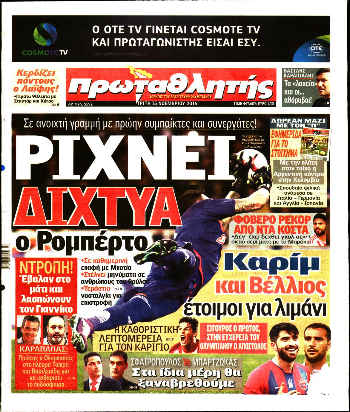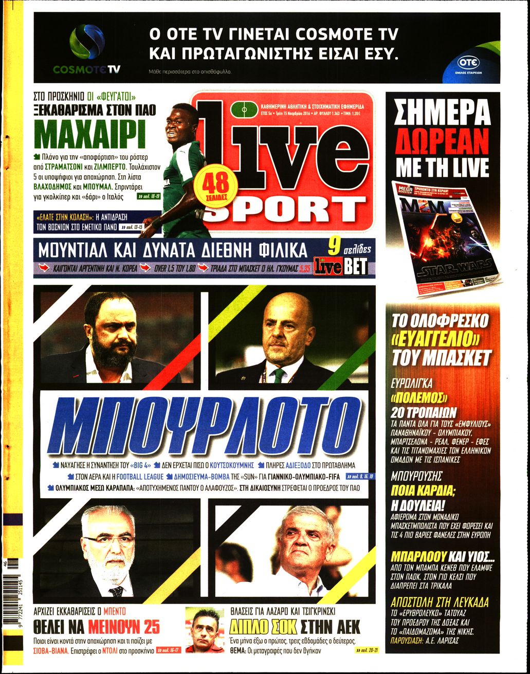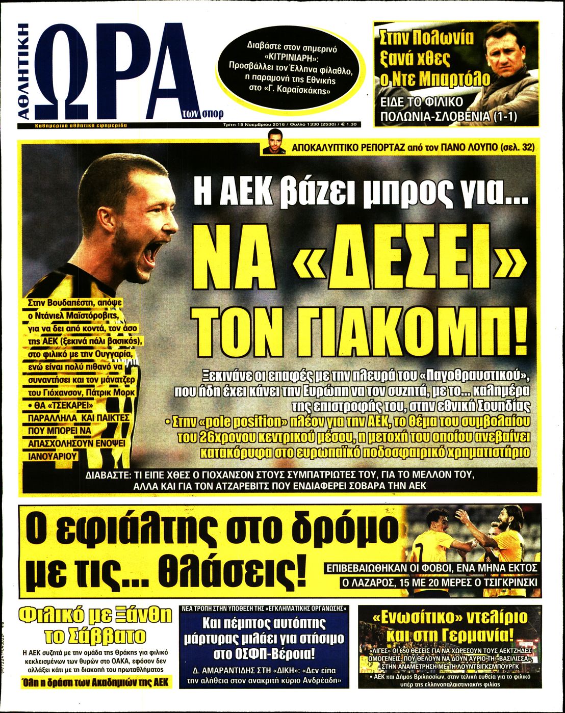 Οι αθλητικές εφημερίδες 15/11/2016 Enikos Newsroom 03:55, Τρίτη 15 Νοεμβρίου 2016 Media Διαβάστε τα σημερινά πρωτοσέλιδα των αθλητικών εφημερίδων: ΑΘΛΗΤΙΚΕΣ ΕΦΗΜΕΡΙΔΕΣ ΠΡΩΤΟΣΕΛΙΔΑ Μοιράσου το: σχολίασε κι εσύ (0 σχόλια) Ακολουθήστε το enikos.gr στο Google News και μάθετε πρώτοι όλες τις ειδήσεις Δείτε όλες τις τελευταίες ειδήσεις από την Ελλάδα και τον Κόσμο στο enikos.gr Ειδήσεις Ροή Ειδήσεων 1 ώρα πριν Εκτός ευρωομάδας ΣΥΡΙΖΑ ο Νίκος Παππάς μετά την επίθεση στον δημοσιογράφο Νίκο Γιαννόπουλο – Η μήνυση και οι νέες δηλώσεις 2 ώρες πριν «Αγριεύουν» οι αγρότες: «Δεν συντρέχει λόγος συνάντησης με τον πρωθυπουργό» – Ώρα αποφάσεων στη σύσκεψη της Πέμπτης 2 ώρες πριν Κυψέλη: Χωρίς την οικογένειά της δίπλα της απολογήθηκε η 16χρονη – «Της είχε επιτεθεί κάποιος για να την βιάσει, φοβήθηκε και κυκλοφορούσε με μαχαίρι» 1 ώρα πριν Politico: Το πρόβλημα της Ευρώπης δεν είναι το Βέλγιο αλλά ο Ντόναλντ Τραμπ 3 ώρες πριν Αλεξανδρούπολη: Πολυοργανική ανεπάρκεια λόγω υποσιτισμού η αιτία θανάτου του 3χρονου αγοριού 2 ώρες πριν Μυστήριο με τεράστιες κυκλικές πέτρες 200 κιλών – Ανακαλύφθηκαν τυχαία κατά τη διάρκεια οδικών έργων και κανείς δεν ξέρει από πού προέρχονται 3 ώρες πριν Ύπνος: Ειδικός εξηγεί τον πραγματικό λόγο που ξυπνάτε στις 4 τα ξημερώματα – Ο ρόλος των ορμονών και του κιρκάδιου ρυθμού 4 ώρες πριν Αριθμολογία: Οι άνθρωποι που έχουν γεννηθεί αυτές τις 4 ημερομηνίες, είναι τρυφεροί και αγαπούν ανιδιοτελώς 15 ώρες πριν 20 χρόνια τα Χριστούγεννα ξεκινούν στα Public με μεγάλη ποικιλία σε δώρα! 8 λεπτά πριν Βέλγους πολιτικούς και επικεφαλής χρηματοπιστωτικών ιδρυμάτων στοχοποιεί η Μόσχα για τα κατασχεθέντα περιουσιακά στοιχεία 23 λεπτά πριν ΗΠΑ: Αναζητείται δεύτερος ύποπτος για την επίθεση στο πανεπιστήμιο Μπράουν 38 λεπτά πριν Λεωφόρος Αλεξάνδρας: Δεν εντοπίστηκε βόμβα έξω από το κολλέγιο – Προσήχθη άνδρας για το προειδοποιητικό σημείωμα 55 λεπτά πριν Ελένη Κρίτα για το reunion του «Παρά Πέντε»: «Ήταν πραγματικά σαν να μην είχαμε χαθεί ποτέ» 1 ώρα πριν Κύπελλο Ελλάδας: Αυτά είναι τα ζευγάρια στα νοκ-άουτ, οι διασταυρώσεις στους «8» κι ο δρόμος προς τον τελικό ENIKOS NETWORK Αϋπνία: Το κόλπο που θα σας βοηθήσει να κοιμηθείτε απόψε – Είναι απλό και έχει αποτέλεσμα 2,6 εκατομμύρια πολίτες έχουν ήδη εμβολιαστεί κατά της γρίπης ΕΛΣΤΑΤ: Τι δείχνουν τα νέα στοιχεία για τις ηλεκτρονικές παραγγελίες των επιχειρήσεων ΚΕΠΕ: Οι 3 διακριτές συμβολές των ΜμΕ και της μεταποίησης στην ελληνική οικονομία Χαρτογραφώντας το «σημείο χωρίς επιστροφή»: Για πρώτη φορά αποκαλύπτεται με λεπτομέρεια το ακανθώδες όριο της ατμόσφαιρας τ... Η Google καταργεί τη λειτουργία «dark web report» – Πώς θα μπορούν οι χρήστες να διαγράφουν τα δεδομένα τους περισσότερα 22:24 , Τετάρτη 17 Δεκεμβρίου 2025 Το Σπίτι Δίπλα Στο Ποτάμι: Σε κίνδυνο η υγεία του Απόστολου – Τι θα δούμε απόψε “Το Σπίτι Δίπλα στο Ποτάμι” ξετυλίγει το νήμα της ζωής των πέντε αδελφών με καταισ... 21:14 , Τετάρτη 17 Δεκεμβρίου 2025 Παιχνίδια Εκδίκησης: Θα καταφέρει ο Χρήστος να κλονίσει την εμπιστοσύνη της Μάγιας απέναντι στον Άγη; Τα «Παιχνίδια Εκδίκησης» έρχονται απόψε στις 22:30, στον Αντ1, με το τελευταίο επεισόδιο της χ... 20:57 , Τετάρτη 17 Δεκεμβρίου 2025 Άγιος Έρωτας: Η Χλόη καταθέτει εναντίον του πατέρα της και ο Χάρης αποκαλύπτει στον Κλεάνθη ότι δεν είναι ο βιολογικός του πατέρας. Γεμάτο αποκαλύψεις είναι το νέο επεισόδιο της σειράς “Άγιος Έρωτας” απόψε στις 21:... 20:15 , Τετάρτη 17 Δεκεμβρίο