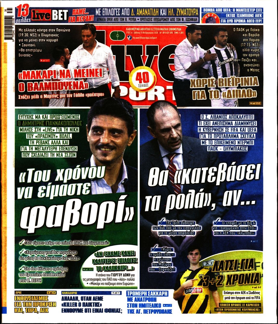 Οι αθλητικές εφημερίδες 15/2/2020 Διονύσης Νίκκας 07:48, Σάββατο 15 Φεβρουαρίου 2020 Media Διαβάστε τα πρωτοσέλιδα των αθλητικών εφημερίδων… ΑΘΛΗΤΙΚΕΣ ΕΦΗΜΕΡΙΔΕΣ ΠΡΩΤΟΣΕΛΙΔΑ Μοιράσου το: σχολίασε κι εσύ (0 σχόλια) Ακολουθήστε το enikos.gr στο Google News και μάθετε πρώτοι όλες τις ειδήσεις Δείτε όλες τις τελευταίες ειδήσεις από την Ελλάδα και τον Κόσμο στο enikos.gr Ειδήσεις Ροή Ειδήσεων 4 ώρες πριν Μεσόγειος: Η διαδρομή του ρωσικού τάνκερ «Qendil» και η στοχευμένη επίθεση της Ουκρανίας με drone – Ο Πούτιν προειδοποίησε για αντίποινα 52 λεπτά πριν Αγρότες: Έκλεισαν για μία ώρα την παρακαμπτήρια της Ιόνιας Οδού στη θέση Χαλίκι 2 ώρες πριν Εμπλοκή και αερομαχίες με οπλισμένα τουρκικά F-16 στο Αιγαίο 2 ώρες πριν Πούτιν: «Ναι, είμαι ερωτευμένος» – Βίντεο από τη σπάνια προσωπική παραδοχή του 56 λεπτά πριν Ανδρέας Λυκουρέντζος: Υπέβαλε την παραίτησή του ο πρόεδρος του ΕΛΓΑ, αλλά δεν έγινε δεκτή – Όλο το παρασκήνιο 1 ώρα πριν Αριθμολογία: Οι άνθρωποι που έχουν γεννηθεί αυτές τις 4 ημερομηνίες, συχνά παρεξηγούνται – «Η καλοσύνη τους κρύβει τεράστια δύναμη» 3 ώρες πριν Μήπως έχετε χάσει τον εαυτό σας στη σχέση σας; 7 «αθόρυβες» υποχωρήσεις που μάλλον κάνατε, χωρίς να το συνειδητοποιήσετε 2 ώρες πριν Ξεχάστε το καθάρισμα το Σαββατοκύριακο: Ο «κανόνας των 20 λεπτών» που θα σας λύσει τα χέρια 5 ώρες πριν Κουίζ για την παλιά Αθήνα: Αναγνωρίζετε την περιοχή; Έχετε περάσει 100% από εκεί 6 λεπτά πριν Ύπνος: Μια κρυφή κατάσταση του εγκεφάλου πριν από τον ύπνο μπορεί να είναι το “κλειδί” για υψηλή ευφυΐα και δημιουργικότητα 12 λεπτά πριν ΕΕ: «Κάποια στιγμή θα χρησιμοποιήσουμε τα ρωσικά περιουσιακά στοιχεία» δήλωσε ο πρόεδρος του ΕΛΚ 15 λεπτά πριν Conference League: Καλύτερη επίθεση η ΑΕΚ στη διοργάνωση και 2η σε προσπάθειες στην εστία – Ξεχωρίζουν Πινέδα, Ελίασον και Ρότα 17 λεπτά πριν Έγκυος η Άννα Κορακάκη: «Η οικογένειά μας μεγαλώνει…» – Η αποκάλυψη για το φύλο του μωρού 24 λεπτά πριν Τραγωδία στο Βελεστίνο: Πέθανε ο αντιδήμαρχος Γιάννης Παπαϊωάννου ENIKOS NETWORK Το ΕΚΑΒ τιμήθηκε από την Ακαδημία Αθηνών για τα 40 χρόνια προσφοράς του Έχετε πραγματικά μεγάλη καρδιά; 10 χαρακτηριστικά όσων έχουν καλοσύνη Όμιλος ΔΕΗ: Νέα ορόσημα και ενισχυμένη διαφάνεια στην ετήσια Έκθεση Βιώσιμης Ανάπτυξης Έρχονται νέες προσλήψεις σε Δήμο – Όλες οι λεπτομέρειες Χαρτογραφώντας το «σημείο χωρίς επιστροφή»: Για πρώτη φορά αποκαλύπτεται με λεπτομέρεια το ακανθώδες όριο της ατμόσφαιρας τ... Η Google καταργεί τη λειτουργία «dark web report» – Πώς θα μπορούν οι χρήστες να διαγράφουν τα δεδομένα τους περισσότερα 20:37 , Παρασκευή 19 Δεκεμβρίου 2025 Don’t Forget The Lyrics: Η Έλλη Κοκκίνου υποδέχεται 4 παίκτες που θα κάνουν τα πάντα για να μη χάσουν ούτε… μισή λέξη από τους στίχους Το «Don’t Forget The Lyrics» επιστρέφει απόψε, Παρασκευή 19 Δεκεμβρίου, στις 21:00 με νέο επει... 19:31 , Παρασκευή 19 Δεκεμβρίου 2025 GNTM: Απόψε ο μεγάλος τελικός για τους 4 φιναλίστ Έπειτα από μήνες γεμάτους μόδα, δημιουργία και έντονες αναμετρήσεις, το GNTM 2025 κορυφώνεται,... 18:11 , Παρασκευή 19 Δεκεμβρίου 2025 Το σόι σου: Ο Άρης έρχεται στην Ελλάδα για τις γιορτές των Χριστουγέννων – Τι θα δούμε στο αποψινό εορταστικό επεισόδιο Ένα απολαυστικό, εορταστικό επεισόδιο της σειράς “Το σόι σου”, γεμάτο ευτράπελα αλ... 15:15 , Παρασκευή 19 Δεκεμβρίου 2025 Την Κυριακή με τη Realnews: Ό,τι και αν αγοράσεις, σκανάρεις και κερδίζεις! Την Κυριακή με τη Realnews: Ό,τι και αν αγοράσεις, σκανάρεις και κερδίζεις! Με το PADU app, το... ΤΕΛΕΥΤΑΙ