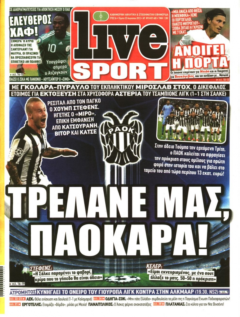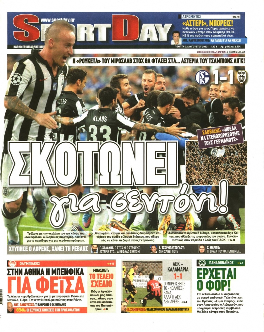 Οι αθλητικές εφημερίδες Enikos Newsroom 09:14, Πέμπτη 22 Αυγούστου 2013 Media Οι αθλητικές εφημερίδες Διαβάστε τα πρωτοσέλιδα των αθλητικών εφημερίδων: ΑΘΛΗΤΙΚΕΣ ΕΦΗΜΕΡΙΔΕΣ ΕΦΗΜΕΡΙΔΕΣ ΠΡΩΤΟΣΕΛΙΔΑ Μοιράσου το: σχολίασε κι εσύ (0 σχόλια) Ακολουθήστε το enikos.gr στο Google News και μάθετε πρώτοι όλες τις ειδήσεις Δείτε όλες τις τελευταίες ειδήσεις από την Ελλάδα και τον Κόσμο στο enikos.gr Ειδήσεις Ροή Ειδήσεων 3 ώρες πριν Ακίλα Σάλεχ: «Άκυρο» το τουρκολιβυκό μνημόνιο λέει ο πρόεδρος της λιβυκής Βουλής – Ανοίγει ο διάλογος με Ελλάδα, Αίγυπτο και Τουρκία 8 ώρες πριν Αγρότες: Την Τρίτη η απόφαση για διάλογο ή κλιμάκωση των κινητοποιήσεών τους – Πώς χαρακτηρίζουν τις ανακοινώσεις Τσιάρα και οι επόμενες κινήσεις 7 ώρες πριν Τραμπ για Ουκρανία: «Είμαστε πιο κοντά σε συμφωνία από ποτέ» – «Πολυεθνική δύναμη» προτείνουν οι Ευρωπαίοι 7 ώρες πριν Κυψέλη: Η 16χρονη που μαχαίρωσε την 14χρονη είχε συλληφθεί 3 φορές στο παρελθόν – Έβριζε καθηγητές, έβαζε φωτιές σε κάδους και εκβίαζε συμμαθητές της 7 ώρες πριν Τρομοκρατική επίθεση στο Σίδνεϊ: Θλίψη για τα 15 θύματα – Οργή στην εβραϊκή κοινότητα που προειδοποιούσε επί δύο χρόνια 7 ώρες πριν Επιστήμονες ίσως έλυσαν το μυστήριο γύρω από τα Χόμπιτ – Νέα έρευνα αποκαλύπτει πώς εξαφανίστηκαν 8 ώρες πριν Ύπνος: Η αρχαία μορφή άσκησης που αποδεικνύεται αποτελεσματική στην αντιμετώπιση της αϋπνίας, σύμφωνα με μελέτη 9 ώρες πριν Αριθμολογία: Ο τυχερός σας αριθμός, ανάλογα με τον μήνα γέννησής σας 10 ώρες πριν Πώς να μην μαραίνονται γρήγορα τα κομμένα λουλούδια: Το λάθος στην τοποθέτηση του βάζου που πρέπει να αποφεύγετε 2 λεπτά πριν Δώρο Χριστουγέννων 2025: Ποιοι εργαζόμενοι το δικαιούνται – Η online εφαρμογή της ΓΣΕΕ για να το υπολογίσετε 9 λεπτά πριν Υψηλή χοληστερίνη: Γιατρός αποκαλύπτει δύο τρόπους για να την μειώσετε χωρίς φαρμακευτική αγωγή 17 λεπτά πριν Σαν σήμερα 16 Δεκεμβρίου: Τα σημαντικότερα γεγονότα της ημέρας 22 λεπτά πριν Οι οικονομικές εφημερίδες 16/12/2025 27 λεπτά πριν Οι αθλητικές εφημερίδες 16/12/2025 ENIKOS NETWORK Πότε το χρόνιο ροχαλητό να αποτελέσει ένδειξη κινδύνου για την καρδιά; Τι λένε οι ειδικοί Μάριος Θεμιστοκλέους: Το ΕΣΥ ενισχύεται, εκσυγχρονίζεται, αλλάζει ΕΒΕΠ για αγροτικές κινητοποιήσεις: Κάθε επιπλέον εβδομάδα προσθέτει περίπου 200 εκατ. ευρώ ζημιά Τι προβλέπει το νομοσχέδιο του υπουργείου Εθνικής Άμυνας – Oι αλλαγές στους μισθούς Σύγχρονος Νοστράδαμος: Προειδοποιεί για «μεγάλο γεγονός» τους επόμενους μήνες που θα συγκλονίσει τη Βρετανία και τον κόσμο Τεστ παρατηρητικότητας: Μπορείτε να βρείτε τις 3 διαφορές στις εικόνες με έναν πιγκουίνο σε 14 δευτερόλεπτα περισσότερα 05:48 , Τρίτη 16 Δεκεμβρίου 2025 Οι οικονομικές εφημερίδες 16/12/2025 Διαβάστε τα πρωτοσέλιδα από τις οικονομικές εφημερίδες, σήμερα 16/12/2025. 05:43 , Τρίτη 16 Δεκεμβρίου 2025 Οι αθλητικές εφημερίδες 16/12/2025 Διαβάστε τα πρωτοσέλιδα από τις αθλητικές εφημερίδες, σήμερα 16/12/2025. 05:38 , Τρίτη 16 Δεκεμβρίου 2025 Οι πολιτικές εφημερίδες 16/12/2025 Διαβάστε τα πρωτοσέλιδα από τις πολιτικές εφημερίδες, σήμερα 16/12/2025. 21:35 , Δευτέρα 15 Δεκεμβρίου 2025 Το Σπίτι Δίπλα Στο Ποτάμι: Η Ιουλία και ο Φωκάς μετακομίζουν στη Ρόδο – Δύο νέοι χαρακτήρες μπαίνουν στη σειρά Δύο νέοι, κομβικοί χαρακτήρες κάνουν την εμφάνισή τους αυτή την εβδομάδα στην αγαπημένη σειρά ... ΤΕΛΕΥΤΑΙΕΣ ΕΙΔΗΣΕΙΣ 9 λεπτά πριν Υψηλή χοληστερίνη: Γιατρός αποκαλύπτει δύο τρόπους... 17 λεπτά πριν Σαν σήμερα 16 Δεκεμβρίου: Τα σημαντικότερα γεγονότα...