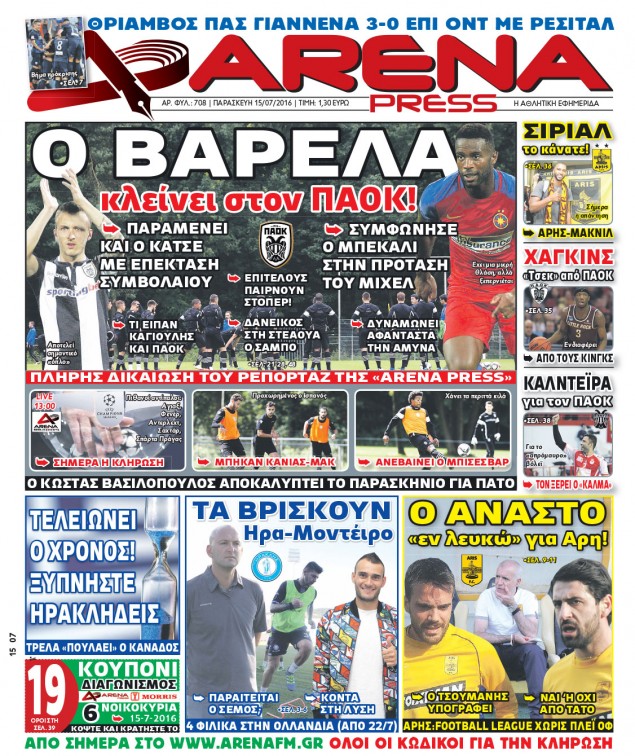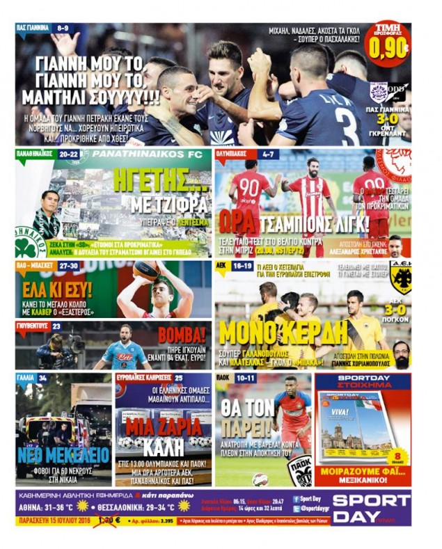 Οι αθλητικές εφημερίδες 15/7/2016 Enikos Newsroom 05:40, Παρασκευή 15 Ιουλίου 2016 Media Διαβάστε τα σημερινά πρωτοσέλιδα των αθλητικών εφημερίδων: ΑΘΛΗΤΙΚΕΣ ΕΦΗΜΕΡΙΔΕΣ ΠΡΩΤΟΣΕΛΙΔΑ Μοιράσου το: σχολίασε κι εσύ (0 σχόλια) Ακολουθήστε το enikos.gr στο Google News και μάθετε πρώτοι όλες τις ειδήσεις Δείτε όλες τις τελευταίες ειδήσεις από την Ελλάδα και τον Κόσμο στο enikos.gr Ειδήσεις Ροή Ειδήσεων 1 ώρα πριν Δημοσκόπηση Metron Analysis: Στις 10 μονάδες η διαφορά ΝΔ-ΠΑΣΟΚ, στην 3η θέση η Πλεύση Ελευθερίας – 8 στους 10 στηρίζουν τον αγώνα των αγροτών 5 ώρες πριν Αγρότες: «Όχι στον διάλογο, μας εμπαίζει η κυβέρνηση» – Αποφάσισαν κλιμάκωση των κινητοποιήσεων, τι θα γίνει τα Χριστούγεννα 58 λεπτά πριν Νίκος Παππάς στον ΑΝΤ1: «Δεν κρύβομαι – Μετά το συμβάν ακολούθησα κανονικά το πρόγραμμά μου» – ΒΙΝΤΕΟ 2 ώρες πριν Αθήνα: Εξαρθρώθηκε εγκληματική οργάνωση που διακινούσε ναρκωτικά σε μορφή σοκολάτας – Δύο τράπερ ανάμεσα στους 4 συλληφθέντες – ΒΙΝΤΕΟ 50 λεπτά πριν Διαμαντής Καραναστάσης: Οδηγούσε υπό την επήρεια αλκοόλ – Του αφαιρέθηκε το δίπλωμα και του επιβλήθηκε πρόστιμο 350 ευρώ 1 ώρα πριν Manifesting: Πώς να συναντήσετε τον σύντροφο της ζωής σας, ανάλογα με τον μήνα γέννησής σας 3 ώρες πριν Γάμος: 11 ψυχρές αλλά ευγενικές φράσεις, που λέει ένας άνδρας όταν σκέφτεται τον χωρισμό 2 ώρες πριν Σφουγγάρισμα: Η συνήθεια που θα σας βοηθήσει να διατηρήσετε το σπίτι σας καθαρό και τακτοποιημένο 2 ημέρες πριν 20 χρόνια τα Χριστούγεννα ξεκινούν στα Public με μεγάλη ποικιλία σε δώρα! 28 δευτερόλεπτα πριν Τσιάρας: Δεν θα κινδυνέψουν οι πληρωμές των αγροτών – Χρειαζόμαστε μια νέα πολιτική, ένα restart 7 λεπτά πριν Δέσποινα Βανδή: Το βίντεο που δημοσίευσε με τον Γιώργο Νικολαΐδη – «Έχουμε καταστραφεί από τα μελομακάρονά σου» 13 λεπτά πριν Κλήρωση ΤΖΟΚΕΡ 18/12/2025: Αυτοί είναι οι τυχεροί αριθμοί 16 λεπτά πριν Τραμπ: Ζητεί από την Ουκρανία να “κινηθεί γρήγορα” στις διαπραγματεύσεις για το τέλος της σύγκρουσης 21 λεπτά πριν Ύπνος: Η απλή βραδινή ρουτίνα για να προστατεύσετε τα μαλλιά σας από το κρύο κατά τη διάρκεια του χειμώνα ENIKOS NETWORK Σε περίοδο αυξημένης δραστηριότητας η γρίπη στην Ελλάδα-Μέτρα προστασίας από τον ΕΟΔΥ Σκέφτεστε συνέχεια συζητήσεις που έχετε κάνει; Τι σημαίνει αυτό, σύμφωνα με ειδικό ΑΣΕΠ 2ΓΒ/2025: Σήμερα αρχίζει η υποβολή ενστάσεων – Πότε θα βγουν τα οριστικά αποτελέσματα ΕΛΤΑ: Αυτό είναι το νέο σχέδιο μετασχηματισμού του Οργανισμού- Τι δήλωσαν Πιερρακάκης και Παπαστεργίου Χαρτογραφώντας το «σημείο χωρίς επιστροφή»: Για πρώτη φορά αποκαλύπτεται με λεπτομέρεια το ακανθώδες όριο της ατμόσφαιρας τ... Η Google καταργεί τη λειτουργία «dark web report» – Πώς θα μπορούν οι χρήστες να διαγράφουν τα δεδομένα τους περισσότερα 17:45 , Πέμπτη 18 Δεκεμβρίου 2025 ROUK ZOUK: Εορταστικό επεισόδιο με καλεσμένους τους πρωταγωνιστές του «Γιατί ρε πατέρα» Το Σάββατο 20 Δεκεμβρίου στις 21:00, η Ζέτα Μακρυπούλια υποδέχεται εκλεκτούς ηθοποιούς που όλο... 17:20 , Πέμπτη 18 Δεκεμβρίου 2025 Άγιος έρωτας: Η Χριστίνα εξομολογείται στον πατέρα Νικόλαο, απόψε στις 21:00 στον Alpha Η Νότα αποφασίζει να εκδικηθεί τον Πέτρο και τον Στέφανο, για χάρη του Λούη, όμως τα πράγματα ... 16:50 , Πέμπτη 18 Δεκεμβρίου 2025 Να μ’ αγαπάς: Ζωή και Φωτεινή συμφιλιώνονται ως μάνα με κόρη, απόψε στις 20:00 Η ταυτότητα του Άγγελου αποκαλύπτεται στο νέο επεισόδιο της σειράς “Να μ’ αγαπάς... 15:52 , Πέμπτη 18 Δεκεμβρίου 2025 Το Σπίτι Δίπλα Στο Ποτάμι: Το καθηλωτικό τελευταίο επεισόδιο για το 2025 απόψε στις 22:30 