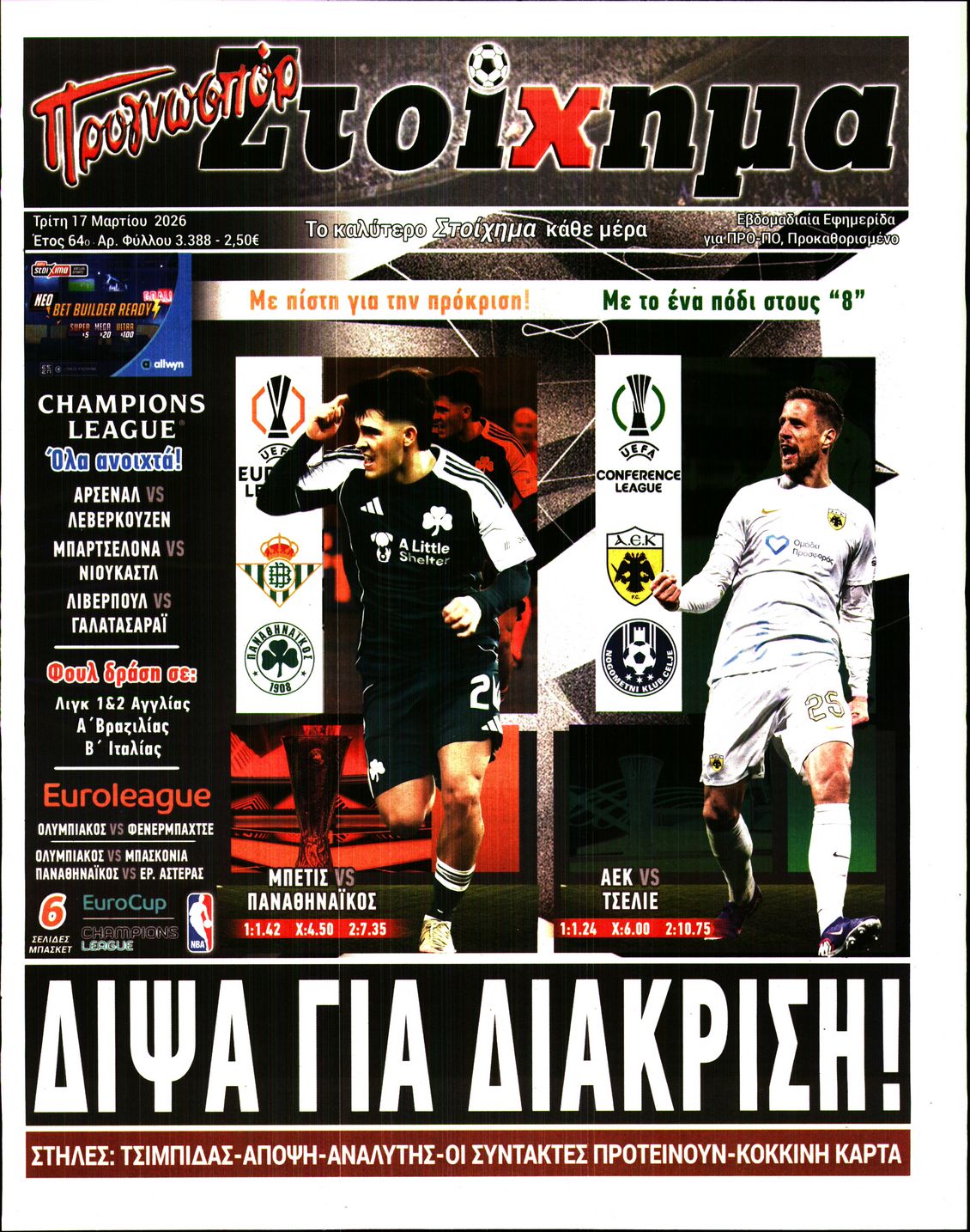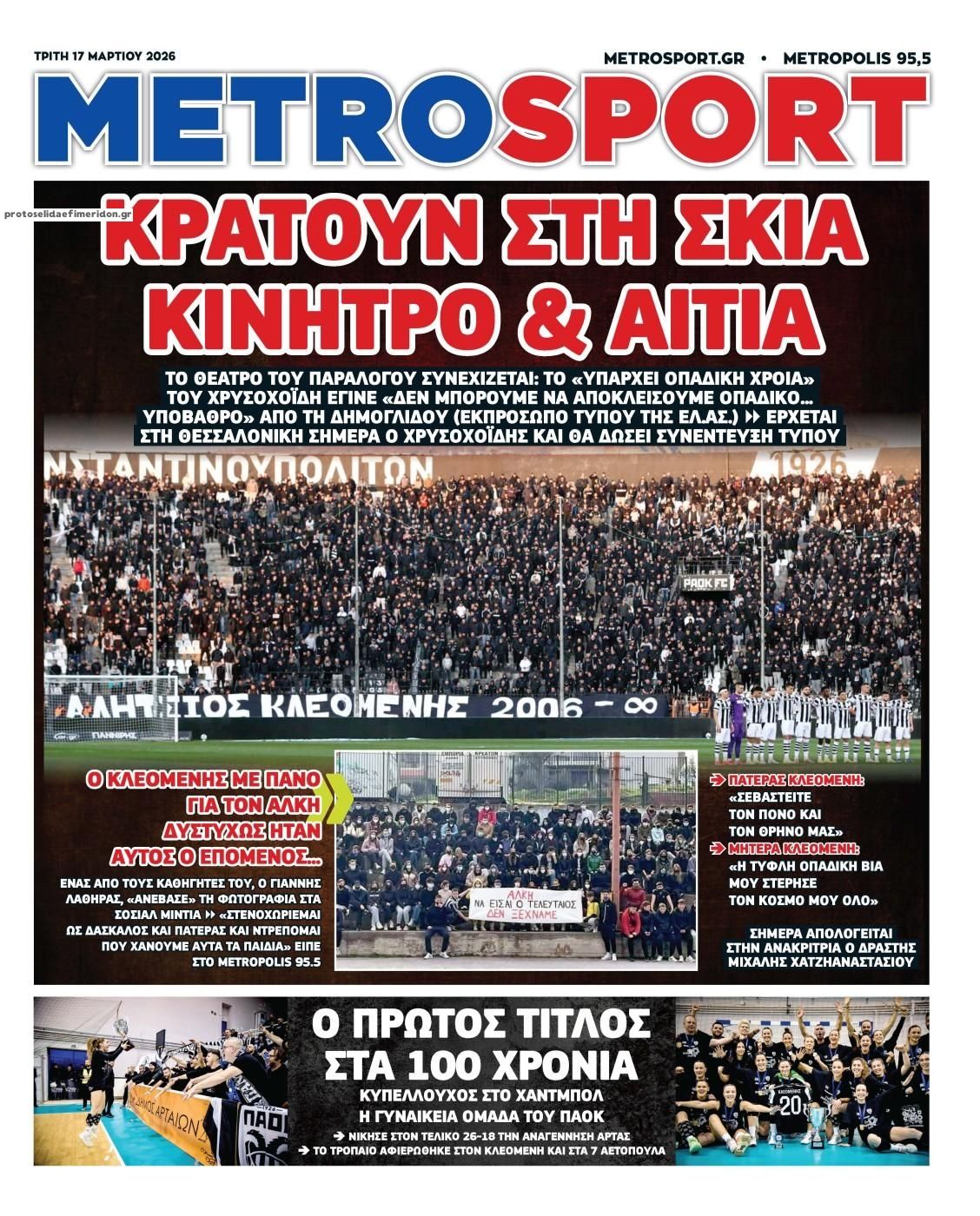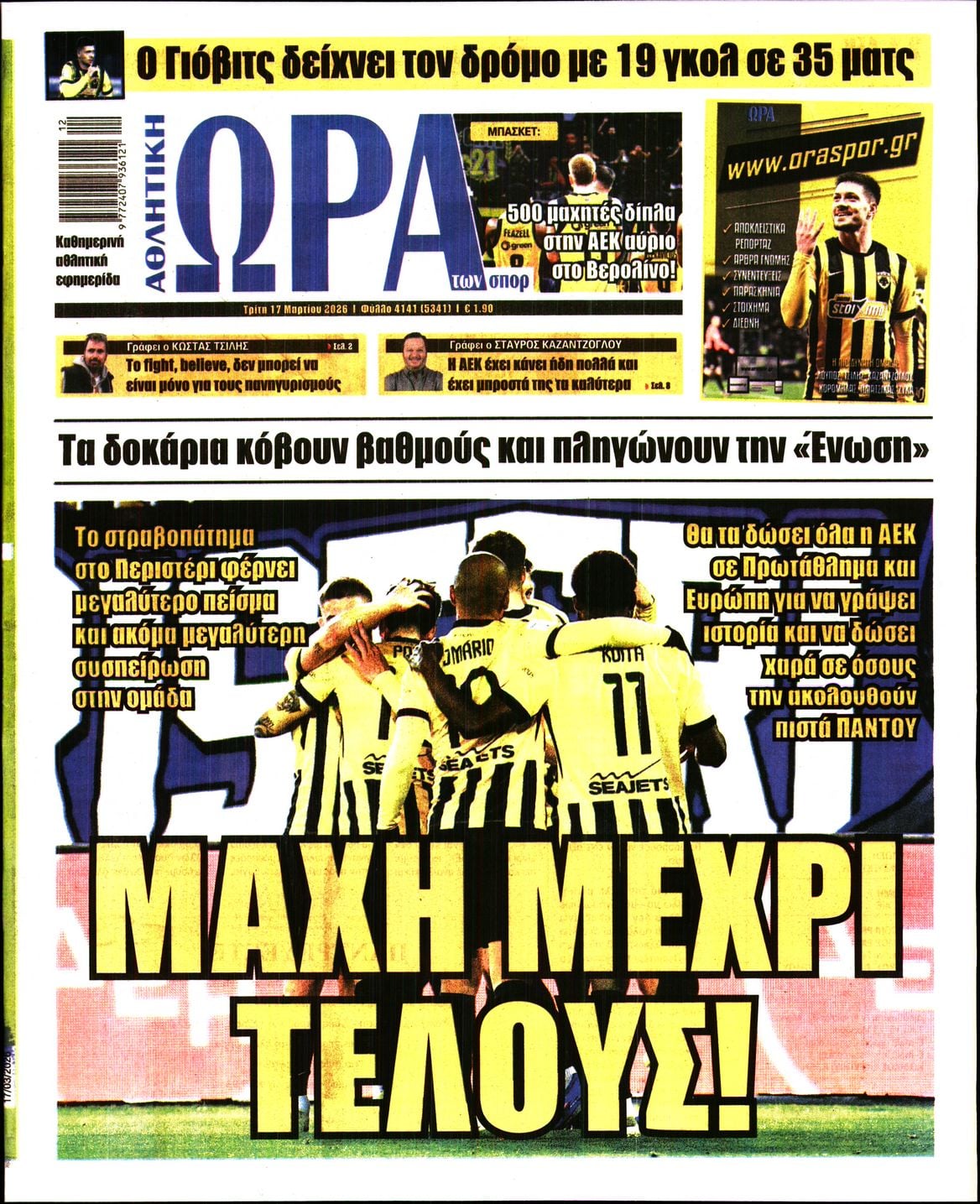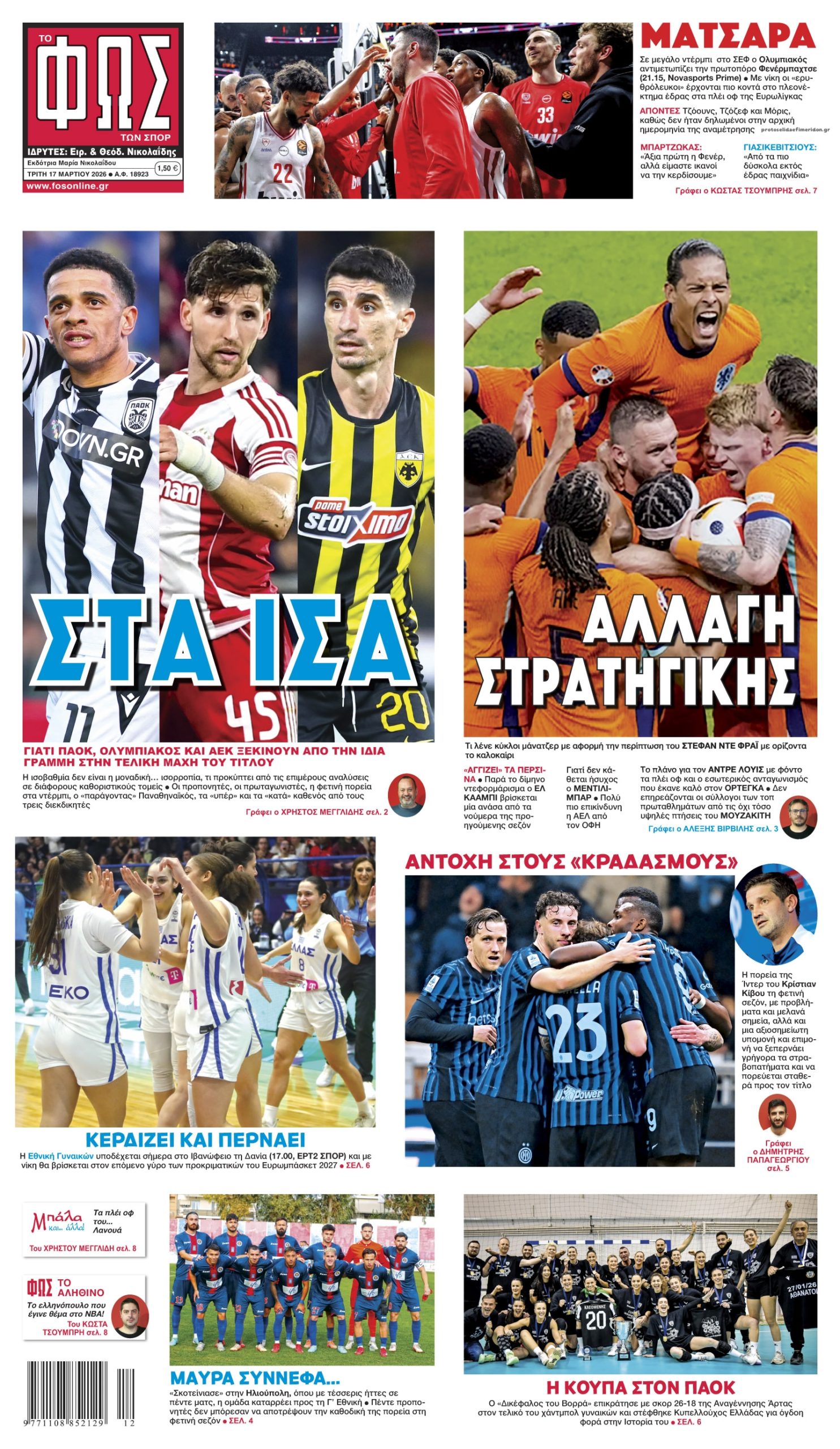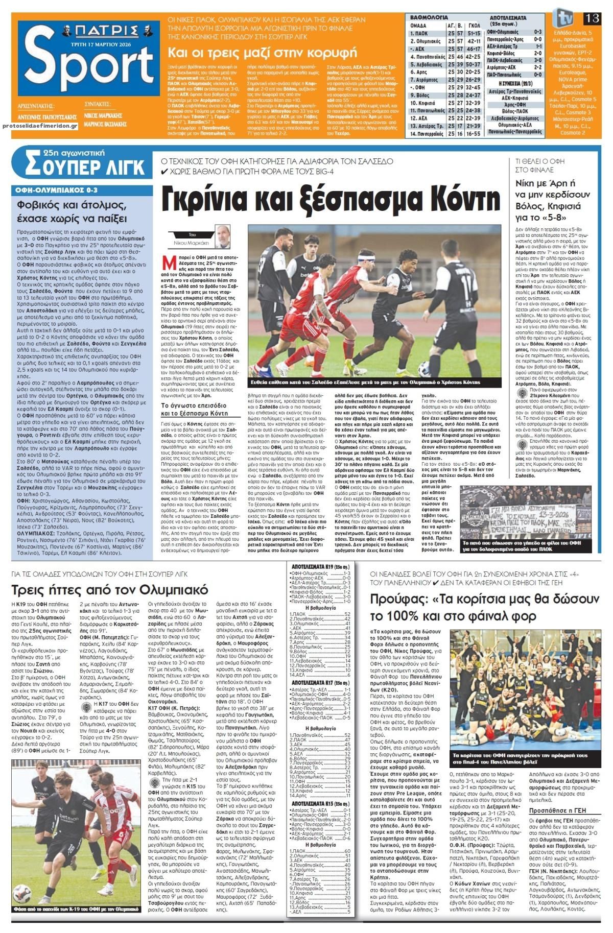 Οι αθλητικές εφημερίδες 17/3/2026 Enikos Newsroom 05:43, Τρίτη 17 Μαρτίου 2026 Media Διαβάστε τα πρωτοσέλιδα από τις αθλητικές εφημερίδες, σήμερα 17/3/2026. ΑΘΛΗΤΙΚΕΣ ΕΦΗΜΕΡΙΔΕΣ ΕΦΗΜΕΡΙΔΕΣ ΠΡΩΤΟΣΕΛΙΔΑ Μοιράσου το: Ο Αργεντινός τερματοφύλακας Σέρχιο Ρομέρο «κρέμασε» τα γάντια του Εβάν Φουρνιέ: Σκέφτεται να «κρεμάσει τα παπούτσια του» μετά τον Ολυμπιακό – Απίστευτο «το συναίσθημα να κατακτήσω την Euroleague στο ΟΑΚΑ» Premier League: Μπρέντφορντ και Γουλβς έμειναν στο 2-2 και αλληλοεξουδετερώθηκαν – Όλα τα αποτελέσματα και η βαθμολογία σχολίασε κι εσύ (0 σχόλια) Ακολουθήστε το enikos.gr στο Google News και μάθετε πρώτοι όλες τις ειδήσεις Δείτε όλες τις τελευταίες ειδήσεις από την Ελλάδα και τον Κόσμο στο enikos.gr Ειδήσεις Ροή Ειδήσεων 23 ώρες πριν LIVE – 17η ημέρα πολέμου ΗΠΑ – Ισραήλ με Ιράν – Οι εξελίξεις στη Μέση Ανατολή 8 ώρες πριν Καστελλόριζο: Βίντεο με το αναποδογυρισμένο σκάφος της Frontex – Με σοβαρά τραύματα αλλά εκτός κινδύνου δύο Εσθονοί 8 ώρες πριν Θεσσαλονίκη: Την Τρίτη απολογείται ο 23χρονος που μαχαίρωσε τον 20χρονο Κλεομένη – Το πανό για τον Άλκη και τα συγκλονιστικά λόγια της μητέρας του θύματος 7 ώρες πριν Ντόναλντ Τραμπ: Η επίθεση στο Ιράν απέτρεψε τον Γ’ Παγκόσμιο – «Ο πόλεμος θα τελειώσει σύντομα» 6 ώρες πριν Κωστής Χατζηδάκης: Θα παρέμβουμε όταν κατασταλάξουν τα πράγματα – Tα όποια μέτρα ληφθούν θα είναι στοχευμένα και προσωρινά 55 λεπτά πριν Οπτική ψευδαίσθηση: Μόνο αν είσαι ο Σέρλοκ Χολμς θα βρεις το φίδι σε 10 δευτερόλεπτα 1 ώρα πριν Η διατροφή που μειώνει τον κίνδυνο νεφρικής νόσου, σύμφωνα με μελέτη 4 ώρες πριν Ζώδια 17/3: Ημερήσιες προβλέψεις – Λέοντες, μην συγκρίνετε το σήμερα με το τότε 9 ώρες πριν Ύπνος: Συμβουλές από ειδικούς για να κοιμάστε πιο γρήγορα και να ξυπνάτε ξεκούραστοι 3 λεπτά πριν Οι αθλητικές μεταδόσεις της Τρίτης 17/3/2026 15 λεπτά πριν Η ένταση στη Μέση Ανατολή ανεβάζει ξανά τις τιμές του πετρελαίου 30 λεπτά πριν ΔΕΔΔΗΕ: Διακοπές ρεύματος σήμερα (17/3) στην Αθήνα και σε άλλες 11 περιοχές της Αττικής 47 λεπτά πριν Αφγανιστάν: Εκατοντάδες νεκροί στην αεροπορική επίθεση του Πακιστάν κατά κέντρου απεξάρτησης στην Καμπούλ 55 λεπτά πριν Οπτική ψευδαίσθηση: Μόνο αν είσαι ο Σέρλοκ Χολμς θα βρεις το φίδι σε 10 δευτερόλεπτα ENIKOS NETWORK Βρείτε τον κλέφτη στο κατάστημα – Έχετε τα κοφτερά μάτια ενός ντετέκτιβ για τον εντοπίσετε στην εικόνα σε 45 δευτερόλεπτα; Το ψάρι – σύμβολο της αφθονίας που μπορεί να ενισχύσει τη λειτουργία του θυρεοειδούς και του εγκεφάλου «Όχι» σε 13ο και 14ο μισθό στο Δημόσιο από την κυβέρνηση – «Εκτός του δημοσιονομικού χώρου των πρωτογενών δαπανών» Στενό του Ορμούζ: Πτώση 60% στις εξαγωγές πετρελαίου από τη Μέση Ανατολή – Από 25,13 σε 9,71 εκατ. βαρέλια την ημέρα Jessica Adams: Πρόβλεψη σοκ από τη γνωστή αστρολόγο – Ο παγκόσμιος χάρτης θα ξαναγραφτεί το 2026 Τεστ παρατηρητικότητας: Μπορείτε να βρείτε τις 3 διαφορές στις εικόνες με ένα κοάλα σε 13 δευτερόλεπτα περισσότερα 07:07 , Τρίτη 17 Μαρτίου 2026 Οι αθλητικές μεταδόσεις της Τρίτης 17/3/2026 Ο εξ αναβολής αγώνας του Ολυμπιακού με τη Φενέρμπαχτσε για την Euroleague και οι πρώτοι αγώνες... 05:48 , Τρίτη 17 Μαρτίου 2026 Οι οικονομικές εφημερίδες 17/3/2026 Διαβάστε τα πρωτοσέλιδα από τις οικονομικές εφημερίδες, σήμερα 17/3/2026. 05:20 , Τρίτη 17 Μαρτίου 2026 MasterChef: Η ένωση των δύο μπριγάδων στο ίδιο σπίτι είναι γεγονός – Νέοι αρχηγοί – Δείτε βίντεο Νέα δεδομένα διαμορφώνονται στο MasterChef, καθώς έφθασε η στιγμή που όλοι περίμεναν, με τις δ... 21:01 , Δευτέρα 16 Μαρτ