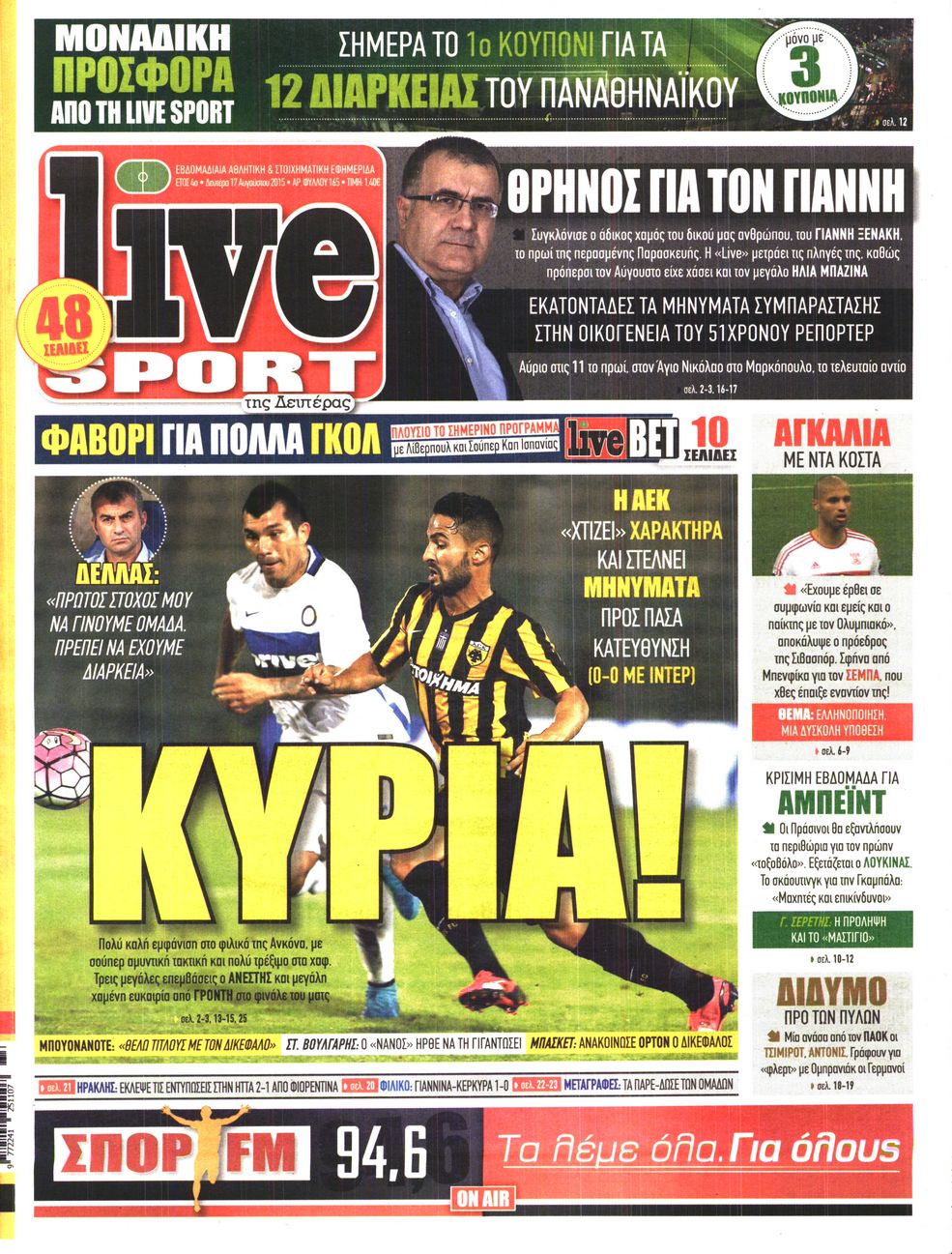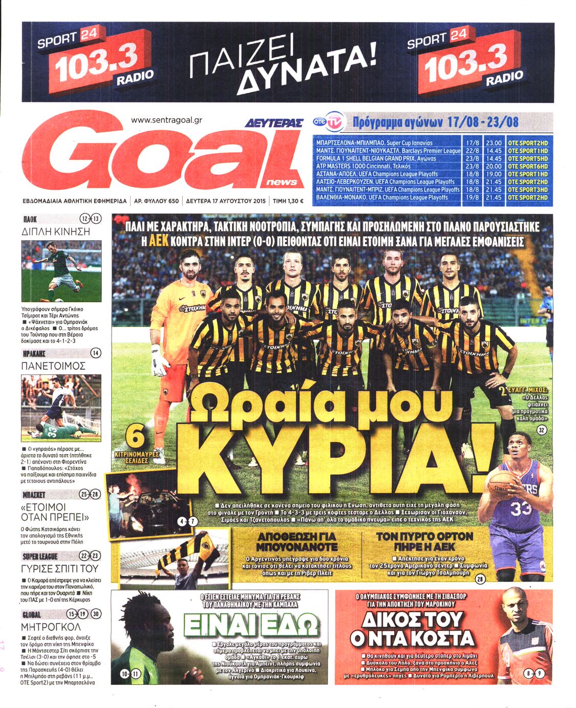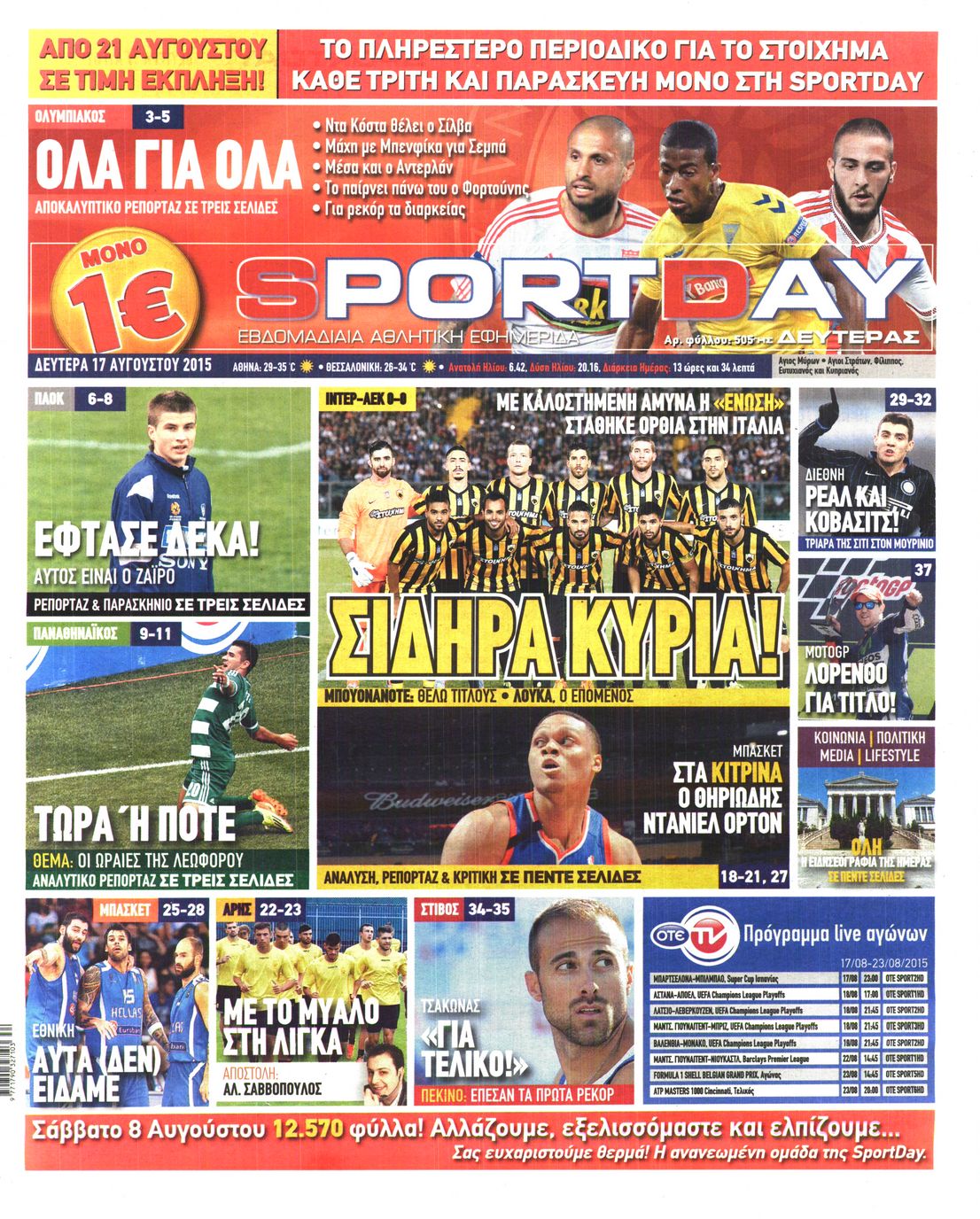 Oι αθλητικές εφημερίδες 17/8/2015 Enikos Newsroom 07:13, Δευτέρα 17 Αυγούστου 2015 Media Διαβάστε τα σημερινά πρωτοσέλιδα των αθλητικών εφημερίδων: ΑΘΛΗΤΙΚΕΣ ΕΦΗΜΕΡΙΔΕΣ ΠΡΩΤΟΣΕΛΙΔΑ Μοιράσου το: σχολίασε κι εσύ (0 σχόλια) Ακολουθήστε το enikos.gr στο Google News και μάθετε πρώτοι όλες τις ειδήσεις Δείτε όλες τις τελευταίες ειδήσεις από την Ελλάδα και τον Κόσμο στο enikos.gr Ειδήσεις Ροή Ειδήσεων 4 ώρες πριν Χριστούγεννα στα μπλόκα: Επιμένουν στις κινητοποιήσεις τους οι αγρότες – Ανοίγουν τα διόδια το Σαββατοκύριακο 4 ώρες πριν Ουκρανία: Η άνευ προηγουμένου επίθεση σε ρωσικό τάνκερ στη Μεσόγειο και το μήνυμα προς στον Πούτιν – Το «μακρύ χέρι» του Κιέβου 3 ώρες πριν Πούτιν: Τα μηνύματα σε Ευρώπη και ΝΑΤΟ από το μαραθώνιο «σόου» του – Η απαίτηση για «σεβασμό» και η ειρήνη «με τους όρους» της Μόσχας 4 ώρες πριν Τραμπ: Δεν αποκλείει την πιθανότητα ενός πολέμου στη Βενεζουέλα – «Ο Μαδούρο ξέρει καλύτερα από τον καθένα τι ακριβώς θέλω» 5 ώρες πριν Συνεχίζει να προκαλεί ο Μίτσκοσκι: «Για μένα το όνομα Μακεδονία είναι ιερό» 3 ώρες πριν Ανακαλύφθηκαν αρχαία χρυσά νομίσματα 2.200 ετών που απεικονίζουν τον θεό Απόλλωνα – Η άγνωστη σύνδεση με τον Φίλιππο Β΄ της Μακεδονίας 4 ώρες πριν Ύπνος: Μια κρυφή κατάσταση του εγκεφάλου πριν από τον ύπνο μπορεί να είναι το “κλειδί” για υψηλή ευφυΐα και δημιουργικότητα 5 ώρες πριν Αριθμολογία: Οι άνθρωποι που έχουν γεννηθεί αυτές τις 4 ημερομηνίες, συχνά παρεξηγούνται – «Η καλοσύνη τους κρύβει τεράστια δύναμη» 6 ώρες πριν Ξεχάστε το καθάρισμα το Σαββατοκύριακο: Ο «κανόνας των 20 λεπτών» που θα σας λύσει τα χέρια 8 λεπτά πριν Εξάρχεια: Ένταση με μολότοφ, χημικά και κρότου λάμψης 24 λεπτά πριν ΗΠΑ: Τραγωδία στην Αλαμπάμα – Σκότωσε την δημοσιογράφο σύζυγό του και αυτοκτόνησε μπροστά στον 3χρονο γιο τους 38 λεπτά πριν Πρόταση γάμου στο ΣΕΦ κατά την διάρκεια του αγώνα Ολυμπιακός-Βιλερμπάν – Δείτε βίντεο 53 λεπτά πριν Euroleague: Επέστρεψε στις νίκες ο Ολυμπιακός, πήρε την ματσάρα της χρονιάς η Μπάρτσα – Τα αποτελέσματα και η βαθμολογία 1 ώρα πριν Συρία: Μαζικά πλήγματα των ΗΠΑ σε θέσεις του Ισλαμικού Κράτους – Χέγκσεθ: «Δεν είναι αρχή πολέμου, είναι μια δήλωση εκδίκησης» για το θάνατο των στρατιωτών μας ENIKOS NETWORK Το ΕΚΑΒ τιμήθηκε από την Ακαδημία Αθηνών για τα 40 χρόνια προσφοράς του Έχετε πραγματικά μεγάλη καρδιά; 10 χαρακτηριστικά όσων έχουν καλοσύνη Αναστολή μέτρων αναγκαστικής εκτέλεσης για κτηνοτρόφους που πλήττονται από την ευλογιά των αιγοπροβάτων Πλήρης επάρκεια προϊόντων στις λαϊκές της Αττικής, παρά τις αγροτικές κινητοποιήσεις – Τι απαντούν οι πωλητές Χαρτογραφώντας το «σημείο χωρίς επιστροφή»: Για πρώτη φορά αποκαλύπτεται με λεπτομέρεια το ακανθώδες όριο της ατμόσφαιρας τ... Η Google καταργεί τη λειτουργία «dark web report» – Πώς θα μπορούν οι χρήστες να διαγράφουν τα δεδομένα τους περισσότερα 22:42 , Παρασκευή 19 Δεκεμβρίου 2025 Γιώργος Γιαννόπουλος για “Το σόι σου”: “Είναι ευτυχία και ευλογία αυτή η σειρά” «Είναι ευτυχία και ευλογία η συγκυρία αυτής της σειράς», θα πει ο Γιώργος Γιαννόπουλος -ο αγαπ... 20:37 , Παρασκευή 19 Δεκεμβρίου 2025 Don’t Forget The Lyrics: Η Έλλη Κοκκίνου υποδέχεται 4 παίκτες που θα κάνουν τα πάντα για να μη χάσουν ούτε… μισή λέξη από τους στίχους Το «Don’t Forget The Lyrics» επιστρέφει απόψε, Παρασκευή 19 Δεκεμβρίου, στις 21:00 με νέο επει... 19:31 , Παρασκευή 19 Δεκεμβρίου 2025 GNTM: Απόψε ο μεγάλος τελικός για τους 4 φιναλίστ Έπειτα από μήνες γεμάτους μόδα, δημιουργία και 
