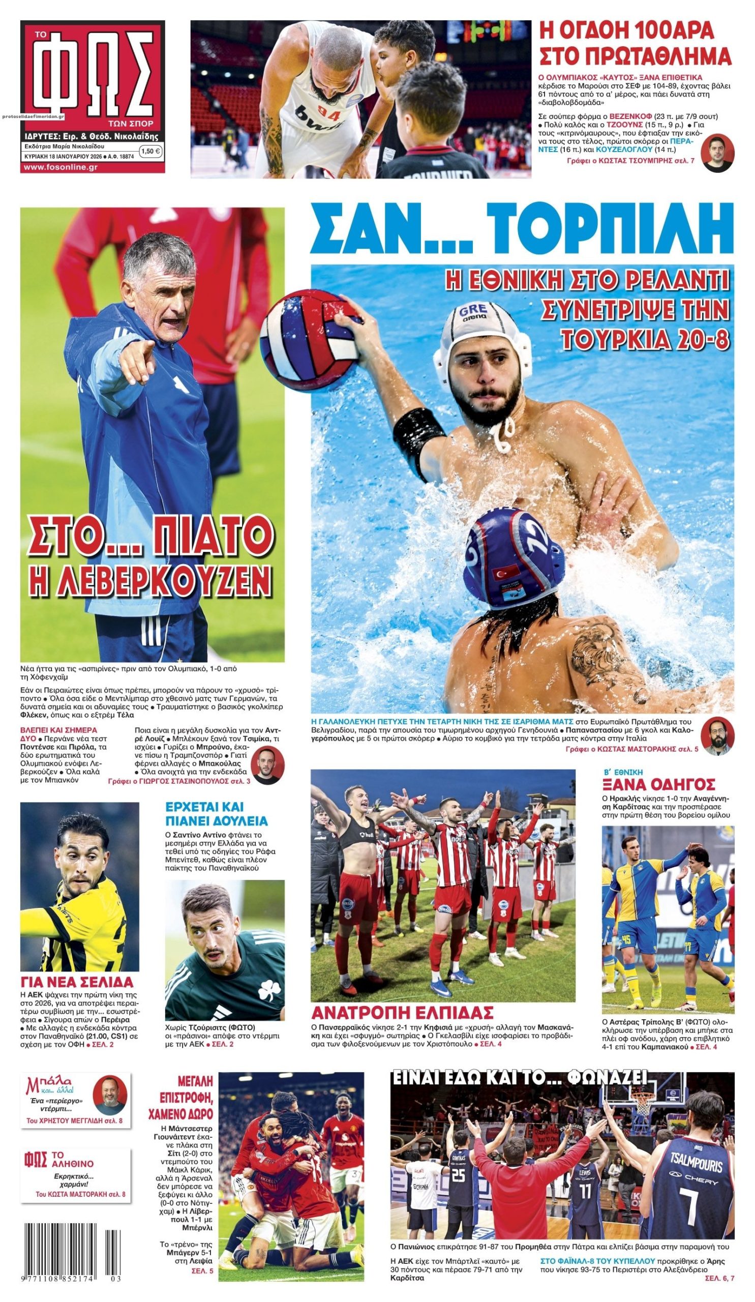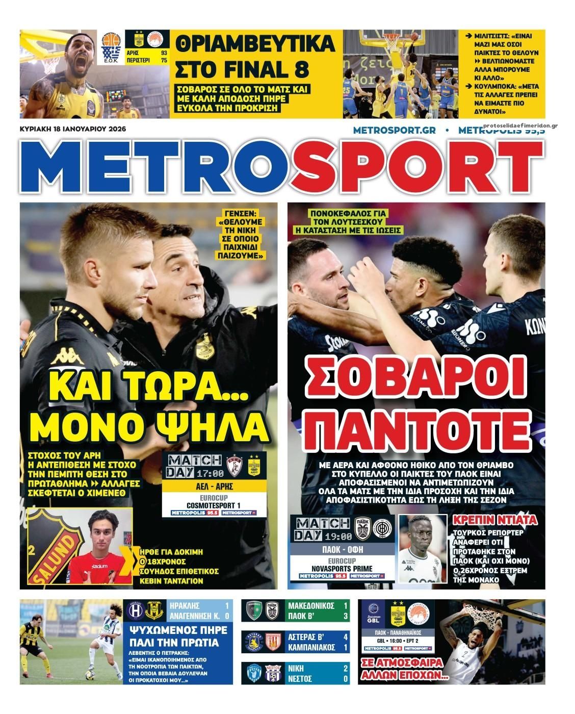 Οι αθλητικές εφημερίδες 18/1/2026 testuser 05:43, Κυριακή 18 Ιανουαρίου 2026 Media Διαβάστε τα πρωτοσέλιδα από τις αθλητικές εφημερίδες, σήμερα 18/1/2026. ΑΘΛΗΤΙΚΕΣ ΕΦΗΜΕΡΙΔΕΣ ΕΦΗΜΕΡΙΔΕΣ ΠΡΩΤΟΣΕΛΙΔΑ Μοιράσου το: σχολίασε κι εσύ (0 σχόλια) Ακολουθήστε το enikos.gr στο Google News και μάθετε πρώτοι όλες τις ειδήσεις Δείτε όλες τις τελευταίες ειδήσεις από την Ελλάδα και τον Κόσμο στο enikos.gr Ειδήσεις Ροή Ειδήσεων 8 ώρες πριν Guardian: Οι νέοι δασμοί του Τραμπ είναι μια προσπάθεια να διαιρέσει την Ευρώπη και να καταστείλει την αντίθεση στην απόκτηση της Γροιλανδίας 7 ώρες πριν Αιτωλοακαρνανία: Στον εισαγγελέα ο 44χρονος για τη δολοφονία του κοινοτάρχη – Το άγριο επεισόδιο πριν από το έγκλημα, το κίνητρο και οι φόβοι για αντίποινα 8 ώρες πριν Σέρρες: Έρευνα και για ενδεχόμενη δεύτερη επίθεση στον 17χρονο – Η νέα έκκληση της αδελφής του 11 ώρες πριν Υπεγράφη η εμπορική συμφωνία μεταξύ ΕΕ και Mercosur – «Γράφουμε ιστορία», λέει η Ούρσουλα φον ντερ Λάιεν 10 ώρες πριν Κωνσταντινούπολη: Άγρια δολοφονία 17χρονου από 15χρονο… για μια ματιά – Οι απειλές στην μητέρα του θύματος 35 λεπτά πριν Οπτική ψευδαίσθηση: Μόνο αν έχετε παρατηρητικότητα ντετέκτιβ, θα εντοπίσετε όλα τα ζώα στην εικόνα σε 15 δευτερόλεπτα 50 λεπτά πριν Πρωτεΐνη: 7 τροφές που βοηθούν στην διατήρηση της μυϊκής μάζας καθώς μεγαλώνετε, σύμφωνα με διαιτολόγους 4 ώρες πριν Τα ζώδια σήμερα, Κυριακή 18 Ιανουαρίου 2026: Παρθένοι, σταματήστε να ασχολείστε με πράγματα που σας χαλάνε τη συγκέντρωση 8 ώρες πριν Πώς έβρισκαν οι ναυτικοί το λιμάνι της Πάφου στην Κύπρο την εποχή της Ρωμαϊκής Αυτοκρατορίας – Οι δύο φάροι και οι αποκαλύψεις μιας πρωτοποριακής έρευνας 11 λεπτά πριν Η Realnews που κυκλοφορεί σήμερα (18/1/2026) 20 λεπτά πριν ΔΕΔΔΗΕ: Διακοπές ρεύματος σήμερα (18/1) στην Αθήνα και σε άλλες 10 περιοχές της Αττικής 35 λεπτά πριν Οπτική ψευδαίσθηση: Μόνο αν έχετε παρατηρητικότητα ντετέκτιβ, θα εντοπίσετε όλα τα ζώα στην εικόνα σε 15 δευτερόλεπτα 38 λεπτά πριν Πέραμα: Κατεσβέσθη η φωτιά στα Καζάνια – Δήμαρχος Περάματος: “Παραλίγο να τιναχτούμε στον αέρα, από σύμπτωση ήταν ατύχημα κι όχι δυστύχημα” – Δείτε βίντεο 42 λεπτά πριν Σήμερα με τη Realnews: Στοιχειωμένα μυστικά της Emmeline Duncan – Μαζί αστυνομικά best sellers ENIKOS NETWORK Heated Rivalry: Ψυχίατρος εξηγεί γιατί πολλές γυναίκες απολαμβάνουν να βλέπουν τον ομοφυλοφιλικό έρωτα στη σειρά-φαινόμενο Πρωτοποριακή θεραπεία για την τριχόπτωση: Gel με σάκχαρο του DNA βοηθά να ξαναβγούν μαλλιά Επίδομα θέρμανσης: Στις 29 Μαΐου η επόμενη πληρωμή – Πότε θα καταβληθούν τα χρήματα για φυσικό αέριο και τηλεθέρμανση ΔΥΠΑ: Μέσω gov.gr οι αιτήσεις για 10.000 άνεργες μητέρες – Όλες οι λεπτομέρειες για το πρόγραμμα Ο Google Assistant θα παραμείνει λίγο περισσότερο για ορισμένους χρήστες Android Τεστ προσωπικότητας: Το βάζο που θα επιλέξετε αποκαλύπτει πώς λύνετε προβλήματα στη ζωή σας περισσότερα 05:38 , Κυριακή 18 Ιανουαρίου 2026 Οι πολιτικές εφημερίδες 18/1/2026 Διαβάστε τα πρωτοσέλιδα από τις πολιτικές εφημερίδες, σήμερα 18/1/2026. 03:08 , Κυριακή 18 Ιανουαρίου 2026 Σήμερα με τη Realnews: Στοιχειωμένα μυστικά – Ένα συναρπαστικό μυθιστόρημα της Emmeline Duncan Σήμερα με τη Realnews: Στοιχειωμένα μυστικά – Ένα συναρπαστικό μυθιστόρημα της Emmeline ... 19:24 , Σάββατο 17 Ιανουαρίου 2026 Eurovision 2026 – Εθνικό Τελικός: Ακούστε ολοκληρωμένα τα 14 τραγούδια του Α’ Ημιτελικού Με μεγάλη αγωνία περιμένουν οι Έλληνες, και όχι μόνο, φανατικοί θαυμαστές της Eurovision, να μ... 18:00 , Σάββατο 17 Ιανουαρίου 2026 Η Realnews στο www.pressreader.com