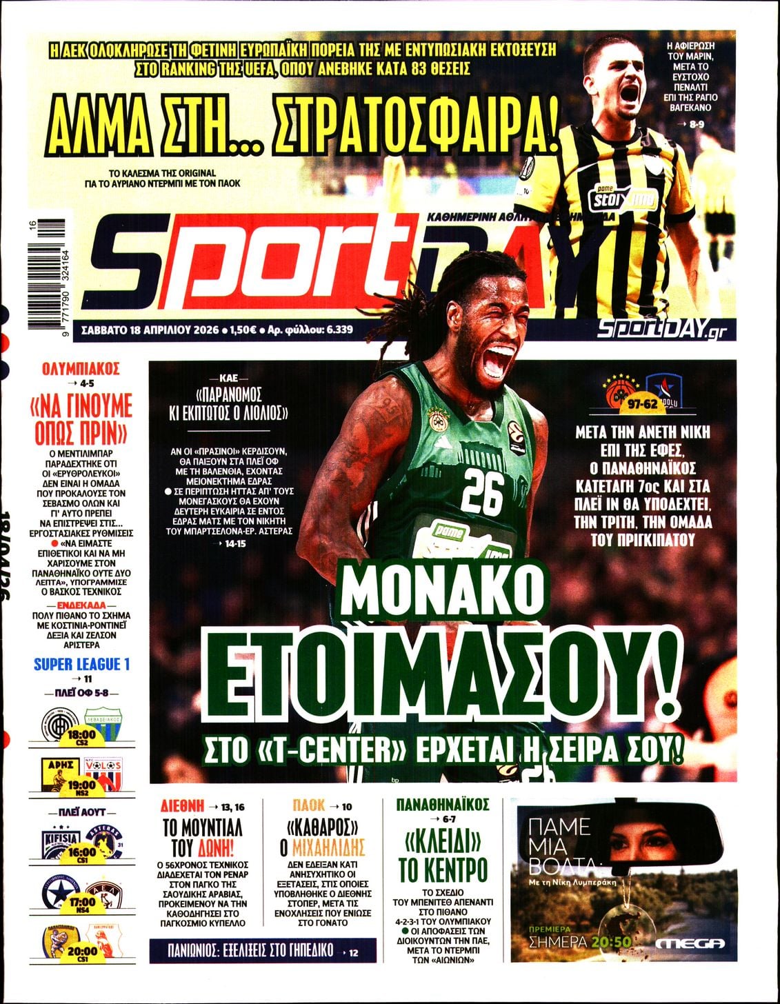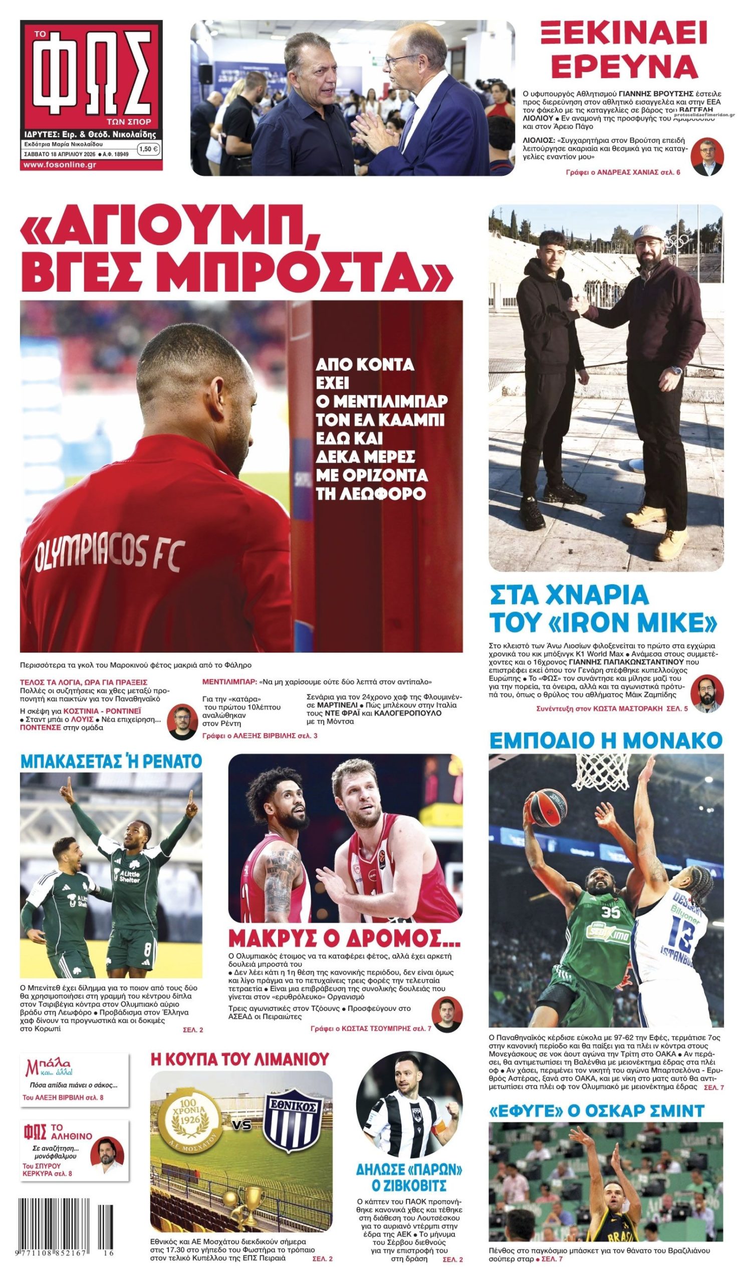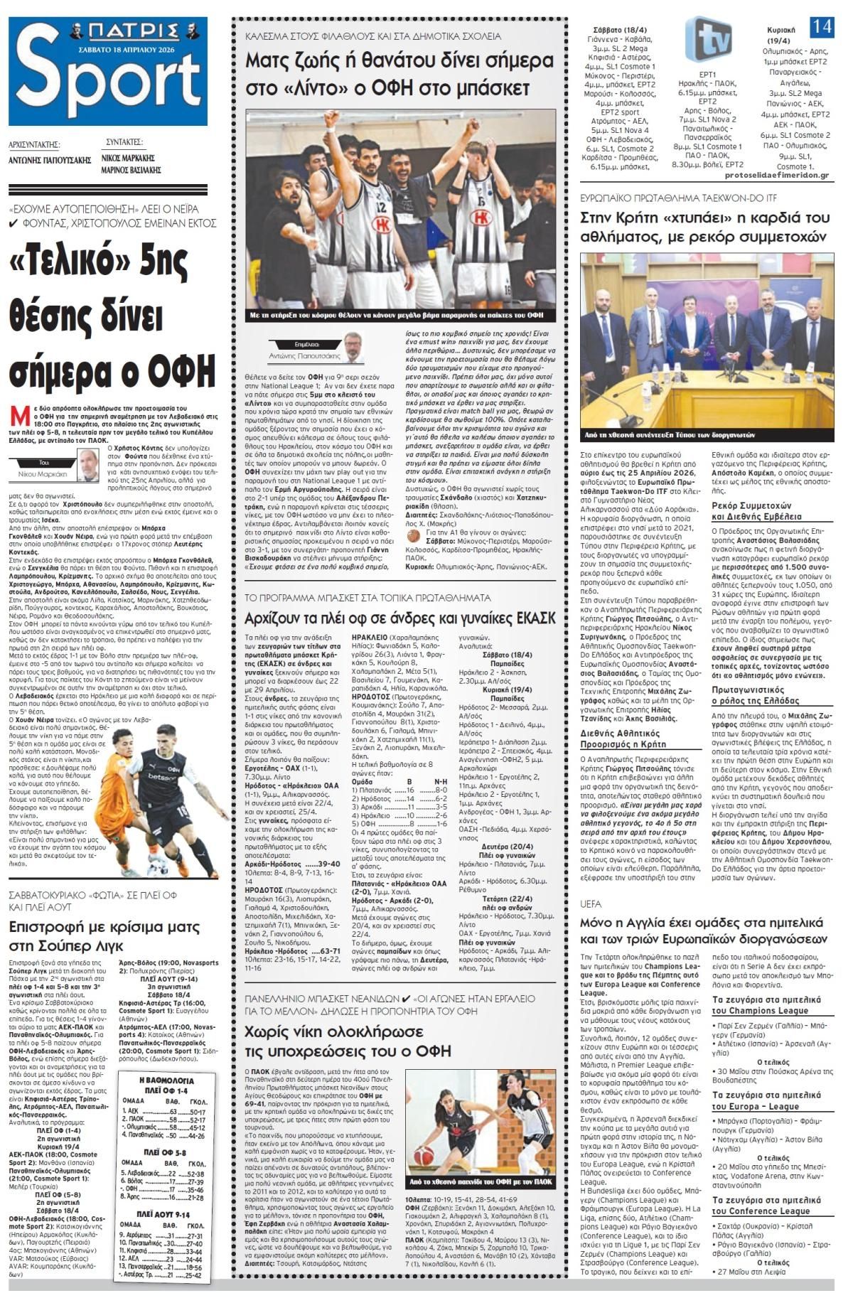 Διαβάστε τα πρωτοσέλιδα από τις αθλητικές εφημερίδες, σήμερα 18/4/2026.