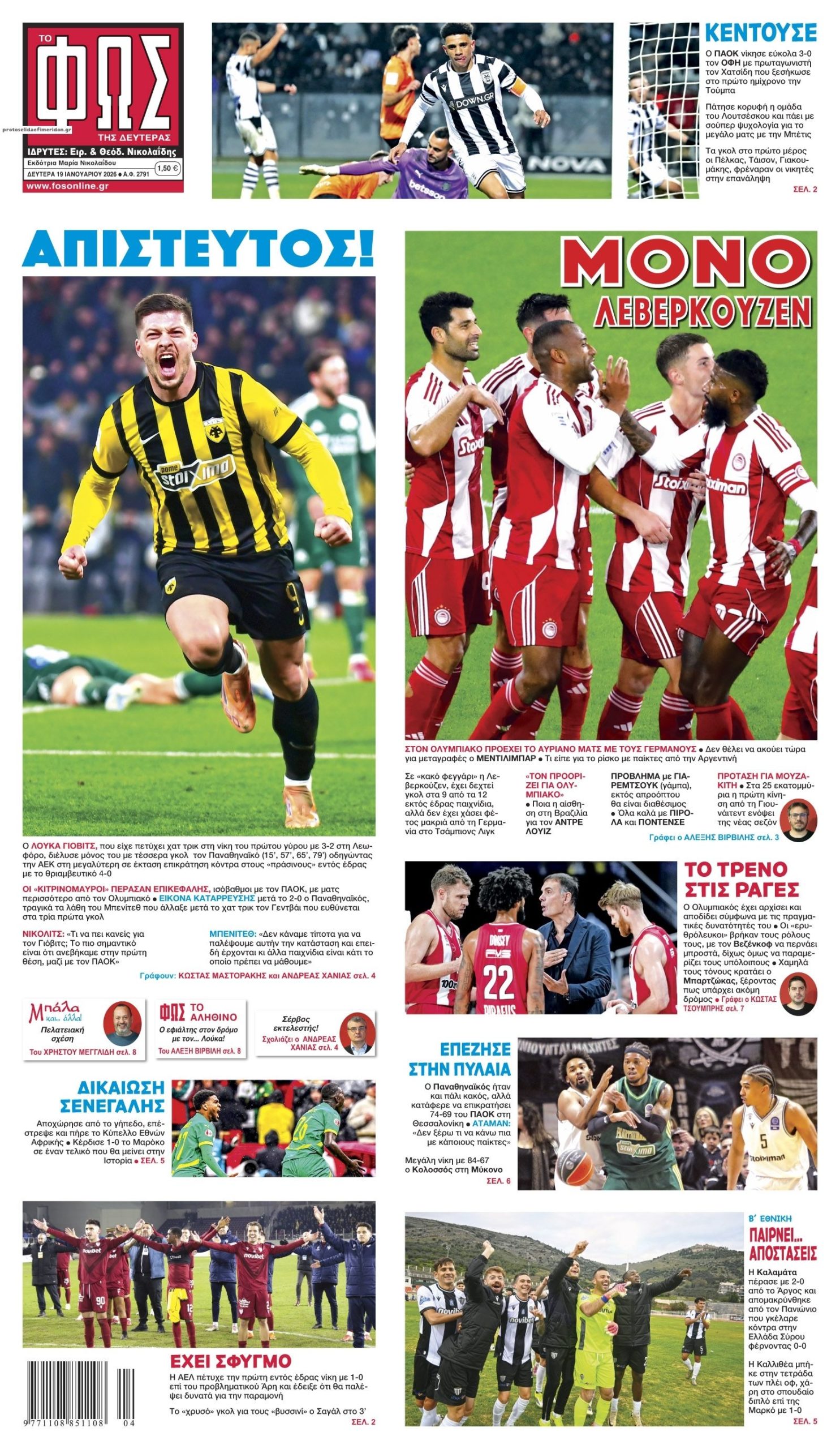 Οι αθλητικές εφημερίδες 19/1/2026 Enikos Newsroom 05:43, Δευτέρα 19 Ιανουαρίου 2026 Media Διαβάστε τα πρωτοσέλιδα από τις αθλητικές εφημερίδες, σήμερα 19/1/2026. ΑΘΛΗΤΙΚΕΣ ΕΦΗΜΕΡΙΔΕΣ ΕΦΗΜΕΡΙΔΕΣ ΠΡΩΤΟΣΕΛΙΔΑ Μοιράσου το: ΑΕΚ – Παναθηναϊκός 4-0: Η Ένωση συνέτριψε τους «πράσινους» με καρέ Γιόβιτς Χάος στον τελικό του Κόπα Άφρικα: Πρωταθλήτρια η Σενεγάλη που παραλίγο να αποχωρήσει λόγω πέναλτι στις καθυστερήσεις – Επεισόδια και στις εξέδρες – Δείτε βίντεο Guardian: Οι απειλές Τραμπ για νέους δασμούς σε συμμάχους είναι κακές, αλλά η αβεβαιότητα που προκαλούν στην οικονομία είναι πολύ χειρότερη σχολίασε κι εσύ (0 σχόλια) Ακολουθήστε το enikos.gr στο Google News και μάθετε πρώτοι όλες τις ειδήσεις Δείτε όλες τις τελευταίες ειδήσεις από την Ελλάδα και τον Κόσμο στο enikos.gr Ειδήσεις Ροή Ειδήσεων 3 ώρες πριν Σε «πλήρη εξέλιξη» η μεγάλη φωτιά στο εργοστάσιο πλαστικών στο Μενίδι – Μάχη με τις φλόγες από 42 πυροσβέστες με 19 οχήματα – Μήνυμα του 112 – Δείτε βίντεο 2 ώρες πριν «Ταινία φρίκης» στην Ισπανία: Τουλάχιστον 21 νεκροί, δεκάδες τραυματίες, 30 σε πολύ σοβαρή κατάσταση – συγκρούστηκαν συρμοί υψηλής ταχύτητας – Δείτε βίντεο 7 ώρες πριν Guardian: Οι απειλές Τραμπ για νέους δασμούς σε συμμάχους είναι κακές, αλλά η αβεβαιότητα που προκαλούν στην οικονομία είναι πολύ χειρότερη 8 ώρες πριν Αγρότες: Αντίστροφη μέτρηση για την κρίσιμη συνάντηση με τον Πρωθυπουργό στο Μαξίμου – Τα αιτήματα και οι «κόκκινες γραμμές» 7 ώρες πριν Εξαφάνιση 16χρονης: Τα κινητά θα δώσουν απαντήσεις για την Λόρα – Το σχέδιο που ετοίμαζε 2 χρόνια και η μαρτυρία συμμαθήτριάς της 1 ώρα πριν Υγεία του εντέρου: Η μέθοδος αποθήκευσης που μετατρέπει το ψωμί σε υπερτροφή 4 ώρες πριν Τα ζώδια σήμερα, Δευτέρα 19 Ιανουαρίου 2026: Ζυγοί, πέστε στα βαθιά ακόμα κι αν φοβάστε 8 ώρες πριν Αρχαιολογικό μυστήριο σε ιστορικό πανεπιστήμιο: Κάτω από το άλσος μπορεί να κρύβεται ένας άγνωστος τύμβος – Τα ξεχασμένα ημερολόγια που αποκάλυψαν κάτι απρόσμενο 9 ώρες πριν Ύπνος: 4 τρόποι για να νικήσετε το άγχος της αϋπνίας και να ξανακοιμηθείτε, σύμφωνα με ειδικούς 35 λεπτά πριν ΔΕΔΔΗΕ: Διακοπές ρεύματος σήμερα (19/1) στην Αθήνα και σε άλλες 13 περιοχές της Αττικής 44 λεπτά πριν Υπό την προεδρία του Κυριάκου Πιερρακάκη για πρώτη φορά η σημερινή συνεδρίαση του Eurogroup 50 λεπτά πριν Οπτική ψευδαίσθηση: Μόνο όσοι έχουν τέλεια όραση μπορούν να εντοπίσουν τον αστερία μέσα σε 9 δευτερόλεπτα 1 ώρα πριν Υγεία του εντέρου: Η μέθοδος αποθήκευσης που μετατρέπει το ψωμί σε υπερτροφή 1 ώρα πριν Σαν σήμερα 19 Ιανουαρίου: Τα σημαντικότερα γεγονότα της ημέρας ENIKOS NETWORK Δύο ομπρέλες είναι ίδιες στη φωτογραφία αλλά μόνο αν έχετε μάτια σαν ακτίνες laser θα της εντοπίσετε στον προκαθορισμένο χρ... Το βότανο της ευτυχίας που μπορεί να ενισχύσει τον εγκέφαλο και να καταπολεμήσει την κακοσμία του στόματος Φόρος κληρονομιάς: Η διαδικασία, τα μυστικά και τα SOS Λογαριασμός ρεύματος: Το νέο τιμολόγιο που θα τον μειώσει μέχρι και 20% – Σταδιακή η εφαρμογή του Ο Google Assistant θα παραμείνει λίγο περισσότερο για ορισμένους χρήστες Android Τεστ προσωπικότητας: Το βάζο που θα επιλέξετε αποκαλύπτει πώς λύνετε προβλήματα στη ζωή σας περισσότερα 05:38 , Δευτέρα 19 Ιανουαρίου 2026 Οι πολιτικές εφημερίδες 19/1/2026 Διαβάστε τα πρωτοσέλιδα από τις πολιτικές εφημερίδες, σήμερα 19/1/2026. 22:16 , Κυριακή 18 Ιανουαρίου 2026 Καλά θα πάει κι αυτό: Η υγεία του Ερρίκου επιδεινώνεται – Ανατρεπτικές εξελίξεις Τα νέα επεισόδια της ανατρεπτική