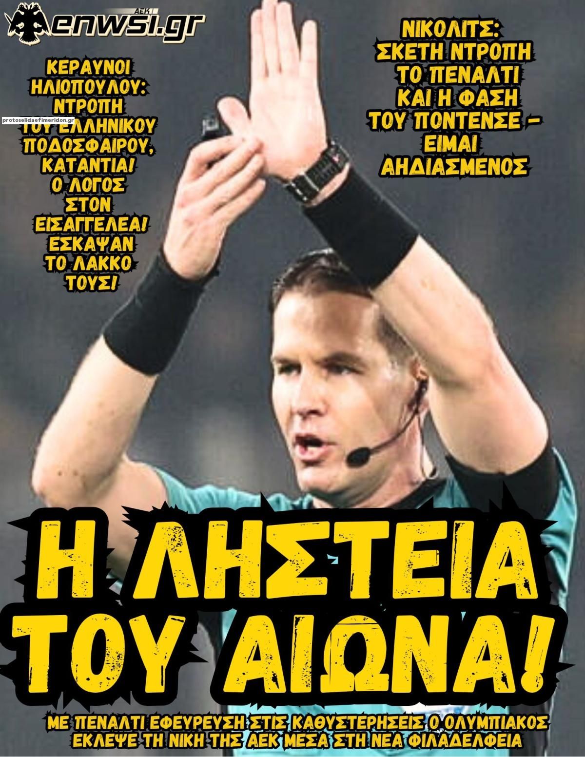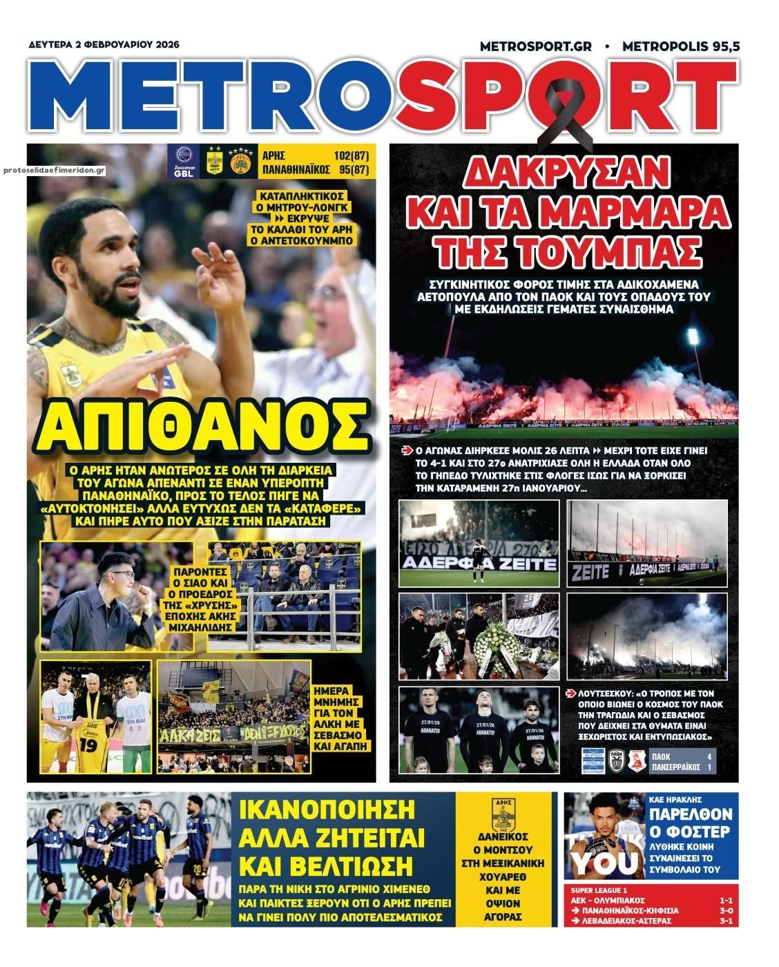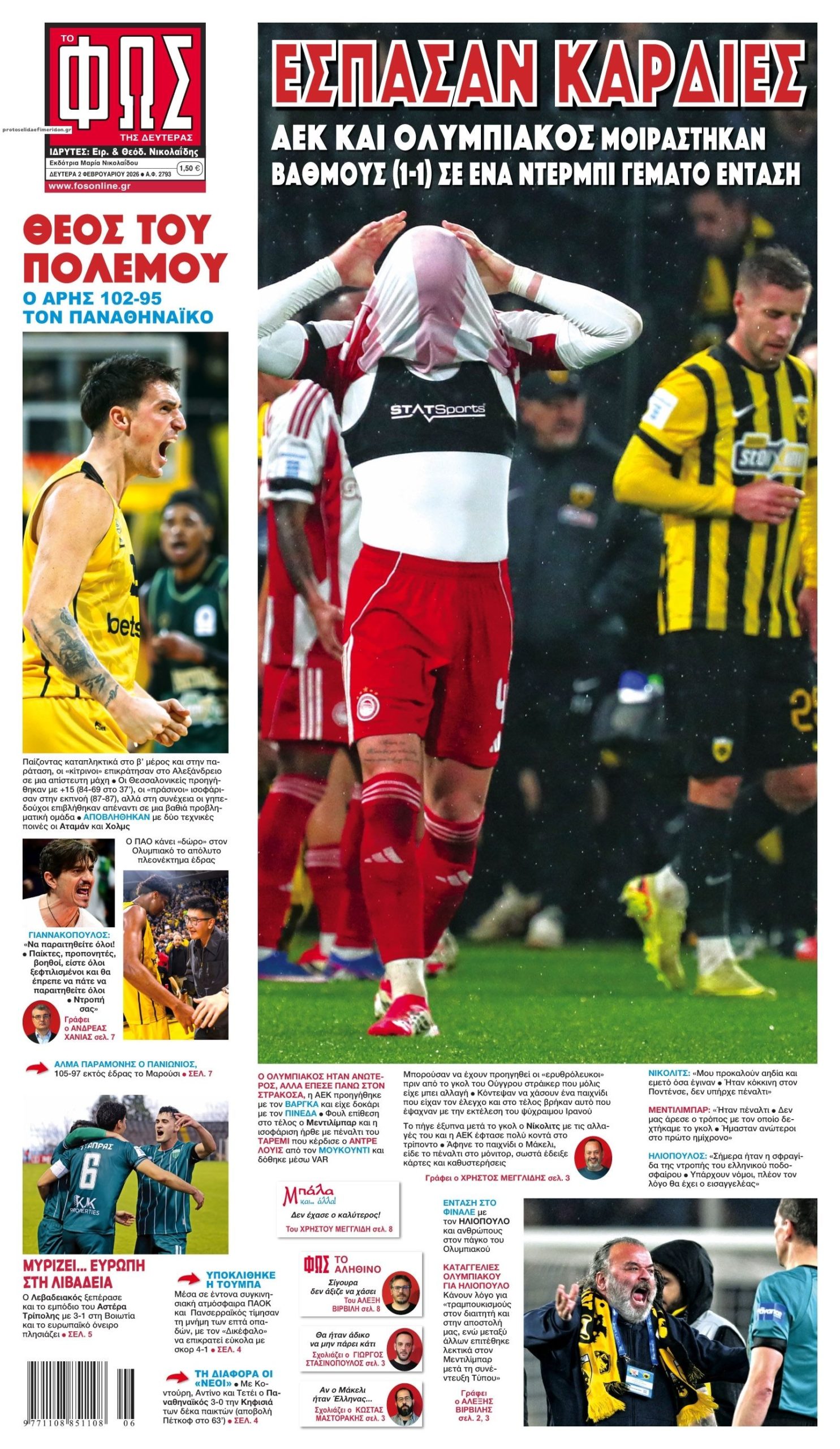 Οι αθλητικές εφημερίδες 2/2/2026 Enikos Newsroom 05:43, Δευτέρα 02 Φεβρουαρίου 2026 Media Διαβάστε τα πρωτοσέλιδα από τις αθλητικές εφημερίδες, σήμερα 2/2/2026. ΑΘΛΗΤΙΚΕΣ ΕΦΗΜΕΡΙΔΕΣ ΕΦΗΜΕΡΙΔΕΣ ΠΡΩΤΟΣΕΛΙΔΑ Μοιράσου το: ΑΕΚ – Ολυμπιακός 1-1: Ισοπαλία στο ντέρμπι με πέναλτι στο 90+16′ για τους Πειραιώτες – Έντονες διαμαρτυρίες των γηπεδούχων Σοβαρές καταγγελίες από Κώστα Καραπαπά για τραμπουκισμούς της ΑΕΚ σε Μεντιλίμπαρ και την αποστολή του Ολυμπιακού – Δείτε τι δήλωσε Νέα ανάρτηση Δημήτρη Γιανακόπουλου… εν μέσω βροχής: «Εγώ σε αυτό το τραπεζάκι τον Μάιο θα βάλω το ευρωπαϊκό» σχολίασε κι εσύ (0 σχόλια) Ακολουθήστε το enikos.gr στο Google News και μάθετε πρώτοι όλες τις ειδήσεις Δείτε όλες τις τελευταίες ειδήσεις από την Ελλάδα και τον Κόσμο στο enikos.gr Ειδήσεις Ροή Ειδήσεων 48 λεπτά πριν Ανοίγει η συζήτηση για τη Συνταγματική Αναθεώρηση: Ποια άρθρα είναι στο επίκεντρο – Σήμερα αναμένονται οι ανακοινώσεις από τον Κυριάκο Μητσοτάκη 1 ώρα πριν Απλησίαστα τα ενοίκια: Ακόμη και 1.000 ευρώ για 50 τ.μ. στο κέντρο της Αθήνας – Έρχονται νέα μέτρα για να «πέσουν» στην αγορά περισσότερα σπίτια 18 λεπτά πριν Ηταν θέμα χρόνου να γίνει το κακό – Οι εξωφρενικές αυθαιρεσίες στο εργοστάσιο της «Βιολάντα» που στοίχισαν τη ζωή σε 5 εργάτριες 1 ώρα πριν Τα σχέδια της Τουρκίας για την παραγωγή οπλικών συστημάτων το 2026 – Τα 6 προγράμματα της Ελλάδας στο SAFE 25 λεπτά πριν Grammy 2026: Οι καλλιτέχνες στράφηκαν κατά της ICE και η σκηνή έγινε βήμα διαμαρτυρίας – Οι δηλώσεις των Bad Bunny και Billie Eilish που σημάδεψαν την τελετή 2 ώρες πριν Οπτική ψευδαίσθηση: Μόνο αν έχετε παρατηρητικότητα ντετέκτιβ, θα εντοπίσετε τη σαύρα στην εικόνα σε 16 δευτερόλεπτα 3 ώρες πριν Διατροφή μετά την απώλεια βάρους: Η θρεπτική τροφή που μπορεί να σας βοηθήσει να μην ξαναπάρετε κιλά 6 ώρες πριν Τα ζώδια σήμερα, Δευτέρα 2 Φεβρουαρίου 2026: Υδροχόοι, αυτή είναι μια καθοριστική στιγμή για τις σχέσεις σας 37 λεπτά πριν Αποκωδικοποιήθηκε επιγραφή 5.000 ετών στο Σινά – Ταυτοποιήθηκε ως η παλαιότερη γνωστή οπτική απεικόνιση πολιτικής κυριαρχίας 34 δευτερόλεπτα πριν Serial killer στη Θεσσαλονίκη: Ανοίγουν οι φάκελοι για ακόμη δύο εξαφανίσεις 7 λεπτά πριν Σαντίνο Αντίνο – Τζούλι Κολούτσι: Γκολ στον έρωτα 13 λεπτά πριν Συνταγή του Gordon Ramsay για σούπα με κουνουπίδι και βούτυρο 18 λεπτά πριν Ηταν θέμα χρόνου να γίνει το κακό – Οι εξωφρενικές αυθαιρεσίες στο εργοστάσιο της «Βιολάντα» που στοίχισαν τη ζωή σε 5 εργάτριες 24 λεπτά πριν Χωρίς ταξί την Τρίτη και την Τετάρτη η Αττική – Νέα 48ωρη απεργία του ΣΑΤΑ ENIKOS NETWORK Αυτή την Κυριακή με τη Realnews: Τίτλοι τέλους του M.J. Trow, μαζί Food & Travel Μακροζωία: Τεστ ούρων μπορεί να προβλέψει πόσο θα ζήσουμε Ενοίκια: Ακόμη και 1.000 ευρώ για 50 τ.μ. στο κέντρο της Αθήνας – Έρχονται νέα μέτρα για να «πέσουν» στην αγορά περισσότερα... Τη Δευτέρα οι ανακοινώσεις του Κυριάκου Μητσοτάκη για τη συνταγματική αναθεώρηση – Ποια άρθρα θα προτείνει να αλλάξουν Σπαζοκεφαλιά: Βρες πόσα 9 υπάρχουν στην εικόνα σε 8 δευτερόλεπτα Τεστ IQ: Μπορείς να εντοπίσεις τον αριθμό 999 ανάμεσα στα 99Q σε 15 δευτερόλεπτα; περισσότερα 08:18 , Δευτέρα 02 Φεβρουαρίου 2026 Grammy 2026: Οι καλλιτέχνες στράφηκαν κατά της ICE και η σκηνή έγινε βήμα διαμαρτυρίας – Οι δηλώσεις των Bad Bunny και Billie Eilish που σημάδεψαν την τελετή Η απονομή των βραβείων στη φετινή τελετή των Grammy δεν περιορίστηκε στις αναμενόμενες ευχαρισ... 07:14 , Δευτέρα 02 Φεβρουαρίου 2026 Αυτή την Κυριακή με τη Realnews: Τίτλοι τέλους του M.J. Trow – Μαζ