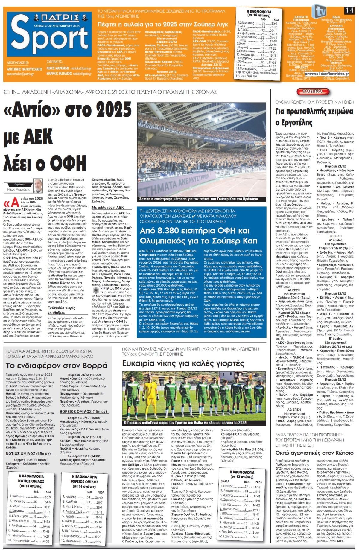 Διαβάστε τα πρωτοσέλιδα από τις αθλητικές εφημερίδες, σήμερα 20/12/2025.