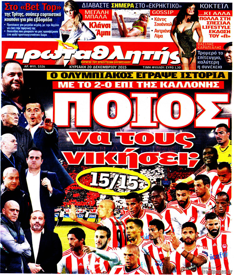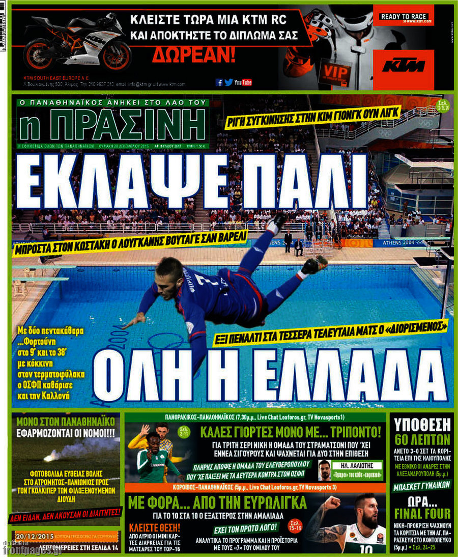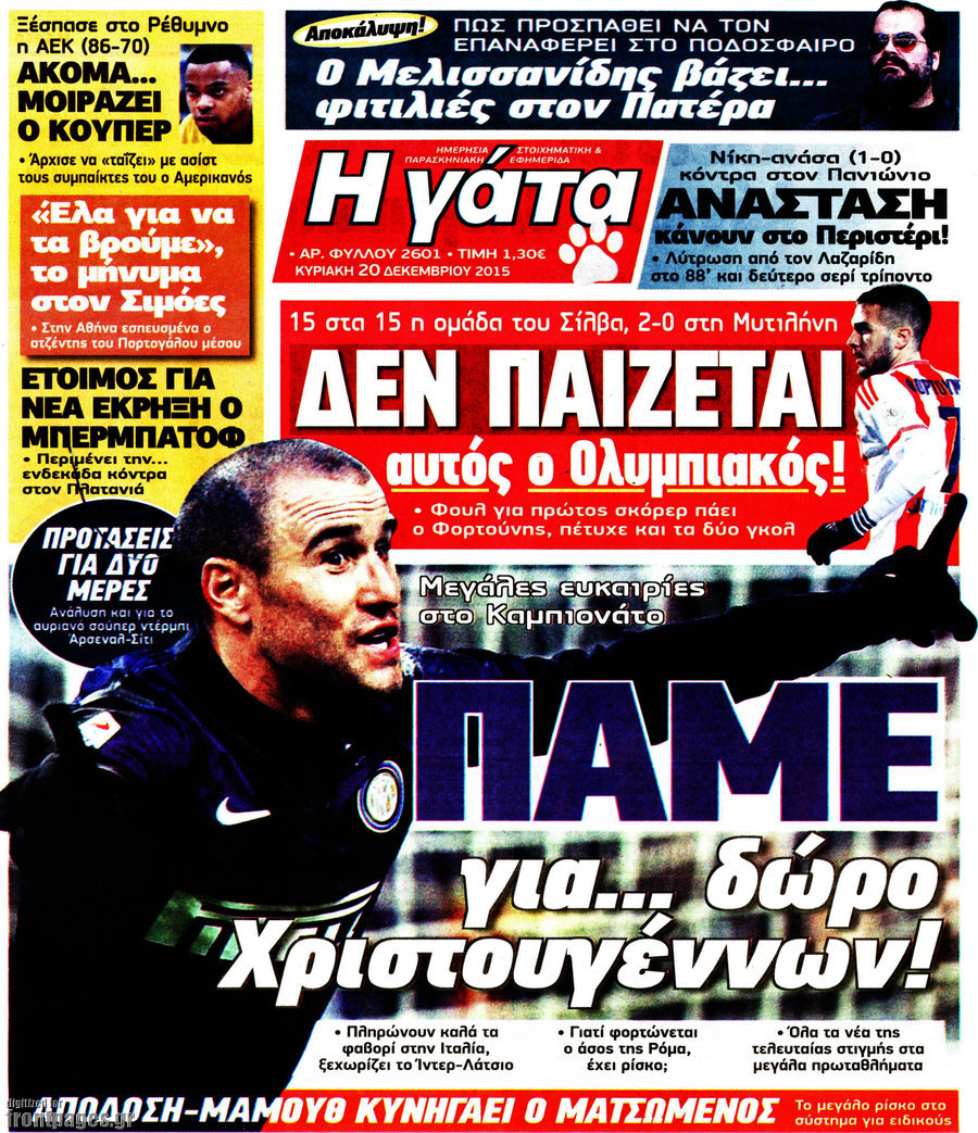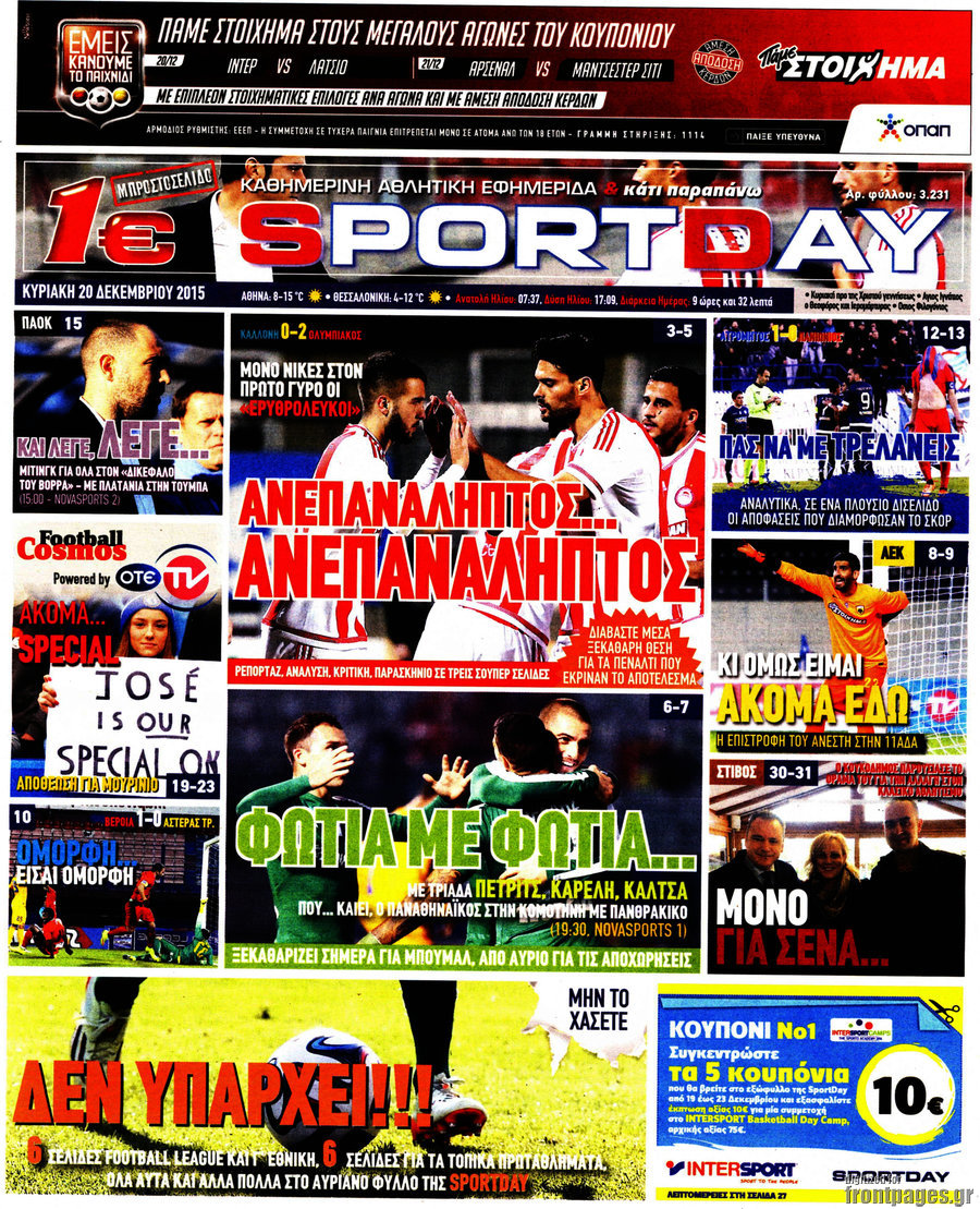 Οι αθλητικές εφημερίδες 20/12/2015 Στεφανία Κασίμη 07:25, Κυριακή 20 Δεκεμβρίου 2015 Media ΑΘΛΗΤΙΚΕΣ ΕΦΗΜΕΡΙΔΕΣ Μοιράσου το: σχολίασε κι εσύ (0 σχόλια) Ακολουθήστε το enikos.gr στο Google News και μάθετε πρώτοι όλες τις ειδήσεις Δείτε όλες τις τελευταίες ειδήσεις από την Ελλάδα και τον Κόσμο στο enikos.gr Ειδήσεις Ροή Ειδήσεων 2 ώρες πριν Αυξάνουν την πίεση προς την κυβέρνηση οι αγρότες: Κλείνουν παρακαμπτήριους και ανοίγουν διόδια – Τι θα γίνει τις γιορτές 1 ώρα πριν ΟΠΕΚΕΠΕ: Προφυλακιστέος ο φερόμενος αρχηγός και ο λογιστής της εγκληματικής οργάνωσης 2 ώρες πριν Φοινικούντα: Το Σάββατο απολογείται ο 30χρονος γιος γνωστού επιχειρηματία της Πλάκας που παραδόθηκε – Όσα είπε στους αστυνομικούς και ο ρόλος του στο έγκλημα 2 ώρες πριν Μπορεί ο Μαδούρο να αντέξει τον αποκλεισμό του Τραμπ; Τι θα χρειαστεί η Ουάσινγκτον για να τον ανατρέψει 3 ώρες πριν Πρίγκιπας Ουίλιαμ – Κέιτ: Η νέα οικογενειακή φωτογραφία για τις Χριστουγεννιάτικες κάρτες του 2025 3 ώρες πριν Ύπνος: Η απλή βραδινή ρουτίνα για να προστατεύσετε τα μαλλιά σας από το κρύο κατά τη διάρκεια του χειμώνα 4 ώρες πριν Manifesting: Πώς να συναντήσετε τον σύντροφο της ζωής σας, ανάλογα με τον μήνα γέννησής σας 2 ημέρες πριν 20 χρόνια τα Χριστούγεννα ξεκινούν στα Public με μεγάλη ποικιλία σε δώρα! 2 ώρες πριν Αρχαιολόγοι ανακάλυψαν ρωμαϊκά τεχνουργήματα από μια πόλη που δεν υπήρξε ποτέ – Τα τρία εντυπωσιακά κτίρια και ο αμφορέας με τις… σαρδέλες 4 λεπτά πριν Σε ομάδες που συνδέονται με το ρωσικό κράτος αποδίδει η Δανία δύο κυβερνοεπιθέσεις που δέχθηκε 19 λεπτά πριν Βαθμολογία UEFA: Η Πολωνία προσπέρασε την Ελλάδα 35 λεπτά πριν Conference League: Οι ομάδες που προκρίθηκαν στους «16» και τα «ζευγαρώματα» στα νοκ άουτ 43 λεπτά πριν ΑΕΚ – Κραϊόβα 3-2: Επική ανατροπή και πρόκριση στους «16» του Conference League η Ένωση 1 ώρα πριν ΟΠΕΚΕΠΕ: Προφυλακιστέος ο φερόμενος αρχηγός και ο λογιστής της εγκληματικής οργάνωσης ENIKOS NETWORK Σε περίοδο αυξημένης δραστηριότητας η γρίπη στην Ελλάδα-Μέτρα προστασίας από τον ΕΟΔΥ Σκέφτεστε συνέχεια συζητήσεις που έχετε κάνει; Τι σημαίνει αυτό, σύμφωνα με ειδικό Στεγαστικό: Τι λέει η ΠΟΜΙΔΑ για τα νέα μέτρα που ανακοίνωσε ο Κυριάκος Μητσοτάκης Λαγκάρντ: Αισιόδοξη για την ανάπτυξη της Ευρωζώνης, αβέβαιη για τον πληθωρισμό Χαρτογραφώντας το «σημείο χωρίς επιστροφή»: Για πρώτη φορά αποκαλύπτεται με λεπτομέρεια το ακανθώδες όριο της ατμόσφαιρας τ... Η Google καταργεί τη λειτουργία «dark web report» – Πώς θα μπορούν οι χρήστες να διαγράφουν τα δεδομένα τους περισσότερα 17:45 , Πέμπτη 18 Δεκεμβρίου 2025 ROUK ZOUK: Εορταστικό επεισόδιο με καλεσμένους τους πρωταγωνιστές του «Γιατί ρε πατέρα» Το Σάββατο 20 Δεκεμβρίου στις 21:00, η Ζέτα Μακρυπούλια υποδέχεται εκλεκτούς ηθοποιούς που όλο... 17:20 , Πέμπτη 18 Δεκεμβρίου 2025 Άγιος έρωτας: Η Χριστίνα εξομολογείται στον πατέρα Νικόλαο, απόψε στις 21:00 στον Alpha Η Νότα αποφασίζει να εκδικηθεί τον Πέτρο και τον Στέφανο, για χάρη του Λούη, όμως τα πράγματα ... 16:50 , Πέμπτη 18 Δεκεμβρίου 2025 Να μ’ αγαπάς: Ζωή και Φωτεινή συμφιλιώνονται ως μάνα με κόρη, απόψε στις 20:00 Η ταυτότητα του Άγγελου αποκαλύπτεται στο νέο επεισόδιο της σειράς “Να μ’ αγαπάς... 15:52 , Πέμπτη 18 Δεκεμβρίου 2025 Το Σπίτι Δίπλα Στο Ποτάμι: Το καθηλωτικό τελευταίο επεισόδιο για το 2025 απόψε στις 22:30 Καθηλώνει το σημερινό επεισόδιο της σειράς “Το Σπίτι Δίπλα Στο Ποτάμι” που έρχεται... ΤΕΛΕΥΤΑΙΕΣ ΕΙΔΗΣΕΙΣ 4 λεπτά πριν Σε ομάδες που συνδέονται με το ρωσικό κράτος αποδίδει..