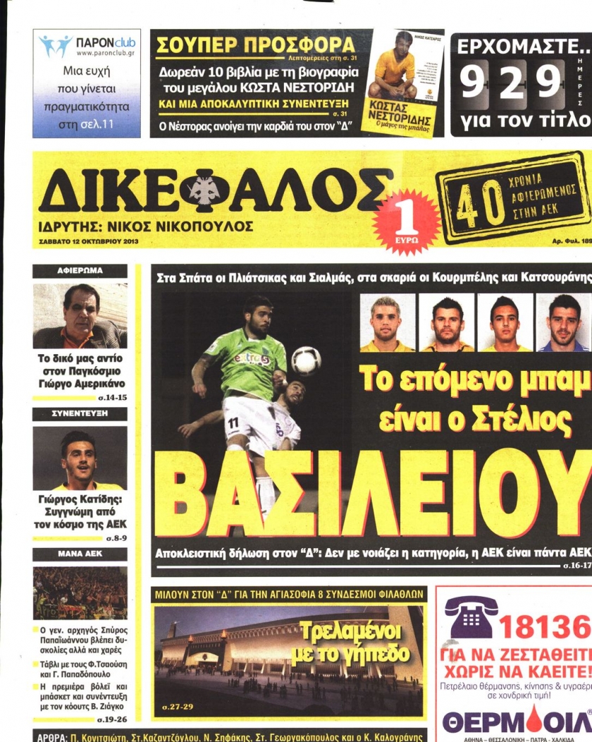 Οι αθλητικές εφημερίδες Enikos Newsroom 08:46, Σάββατο 12 Οκτωβρίου 2013 Media Οι αθλητικές εφημερίδες Διαβάστε τα πρωτοσέλιδα των αθλητικών εφημερίδων: ΑΘΛΗΤΙΚΕΣ ΕΦΗΜΕΡΙΔΕΣ ΕΦΗΜΕΡΙΔΕΣ ΠΡΩΤΟΣΕΛΙΔΑ Μοιράσου το: σχολίασε κι εσύ (0 σχόλια) Ακολουθήστε το enikos.gr στο Google News και μάθετε πρώτοι όλες τις ειδήσεις Δείτε όλες τις τελευταίες ειδήσεις από την Ελλάδα και τον Κόσμο στο enikos.gr Ειδήσεις Ροή Ειδήσεων 3 ώρες πριν Ακίλα Σάλεχ: «Άκυρο» το τουρκολιβυκό μνημόνιο λέει ο πρόεδρος της λιβυκής Βουλής – Ανοίγει ο διάλογος με Ελλάδα, Αίγυπτο και Τουρκία 8 ώρες πριν Αγρότες: Την Τρίτη η απόφαση για διάλογο ή κλιμάκωση των κινητοποιήσεών τους – Πώς χαρακτηρίζουν τις ανακοινώσεις Τσιάρα και οι επόμενες κινήσεις 7 ώρες πριν Τραμπ για Ουκρανία: «Είμαστε πιο κοντά σε συμφωνία από ποτέ» – «Πολυεθνική δύναμη» προτείνουν οι Ευρωπαίοι 7 ώρες πριν Κυψέλη: Η 16χρονη που μαχαίρωσε την 14χρονη είχε συλληφθεί 3 φορές στο παρελθόν – Έβριζε καθηγητές, έβαζε φωτιές σε κάδους και εκβίαζε συμμαθητές της 7 ώρες πριν Τρομοκρατική επίθεση στο Σίδνεϊ: Θλίψη για τα 15 θύματα – Οργή στην εβραϊκή κοινότητα που προειδοποιούσε επί δύο χρόνια 7 ώρες πριν Επιστήμονες ίσως έλυσαν το μυστήριο γύρω από τα Χόμπιτ – Νέα έρευνα αποκαλύπτει πώς εξαφανίστηκαν 8 ώρες πριν Ύπνος: Η αρχαία μορφή άσκησης που αποδεικνύεται αποτελεσματική στην αντιμετώπιση της αϋπνίας, σύμφωνα με μελέτη 9 ώρες πριν Αριθμολογία: Ο τυχερός σας αριθμός, ανάλογα με τον μήνα γέννησής σας 10 ώρες πριν Πώς να μην μαραίνονται γρήγορα τα κομμένα λουλούδια: Το λάθος στην τοποθέτηση του βάζου που πρέπει να αποφεύγετε 1 λεπτό πριν Δώρο Χριστουγέννων 2025: Ποιοι εργαζόμενοι το δικαιούνται – Η online εφαρμογή της ΓΣΕΕ για να το υπολογίσετε 9 λεπτά πριν Υψηλή χοληστερίνη: Γιατρός αποκαλύπτει δύο τρόπους για να την μειώσετε χωρίς φαρμακευτική αγωγή 17 λεπτά πριν Σαν σήμερα 16 Δεκεμβρίου: Τα σημαντικότερα γεγονότα της ημέρας 21 λεπτά πριν Οι οικονομικές εφημερίδες 16/12/2025 27 λεπτά πριν Οι αθλητικές εφημερίδες 16/12/2025 ENIKOS NETWORK Πότε το χρόνιο ροχαλητό να αποτελέσει ένδειξη κινδύνου για την καρδιά; Τι λένε οι ειδικοί Μάριος Θεμιστοκλέους: Το ΕΣΥ ενισχύεται, εκσυγχρονίζεται, αλλάζει ΕΒΕΠ για αγροτικές κινητοποιήσεις: Κάθε επιπλέον εβδομάδα προσθέτει περίπου 200 εκατ. ευρώ ζημιά Τι προβλέπει το νομοσχέδιο του υπουργείου Εθνικής Άμυνας – Oι αλλαγές στους μισθούς Σύγχρονος Νοστράδαμος: Προειδοποιεί για «μεγάλο γεγονός» τους επόμενους μήνες που θα συγκλονίσει τη Βρετανία και τον κόσμο Τεστ παρατηρητικότητας: Μπορείτε να βρείτε τις 3 διαφορές στις εικόνες με έναν πιγκουίνο σε 14 δευτερόλεπτα περισσότερα 05:48 , Τρίτη 16 Δεκεμβρίου 2025 Οι οικονομικές εφημερίδες 16/12/2025 Διαβάστε τα πρωτοσέλιδα από τις οικονομικές εφημερίδες, σήμερα 16/12/2025. 05:43 , Τρίτη 16 Δεκεμβρίου 2025 Οι αθλητικές εφημερίδες 16/12/2025 Διαβάστε τα πρωτοσέλιδα από τις αθλητικές εφημερίδες, σήμερα 16/12/2025. 05:38 , Τρίτη 16 Δεκεμβρίου 2025 Οι πολιτικές εφημερίδες 16/12/2025 Διαβάστε τα πρωτοσέλιδα από τις πολιτικές εφημερίδες, σήμερα 16/12/2025. 21:35 , Δευτέρα 15 Δεκεμβρίου 2025 Το Σπίτι Δίπλα Στο Ποτάμι: Η Ιουλία και ο Φωκάς μετακομίζουν στη Ρόδο – Δύο νέοι χαρακτήρες μπαίνουν στη σειρά Δύο νέοι, κομβικοί χαρακτήρες κάνουν την εμφάνισή τους αυτή την εβδομάδα στην αγαπημένη σειρά ... ΤΕΛΕΥΤΑΙΕΣ ΕΙΔΗΣΕΙΣ 9 λεπτά πριν Υψηλή χοληστερίνη: Γιατρός αποκαλύπτει δύο τρόπους... 17 λεπτά πριν Σαν σήμερα 16 Δεκεμβρίου: Τα σημαντικότερα γεγονότα.