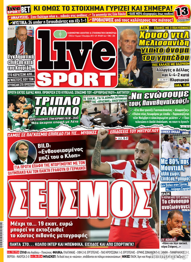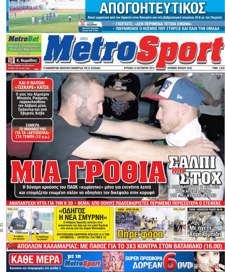 Οι αθλητικές εφημερίδες Enikos Newsroom 08:13, Κυριακή 13 Οκτωβρίου 2013 Media Οι αθλητικές εφημερίδες Διαβάστε τα πρωτοσέλιδα των αθλητικών εφημερίδων: ΑΘΛΗΤΙΚΕΣ ΕΦΗΜΕΡΙΔΕΣ ΕΦΗΜΕΡΙΔΕΣ ΠΡΩΤΟΣΕΛΙΔΑ Μοιράσου το: σχολίασε κι εσύ (0 σχόλια) Ακολουθήστε το enikos.gr στο Google News και μάθετε πρώτοι όλες τις ειδήσεις Δείτε όλες τις τελευταίες ειδήσεις από την Ελλάδα και τον Κόσμο στο enikos.gr Ειδήσεις Ροή Ειδήσεων 3 ώρες πριν Ακίλα Σάλεχ: «Άκυρο» το τουρκολιβυκό μνημόνιο λέει ο πρόεδρος της λιβυκής Βουλής – Ανοίγει ο διάλογος με Ελλάδα, Αίγυπτο και Τουρκία 7 ώρες πριν Αγρότες: Την Τρίτη η απόφαση για διάλογο ή κλιμάκωση των κινητοποιήσεών τους – Πώς χαρακτηρίζουν τις ανακοινώσεις Τσιάρα και οι επόμενες κινήσεις 7 ώρες πριν Τραμπ για Ουκρανία: «Είμαστε πιο κοντά σε συμφωνία από ποτέ» – «Πολυεθνική δύναμη» προτείνουν οι Ευρωπαίοι 7 ώρες πριν Κυψέλη: Η 16χρονη που μαχαίρωσε την 14χρονη είχε συλληφθεί 3 φορές στο παρελθόν – Έβριζε καθηγητές, έβαζε φωτιές σε κάδους και εκβίαζε συμμαθητές της 6 ώρες πριν Τρομοκρατική επίθεση στο Σίδνεϊ: Θλίψη για τα 15 θύματα – Οργή στην εβραϊκή κοινότητα που προειδοποιούσε επί δύο χρόνια 7 ώρες πριν Επιστήμονες ίσως έλυσαν το μυστήριο γύρω από τα Χόμπιτ – Νέα έρευνα αποκαλύπτει πώς εξαφανίστηκαν 8 ώρες πριν Ύπνος: Η αρχαία μορφή άσκησης που αποδεικνύεται αποτελεσματική στην αντιμετώπιση της αϋπνίας, σύμφωνα με μελέτη 9 ώρες πριν Αριθμολογία: Ο τυχερός σας αριθμός, ανάλογα με τον μήνα γέννησής σας 10 ώρες πριν Πώς να μην μαραίνονται γρήγορα τα κομμένα λουλούδια: Το λάθος στην τοποθέτηση του βάζου που πρέπει να αποφεύγετε 2 λεπτά πριν Οι οικονομικές εφημερίδες 16/12/2025 7 λεπτά πριν Οι αθλητικές εφημερίδες 16/12/2025 12 λεπτά πριν Οι πολιτικές εφημερίδες 16/12/2025 20 λεπτά πριν Τα ζώδια σήμερα, Τρίτη 16 Δεκεμβρίου: Ιχθύες, δεν χρειάζεται να έχετε όλες τις απαντήσεις 28 λεπτά πριν Εφημερεύοντα φαρμακεία σε Αθήνα και Θεσσαλονίκη (16/12) ENIKOS NETWORK Πότε το χρόνιο ροχαλητό να αποτελέσει ένδειξη κινδύνου για την καρδιά; Τι λένε οι ειδικοί Μάριος Θεμιστοκλέους: Το ΕΣΥ ενισχύεται, εκσυγχρονίζεται, αλλάζει ΕΒΕΠ για αγροτικές κινητοποιήσεις: Κάθε επιπλέον εβδομάδα προσθέτει περίπου 200 εκατ. ευρώ ζημιά Τι προβλέπει το νομοσχέδιο του υπουργείου Εθνικής Άμυνας – Oι αλλαγές στους μισθούς Σύγχρονος Νοστράδαμος: Προειδοποιεί για «μεγάλο γεγονός» τους επόμενους μήνες που θα συγκλονίσει τη Βρετανία και τον κόσμο Τεστ παρατηρητικότητας: Μπορείτε να βρείτε τις 3 διαφορές στις εικόνες με έναν πιγκουίνο σε 14 δευτερόλεπτα περισσότερα 05:48 , Τρίτη 16 Δεκεμβρίου 2025 Οι οικονομικές εφημερίδες 16/12/2025 Διαβάστε τα πρωτοσέλιδα από τις οικονομικές εφημερίδες, σήμερα 16/12/2025. 05:43 , Τρίτη 16 Δεκεμβρίου 2025 Οι αθλητικές εφημερίδες 16/12/2025 Διαβάστε τα πρωτοσέλιδα από τις αθλητικές εφημερίδες, σήμερα 16/12/2025. 05:38 , Τρίτη 16 Δεκεμβρίου 2025 Οι πολιτικές εφημερίδες 16/12/2025 Διαβάστε τα πρωτοσέλιδα από τις πολιτικές εφημερίδες, σήμερα 16/12/2025. 21:35 , Δευτέρα 15 Δεκεμβρίου 2025 Το Σπίτι Δίπλα Στο Ποτάμι: Η Ιουλία και ο Φωκάς μετακομίζουν στη Ρόδο – Δύο νέοι χαρακτήρες μπαίνουν στη σειρά Δύο νέοι, κομβικοί χαρακτήρες κάνουν την εμφάνισή τους αυτή την εβδομάδα στην αγαπημένη σειρά ... ΤΕΛΕΥΤΑΙΕΣ ΕΙΔΗΣΕΙΣ 7 λεπτά πριν Οι αθλητικές εφημερίδες 16/12/2025 12 λεπτά πριν Οι πολιτικές εφημερίδες 16/12/2025 20 λεπτά πριν Τα ζώδια σήμερα, Τρίτη 16 Δεκεμβρίου: Ιχθύες, δεν... 28 λεπτά πριν Εφημερεύοντα φαρμακεία σε Αθήνα και Θεσσαλονίκη (16/12) 34 λεπτά 