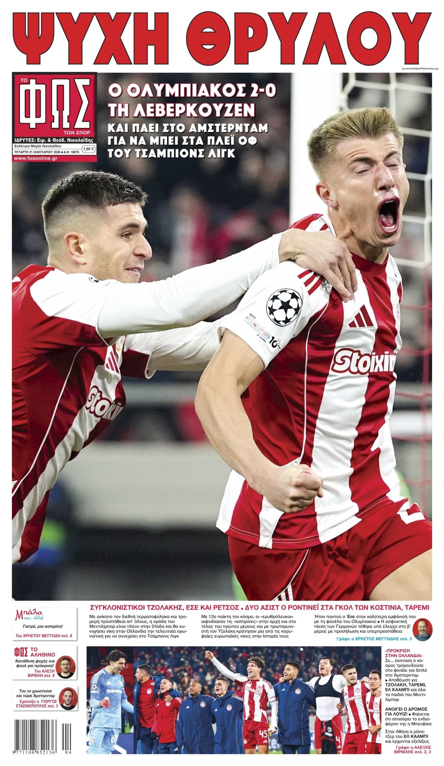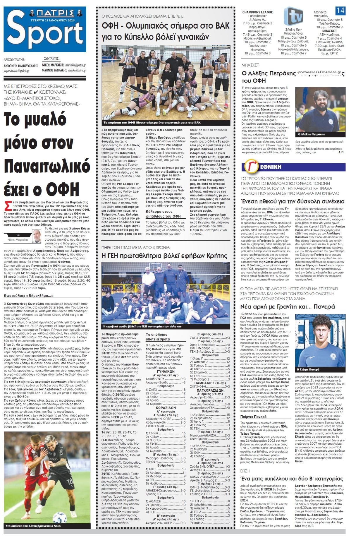 Οι αθλητικές εφημερίδες 21/1/2026 Enikos Newsroom 05:43, Τετάρτη 21 Ιανουαρίου 2026 Media Διαβάστε τα πρωτοσέλιδα από τις αθλητικές εφημερίδες, σήμερα 21/1/2026. ΑΘΛΗΤΙΚΕΣ ΕΦΗΜΕΡΙΔΕΣ ΕΦΗΜΕΡΙΔΕΣ ΠΡΩΤΟΣΕΛΙΔΑ Μοιράσου το: Ολυμπιακός – Λεβερκούζεν 2-0: Κατάπιε τις «ασπιρίνες» και βάζει πλώρη για πρόκριση Champions League: Νίκες πρόκρισης για Άρσεναλ και Ρεάλ – Όλα τα αποτελέσματα Τζολάκης: «Θέλουμε άλλη μια νίκη» – «Δουλειά μου είναι να βοηθάω όπως μπορώ» σχολίασε κι εσύ (0 σχόλια) Ακολουθήστε το enikos.gr στο Google News και μάθετε πρώτοι όλες τις ειδήσεις Δείτε όλες τις τελευταίες ειδήσεις από την Ελλάδα και τον Κόσμο στο enikos.gr Ειδήσεις Ροή Ειδήσεων 8 ώρες πριν Κακοκαιρία: Φαινόμενα ακραίας επικινδυνότητας και «κόκκινος» συναγερμός σε 5 περιφέρειες την Τετάρτη – Έκτακτα μέτρα, κλειστά σχολεία και φόβοι για πλημμύρες 6 ώρες πριν Δύο νέοι εκτροχιασμοί τρένων μέσα σε λίγες ώρες στην Καταλονία – Έπεσε τοίχος λόγω της κακοκαιρίας – Νεκρός ο οδηγός – 37 τραυματίες, 5 σοβαρά 8 ώρες πριν ΠΑΣΟΚ: Τα μηνύματα Ανδρουλάκη και οι έντονοι διάλογοι με Δούκα και Γερουλάνο – Το παρασκήνιο και όσα έγιναν στην Πολιτική Γραμματεία της ΚΟΕΣ 8 ώρες πριν Αγρίνιο: «O 50χρονος προκαλούσε και απειλούσε τον δράστη» κατέθεσε η σύζυγος του θύματος – Η φυγάδευσή της μετά την κηδεία και τα ενδεχόμενα που εξετάζουν οι Αρχές 8 ώρες πριν New York Times: Το πρώτο έτος της προεδρίας Τραμπ θα μπορούσε να έχει μακροχρόνιες οικονομικές συνέπειες – Αργούν να φανούν, αλλά σαρώνουν 1 ώρα πριν Τριχόπτωση: 5 τροφές που προκαλούν σταδιακά απώλεια μαλλιών χωρίς να το γνωρίζετε 4 ώρες πριν Τα ζώδια σήμερα, Τετάρτη 21 Ιανουαρίου 2026: Λέοντες, μία νέα γνωριμία θα κάνει την καρδιά σας να χτυπά δυνατά 8 ώρες πριν Επιστήμονες αποκρυπτογράφησαν κείμενα σε αρχαίες πινακίδες 1.800 ετών – Τις είχαν ρίξει σε πηγάδι για να κρατήσουν τα μυστικά τους κρυμμένα για πάντα 48 λεπτά πριν Οπτική ψευδαίσθηση: Μόνο αν έχετε παρατηρητικότητα ντετέκτιβ, θα εντοπίσετε τα 3 πρόσωπα στην εικόνα σε 14 δευτερόλεπτα 3 λεπτά πριν Την Κυριακή με τη Realnews: Ό,τι και αν αγοράσεις, σκανάρεις και κερδίζεις! 28 λεπτά πριν ΔΕΔΔΗΕ: Διακοπές ρεύματος σήμερα (21/1) στην Αθήνα και σε άλλες 12 περιοχές της Αττικής 41 λεπτά πριν Ο Ντόναλντ Τραμπ που κατευθυνόταν στο Νταβός επιστρέφει στη βάση Άντριους λόγω τεχνικού προβλήματος στο Air Force One 48 λεπτά πριν Οπτική ψευδαίσθηση: Μόνο αν έχετε παρατηρητικότητα ντετέκτιβ, θα εντοπίσετε τα 3 πρόσωπα στην εικόνα σε 14 δευτερόλεπτα 1 ώρα πριν Τριχόπτωση: 5 τροφές που προκαλούν σταδιακά απώλεια μαλλιών χωρίς να το γνωρίζετε ENIKOS NETWORK Ένα κουνέλι κρύβεται ανάμεσα στις γάτες – Μόνο όσοι έχουν άριστη οπτική αντίληψη μπορούν να το εντοπίσουν σε 11 δευτερόλεπτ... Το superfood της νεανικότητας που μπορεί να ενισχύσει τον μεταβολισμό και την υγεία της καρδιάς Άνοδος 0,7% στον κύκλο εργασιών της ελληνικής βιομηχανίας τον Νοέμβριο – Τα στοιχεία της ΕΛΣΤΑΤ ΑΠΔ: Επιστολή της ΠΟΦΕΕ προς Κεραμέως και διοικητή του e-ΕΦΚΑ-Τι αναφέρει Ο Google Assistant θα παραμείνει λίγο περισσότερο για ορισμένους χρήστες Android Τεστ προσωπικότητας: Το βάζο που θα επιλέξετε αποκαλύπτει πώς λύνετε προβλήματα στη ζωή σας περισσότερα 07:00 , Τετάρτη 21 Ιανουαρίου 2026 Την Κυριακή με τη Realnews: Ό,τι και αν αγοράσεις, σκανάρεις και κερδίζεις! Την Κυριακή με τη Realnews: Ό,τι και αν αγοράσεις, σκανάρεις και κερδίζεις! Με το PADU app, το... 22:44 , Τρίτη 20 Ιανουαρίου 2026 Μπαμπά σ’ αγαπώ: Ο Μιχάλης Βαλάσογλου αποκαλύπτει για τον ρόλο 