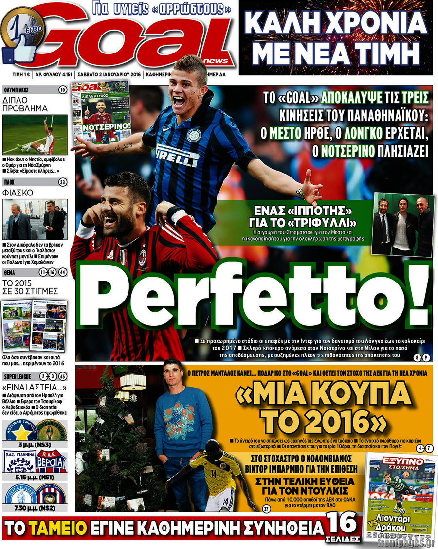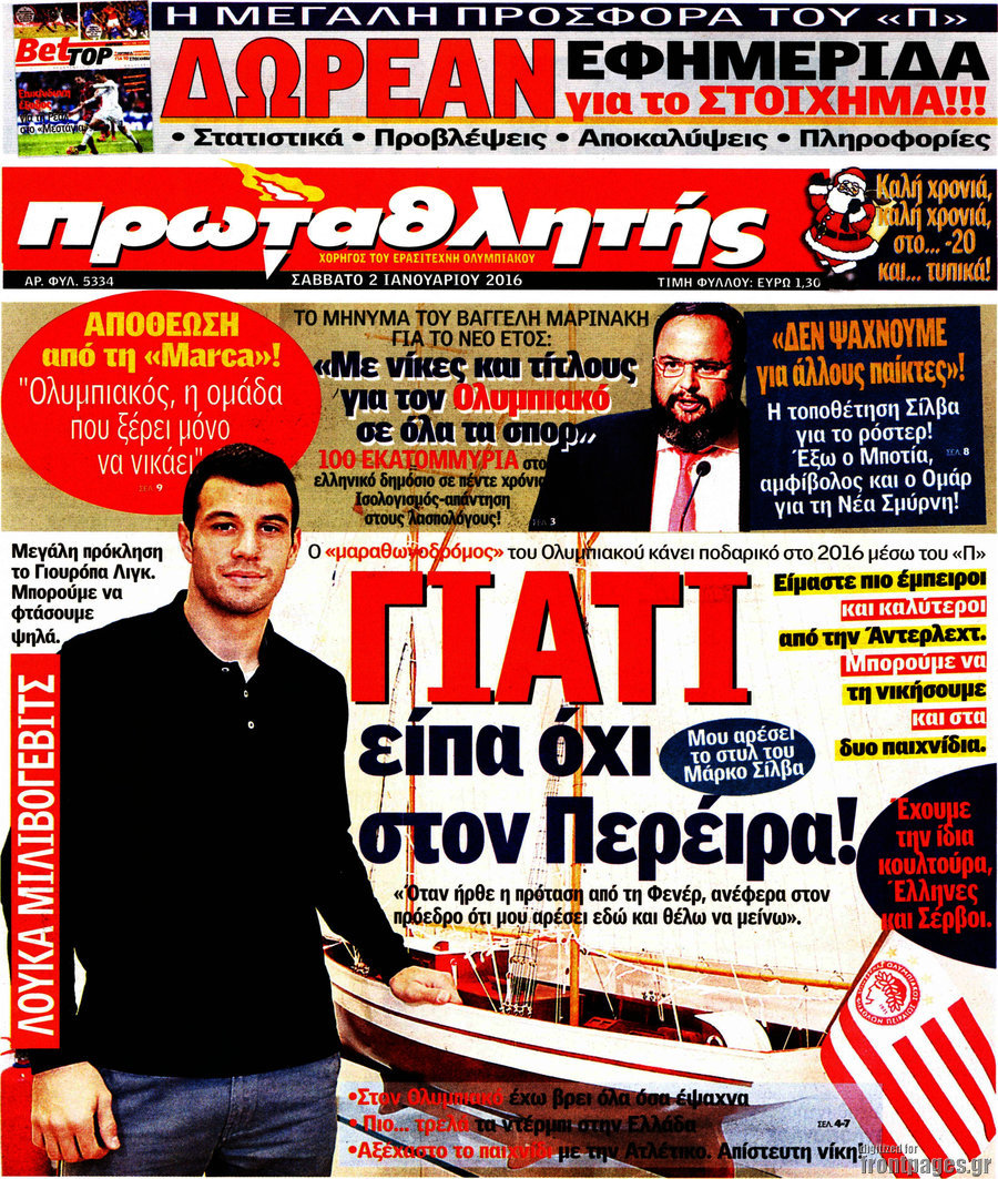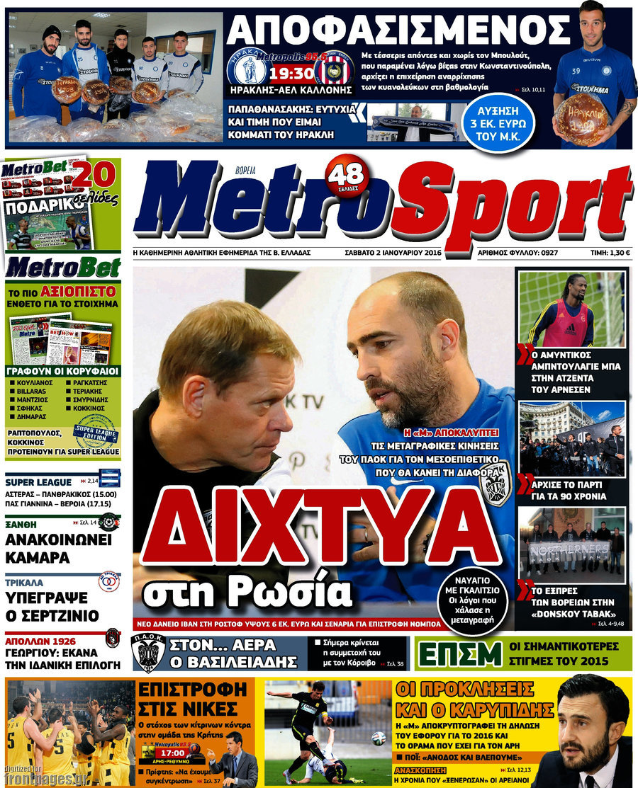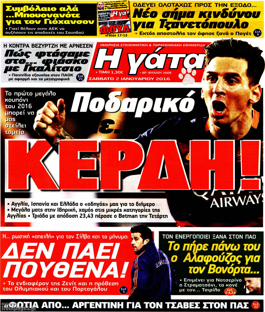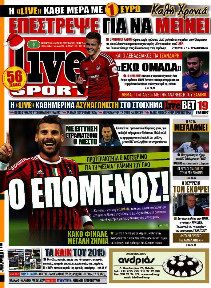 Οι αθλητικές εφημερίδες 2/1/2016 Enikos Newsroom 08:50, Σάββατο 02 Ιανουαρίου 2016 Media Διαβάστε τα σημερινά πρωτοσέλιδα των αθλητικών εφημερίδων: ΑΘΛΗΤΙΚΕΣ ΕΦΗΜΕΡΙΔΕΣ Μοιράσου το: σχολίασε κι εσύ (0 σχόλια) Ακολουθήστε το enikos.gr στο Google News και μάθετε πρώτοι όλες τις ειδήσεις Δείτε όλες τις τελευταίες ειδήσεις από την Ελλάδα και τον Κόσμο στο enikos.gr Ειδήσεις Ροή Ειδήσεων 1 ώρα πριν Δημοσκόπηση Metron Analysis: Στις 10 μονάδες η διαφορά ΝΔ-ΠΑΣΟΚ, στην 3η θέση η Πλεύση Ελευθερίας – 8 στους 10 στηρίζουν τον αγώνα των αγροτών 6 ώρες πριν Αγρότες: «Όχι στον διάλογο, μας εμπαίζει η κυβέρνηση» – Αποφάσισαν κλιμάκωση των κινητοποιήσεων, τι θα γίνει τα Χριστούγεννα 1 ώρα πριν Νίκος Παππάς στον ΑΝΤ1: «Δεν κρύβομαι – Μετά το συμβάν ακολούθησα κανονικά το πρόγραμμά μου» – ΒΙΝΤΕΟ 3 ώρες πριν Αθήνα: Εξαρθρώθηκε εγκληματική οργάνωση που διακινούσε ναρκωτικά σε μορφή σοκολάτας – Δύο τράπερ ανάμεσα στους 4 συλληφθέντες – ΒΙΝΤΕΟ 55 λεπτά πριν Διαμαντής Καραναστάσης: Οδηγούσε υπό την επήρεια αλκοόλ – Του αφαιρέθηκε το δίπλωμα και του επιβλήθηκε πρόστιμο 350 ευρώ 1 ώρα πριν Manifesting: Πώς να συναντήσετε τον σύντροφο της ζωής σας, ανάλογα με τον μήνα γέννησής σας 3 ώρες πριν Γάμος: 11 ψυχρές αλλά ευγενικές φράσεις, που λέει ένας άνδρας όταν σκέφτεται τον χωρισμό 2 ώρες πριν Σφουγγάρισμα: Η συνήθεια που θα σας βοηθήσει να διατηρήσετε το σπίτι σας καθαρό και τακτοποιημένο 2 ημέρες πριν 20 χρόνια τα Χριστούγεννα ξεκινούν στα Public με μεγάλη ποικιλία σε δώρα! 5 λεπτά πριν Τσιάρας: Δεν θα κινδυνέψουν οι πληρωμές των αγροτών – Χρειαζόμαστε μια νέα πολιτική, ένα restart 12 λεπτά πριν Δέσποινα Βανδή: Το βίντεο που δημοσίευσε με τον Γιώργο Νικολαΐδη – «Έχουμε καταστραφεί από τα μελομακάρονά σου» 17 λεπτά πριν Κλήρωση ΤΖΟΚΕΡ 18/12/2025: Αυτοί είναι οι τυχεροί αριθμοί 20 λεπτά πριν Τραμπ: Ζητεί από την Ουκρανία να “κινηθεί γρήγορα” στις διαπραγματεύσεις για το τέλος της σύγκρουσης 26 λεπτά πριν Ύπνος: Η απλή βραδινή ρουτίνα για να προστατεύσετε τα μαλλιά σας από το κρύο κατά τη διάρκεια του χειμώνα ENIKOS NETWORK Σε περίοδο αυξημένης δραστηριότητας η γρίπη στην Ελλάδα-Μέτρα προστασίας από τον ΕΟΔΥ Σκέφτεστε συνέχεια συζητήσεις που έχετε κάνει; Τι σημαίνει αυτό, σύμφωνα με ειδικό ΑΣΕΠ 2ΓΒ/2025: Σήμερα αρχίζει η υποβολή ενστάσεων – Πότε θα βγουν τα οριστικά αποτελέσματα ΕΛΤΑ: Αυτό είναι το νέο σχέδιο μετασχηματισμού του Οργανισμού- Τι δήλωσαν Πιερρακάκης και Παπαστεργίου Χαρτογραφώντας το «σημείο χωρίς επιστροφή»: Για πρώτη φορά αποκαλύπτεται με λεπτομέρεια το ακανθώδες όριο της ατμόσφαιρας τ... Η Google καταργεί τη λειτουργία «dark web report» – Πώς θα μπορούν οι χρήστες να διαγράφουν τα δεδομένα τους περισσότερα 17:45 , Πέμπτη 18 Δεκεμβρίου 2025 ROUK ZOUK: Εορταστικό επεισόδιο με καλεσμένους τους πρωταγωνιστές του «Γιατί ρε πατέρα» Το Σάββατο 20 Δεκεμβρίου στις 21:00, η Ζέτα Μακρυπούλια υποδέχεται εκλεκτούς ηθοποιούς που όλο... 17:20 , Πέμπτη 18 Δεκεμβρίου 2025 Άγιος έρωτας: Η Χριστίνα εξομολογείται στον πατέρα Νικόλαο, απόψε στις 21:00 στον Alpha Η Νότα αποφασίζει να εκδικηθεί τον Πέτρο και τον Στέφανο, για χάρη του Λούη, όμως τα πράγματα ... 16:50 , Πέμπτη 18 Δεκεμβρίου 2025 Να μ’ αγαπάς: Ζωή και Φωτεινή συμφιλιώνονται ως μάνα με κόρη, απόψε στις 20:00 Η ταυτότητα του Άγγελου αποκαλύπτεται στο νέο επεισόδιο της σειράς “Να μ’ αγαπάς... 15:52 , Πέμπτη 18 Δεκεμβρίου 2025 Το Σπίτι Δίπλα Στο Ποτάμι: Το καθηλωτικό τελευταίο επεισόδιο για το 2025 απόψε στις 22:30 Καθηλώνει το σημερινό 