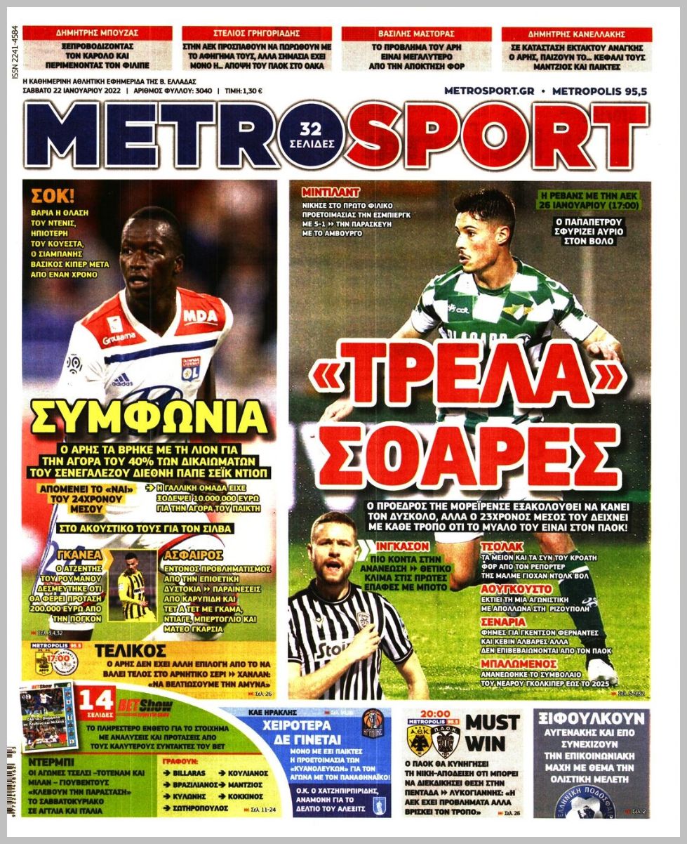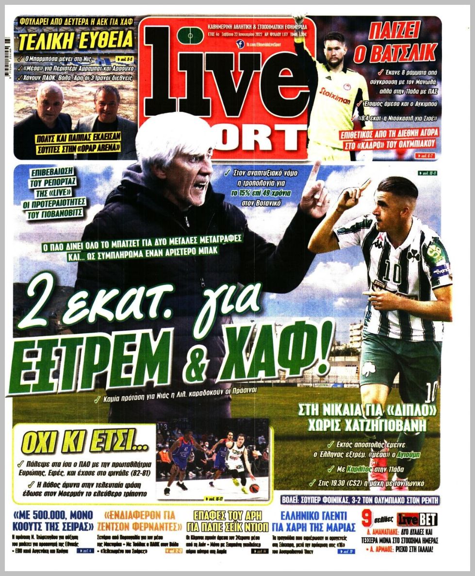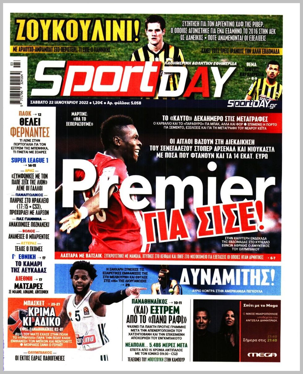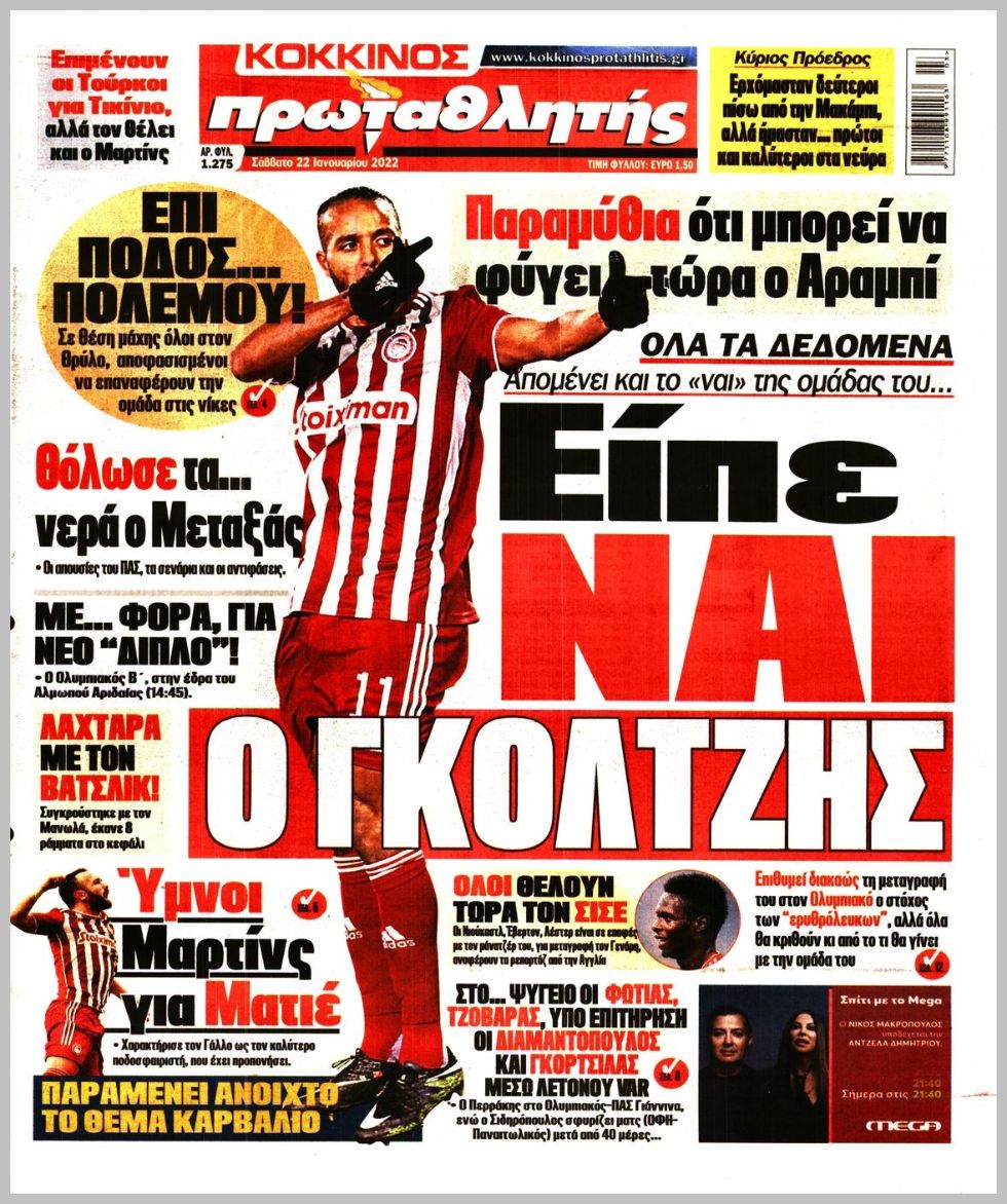 Οι αθλητικές εφημερίδες 22/1/2022 Διονύσης Νίκκας 08:27, Σάββατο 22 Ιανουαρίου 2022 Media Διαβάστε τα πρωτοσέλιδα από τις αθλητικές εφημερίδες… ΑΘΛΗΤΙΚΕΣ ΕΦΗΜΕΡΙΔΕΣ Μοιράσου το: Απαγωγή στο Ντράφι: Σημάδια ότι ο επιχειρηματίας βρίσκεται στη ζωή – ΒΙΝΤΕΟ Θεσσαλονίκη: Άνδρες της ΔΙΑΣ παρείχαν βοήθεια σε ηλικιωμένο μέσα στο σπίτι του Φρίκη στο Τέξας: Μητέρα υποχρέωνε την 11χρονη κόρη της να ζει με το πτώμα του πατέρα της σχολίασε κι εσύ (0 σχόλια) Ακολουθήστε το enikos.gr στο Google News και μάθετε πρώτοι όλες τις ειδήσεις Δείτε όλες τις τελευταίες ειδήσεις από την Ελλάδα και τον Κόσμο στο enikos.gr Ειδήσεις Ροή Ειδήσεων 3 ώρες πριν Υπόθεση Έπσταϊν: Το Υπουργείο Δικαιοσύνης δημοσιοποίησε μια σειρά από εξαιρετικά επεξεργασμένα αρχεία – «Λείπουν τα πιο σημαντικά έγγραφα», λένε οι Δημοκρατικοί 25 λεπτά πριν Γιορτές με μπλόκα για τους αγρότες: Ανοίγουν διόδια και μοιράζουν προϊόντα στους ταξιδιώτες 58 λεπτά πριν Εξαφάνιση 33χρονου γιατρού στην Κρήτη: «Άναψα τα φώτα, τρόμαξε και άρχισε να τρέχει στα χωράφια» – Η τελευταία διαδρομή και η μαρτυρία «κλειδί» 2 ώρες πριν Ο «χάρτης» με τις αυξήσεις και τις φοροελαφρύνσεις του 2026 – Ποιοι και πόσα κερδίζουν 41 λεπτά πριν Τα αρχεία του Έπσταϊν αποκαλύπτουν φωτογραφία του έκπτωτου πρίγκιπα Άντριου – Είναι ξαπλωμένος στην αγκαλιά 5 γυναικών 48 λεπτά πριν Μία νέα «χρυσή» περίοδος αρχίζει για 3 ζώδια από σήμερα – «Μία αναπάντεχη ευκαιρία οδηγεί στην επιτυχία» 5 ώρες πριν Αυγά: Πόσα μπορείτε να τρώτε την ημέρα με ασφάλεια για μέγιστη πρόσληψη πρωτεΐνης 3 ώρες πριν Αρχαιολόγοι ανακάλυψαν σε χωράφι απεικόνιση 600 ετών ενός Αγίου – Τα στοιχεία που δείχνουν ότι μαρτύρησε 2 ώρες πριν Αγχώνεται για το χριστουγεννιάτικο δώρο που πήρε στην πλούσια σύντροφό του – «Φοβάμαι πως θα το βρει φθηνιάρικο, φοράει βραχιόλια Cartier» 1 λεπτό πριν Τηλεθέαση (19/12): Ανατροπές και πρωτιές στην πρωινή ζώνη 9 λεπτά πριν Πώς η κλιματική αλλαγή επηρεάζει εγκύους και βρέφη – Οι επιπτώσεις των υψηλών θερμοκρασιών 17 λεπτά πριν e-ΕΦΚΑ και ΔΥΠΑ: Οι πληρωμές από 22 έως 24 Δεκεμβρίου – Ποιοι θα δουν χρήματα στους λογαριασμούς τους 25 λεπτά πριν Συνελήφθη οδηγός μηχανής που έτρεχε με 161 χλμ στη Συγγρού – Τον έπιασε το ραντάρ της Τροχαίας 25 λεπτά πριν Γιορτές με μπλόκα για τους αγρότες: Ανοίγουν διόδια και μοιράζουν προϊόντα στους ταξιδιώτες ENIKOS NETWORK Είστε μόνιμα απρόσεκτοι; 3 σημάδια που δείχνουν ότι μπορεί να είναι σύμπτωμα πάθησης Πόσα κιλά παίρνουμε πραγματικά τα Χριστούγεννα, σύμφωνα με την επιστήμη – Πώς να το αποτρέψουμε; Επίδομα παιδιού: Τι αλλάζει από το 2026 – Το όφελος από τις φορολογικές ελαφρύνσεις Mega χριστουγεννιάτικη φορολοταρία: «Κλείδωσε» η ημερομηνία για την κλήρωση – Ερωτήσεις και απαντήσεις Χαρτογραφώντας το «σημείο χωρίς επιστροφή»: Για πρώτη φορά αποκαλύπτεται με λεπτομέρεια το ακανθώδες όριο της ατμόσφαιρας τ... Η Google καταργεί τη λειτουργία «dark web report» – Πώς θα μπορούν οι χρήστες να διαγράφουν τα δεδομένα τους περισσότερα 09:30 , Σάββατο 20 Δεκεμβρίου 2025 «Porto Leone: Στη γειτονιά με τα κόκκινα φανάρια» – Ο Χρόνης αποκαλύπτει στην Αλεξάνδρα το μυστικό για το παιδί της Λένας Η μεγάλη δραματική σειρά του Apha «Porto Leone: Στη γειτονιά με τα κόκκινα φανάρια» μας μεταφέ... 08:14 , Σάββατο 20 Δεκεμβρίου 2025 Τρομεροί γονείς: Η Μαρία Καβογιάννη εισβάλλει στο σπίτι της οικογένειας Στεφανίδη Όσα θα δούμε στο νέο διπλό επεισόδιο της σειράς «Τρομεροί γονείς», σήμερα Σάββατο 20 Δεκε