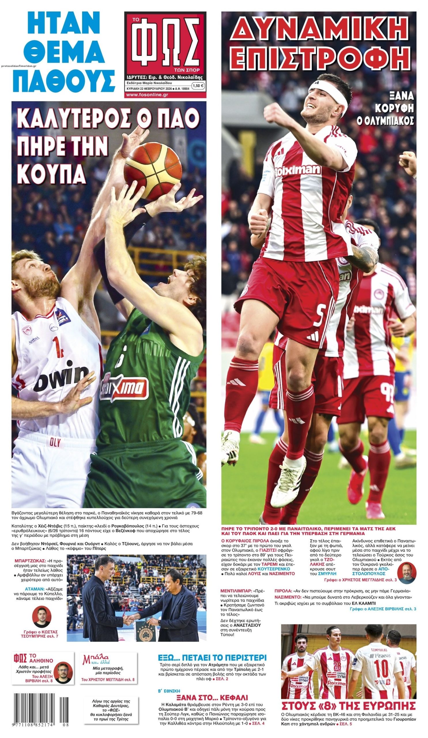 Διαβάστε τα πρωτοσέλιδα από τις αθλητικές εφημερίδες, σήμερα 22/2/2026.