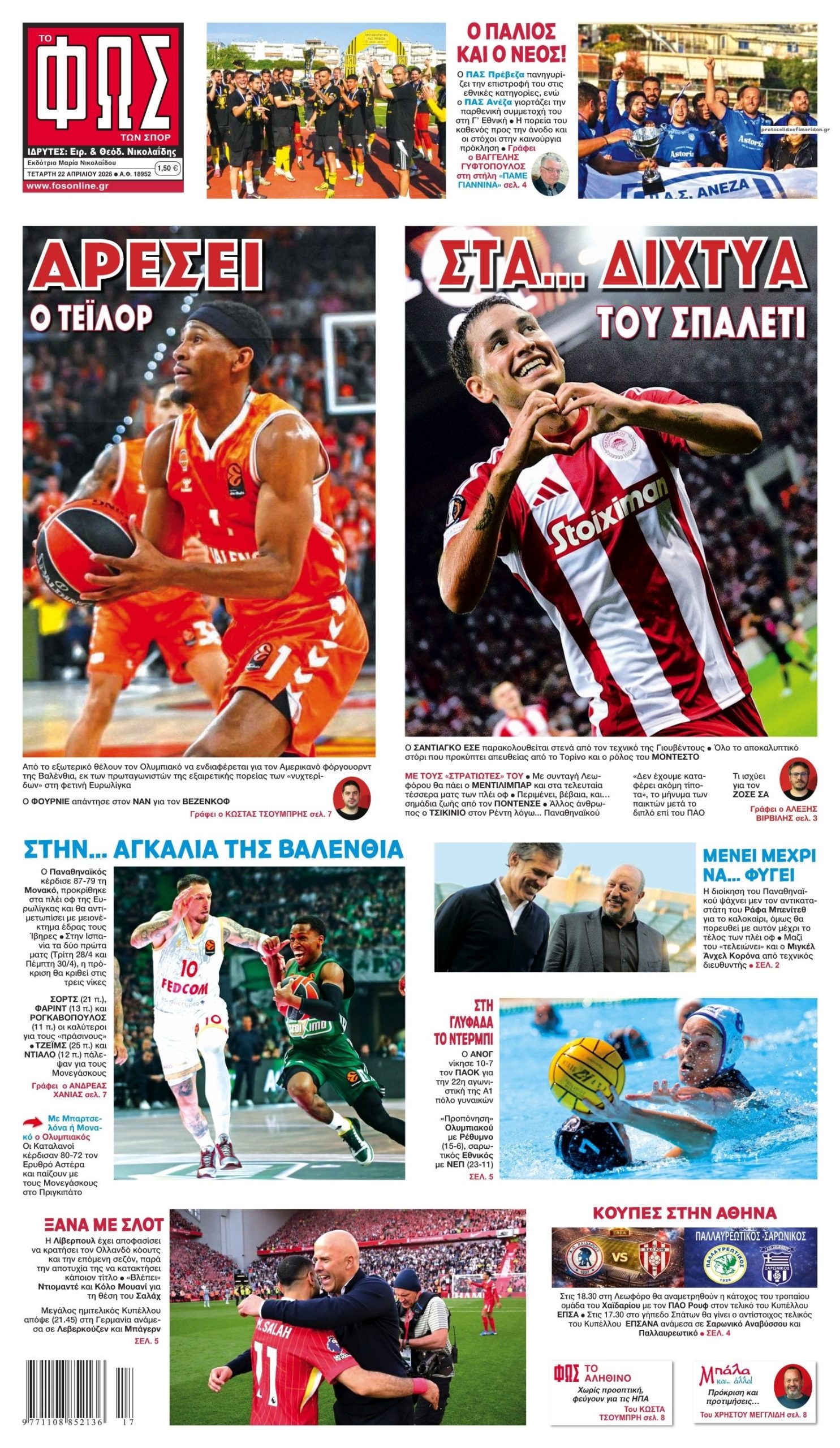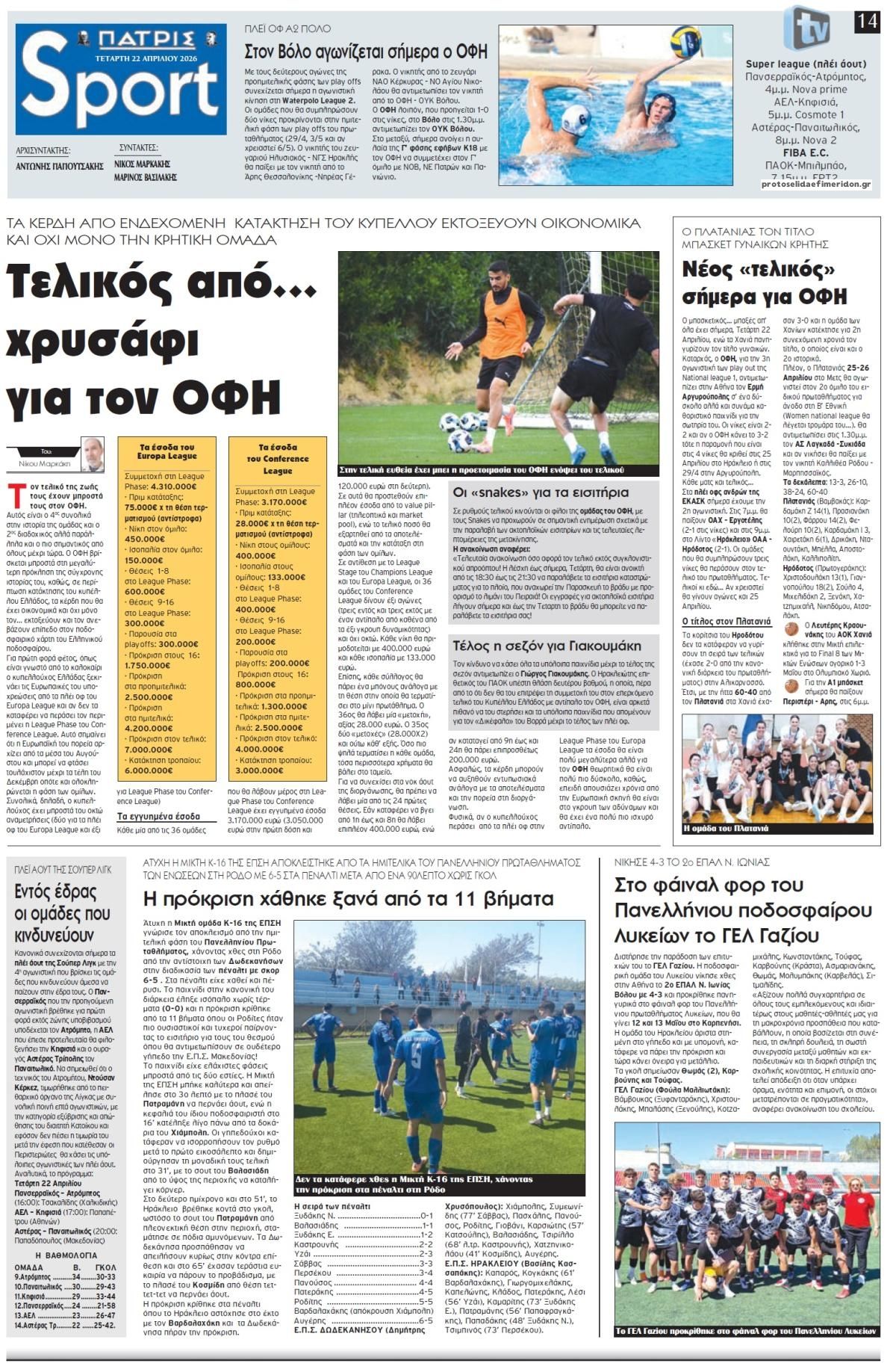 Οι αθλητικές εφημερίδες 22/4/2026 Enikos Newsroom 05:43, Τετάρτη 22 Απριλίου 2026 Media & Τηλεοπτικά Νέα Διαβάστε τα πρωτοσέλιδα από τις αθλητικές εφημερίδες, σήμερα 22/4/2026. ΑΘΛΗΤΙΚΕΣ ΕΦΗΜΕΡΙΔΕΣ ΕΦΗΜΕΡΙΔΕΣ ΠΡΩΤΟΣΕΛΙΔΑ Μοιράσου το: Premier League: Η Μπράιτον νίκησε 3-0 την θλιβερή Τσέλσι και «βλέπει» Ευρώπη – Το πρόγραμμα και η βαθμολογία La Liga: Η Ρεάλ Μαδρίτης νίκησε εύκολα 2-1 την Αλαβές κι όσο… ζει, ελπίζει – Όλα τα αποτελέσματα και η βαθμολογία Έργκιν Άταμαν για Βαλένθια: «Θα αναμετρηθούν δύο διαφορετικά συστήματα. Είμαι αισιόδοξος» σχολίασε κι εσύ (0 σχόλια) Ακολουθήστε το Enikos στο Google News και μάθετε πρώτοι όλες τις ειδήσεις Δείτε όλες τις τελευταίες ειδήσεις από την Ελλάδα και τον Κόσμο στο enikos.gr Ειδήσεις Ροή Ειδήσεων 8 ώρες πριν Εξαφάνιση 43χρονης στο Ηράκλειο: «Φεύγω για λίγο και επιστρέφω» – Το σημείωμα που άφησε, το θρίλερ με τον νεκρό πρώην σύντροφό της και η αγωνιώδης αναζήτησή της 23 ώρες πριν LIVE – 53η ημέρα πολέμου ΗΠΑ – Ισραήλ με Ιράν – Όλες οι εξελίξεις στη Μέση Ανατολή 8 ώρες πριν Προ των πυλών τα νέα μέτρα στήριξης: Πώς θα μοιραστεί το πλεόνασμα των 500 εκατ. ευρώ – Τι αναμένεται να ανακοινώσει ο Κυριάκος Μητσοτάκης 9 ώρες πριν Politico: Ο πόλεμος με το Ιράν επιταχύνει τη ρήξη των ΗΠΑ με τον υπόλοιπο κόσμο – Οι αποφάσεις Τραμπ προκαλούν ανησυχία και δυσπιστία ακόμη και σε συμμάχους 8 ώρες πριν Χαϊδάρι: «Στο χειρουργείο υπέστη ανακοπή για 50 λεπτά» – Η μάχη των γιατρών για να κρατήσουν στη ζωή την 13χρονη και τα ερωτήματα για την πτώση της 53 λεπτά πριν Οπτική ψευδαίσθηση: Μόνο αν είσαι ο Σέρλοκ Χολμς θα βρεις τo lego σε 12 δευτερόλεπτα 1 ώρα πριν Εγκεφαλικό: Οι 3 βιταμίνες που μειώνουν τον κίνδυνο, σύμφωνα με μελέτη 4 ώρες πριν Ζώδια 22/4: Ημερήσιες προβλέψεις – Σκορπιοί, δείτε τι γίνεται γύρω σας 8 ώρες πριν Θησαυροί μέσα στις στάχτες: Μεγάλη φωτιά σε αρχαία ελληνική πόλη αποκάλυψε «πορτοφόλια» γεμάτα νομίσματα – Ανάμεσά τους και πλαστά 18 λεπτά πριν ΟΗΕ: Αύξηση της βίας και νέο ρεκόρ παραβιάσεων της εκεχειρίας στη Γάζα 33 λεπτά πριν ΔΕΔΔΗΕ: Διακοπές ρεύματος σήμερα (22/4) στην Αθήνα και σε άλλες 11 περιοχές της Αττικής 43 λεπτά πριν MasterChef: Του πήρε 2,5 μήνες αλλά τα κατάφερε – Ποιος πήρε τα 1.000 ευρώ στο Τεστ Δημιουργικότητας – ΒΙΝΤΕΟ 53 λεπτά πριν Οπτική ψευδαίσθηση: Μόνο αν είσαι ο Σέρλοκ Χολμς θα βρεις τo lego σε 12 δευτερόλεπτα 1 ώρα πριν O Πρέσβης του Ιράν στον ΟΗΕ βλέπει νέο γύρο διαπραγματεύσεων με τις ΗΠΑ αφού τερματίσουν τον ναυτικό αποκλεισμό ENIKOS NETWORK Το τεστ που ζαλίζει: Εντοπίστε τον αριθμό 98 στο ατελείωτο ζιγκ-ζαγκ – Μόνο το 1% το βρίσκει σε 11 δευτερόλεπτα Το αρχαίο μπαχαρικό της Κίνας που μπορεί να βελτιώσει το μικροβίωμα του εντέρου και να μειώσει τον πόνο Έρχονται στην Ελλάδα τα φωτοβολταϊκά μπαλκονιού ΔΥΠΑ: «Ημέρα Καριέρας» με 30 επιχειρήσεις και 1.000 θέσεις εργασίας – Οι ειδικότητες Η αστοχία της AI αποτελεί πρόβλημα εμπειρίας πελατών – Είναι η πολυτροπική τεχνολογία η λύση; Κουίζ: Πόσο καλοί είστε στην ελληνική μυθολογία; Δοκιμάστε τις γνώσεις σας και κάντε το 3 στα 3 περισσότερα 21:06 , Τρίτη 21 Απριλίου 2026 Porto Leone: Στη γειτονιά με τα κόκκινα φανάρια – Η εγκυμοσύνη της Βούλας ανατρέπει τα πάντα Όλα όσα θα δούμε στο νέο επεισόδιο της σειράς “Porto Leone: Στη γειτονιά με τα κόκκινα φ... 17:12 , Τρίτη 21 Απριλίου 2026 Η Κλαυδία θα δώσει το 12άρι της Ελλάδας στη φετινή Eurovision Η Κλαυδία θα ανακοινώσει το 12άρι της Ελλάδας στον μεγάλο τελικό της Eurovision, που θα διεξαχ... 16:50 , Τρίτη 21 Απριλίου 2026 Akylas: Το σημα