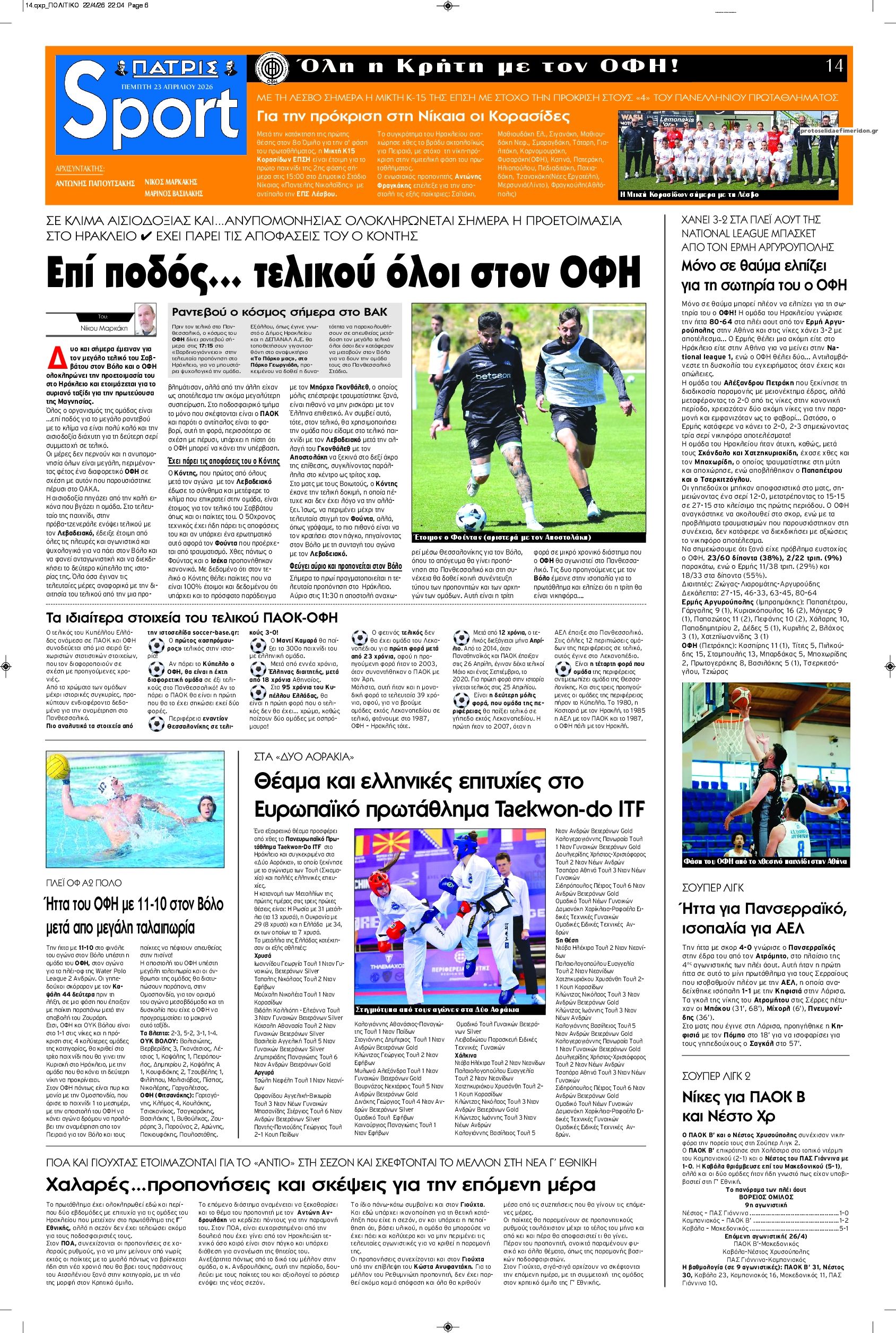Οι αθλητικές εφημερίδες 23/4/2026 Enikos Newsroom 05:43, Πέμπτη 23 Απριλίου 2026 Media & Τηλεοπτικά Νέα Διαβάστε τα πρωτοσέλιδα από τις αθλητικές εφημερίδες, σήμερα 23/4/2026. ΑΘΛΗΤΙΚΕΣ ΕΦΗΜΕΡΙΔΕΣ ΕΦΗΜΕΡΙΔΕΣ ΠΡΩΤΟΣΕΛΙΔΑ Μοιράσου το: Coppa Italia: Η Λάτσιο απέκλεισε στα πέναλτι την «αυτοκτονική» Αταλάντα και προκρίθηκε στον τελικό Με πρωταγωνιστή τον ασταμάτητο Χάρι Κέιν η Μπάγερν έκλεισε θέση στον τελικό του Κυπέλλου Γερμανίας – Δείτε τα highlights Premier League: Η Σίτι έκανε το πρώτο βήμα για τον τίτλο νικώντας 0-1 την Μπέρνλι – Δείτε τα αποτελέσματα και τη βαθμολογία σχολίασε κι εσύ (0 σχόλια) Ακολουθήστε το Enikos στο Google News και μάθετε πρώτοι όλες τις ειδήσεις Δείτε όλες τις τελευταίες ειδήσεις από την Ελλάδα και τον Κόσμο στο enikos.gr Ειδήσεις Ροή Ειδήσεων 8 ώρες πριν Γυναικοκτονία στο Ηράκλειο: Ο 40χρονος εκτέλεσε την Ελευθερία χωρίς καν να της μιλήσει με 9άρι πιστόλι – Το χρονικό της τραγωδίας 8 ώρες πριν Άγιος Δημήτριος: Τραύμα από μαχαίρι κοντά στην καρδιά φέρει ο 25χρονος που εντοπίστηκε νεκρός – Ήταν γιος αξιωματικού της ΕΛΑΣ 8 ώρες πριν Τραμπ: Αντιμέτωπος με την προθεσμία των «60 ημερών» για τον πόλεμο στο Ιράν – Οι 3 επιλογές του και γιατί μπορεί να αγνοήσει το Κογκρέσο 23 ώρες πριν LIVE – 54η ημέρα πολέμου ΗΠΑ – Ισραήλ με Ιράν – Όλες οι εξελίξεις στη Μέση Ανατολή 10 ώρες πριν Κωστής Χατζηδάκης στον ANT1 για τα μέτρα: «Η κυβέρνηση εξαντλεί τα περιθώρια στήριξης για πολίτες και επιχειρήσεις» – ΒΙΝΤΕΟ 38 λεπτά πριν Οπτική ψευδαίσθηση: Μόνο το 1% των ανθρώπων θα βρει το φίδι σε 13 δευτερόλεπτα 53 λεπτά πριν Χρόνιες παθήσεις: Η καθημερινή συνήθεια που μπορεί να μειώσει τον κίνδυνο, σύμφωνα με μελέτη 4 ώρες πριν Ζώδια 23/4: Ημερήσιες προβλέψεις – Υδροχόοι, θα έχετε πολλές νέες ιδέες και το φλερτ θα σας βγαίνει πιο εύκολα 9 ώρες πριν Ύπνος: Ποια είναι η καλύτερη ώρα για τη λήψη μαγνησίου, σύμφωνα με ειδικούς 3 λεπτά πριν ΟΗΕ: Η Λιβύη βρίσκεται σε κρίσιμο σταυροδρόμι – Ξεκάθαρη θέση της Ελλάδας υπέρ του οδικού χάρτη 18 λεπτά πριν ΔΕΔΔΗΕ: Διακοπές ρεύματος σήμερα (23/4) στην Αθήνα και σε άλλες 9 περιοχές της Αττικής 32 λεπτά πριν Το Ιράν είναι έτοιμο να παίξει στο Μουντιάλ, ενώ ο ειδικός απεσταλμένος του Τραμπ προτείνει την αντικατάσταση του με την Ιταλία 38 λεπτά πριν Οπτική ψευδαίσθηση: Μόνο το 1% των ανθρώπων θα βρει το φίδι σε 13 δευτερόλεπτα 53 λεπτά πριν Χρόνιες παθήσεις: Η καθημερινή συνήθεια που μπορεί να μειώσει τον κίνδυνο, σύμφωνα με μελέτη ENIKOS NETWORK 7 σημάδια ότι η φιλία σας δεν θα αντέξει στον χρόνο Νέο κτηριακό συγκρότημα στο «Αττικόν» με δωρεά του Ιδρύματος Σταύρος Νιάρχος Θετικό το α’ τρίμηνο του 2026 για τα ξενοδοχεία της Αθήνας – «Επιβράδυνση» τον Μάρτιο Boυλή: Στην Ολομέλεια το νομοσχέδιο για την απλούστευση του πλαισίου άσκησης οικονομικών δραστηριοτήτων – Όλα όσα προβλέπει Saildrone Spectre: Ο αθόρυβος κυνηγός υποβρυχίων που θα μπορούσε να αλλάξει το μέλλον του ναυτικού πολέμου Κουίζ: Πόσο καλά θυμάσαι την ελληνική μυθολογία; Μπορείς να απαντήσεις σωστά και στις 3 ερωτήσεις; περισσότερα 23:07 , Τετάρτη 22 Απριλίου 2026 Το Σπίτι Δίπλα Στο Ποτάμι: Μια απρόσμενη επίσκεψη ταράζει την Μελισσάνθη Η Πολυξένη αποφεύγει τον Ηλία και η Μαγδαληνή σκέφτεται να συνεργαστεί με τον Οδυσσέα στο νέο ... 16:18 , Τετάρτη 22 Απριλίου 2026 Θοδωρής Κυριακού: Συναντήθηκε με τον Σέρτζιο Ματαρέλα στη Ρώμη – Η Ευρώπη και τα σχέδια ανάπτυξης της GEDI και της La Repubblica στο επίκεντρο της συζήτησης Ο Πρόεδρος του Ομίλου Antenna, Θοδωρής Κυριακού 