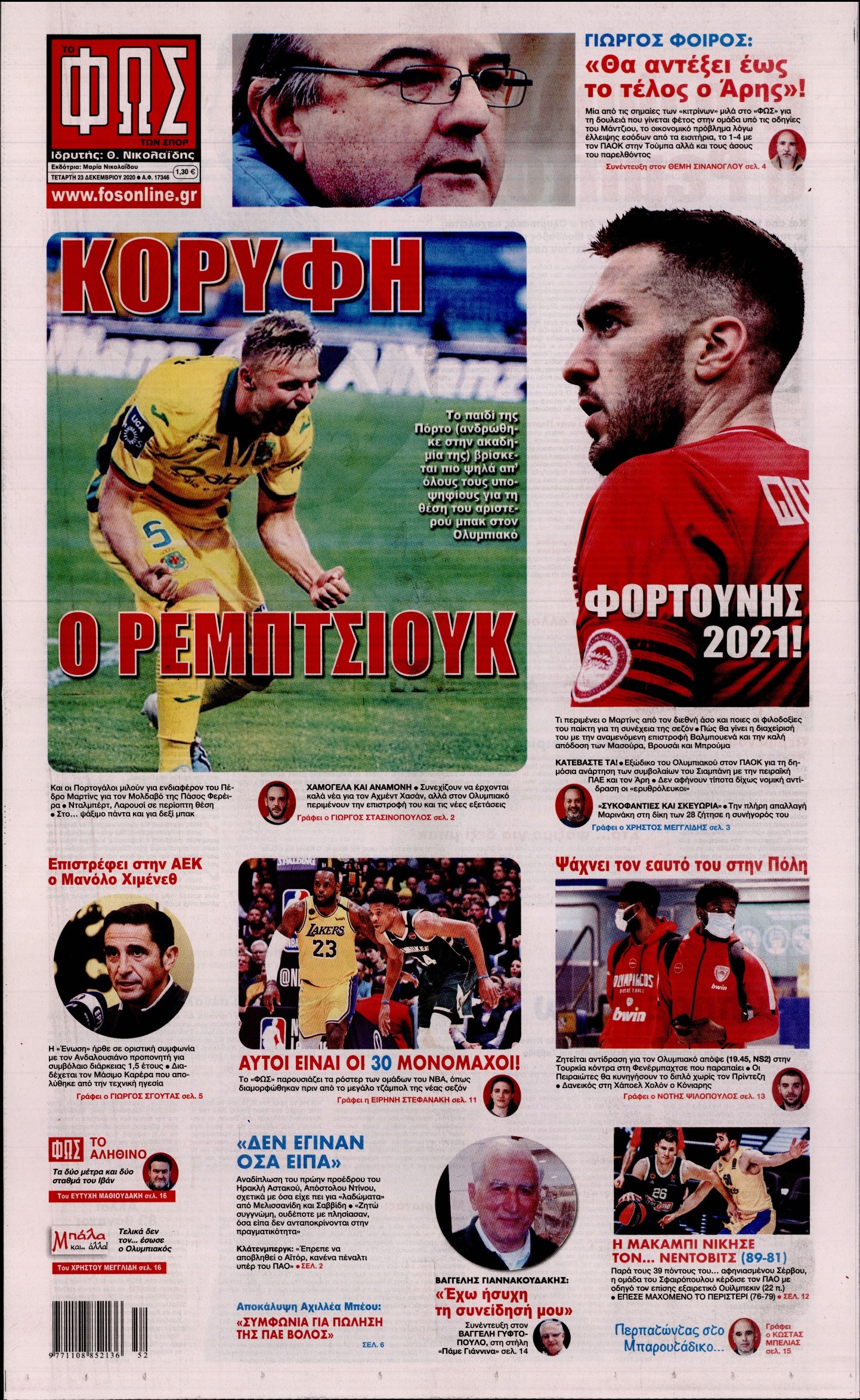 Οι αθλητικές εφημερίδες 23/12/2020 Διονύσης Νίκκας 06:49, Τετάρτη 23 Δεκεμβρίου 2020 Media Διαβάστε τα πρωτοσέλιδα των αθλητικών εφημερίδων… ΑΘΛΗΤΙΚΕΣ ΕΦΗΜΕΡΙΔΕΣ Μοιράσου το: σχολίασε κι εσύ (0 σχόλια) Ακολουθήστε το enikos.gr στο Google News και μάθετε πρώτοι όλες τις ειδήσεις Δείτε όλες τις τελευταίες ειδήσεις από την Ελλάδα και τον Κόσμο στο enikos.gr Ειδήσεις Ροή Ειδήσεων 4 ώρες πριν Μεσόγειος: Η διαδρομή του ρωσικού τάνκερ «Qendil» και η στοχευμένη επίθεση της Ουκρανίας με drone – Ο Πούτιν προειδοποίησε για αντίποινα 19 λεπτά πριν Αγρότες: Έκλεισαν για μία ώρα την παρακαμπτήρια της Ιόνιας Οδού στη θέση Χαλίκι 2 ώρες πριν Εμπλοκή και αερομαχίες με οπλισμένα τουρκικά F-16 στο Αιγαίο 2 ώρες πριν Πούτιν: «Ναι, είμαι ερωτευμένος» – Βίντεο από τη σπάνια προσωπική παραδοχή του 23 λεπτά πριν Ανδρέας Λυκουρέντζος: Υπέβαλε την παραίτησή του ο πρόεδρος του ΕΛΓΑ, αλλά δεν έγινε δεκτή – Όλο το παρασκήνιο 33 λεπτά πριν Αριθμολογία: Οι άνθρωποι που έχουν γεννηθεί αυτές τις 4 ημερομηνίες, συχνά παρεξηγούνται – «Η καλοσύνη τους κρύβει τεράστια δύναμη» 3 ώρες πριν Μήπως έχετε χάσει τον εαυτό σας στη σχέση σας; 7 «αθόρυβες» υποχωρήσεις που μάλλον κάνατε, χωρίς να το συνειδητοποιήσετε 2 ώρες πριν Ξεχάστε το καθάρισμα το Σαββατοκύριακο: Ο «κανόνας των 20 λεπτών» που θα σας λύσει τα χέρια 5 ώρες πριν Κουίζ για την παλιά Αθήνα: Αναγνωρίζετε την περιοχή; Έχετε περάσει 100% από εκεί 4 λεπτά πριν Συνεχίζει να προκαλεί ο Μίτσκοσκι: «Για μένα το όνομα Μακεδονία είναι ιερό» 13 λεπτά πριν Ο Γιάννης Κακλέας σκηνοθετεί Βερόνικα Δαβάκη και Ιβάν Σβιτάιλο στη «Locandiera» 19 λεπτά πριν Αγρότες: Έκλεισαν για μία ώρα την παρακαμπτήρια της Ιόνιας Οδού στη θέση Χαλίκι 23 λεπτά πριν Ανδρέας Λυκουρέντζος: Υπέβαλε την παραίτησή του ο πρόεδρος του ΕΛΓΑ, αλλά δεν έγινε δεκτή – Όλο το παρασκήνιο 27 λεπτά πριν Ηράκλειο: «Ιπτάμενοι» Άγιοι Βασίληδες μοίρασαν δώρα και χαμόγελα στα παιδιά στο ΠΑΓΝΗ – Δείτε βίντεο ENIKOS NETWORK Το ΕΚΑΒ τιμήθηκε από την Ακαδημία Αθηνών για τα 40 χρόνια προσφοράς του Έχετε πραγματικά μεγάλη καρδιά; 10 χαρακτηριστικά όσων έχουν καλοσύνη Έρχονται νέες προσλήψεις σε Δήμο – Όλες οι λεπτομέρειες Επίδομα παιδιού: Πότε ανοίγει ξανά η πλατφόρμα για τις αιτήσεις Χαρτογραφώντας το «σημείο χωρίς επιστροφή»: Για πρώτη φορά αποκαλύπτεται με λεπτομέρεια το ακανθώδες όριο της ατμόσφαιρας τ... Η Google καταργεί τη λειτουργία «dark web report» – Πώς θα μπορούν οι χρήστες να διαγράφουν τα δεδομένα τους περισσότερα 20:37 , Παρασκευή 19 Δεκεμβρίου 2025 Don’t Forget The Lyrics: Η Έλλη Κοκκίνου υποδέχεται 4 παίκτες που θα κάνουν τα πάντα για να μη χάσουν ούτε… μισή λέξη από τους στίχους Το «Don’t Forget The Lyrics» επιστρέφει απόψε, Παρασκευή 19 Δεκεμβρίου, στις 21:00 με νέο επει... 19:31 , Παρασκευή 19 Δεκεμβρίου 2025 GNTM: Απόψε ο μεγάλος τελικός για τους 4 φιναλίστ Έπειτα από μήνες γεμάτους μόδα, δημιουργία και έντονες αναμετρήσεις, το GNTM 2025 κορυφώνεται,... 18:11 , Παρασκευή 19 Δεκεμβρίου 2025 Το σόι σου: Ο Άρης έρχεται στην Ελλάδα για τις γιορτές των Χριστουγέννων – Τι θα δούμε στο αποψινό εορταστικό επεισόδιο Ένα απολαυστικό, εορταστικό επεισόδιο της σειράς “Το σόι σου”, γεμάτο ευτράπελα αλ... 15:15 , Παρασκευή 19 Δεκεμβρίου 2025 Την Κυριακή με τη Realnews: Ό,τι και αν αγοράσεις, σκανάρεις και κερδίζεις! Την Κυριακή με τη Realnews: Ό,τι και αν αγοράσεις, σκανάρεις και κερδίζεις! Με το PADU app, το... ΤΕΛΕΥΤΑΙΕΣ ΕΙΔΗΣΕΙΣ 4 λεπτά πριν Συνεχίζει να προκαλεί ο Μίτσκοσκι: «Για μένα το όνομα... 13 λεπτά πρι