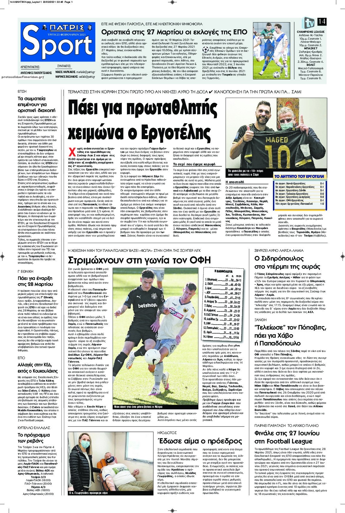 Οι αθλητικές εφημερίδες 23/2/2021 Σήφης Γαρυφαλάκης 06:21, Τρίτη 23 Φεβρουαρίου 2021 Media Διαβάστε τα πρωτοσέλιδα των αθλητικών εφημερίδων … ΑΘΛΗΤΙΚΕΣ ΕΦΗΜΕΡΙΔΕΣ ΕΦΗΜΕΡΙΔΕΣ ΠΡΩΤΟΣΕΛΙΔΑ ΠΡΩΤΟΣΕΛΙΔΑ ΕΦΗΜΕΡΙΔΩΝ Μοιράσου το: σχολίασε κι εσύ (0 σχόλια) Ακολουθήστε το enikos.gr στο Google News και μάθετε πρώτοι όλες τις ειδήσεις Δείτε όλες τις τελευταίες ειδήσεις από την Ελλάδα και τον Κόσμο στο enikos.gr Ειδήσεις Ροή Ειδήσεων 2 ώρες πριν ΣΥΡΙΖΑ: Διαγράφεται ο ευρωβουλευτής Νίκος Παππάς μετά την μήνυση δημοσιογράφου για ξυλοδαρμό 46 λεπτά πριν Τουρκία: Επιδιώκει την επιστροφή των S-400 στη Ρωσία – Οι αμερικανικές πιέσεις 57 λεπτά πριν ΟΠΕΚΕΠΕ: Ελεύθερες με όρους η σύζυγος και η αδελφή του φερόμενου αρχηγού – Τι υποστήριξαν 3 ώρες πριν Πώς στήθηκε η επιχείρηση «Ίπαλλος» που οδήγησε στη σύλληψη του «Έλληνα Εσκομπάρ» – «Ο πόλεμος ενάντια στους εμπόρους ναρκωτικών θα συνεχιστεί» 3 ώρες πριν Κυψέλη: Στη φυλακή η 16χρονη που μαχαίρωσε συμμαθήτριά της 3 ώρες πριν Τα 3 ζώδια που θα δουν τη ζωή τους να αλλάζει ριζικά το 2026 – «Όλα γίνονται καλύτερα σταδιακά» 8 ώρες πριν «Δεν είχα κλάψει από τότε που διαγνώστηκα με καρκίνο, ώσπου ένα τηλεφώνημα με έκανε να λυγίσω» – Η συγκλονιστική εξομολόγηση ενός άνδρα 4 ώρες πριν Ο σπάνιος σεισμός που έλυσε τα χέρια των επιστημόνων – Αποκάλυψε ακριβώς όσα αναζητούσαν 10 ώρες πριν 20 χρόνια τα Χριστούγεννα ξεκινούν στα Public με μεγάλη ποικιλία σε δώρα! 4 λεπτά πριν Οι άνθρωποι που θυμούνται τα όνειρά τους, συνήθως μοιράζονται αυτά τα 6 σπάνια χαρακτηριστικά 8 λεπτά πριν ΑΑΔΕ: Καταβλήθηκε η τέταρτη δόση επιστροφής ΕΦΚ αγροτικού πετρελαίου – Οδηγίες για τη διόρθωση παραστατικών 13 λεπτά πριν Μητσοτάκης: Το γούρι με τα αρχικά του για το 2026 που έδωσε στους βουλευτές της ΝΔ – ΦΩΤΟ 17 λεπτά πριν Καβάλα – Παναθηναϊκός 1-2: Ο Ταμπόρδα έστειλε τους Πράσινους απευθείας στα προημιτελικά του Κυπέλλου Ελλάδας 22 λεπτά πριν Δημήτρης Ήμελλος: Η συγκινητική ανάρτηση της αδελφής του, για τον ένα χρόνο από τον θάνατό του – «Πήγες στον Θεό για να μας θυμίσεις…» ENIKOS NETWORK 2,6 εκατομμύρια πολίτες έχουν ήδη εμβολιαστεί κατά της γρίπης Σοβαροί κίνδυνοι από τη λάθος χορήγηση φαρμάκου για τις αιμορραγίες-Συστάσεις προς τους γιατρούς Υπουργείο Εργασίας: Ο οδικός χάρτης για την ενίσχυση του πλαισίου των Συλλογικών Διαπραγματεύσεων – Οι 5 άξονες του σχεδίου... Έρχεται νέα ενίσχυση 17.500 ευρώ από τη ΔΥΠΑ για ανέργους- Όλες οι λεπτομέρειες Χαρτογραφώντας το «σημείο χωρίς επιστροφή»: Για πρώτη φορά αποκαλύπτεται με λεπτομέρεια το ακανθώδες όριο της ατμόσφαιρας τ... Η Google καταργεί τη λειτουργία «dark web report» – Πώς θα μπορούν οι χρήστες να διαγράφουν τα δεδομένα τους περισσότερα 12:35 , Τετάρτη 17 Δεκεμβρίου 2025 Μίρκα Παπακωνσταντίνου: «Δεν ήμουν αισιόδοξη για τα νούμερα – Είμαι ρεαλίστρια» Στα γυρίσματα του εορταστικού επεισοδίου της αγαπημένης σειράς “Το Σόι Σου”, βρέθηκε η κάμερα ... 12:12 , Τετάρτη 17 Δεκεμβρίου 2025 Ακούστε την εκπομπή του Νίκου Χατζηνικολάου 17/12/2025 Ακούστε την εκπομπή του Νίκου Χατζηνικολάου στον ραδιοφωνικό σταθμό RealFm 97,8, την Τετάρτη 1... 11:35 , Τετάρτη 17 Δεκεμβρίου 2025 Home Alone: Το σπίτι της ταινίας θα ανακαινιστεί – Επιστροφή στην αισθητική της δεκαετίας του ’90 Οι νέοι ιδιοκτήτες του πραγματικού σπιτιού που παρουσιάζεται στην κλασική ταινία του 1990 «Hom... 11:25 , Τετάρτη 17 Δεκεμβρίου 2025 Grand Hotel: Απόψε το τελευταίο επεισόδιο της χρονιάς – Όλα τα μυστικά μένουν εδώ Το τελευταίο επει