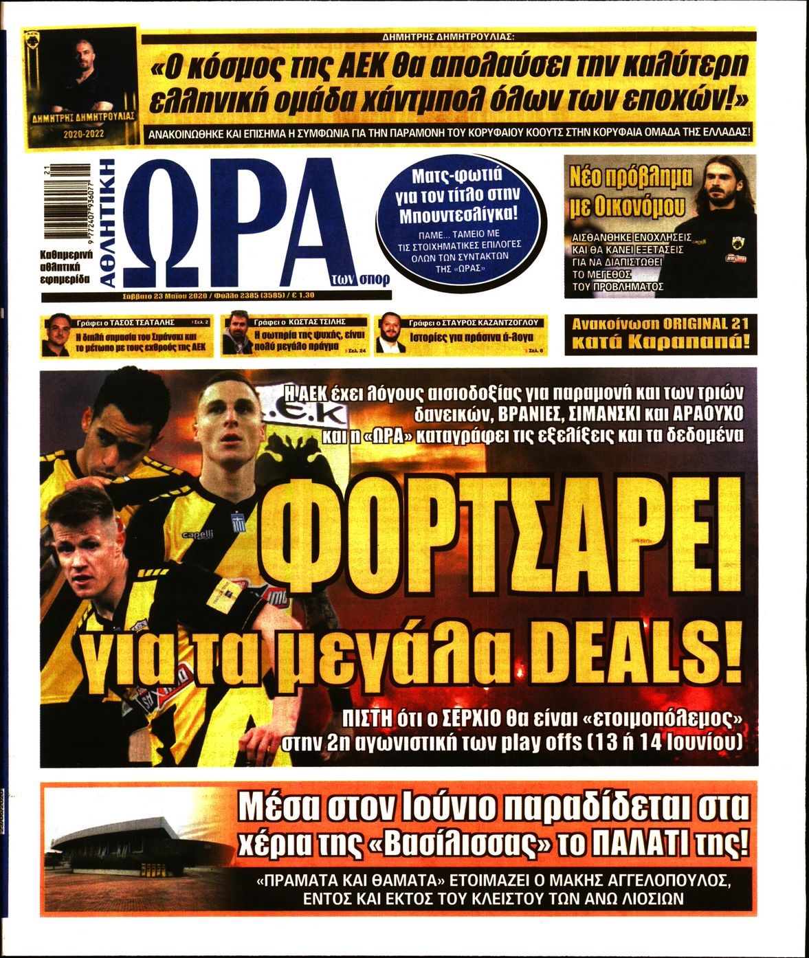 Οι αθλητικές εφημερίδες 23/5/2020 Διονύσης Νίκκας 07:24, Σάββατο 23 Μαΐου 2020 Media Διαβάστε τα πρωτοσέλιδα των αθλητικών εφημερίδων… ΑΘΛΗΤΙΚΕΣ ΕΦΗΜΕΡΙΔΕΣ Μοιράσου το: σχολίασε κι εσύ (0 σχόλια) Ακολουθήστε το enikos.gr στο Google News και μάθετε πρώτοι όλες τις ειδήσεις Δείτε όλες τις τελευταίες ειδήσεις από την Ελλάδα και τον Κόσμο στο enikos.gr Ειδήσεις Ροή Ειδήσεων 4 ώρες πριν Χριστούγεννα στα μπλόκα: Επιμένουν στις κινητοποιήσεις τους οι αγρότες – Ανοίγουν τα διόδια το Σαββατοκύριακο 4 ώρες πριν Ουκρανία: Η άνευ προηγουμένου επίθεση σε ρωσικό τάνκερ στη Μεσόγειο και το μήνυμα προς στον Πούτιν – Το «μακρύ χέρι» του Κιέβου 3 ώρες πριν Πούτιν: Τα μηνύματα σε Ευρώπη και ΝΑΤΟ από το μαραθώνιο «σόου» του – Η απαίτηση για «σεβασμό» και η ειρήνη «με τους όρους» της Μόσχας 4 ώρες πριν Τραμπ: Δεν αποκλείει την πιθανότητα ενός πολέμου στη Βενεζουέλα – «Ο Μαδούρο ξέρει καλύτερα από τον καθένα τι ακριβώς θέλω» 5 ώρες πριν Συνεχίζει να προκαλεί ο Μίτσκοσκι: «Για μένα το όνομα Μακεδονία είναι ιερό» 3 ώρες πριν Ανακαλύφθηκαν αρχαία χρυσά νομίσματα 2.200 ετών που απεικονίζουν τον θεό Απόλλωνα – Η άγνωστη σύνδεση με τον Φίλιππο Β΄ της Μακεδονίας 4 ώρες πριν Ύπνος: Μια κρυφή κατάσταση του εγκεφάλου πριν από τον ύπνο μπορεί να είναι το “κλειδί” για υψηλή ευφυΐα και δημιουργικότητα 5 ώρες πριν Αριθμολογία: Οι άνθρωποι που έχουν γεννηθεί αυτές τις 4 ημερομηνίες, συχνά παρεξηγούνται – «Η καλοσύνη τους κρύβει τεράστια δύναμη» 6 ώρες πριν Ξεχάστε το καθάρισμα το Σαββατοκύριακο: Ο «κανόνας των 20 λεπτών» που θα σας λύσει τα χέρια 9 λεπτά πριν Εξάρχεια: Ένταση με μολότοφ, χημικά και κρότου λάμψης 25 λεπτά πριν ΗΠΑ: Τραγωδία στην Αλαμπάμα – Σκότωσε την δημοσιογράφο σύζυγό του και αυτοκτόνησε μπροστά στον 3χρονο γιο τους 39 λεπτά πριν Πρόταση γάμου στο ΣΕΦ κατά την διάρκεια του αγώνα Ολυμπιακός-Βιλερμπάν – Δείτε βίντεο 54 λεπτά πριν Euroleague: Επέστρεψε στις νίκες ο Ολυμπιακός, πήρε την ματσάρα της χρονιάς η Μπάρτσα – Τα αποτελέσματα και η βαθμολογία 1 ώρα πριν Συρία: Μαζικά πλήγματα των ΗΠΑ σε θέσεις του Ισλαμικού Κράτους – Χέγκσεθ: «Δεν είναι αρχή πολέμου, είναι μια δήλωση εκδίκησης» για το θάνατο των στρατιωτών μας ENIKOS NETWORK Το ΕΚΑΒ τιμήθηκε από την Ακαδημία Αθηνών για τα 40 χρόνια προσφοράς του Έχετε πραγματικά μεγάλη καρδιά; 10 χαρακτηριστικά όσων έχουν καλοσύνη Αναστολή μέτρων αναγκαστικής εκτέλεσης για κτηνοτρόφους που πλήττονται από την ευλογιά των αιγοπροβάτων Πλήρης επάρκεια προϊόντων στις λαϊκές της Αττικής, παρά τις αγροτικές κινητοποιήσεις – Τι απαντούν οι πωλητές Χαρτογραφώντας το «σημείο χωρίς επιστροφή»: Για πρώτη φορά αποκαλύπτεται με λεπτομέρεια το ακανθώδες όριο της ατμόσφαιρας τ... Η Google καταργεί τη λειτουργία «dark web report» – Πώς θα μπορούν οι χρήστες να διαγράφουν τα δεδομένα τους περισσότερα 22:42 , Παρασκευή 19 Δεκεμβρίου 2025 Γιώργος Γιαννόπουλος για “Το σόι σου”: “Είναι ευτυχία και ευλογία αυτή η σειρά” «Είναι ευτυχία και ευλογία η συγκυρία αυτής της σειράς», θα πει ο Γιώργος Γιαννόπουλος -ο αγαπ... 20:37 , Παρασκευή 19 Δεκεμβρίου 2025 Don’t Forget The Lyrics: Η Έλλη Κοκκίνου υποδέχεται 4 παίκτες που θα κάνουν τα πάντα για να μη χάσουν ούτε… μισή λέξη από τους στίχους Το «Don’t Forget The Lyrics» επιστρέφει απόψε, Παρασκευή 19 Δεκεμβρίου, στις 21:00 με νέο επει... 19:31 , Παρασκευή 19 Δεκεμβρίου 2025 GNTM: Απόψε ο μεγάλος τελικός για τους 4 φιναλίστ Έπειτα από μήνες γεμάτους μόδα, δημιουργία και έντονες αναμετρή