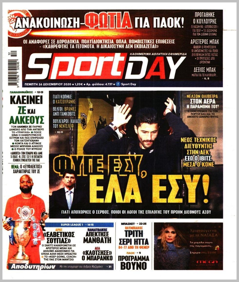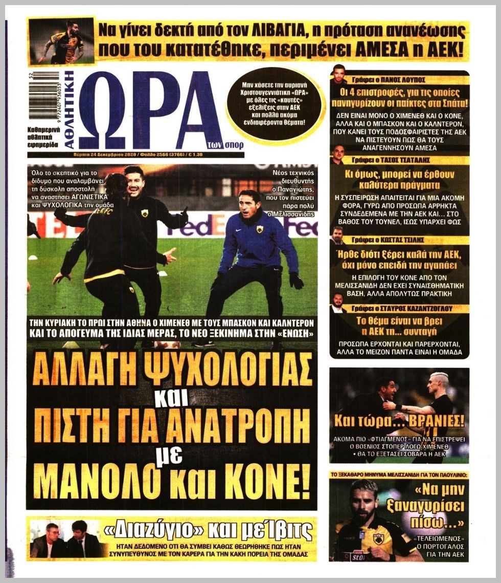 Οι αθλητικές εφημερίδες 24/12/2020 Διονύσης Νίκκας 06:49, Πέμπτη 24 Δεκεμβρίου 2020 Media Διαβάστε τα πρωτοσέλιδα των αθλητικών εφημερίδων… ΑΘΛΗΤΙΚΕΣ ΕΦΗΜΕΡΙΔΕΣ Μοιράσου το: σχολίασε κι εσύ (0 σχόλια) Ακολουθήστε το enikos.gr στο Google News και μάθετε πρώτοι όλες τις ειδήσεις Δείτε όλες τις τελευταίες ειδήσεις από την Ελλάδα και τον Κόσμο στο enikos.gr Ειδήσεις Ροή Ειδήσεων 2 ώρες πριν Χριστούγεννα στα μπλόκα: Επιμένουν στις κινητοποιήσεις τους οι αγρότες – Ανοίγουν τα διόδια το Σαββατοκύριακο 2 ώρες πριν Ουκρανία: Η άνευ προηγουμένου επίθεση σε ρωσικό τάνκερ στη Μεσόγειο και το μήνυμα προς στον Πούτιν – Το «μακρύ χέρι» του Κιέβου 2 ώρες πριν Πούτιν: Τα μηνύματα σε Ευρώπη και ΝΑΤΟ από το μαραθώνιο «σόου» του – Η απαίτηση για «σεβασμό» και η ειρήνη «με τους όρους» της Μόσχας 3 ώρες πριν Τραμπ: Δεν αποκλείει την πιθανότητα ενός πολέμου στη Βενεζουέλα – «Ο Μαδούρο ξέρει καλύτερα από τον καθένα τι ακριβώς θέλω» 3 ώρες πριν Συνεχίζει να προκαλεί ο Μίτσκοσκι: «Για μένα το όνομα Μακεδονία είναι ιερό» 2 ώρες πριν Ανακαλύφθηκαν αρχαία χρυσά νομίσματα 2.200 ετών που απεικονίζουν τον θεό Απόλλωνα – Η άγνωστη σύνδεση με τον Φίλιππο Β΄ της Μακεδονίας 3 ώρες πριν Ύπνος: Μια κρυφή κατάσταση του εγκεφάλου πριν από τον ύπνο μπορεί να είναι το “κλειδί” για υψηλή ευφυΐα και δημιουργικότητα 4 ώρες πριν Αριθμολογία: Οι άνθρωποι που έχουν γεννηθεί αυτές τις 4 ημερομηνίες, συχνά παρεξηγούνται – «Η καλοσύνη τους κρύβει τεράστια δύναμη» 5 ώρες πριν Ξεχάστε το καθάρισμα το Σαββατοκύριακο: Ο «κανόνας των 20 λεπτών» που θα σας λύσει τα χέρια 18 λεπτά πριν Φαίη Σκορδά: «Παλιότερα τα κομπλιμέντα τα προσπερνούσα, τώρα τα έχω ανάγκη» 34 λεπτά πριν Βασίλης Σπανούλης: Δεν εμφανίστηκε ούτε ένας δημοσιογράφος στην συνέντευξη Τύπου – «Καλησπέρα στον… κανέναν», δείτε βίντεο 45 λεπτά πριν Πόλεμος στην Ουκρανία: Εφτά νεκροί από ρωσική πυραυλική επίθεση στο λιμάνι της Οδησσού 48 λεπτά πριν ΗΠΑ: Η κυβέρνηση του Ντόναλντ Τραμπ άρχισε να δημοσιοποιεί τα αρχεία Έπσταϊν 60 λεπτά πριν Σάμος: Άνοιξε το μπλόκο των αγροτών στον κόμβο Κοκκαρίου – Σε νέα συνεδρίαση θα καθορίσουν την στάση τους ENIKOS NETWORK Το ΕΚΑΒ τιμήθηκε από την Ακαδημία Αθηνών για τα 40 χρόνια προσφοράς του Έχετε πραγματικά μεγάλη καρδιά; 10 χαρακτηριστικά όσων έχουν καλοσύνη Αναστολή μέτρων αναγκαστικής εκτέλεσης για κτηνοτρόφους που πλήττονται από την ευλογιά των αιγοπροβάτων Πλήρης επάρκεια προϊόντων στις λαϊκές της Αττικής, παρά τις αγροτικές κινητοποιήσεις – Τι απαντούν οι πωλητές Χαρτογραφώντας το «σημείο χωρίς επιστροφή»: Για πρώτη φορά αποκαλύπτεται με λεπτομέρεια το ακανθώδες όριο της ατμόσφαιρας τ... Η Google καταργεί τη λειτουργία «dark web report» – Πώς θα μπορούν οι χρήστες να διαγράφουν τα δεδομένα τους περισσότερα 22:42 , Παρασκευή 19 Δεκεμβρίου 2025 Γιώργος Γιαννόπουλος για “Το σόι σου”: “Είναι ευτυχία και ευλογία αυτή η σειρά” «Είναι ευτυχία και ευλογία η συγκυρία αυτής της σειράς», θα πει ο Γιώργος Γιαννόπουλος -ο αγαπ... 20:37 , Παρασκευή 19 Δεκεμβρίου 2025 Don’t Forget The Lyrics: Η Έλλη Κοκκίνου υποδέχεται 4 παίκτες που θα κάνουν τα πάντα για να μη χάσουν ούτε… μισή λέξη από τους στίχους Το «Don’t Forget The Lyrics» επιστρέφει απόψε, Παρασκευή 19 Δεκεμβρίου, στις 21:00 με νέο επει... 19:31 , Παρασκευή 19 Δεκεμβρίου 2025 GNTM: Απόψε ο μεγάλος τελικός για τους 4 φιναλίστ Έπειτα από μήνες γεμάτους μόδα, δημιουργία και έντονες αναμετρήσεις, το GNTM 2025 κορυφώνεται,... 18:11 , Παρασκευή 19 Δε