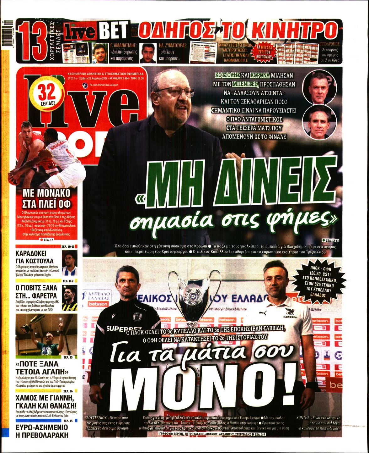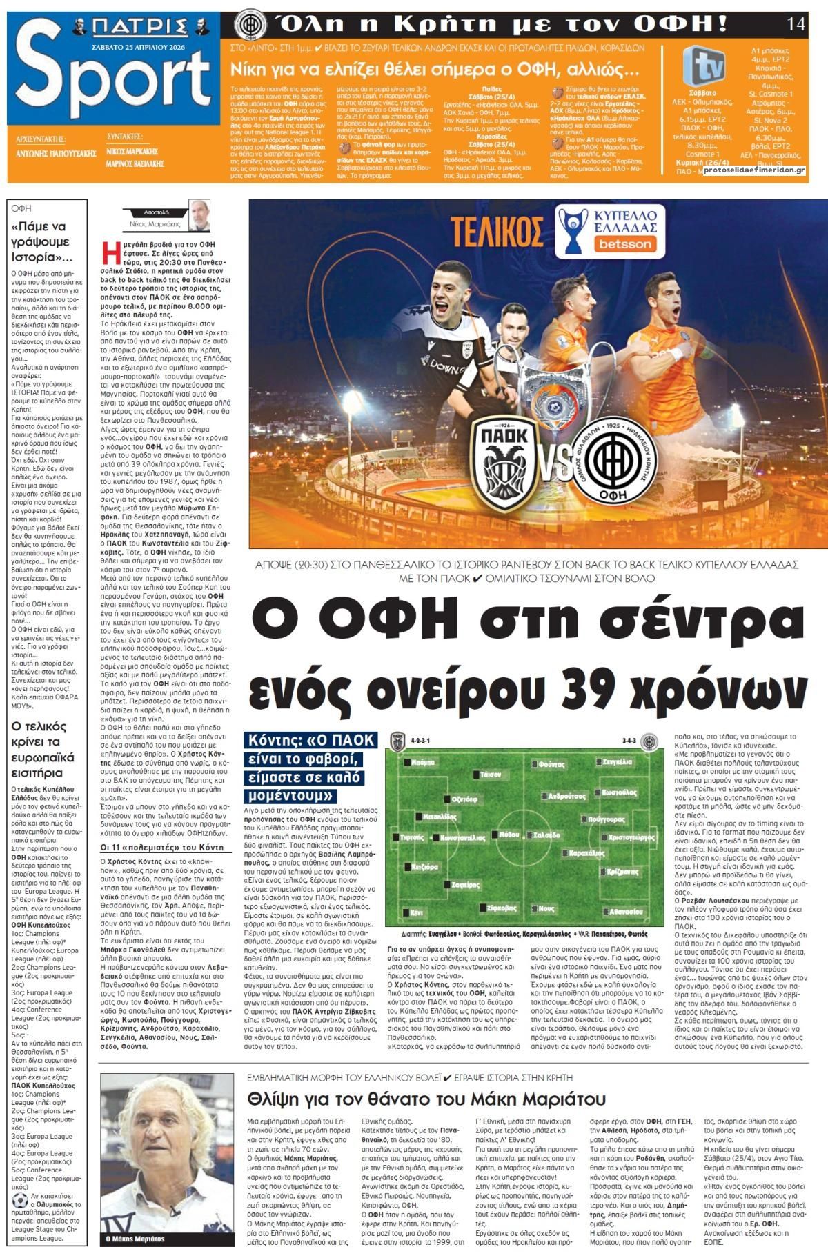 Οι αθλητικές εφημερίδες 25/4/2026 Enikos Newsroom 05:43, Σάββατο 25 Απριλίου 2026 Media & Τηλεοπτικά Νέα Διαβάστε τα πρωτοσέλιδα από τις αθλητικές εφημερίδες, σήμερα 25/4/2026. ΑΘΛΗΤΙΚΕΣ ΕΦΗΜΕΡΙΔΕΣ ΕΦΗΜΕΡΙΔΕΣ ΠΡΩΤΟΣΕΛΙΔΑ Μοιράσου το: Στην καλύτερη πεντάδα του EuroCup Γυναικών η Μαριέλλα Φασούλα Ευρωπαϊκό Πρωτάθλημα Πάλης: Ασημένιο μετάλλιο για τη Μαρία Πρεβολαράκη «Ιδανική αυτόχειρας» η Ρεάλ Μαδρίτης: Ισοφαρίστηκε στις καθυστερήσεις από την Μπέτις αφήνοντας τις τελευταίες της ελπίδες για τον τίτλο σχολίασε κι εσύ (0 σχόλια) Ακολουθήστε το Enikos στο Google News και μάθετε πρώτοι όλες τις ειδήσεις Δείτε όλες τις τελευταίες ειδήσεις από την Ελλάδα και τον Κόσμο στο enikos.gr Ειδήσεις Ροή Ειδήσεων 10 ώρες πριν Προεδρικό Μέγαρο: «Ελλάς-Γαλλία-Συμμαχία» είπε στα ελληνικά ο Μακρόν – Τασούλας: «Χαράσσουμε συντεταγμένα τη σύμπλευσή μας» 8 ώρες πριν Δολοφονία στον Άγιο Δημήτριο: «Για μια γυναίκα πλακώθηκαν, έχω τρελαθεί» λέει ο παππούς του δράστη – Τι έγραφε πάνω το μαχαίρι του εγκλήματος 10 ώρες πριν Μακρόν: Έστειλε σαφές μήνυμα στήριξης στην Ελλάδα – «Αν η Τουρκία σας απειλήσει θα είμαστε εδώ» – ΒΙΝΤΕΟ 8 ώρες πριν Από το «σοκ και δέος» στο «περιμένουμε και βλέπουμε» – Γιατί άλλαξε η στρατηγική του Τραμπ για το Ιράν 24 ώρες πριν LIVE: 56η ημέρα πολέμου ΗΠΑ – Ισραήλ με Ιράν – Όλες οι εξελίξεις στη Μέση Ανατολή 1 ώρα πριν Οπτική ψευδαίσθηση: Μόνο όσοι έχουν τέλεια όραση μπορούν να εντοπίσουν το ελάφι μέσα σε 9 δευτερόλεπτα 1 ώρα πριν Διατροφή για δυνατά και υγιή μαλλιά: Οι τροφές που ενισχύουν την ανάπτυξη του τριχωτού της κεφαλής, σύμφωνα με ειδικούς 4 ώρες πριν Ζώδια 25/4: Ημερήσιες προβλέψεις – Λέοντες, μην φοβηθείτε να φύγετε από μέρη και παρέες που δεν σας προσφέρουν τίποτα πια 9 ώρες πριν Ύπνος και πρόληψη Αλτσχάιμερ: Η ποιότητα μετρά περισσότερο από τις ώρες για τηv γνωστική υγεία, σύμφωνα με μελέτη 7 λεπτά πριν Οι αθλητικές μεταδόσεις του Σαββάτου (25/4) 17 λεπτά πριν Πρότυπα και Ωνάσεια Σχολεία: 17.932 υποψήφιοι από σήμερα στη «μάχη» των εξετάσεων 27 λεπτά πριν Dj Deleasis για την live «κόντρα» Έφης Θώδη – Άντζελας Δημητρίου: «Ήξερα ότι θα τσιμπήσει – Έπεσε στη λούμπα» – ΒΙΝΤΕΟ 42 λεπτά πριν ΔΕΔΔΗΕ: Διακοπές ρεύματος σήμερα (25/4) στην Αθήνα και σε άλλες 8 περιοχές της Αττικής 57 λεπτά πριν Χουλιάρας για τον σεισμό στην Κρήτη: Φυσιολογική η σεισμική ακολουθία ENIKOS NETWORK Αεροσυνοδοί αποκαλύπτουν ποιες αναβαθμίσεις πτήσης δεν αξίζουν καθόλου τα χρήματα τους Το λαχανικό «αρχαίο γιατροσόφι» που μπορεί να έχει αντικαρκινική δράση και να μειώσει τον κίνδυνο για διαβήτη ΔΕΗ: Πότε θα γίνει η συμφωνία για το data center στην Κοζάνη- Όλα όσα είπε ο Στάσσης ΑΑΔΕ: Νέα ψηφιακή εφαρμογή για ενημέρωση οφειλετών με αλληλέγγυα ευθύνη Μια μυστηριώδης «χρυσή σφαίρα» εντοπίστηκε στον βυθό – Τώρα οι επιστήμονες ξέρουν επιτέλους τι είναι Κουίζ: Πόσο καλός είσαι στην ελληνική μυθολογία; Δοκίμασε τις γνώσεις σου και κάνε το 3 στα 3 περισσότερα 07:09 , Σάββατο 25 Απριλίου 2026 Οι αθλητικές μεταδόσεις του Σαββάτου (25/4) Ο τελικός του Κυπέλλου Ελλάδας ΠΑΟΚ-ΟΦΗ ξεχωρίζει στο πρόγραμμα με τις αθλητικές μεταδόσεις τη... 05:38 , Σάββατο 25 Απριλίου 2026 Οι πολιτικές εφημερίδες 25/4/2026 Διαβάστε τα πρωτοσέλιδα από τις πολιτικές εφημερίδες, σήμερα 25/4/2026. 05:48 , Παρασκευή 24 Απριλίου 2026 Οι οικονομικές εφημερίδες 24/4/2026 Διαβάστε τα πρωτοσέλιδα από τις οικονομικές εφημερίδες, σήμερα 24/4/2026. 05:43 , Παρασκευή 24 Απριλίου 2026 Οι αθλητικές εφημερίδες 24/4/2026 Διαβάστε τα πρ