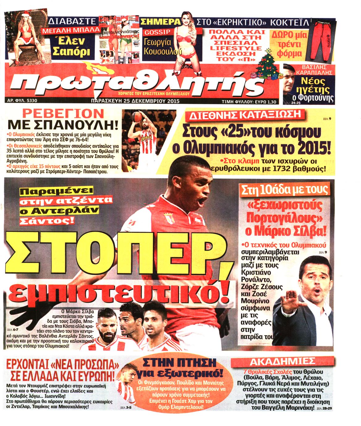 Οι αθλητικές εφημερίδες 25/12/2015 Enikos Newsroom 06:16, Παρασκευή 25 Δεκεμβρίου 2015 Media Διαβάστε τα σημερινά πρωτοσέλιδα των αθλητικών εφημερίδων: ΑΘΛΗΤΙΚΕΣ ΕΦΗΜΕΡΙΔΕΣ ΠΡΩΤΟΣΕΛΙΔΑ Μοιράσου το: σχολίασε κι εσύ (0 σχόλια) Ακολουθήστε το enikos.gr στο Google News και μάθετε πρώτοι όλες τις ειδήσεις Δείτε όλες τις τελευταίες ειδήσεις από την Ελλάδα και τον Κόσμο στο enikos.gr Ειδήσεις Ροή Ειδήσεων 49 λεπτά πριν Αυξάνουν την πίεση προς την κυβέρνηση οι αγρότες: Κλείνουν παρακαμπτήριους και ανοίγουν διόδια – Τι θα γίνει τις γιορτές 39 λεπτά πριν Φοινικούντα: Το Σάββατο απολογείται ο 30χρονος γιος γνωστού επιχειρηματία της Πλάκας που παραδόθηκε – Όσα είπε στους αστυνομικούς και ο ρόλος του στο έγκλημα 21 λεπτά πριν Μπορεί ο Μαδούρο να αντέξει τον αποκλεισμό του Τραμπ; Τι θα χρειαστεί η Ουάσινγκτον για να τον ανατρέψει 2 ώρες πριν Δημοσκόπηση Metron Analysis: Στις 10 μονάδες η διαφορά ΝΔ-ΠΑΣΟΚ, στην 3η θέση η Πλεύση Ελευθερίας – 8 στους 10 στηρίζουν τον αγώνα των αγροτών 2 ώρες πριν Πρίγκιπας Ουίλιαμ – Κέιτ: Η νέα οικογενειακή φωτογραφία για τις Χριστουγεννιάτικες κάρτες του 2025 1 ώρα πριν Ύπνος: Η απλή βραδινή ρουτίνα για να προστατεύσετε τα μαλλιά σας από το κρύο κατά τη διάρκεια του χειμώνα 2 ώρες πριν Manifesting: Πώς να συναντήσετε τον σύντροφο της ζωής σας, ανάλογα με τον μήνα γέννησής σας 2 ημέρες πριν 20 χρόνια τα Χριστούγεννα ξεκινούν στα Public με μεγάλη ποικιλία σε δώρα! 25 λεπτά πριν Αρχαιολόγοι ανακάλυψαν ρωμαϊκά τεχνουργήματα από μια πόλη που δεν υπήρξε ποτέ – Τα τρία εντυπωσιακά κτίρια και ο αμφορέας με τις… σαρδέλες 5 λεπτά πριν Παναθηναϊκός – Χάποελ Τελ Αβίβ 93-82: Με… φόρα από την Κωνσταντινούπολη 21 λεπτά πριν Μπορεί ο Μαδούρο να αντέξει τον αποκλεισμό του Τραμπ; Τι θα χρειαστεί η Ουάσινγκτον για να τον ανατρέψει 25 λεπτά πριν Αρχαιολόγοι ανακάλυψαν ρωμαϊκά τεχνουργήματα από μια πόλη που δεν υπήρξε ποτέ – Τα τρία εντυπωσιακά κτίρια και ο αμφορέας με τις… σαρδέλες 26 λεπτά πριν Στο ΟΑΚΑ για το «Παναθηναϊκός – Χάποελ» η Κίμπερλι Γκίλφοϊλ – ΦΩΤΟ 34 λεπτά πριν Ούρσουλα φον ντερ Λάιεν: Μετατίθεται για τον Ιανουάριο η υπογραφή της εμπορικής συμφωνίας «ΕΕ-MERCOSUR» ENIKOS NETWORK Σε περίοδο αυξημένης δραστηριότητας η γρίπη στην Ελλάδα-Μέτρα προστασίας από τον ΕΟΔΥ Σκέφτεστε συνέχεια συζητήσεις που έχετε κάνει; Τι σημαίνει αυτό, σύμφωνα με ειδικό Στεγαστικό: Τι λέει η ΠΟΜΙΔΑ για τα νέα μέτρα που ανακοίνωσε ο Κυριάκος Μητσοτάκης Λαγκάρντ: Αισιόδοξη για την ανάπτυξη της Ευρωζώνης, αβέβαιη για τον πληθωρισμό Χαρτογραφώντας το «σημείο χωρίς επιστροφή»: Για πρώτη φορά αποκαλύπτεται με λεπτομέρεια το ακανθώδες όριο της ατμόσφαιρας τ... Η Google καταργεί τη λειτουργία «dark web report» – Πώς θα μπορούν οι χρήστες να διαγράφουν τα δεδομένα τους περισσότερα 17:45 , Πέμπτη 18 Δεκεμβρίου 2025 ROUK ZOUK: Εορταστικό επεισόδιο με καλεσμένους τους πρωταγωνιστές του «Γιατί ρε πατέρα» Το Σάββατο 20 Δεκεμβρίου στις 21:00, η Ζέτα Μακρυπούλια υποδέχεται εκλεκτούς ηθοποιούς που όλο... 17:20 , Πέμπτη 18 Δεκεμβρίου 2025 Άγιος έρωτας: Η Χριστίνα εξομολογείται στον πατέρα Νικόλαο, απόψε στις 21:00 στον Alpha Η Νότα αποφασίζει να εκδικηθεί τον Πέτρο και τον Στέφανο, για χάρη του Λούη, όμως τα πράγματα ... 16:50 , Πέμπτη 18 Δεκεμβρίου 2025 Να μ’ αγαπάς: Ζωή και Φωτεινή συμφιλιώνονται ως μάνα με κόρη, απόψε στις 20:00 Η ταυτότητα του Άγγελου αποκαλύπτεται στο νέο επεισόδιο της σειράς “Να μ’ αγαπάς... 15:52 , Πέμπτη 18 Δεκεμβρίου 2025 Το Σπίτι Δίπλα Στο Ποτάμι: Το καθηλωτικό 