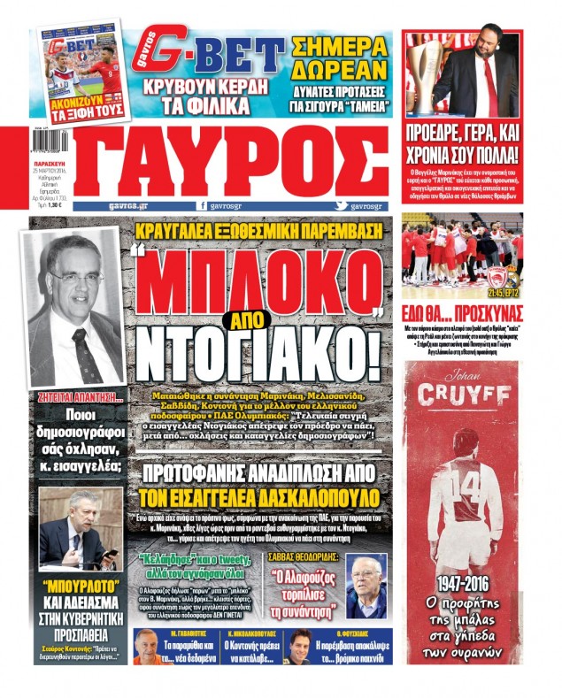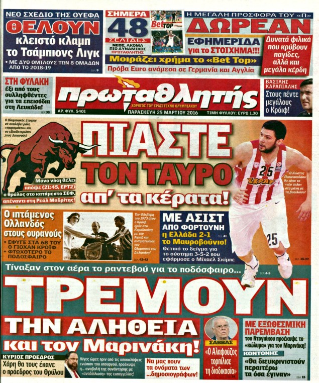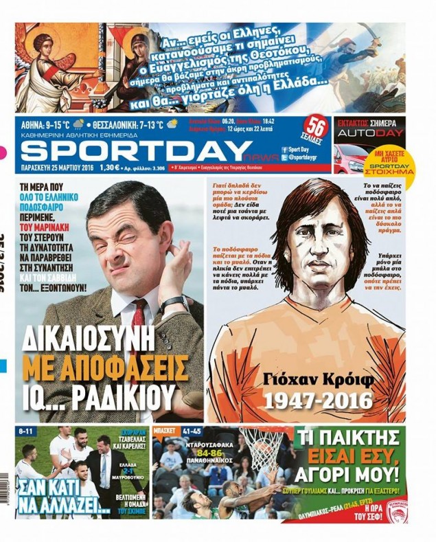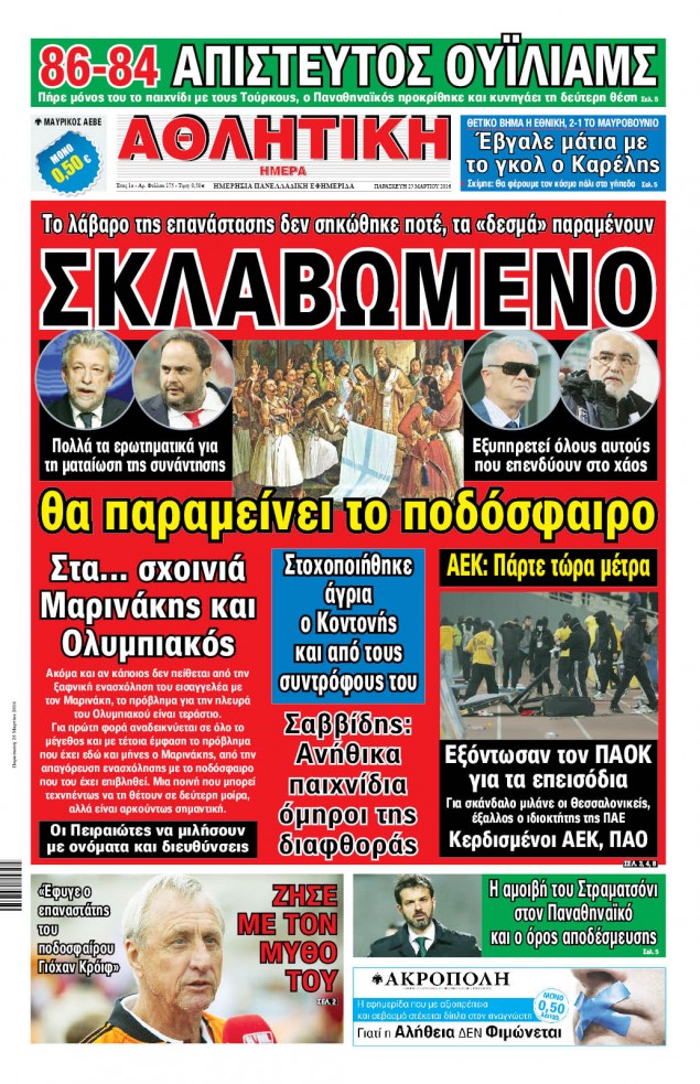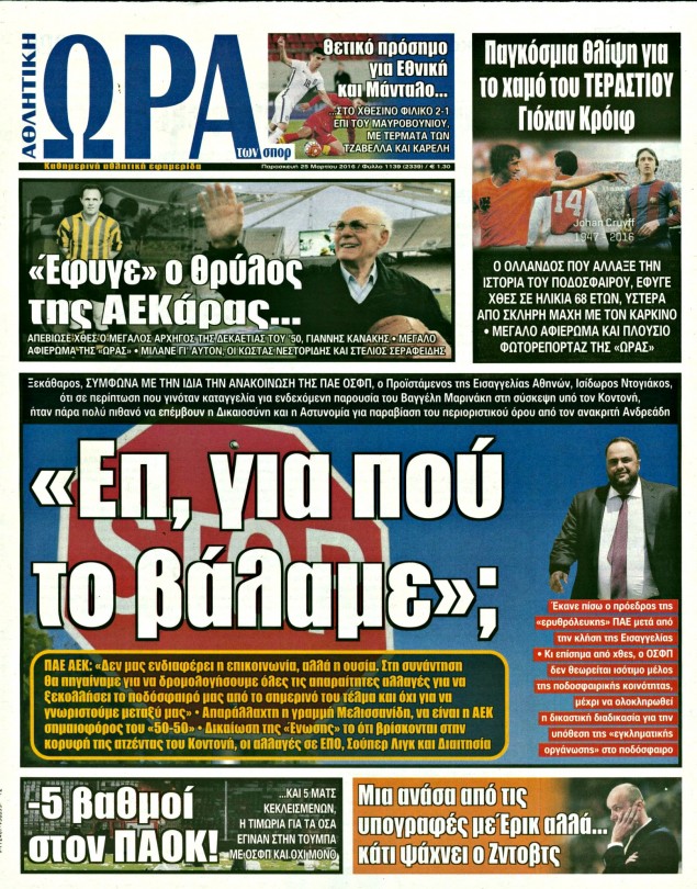 Oι αθλητικές εφημερίδες 25/3/2016 Enikos Newsroom 04:36, Παρασκευή 25 Μαρτίου 2016 Media Διαβάστε τα σημερινά πρωτοσέλιδα των αθλητικών εφημερίδων: ΑΘΛΗΤΙΚΕΣ ΕΦΗΜΕΡΙΔΕΣ ΠΡΩΤΟΣΕΛΙΔΑ Μοιράσου το: σχολίασε κι εσύ (0 σχόλια) Ακολουθήστε το enikos.gr στο Google News και μάθετε πρώτοι όλες τις ειδήσεις Δείτε όλες τις τελευταίες ειδήσεις από την Ελλάδα και τον Κόσμο στο enikos.gr Ειδήσεις Ροή Ειδήσεων 2 ώρες πριν Αυξάνουν την πίεση προς την κυβέρνηση οι αγρότες: Κλείνουν παρακαμπτήριους και ανοίγουν διόδια – Τι θα γίνει τις γιορτές 60 λεπτά πριν ΟΠΕΚΕΠΕ: Προφυλακιστέος ο φερόμενος αρχηγός και ο λογιστής της εγκληματικής οργάνωσης 2 ώρες πριν Φοινικούντα: Το Σάββατο απολογείται ο 30χρονος γιος γνωστού επιχειρηματία της Πλάκας που παραδόθηκε – Όσα είπε στους αστυνομικούς και ο ρόλος του στο έγκλημα 2 ώρες πριν Μπορεί ο Μαδούρο να αντέξει τον αποκλεισμό του Τραμπ; Τι θα χρειαστεί η Ουάσινγκτον για να τον ανατρέψει 3 ώρες πριν Πρίγκιπας Ουίλιαμ – Κέιτ: Η νέα οικογενειακή φωτογραφία για τις Χριστουγεννιάτικες κάρτες του 2025 3 ώρες πριν Ύπνος: Η απλή βραδινή ρουτίνα για να προστατεύσετε τα μαλλιά σας από το κρύο κατά τη διάρκεια του χειμώνα 4 ώρες πριν Manifesting: Πώς να συναντήσετε τον σύντροφο της ζωής σας, ανάλογα με τον μήνα γέννησής σας 2 ημέρες πριν 20 χρόνια τα Χριστούγεννα ξεκινούν στα Public με μεγάλη ποικιλία σε δώρα! 2 ώρες πριν Αρχαιολόγοι ανακάλυψαν ρωμαϊκά τεχνουργήματα από μια πόλη που δεν υπήρξε ποτέ – Τα τρία εντυπωσιακά κτίρια και ο αμφορέας με τις… σαρδέλες 15 λεπτά πριν Βαθμολογία UEFA: Η Πολωνία προσπέρασε την Ελλάδα 31 λεπτά πριν Conference League: Οι ομάδες που προκρίθηκαν στους «16» και τα «ζευγαρώματα» στα νοκ άουτ 39 λεπτά πριν ΑΕΚ – Κραϊόβα 3-2: Επική ανατροπή και πρόκριση στους «16» του Conference League η Ένωση 60 λεπτά πριν ΟΠΕΚΕΠΕ: Προφυλακιστέος ο φερόμενος αρχηγός και ο λογιστής της εγκληματικής οργάνωσης 1 ώρα πριν Αθηνά Μαξίμου: Η τρυφερή ανάρτηση για τα γενέθλια του Αιμίλιου Χειλάκη – «Είναι η εκλεκτική συγγένειά μου, η επιλογή και η ευθύνη μου» ENIKOS NETWORK Σε περίοδο αυξημένης δραστηριότητας η γρίπη στην Ελλάδα-Μέτρα προστασίας από τον ΕΟΔΥ Σκέφτεστε συνέχεια συζητήσεις που έχετε κάνει; Τι σημαίνει αυτό, σύμφωνα με ειδικό Στεγαστικό: Τι λέει η ΠΟΜΙΔΑ για τα νέα μέτρα που ανακοίνωσε ο Κυριάκος Μητσοτάκης Λαγκάρντ: Αισιόδοξη για την ανάπτυξη της Ευρωζώνης, αβέβαιη για τον πληθωρισμό Χαρτογραφώντας το «σημείο χωρίς επιστροφή»: Για πρώτη φορά αποκαλύπτεται με λεπτομέρεια το ακανθώδες όριο της ατμόσφαιρας τ... Η Google καταργεί τη λειτουργία «dark web report» – Πώς θα μπορούν οι χρήστες να διαγράφουν τα δεδομένα τους περισσότερα 17:45 , Πέμπτη 18 Δεκεμβρίου 2025 ROUK ZOUK: Εορταστικό επεισόδιο με καλεσμένους τους πρωταγωνιστές του «Γιατί ρε πατέρα» Το Σάββατο 20 Δεκεμβρίου στις 21:00, η Ζέτα Μακρυπούλια υποδέχεται εκλεκτούς ηθοποιούς που όλο... 17:20 , Πέμπτη 18 Δεκεμβρίου 2025 Άγιος έρωτας: Η Χριστίνα εξομολογείται στον πατέρα Νικόλαο, απόψε στις 21:00 στον Alpha Η Νότα αποφασίζει να εκδικηθεί τον Πέτρο και τον Στέφανο, για χάρη του Λούη, όμως τα πράγματα ... 16:50 , Πέμπτη 18 Δεκεμβρίου 2025 Να μ’ αγαπάς: Ζωή και Φωτεινή συμφιλιώνονται ως μάνα με κόρη, απόψε στις 20:00 Η ταυτότητα του Άγγελου αποκαλύπτεται στο νέο επεισόδιο της σειράς “Να μ’ αγαπάς... 15:52 , Πέμπτη 18 Δεκεμβρίου 2025 Το Σπίτι Δίπλα Στο Ποτάμι: Το καθηλωτικό τελευταίο επεισόδιο για το 2025 απόψε στις 22:30 Καθηλώνει το σημερινό επεισόδιο της σειράς “Το Σπίτι Δίπλα Στο Ποτά