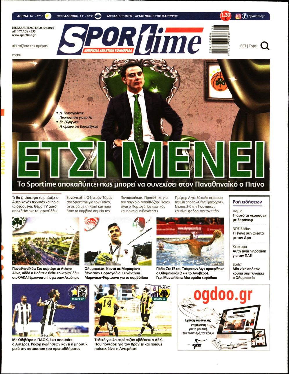 Οι αθλητικές εφημερίδες 25/4/2019 Enikos Newsroom 06:52, Πέμπτη 25 Απριλίου 2019 Media Διαβάστε τα πρωτοσέλιδα των αθλητικών εφημερίδων: ΑΘΛΗΤΙΚΕΣ ΕΦΗΜΕΡΙΔΕΣ ΠΡΩΤΟΣΕΛΙΔΑ Μοιράσου το: σχολίασε κι εσύ (0 σχόλια) Ακολουθήστε το enikos.gr στο Google News και μάθετε πρώτοι όλες τις ειδήσεις Δείτε όλες τις τελευταίες ειδήσεις από την Ελλάδα και τον Κόσμο στο enikos.gr Ειδήσεις Ροή Ειδήσεων 8 ώρες πριν Χριστούγεννα στα μπλόκα: Επιμένουν στις κινητοποιήσεις τους οι αγρότες – Ανοίγουν τα διόδια το Σαββατοκύριακο 8 ώρες πριν Ουκρανία: Η άνευ προηγουμένου επίθεση σε ρωσικό τάνκερ στη Μεσόγειο και το μήνυμα προς στον Πούτιν – Το «μακρύ χέρι» του Κιέβου 7 ώρες πριν Πούτιν: Τα μηνύματα σε Ευρώπη και ΝΑΤΟ από το μαραθώνιο «σόου» του – Η απαίτηση για «σεβασμό» και η ειρήνη «με τους όρους» της Μόσχας 6 ώρες πριν ΗΠΑ: Η κυβέρνηση του Ντόναλντ Τραμπ άρχισε να δημοσιοποιεί τα αρχεία Έπσταϊν 7 ώρες πριν Άνω Λιόσια: Πυροβολισμοί σε επιχείρηση με χαλιά – Εντοπίστηκαν 10 κάλυκες 14 λεπτά πριν Αυγά: Πόσα μπορείτε να τρώτε την ημέρα με ασφάλεια για μέγιστη πρόσληψη πρωτεΐνης 44 λεπτά πριν Τα ζώδια σήμερα, Σάββατο 20 Δεκεμβρίου: Παρθένοι, το σύμπαν σας δίνει το κλειδί 7 ώρες πριν Ανακαλύφθηκαν αρχαία χρυσά νομίσματα 2.200 ετών που απεικονίζουν τον θεό Απόλλωνα – Η άγνωστη σύνδεση με τον Φίλιππο Β΄ της Μακεδονίας 8 ώρες πριν Ύπνος: Μια κρυφή κατάσταση του εγκεφάλου πριν από τον ύπνο μπορεί να είναι το “κλειδί” για υψηλή ευφυΐα και δημιουργικότητα 6 λεπτά πριν Σαρωτικοί οι έλεγχοι στους δρόμους ενόψει εορτών – Μπλόκα της τροχαίας σε κεντρικές αρτηρίες της Αττικής 14 λεπτά πριν Αυγά: Πόσα μπορείτε να τρώτε την ημέρα με ασφάλεια για μέγιστη πρόσληψη πρωτεΐνης 21 λεπτά πριν Σαν σήμερα 20 Δεκεμβρίου: Τα σημαντικότερα γεγονότα της ημέρας 25 λεπτά πριν Οι οικονομικές εφημερίδες 20/12/2025 31 λεπτά πριν Οι αθλητικές εφημερίδες 20/12/2025 ENIKOS NETWORK Το ΕΚΑΒ τιμήθηκε από την Ακαδημία Αθηνών για τα 40 χρόνια προσφοράς του Έχετε πραγματικά μεγάλη καρδιά; 10 χαρακτηριστικά όσων έχουν καλοσύνη Αναστολή μέτρων αναγκαστικής εκτέλεσης για κτηνοτρόφους που πλήττονται από την ευλογιά των αιγοπροβάτων Πλήρης επάρκεια προϊόντων στις λαϊκές της Αττικής, παρά τις αγροτικές κινητοποιήσεις – Τι απαντούν οι πωλητές Χαρτογραφώντας το «σημείο χωρίς επιστροφή»: Για πρώτη φορά αποκαλύπτεται με λεπτομέρεια το ακανθώδες όριο της ατμόσφαιρας τ... Η Google καταργεί τη λειτουργία «dark web report» – Πώς θα μπορούν οι χρήστες να διαγράφουν τα δεδομένα τους περισσότερα 05:48 , Σάββατο 20 Δεκεμβρίου 2025 Οι οικονομικές εφημερίδες 20/12/2025 Διαβάστε τα πρωτοσέλιδα από τις οικονομικές εφημερίδες, σήμερα 20/12/2025. 05:43 , Σάββατο 20 Δεκεμβρίου 2025 Οι αθλητικές εφημερίδες 20/12/2025 Διαβάστε τα πρωτοσέλιδα από τις αθλητικές εφημερίδες, σήμερα 20/12/2025. 05:38 , Σάββατο 20 Δεκεμβρίου 2025 Οι πολιτικές εφημερίδες 20/12/2025 Διαβάστε τα πρωτοσέλιδα από τις πολιτικές εφημερίδες, σήμερα 20/12/2025. 04:20 , Σάββατο 20 Δεκεμβρίου 2025 Αγγελική Νικολούλη: Τα συλλυπητήρια για την απώλεια της Ειρήνης Μαρινάκη Τα συλληπητήρια στον πρόεδρο του Mega, τον Βαγγέλη Μαρινάκη, για την απώλεια της μητέρας του Ε... ΤΕΛΕΥΤΑΙΕΣ ΕΙΔΗΣΕΙΣ 6 λεπτά πριν Σαρωτικοί οι έλεγχοι στους δρόμους ενόψει εορτών –... 14 λεπτά πριν Αυγά: Πόσα μπορείτε να τρώτε την ημέρα με ασφάλεια για... 21 λεπτά πριν Σαν σήμερα 20 Δεκεμβρίου: Τα σημαντικότερα γεγονότα... 25 λεπτά πριν Οι οικονομικές εφημερίδες 20/12/2025 31 λεπτά πριν Οι αθλητικές εφημερίδες 20/12/2025 35 λεπτά πρ