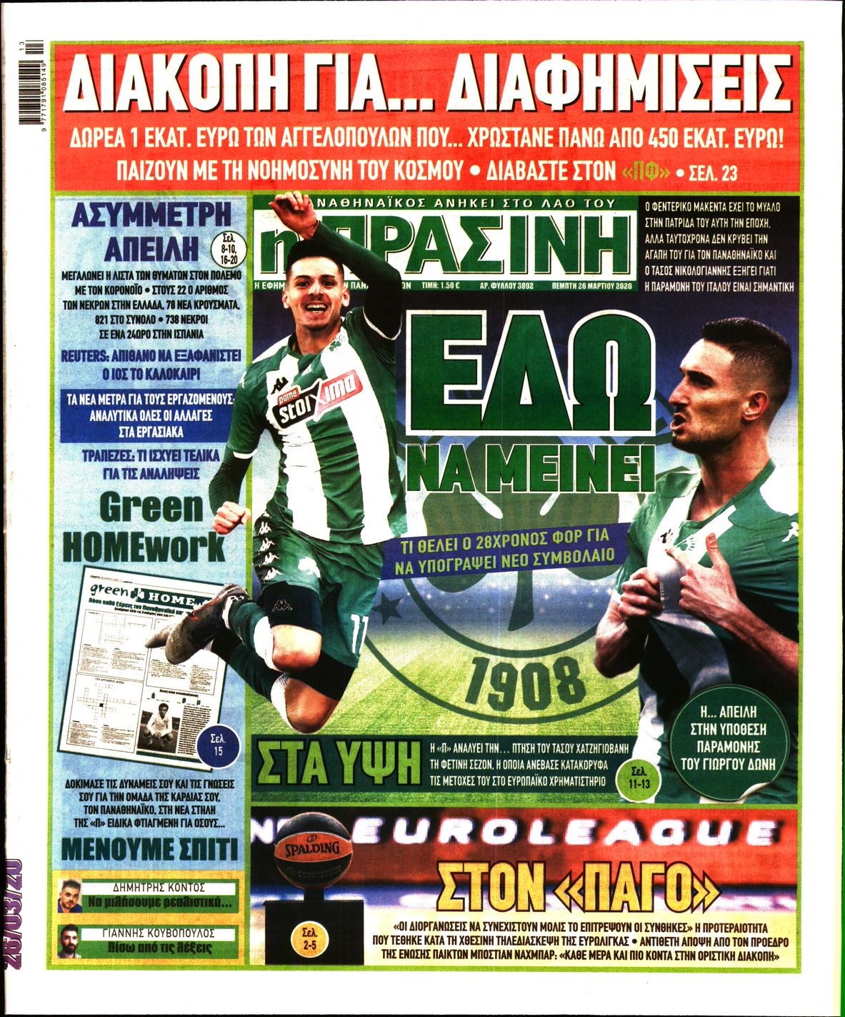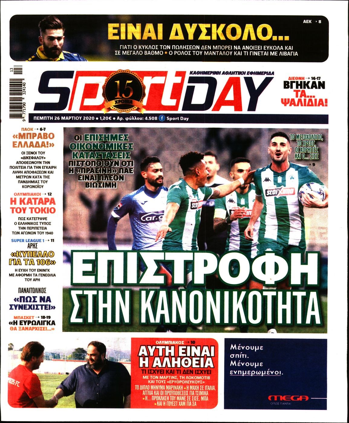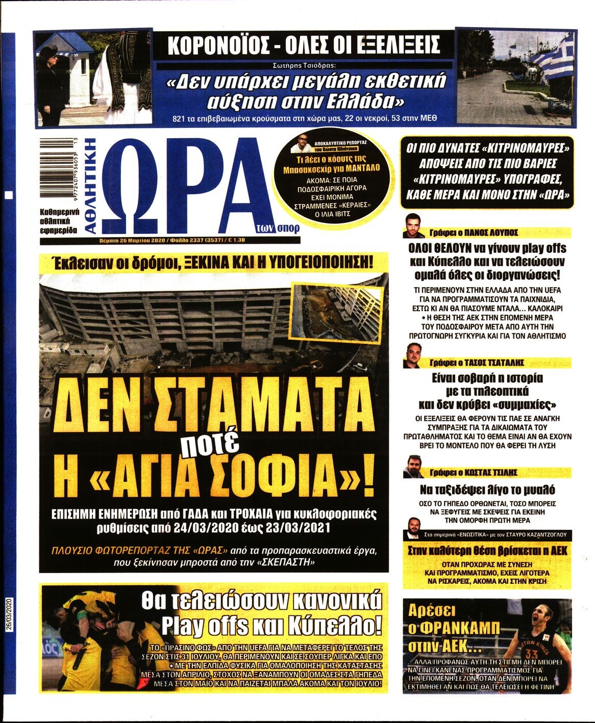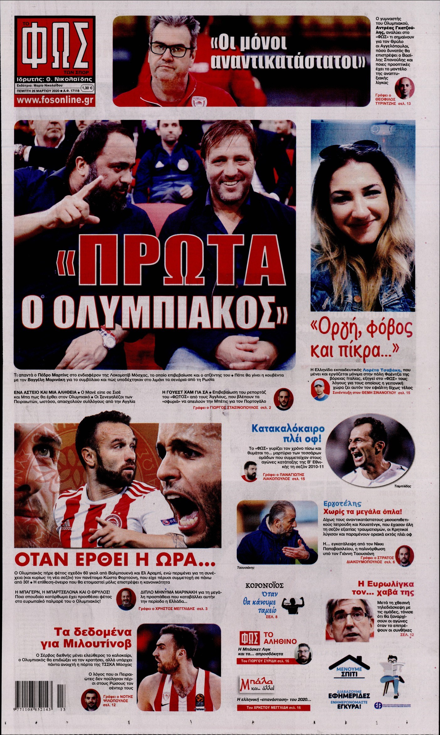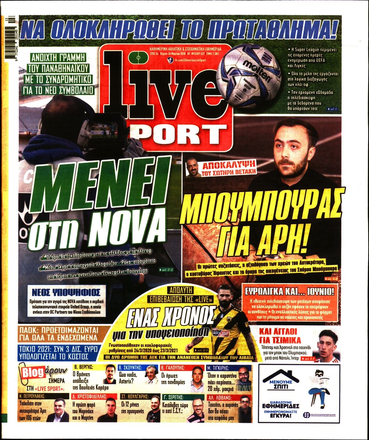Οι αθλητικές εφημερίδες 26/3/2020 Διονύσης Νίκκας 06:34, Πέμπτη 26 Μαρτίου 2020 Media Διαβάστε τα πρωτοσέλιδα των αθλητικών εφημερίδων… ΑΘΛΗΤΙΚΕΣ ΕΦΗΜΕΡΙΔΕΣ ΠΡΩΤΟΣΕΛΙΔΑ Μοιράσου το: σχολίασε κι εσύ (0 σχόλια) Ακολουθήστε το enikos.gr στο Google News και μάθετε πρώτοι όλες τις ειδήσεις Δείτε όλες τις τελευταίες ειδήσεις από την Ελλάδα και τον Κόσμο στο enikos.gr Ειδήσεις Ροή Ειδήσεων 7 λεπτά πριν Αγρότες: Την Τρίτη η απόφαση για διάλογο ή κλιμάκωση των κινητοποιήσεών τους – Πώς χαρακτηρίζουν τις ανακοινώσεις Τσιάρα και οι επόμενες κινήσεις 3 ώρες πριν Δημοσκόπηση Alco: Στο 23,6% η ΝΔ, στο 11,6% το ΠΑΣΟΚ – Η άποψη των πολιτών για αγρότες, εκλογές και Τσίπρα 2 ώρες πριν Ουκρανία: Έπληξε ρωσικό υποβρύχιο στο Νοβορισίσκ με υποθαλάσσιο drone – ΒΙΝΤΕΟ 6 ώρες πριν Κυψέλη: Για πρώτη ημέρα βρισκόταν στο σχολείο η 16χρονη που επιτέθηκε με μαχαίρι στην 14χρονη – Τι αναφέρουν μαρτυρίες μαθητών για το επεισόδιο 3 ώρες πριν Επιστήμονες αποκαλύπτουν πότε μπορεί να εξαφανιστούν οι παγετώνες της Γης – Υπό απειλή πασίγνωστες οροσειρές του πλανήτη 2 ώρες πριν Αριθμολογία: Ο τυχερός σας αριθμός, ανάλογα με τον μήνα γέννησής σας 4 ώρες πριν Γάμος: Αν ένας άνδρας νιώθει βαθιά μοναξιά, θα αρχίσει να κάνει αυτά τα 11 πράγματα μέσα στο σπίτι 3 ώρες πριν Πώς να μην μαραίνονται γρήγορα τα κομμένα λουλούδια: Το λάθος στην τοποθέτηση του βάζου που πρέπει να αποφεύγετε 46 λεπτά πριν Ύπνος: Η αρχαία μορφή άσκησης που αποδεικνύεται αποτελεσματική στην αντιμετώπιση της αϋπνίας, σύμφωνα με μελέτη 7 λεπτά πριν Αγρότες: Την Τρίτη η απόφαση για διάλογο ή κλιμάκωση των κινητοποιήσεών τους – Πώς χαρακτηρίζουν τις ανακοινώσεις Τσιάρα και οι επόμενες κινήσεις 12 λεπτά πριν Θεσσαλονίκη: 44χρονος επιχείρησε να πνίξει με κορδόνια την σύντροφό του μπροστά στον 14χρονο γιο 16 λεπτά πριν Χαλκιδική: Πώς δρούσαν οι αστυνομικοί που συνελήφθησαν για κλήσεις που δεν έκοβαν – Η «ετήσια συνδρομή» για τα μπλόκα της Τροχαίας και οι «δωρεές» 23 λεπτά πριν Έφοδος της ΕΛΑΣ σε ενεχυροδανειστήριο στην Ομόνοια – Έλιωναν κλοπιμαία στο πίσω μέρος του καταστήματος – ΒΙΝΤΕΟ 28 λεπτά πριν Κοινό ανακοινωθέν των Ευρωπαίων για την Ουκρανία: «Καμία εδαφική παραχώρηση μέχρι να εφαρμοστούν οι εγγυήσεις ασφάλειας» ENIKOS NETWORK Πότε το χρόνιο ροχαλητό να αποτελέσει ένδειξη κινδύνου για την καρδιά; Τι λένε οι ειδικοί Μάριος Θεμιστοκλέους: Το ΕΣΥ ενισχύεται, εκσυγχρονίζεται, αλλάζει Ελεύθεροι επαγγελματίες: Οι κερδισμένοι και οι χαμένοι για το 2026 Νέες υποχρεώσεις για συγκεκριμένες εισαγωγές από 1 Ιανουαρίου 2026 – Tι πρέπει να γνωρίζουν οι επιχειρήσεις Σύγχρονος Νοστράδαμος: Προειδοποιεί για «μεγάλο γεγονός» τους επόμενους μήνες που θα συγκλονίσει τη Βρετανία και τον κόσμο Τεστ παρατηρητικότητας: Μπορείτε να βρείτε τις 3 διαφορές στις εικόνες με έναν πιγκουίνο σε 14 δευτερόλεπτα περισσότερα 21:35 , Δευτέρα 15 Δεκεμβρίου 2025 Το Σπίτι Δίπλα Στο Ποτάμι: Η Ιουλία και ο Φωκάς μετακομίζουν στη Ρόδο – Δύο νέοι χαρακτήρες μπαίνουν στη σειρά Δύο νέοι, κομβικοί χαρακτήρες κάνουν την εμφάνισή τους αυτή την εβδομάδα στην αγαπημένη σειρά ... 19:46 , Δευτέρα 15 Δεκεμβρίου 2025 Άγιος έρωτας: Η Χριστίνα λέει την αλήθεια στον Αντρέα Ο Βασίλης δέχεται επίθεση από τους συμμαθητές του, η Αναστασία είναι συντετριμμένη με την απώλ... 18:45 , Δευτέρα 15 Δεκεμβρίου 2025 Συνέδριο «Ελληνικός Τουρισμός 2025, Μια εθνική υπόθεση!» – «Ο Θαλάσσιος Πυλώνας ως Ενιαία Στρατηγική: Συνέργειες σε Λιμάνια, Μ