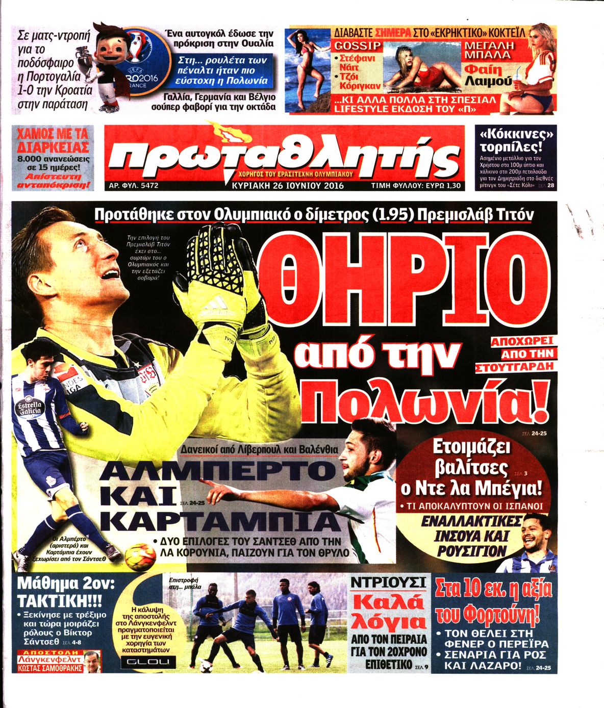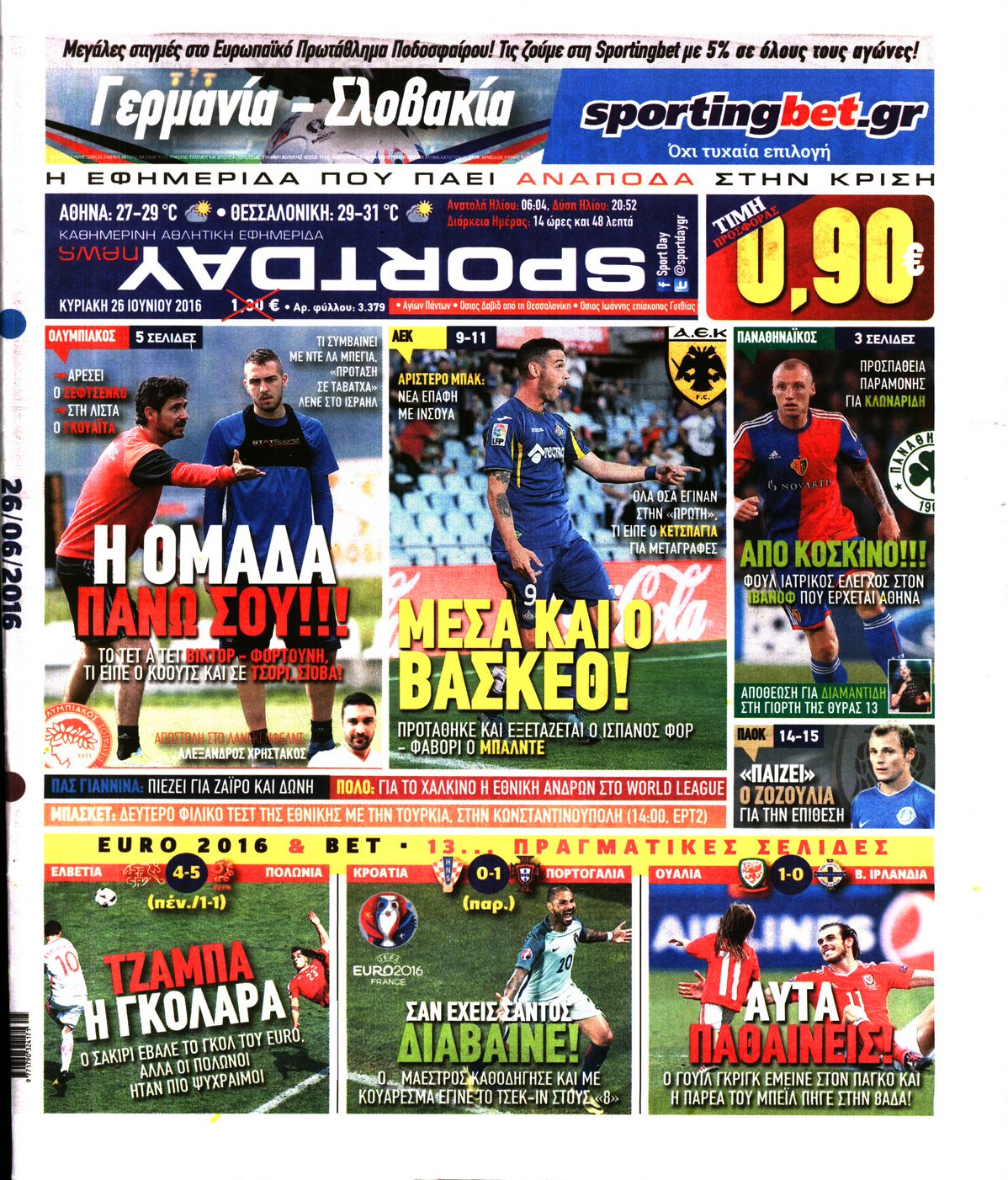 Oι αθλητικές εφημερίδες 26/6/2016 Enikos Newsroom 06:06, Κυριακή 26 Ιουνίου 2016 Media Διαβάστε τα σημερινά πρωτοσέλιδα των αθλητικών εφημερίδων: ΑΘΛΗΤΙΚΕΣ ΕΦΗΜΕΡΙΔΕΣ ΠΡΩΤΟΣΕΛΙΔΑ Μοιράσου το: σχολίασε κι εσύ (0 σχόλια) Ακολουθήστε το enikos.gr στο Google News και μάθετε πρώτοι όλες τις ειδήσεις Δείτε όλες τις τελευταίες ειδήσεις από την Ελλάδα και τον Κόσμο στο enikos.gr Ειδήσεις Ροή Ειδήσεων 2 ώρες πριν Κυριάκος Μητσοτάκης: «Κάποιοι αγρότες δεν αισθάνονται την ανάγκη να διαφωνήσουν με τις προτάσεις της κυβέρνησης, η Ευρώπη στέκεται στο πλευρό της Ουκρανίας» 7 ώρες πριν ΟΠΕΚΕΠΕ: Προφυλακιστέος ο φερόμενος αρχηγός και ο λογιστής της εγκληματικής οργάνωσης 8 ώρες πριν Αυξάνουν την πίεση προς την κυβέρνηση οι αγρότες: Κλείνουν παρακαμπτήριους και ανοίγουν διόδια – Τι θα γίνει τις γιορτές 8 ώρες πριν Φοινικούντα: Το Σάββατο απολογείται ο 30χρονος γιος γνωστού επιχειρηματία της Πλάκας που παραδόθηκε – Όσα είπε στους αστυνομικούς και ο ρόλος του στο έγκλημα 7 ώρες πριν ΑΕΚ – Κραϊόβα 3-2: Επική ανατροπή και πρόκριση στους «16» του Conference League η Ένωση 8 ώρες πριν Αρχαιολόγοι ανακάλυψαν ρωμαϊκά τεχνουργήματα από μια πόλη που δεν υπήρξε ποτέ – Τα τρία εντυπωσιακά κτίρια και ο αμφορέας με τις… σαρδέλες 9 ώρες πριν Ύπνος: Η απλή βραδινή ρουτίνα για να προστατεύσετε τα μαλλιά σας από το κρύο κατά τη διάρκεια του χειμώνα 10 ώρες πριν Manifesting: Πώς να συναντήσετε τον σύντροφο της ζωής σας, ανάλογα με τον μήνα γέννησής σας 2 ημέρες πριν 20 χρόνια τα Χριστούγεννα ξεκινούν στα Public με μεγάλη ποικιλία σε δώρα! 6 λεπτά πριν Θανατηφόρο τροχαίο στην Νέα Φιλαδέλφεια: Νεκρός ένας αναβάτης μηχανής ύστερα από σύγκρουση με τρόλεϊ 12 λεπτά πριν ΔΕΔΔΗΕ: Διακοπές ρεύματος σήμερα (19/12) στην Αθήνα και σε άλλες 12 περιοχές της Αττικής 28 λεπτά πριν Φρίντριχ Μερτς: Χορήγηση άτοκου δανείου στην Ουκρανία συμφώνησαν τα κράτη – μέλη της ΕΕ 35 λεπτά πριν Απειλή για το Προϋπολογισμό τα ληξιπρόθεσμα χρέη των ιδιωτών προς την εφορία 36 λεπτά πριν Πέντε νεκροί σε πλήγματα των ΗΠΑ κατά δύο σκαφών που φέρεται να μετέφεραν ναρκωτικά στον Ανατολικό Ειρηνικό ENIKOS NETWORK Μόνο όσοι σκανάρουν με ταχύτητα ΑΙ μπορούν να εντοπίσουν τον διαφορετικό αριθμό ανάμεσα στο πλέγμα των 68 και να λύσουν το ... Η τροφή του πόθου που μπορεί να ανακουφίσει από ενοχλήσεις στο στομάχι και από τα συμπτώματα του Raynaud Στεγαστικό: Τι λέει η ΠΟΜΙΔΑ για τα νέα μέτρα που ανακοίνωσε ο Κυριάκος Μητσοτάκης Λαγκάρντ: Αισιόδοξη για την ανάπτυξη της Ευρωζώνης, αβέβαιη για τον πληθωρισμό Χαρτογραφώντας το «σημείο χωρίς επιστροφή»: Για πρώτη φορά αποκαλύπτεται με λεπτομέρεια το ακανθώδες όριο της ατμόσφαιρας τ... Η Google καταργεί τη λειτουργία «dark web report» – Πώς θα μπορούν οι χρήστες να διαγράφουν τα δεδομένα τους περισσότερα 05:48 , Παρασκευή 19 Δεκεμβρίου 2025 Οι οικονομικές εφημερίδες 19/12/2025 Διαβάστε τα πρωτοσέλιδα από τις οικονομικές εφημερίδες, σήμερα 19/12/2025. 05:43 , Παρασκευή 19 Δεκεμβρίου 2025 Οι αθλητικές εφημερίδες 19/12/2025 Διαβάστε τα πρωτοσέλιδα από τις αθλητικές εφημερίδες, σήμερα 19/12/2025. 05:38 , Παρασκευή 19 Δεκεμβρίου 2025 Οι πολιτικές εφημερίδες 19/12/2025 Διαβάστε τα πρωτοσέλιδα από τις πολιτικές εφημερίδες, σήμερα 19/12/2025. 02:50 , Παρασκευή 19 Δεκεμβρίου 2025 GNTM: «Κλείδωσαν» οι τέσσερις φιναλίστ – Μεγάλη ανατροπή στις τελευταίες αποχωρήσεις Για προτελευταία φορά εμφανίστηκαν στο πλατό του GNTM οι φιναλίστ του φετινού κύκλου, το βράδυ... ΤΕΛΕΥΤΑΙΕΣ ΕΙΔΗΣΕΙΣ 6 λεπτά πριν Θανατηφόρο τροχαίο 