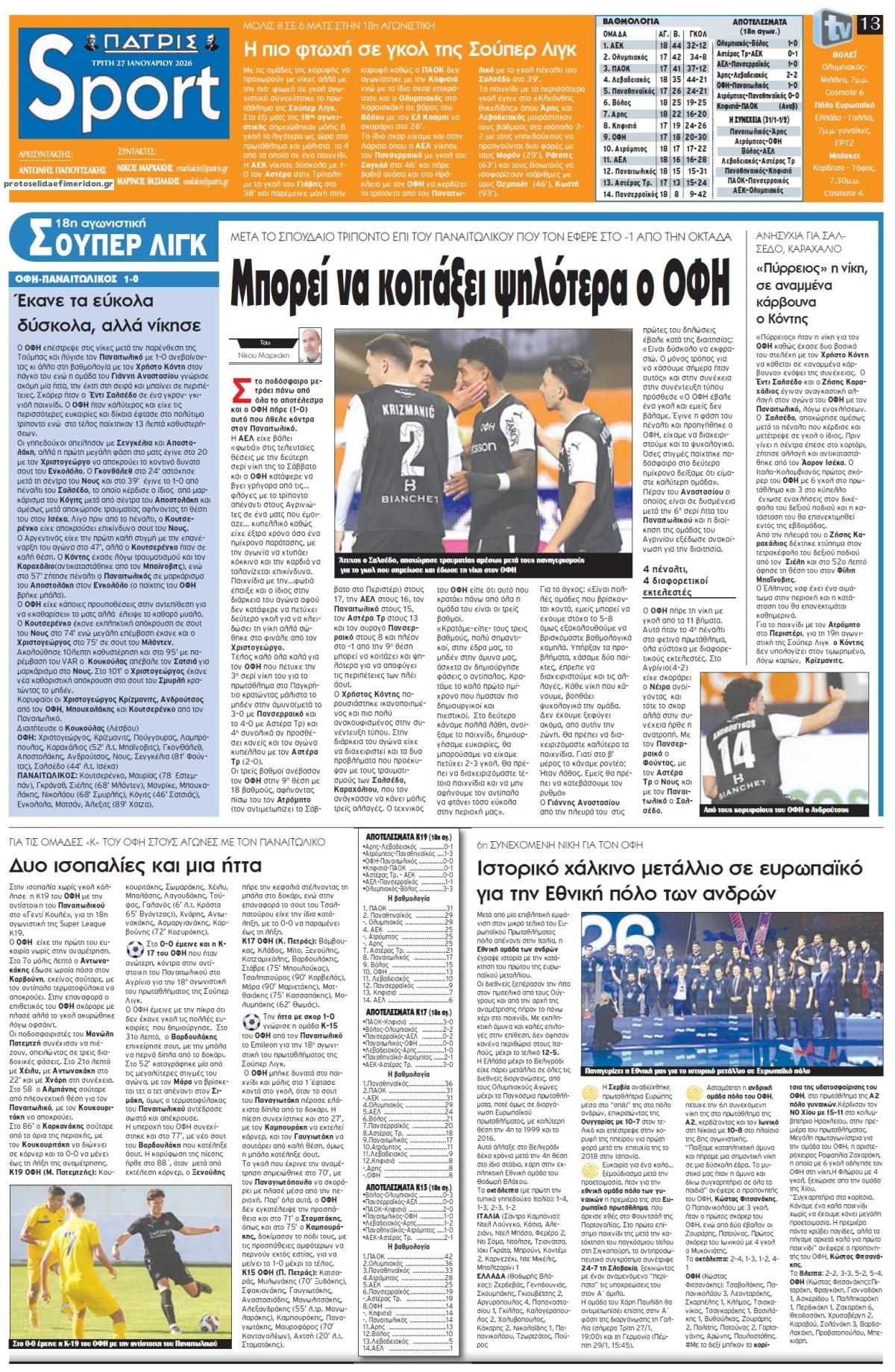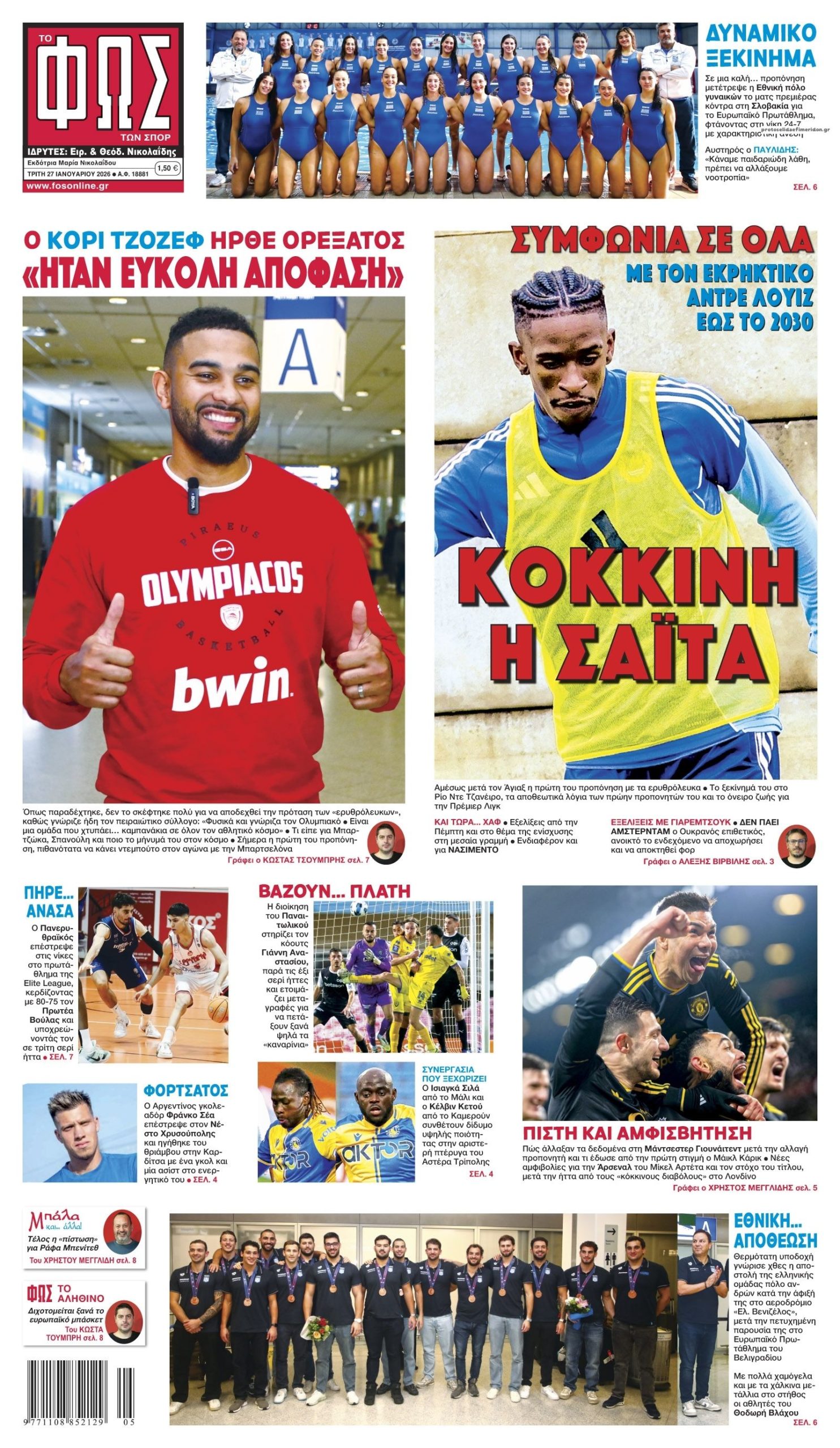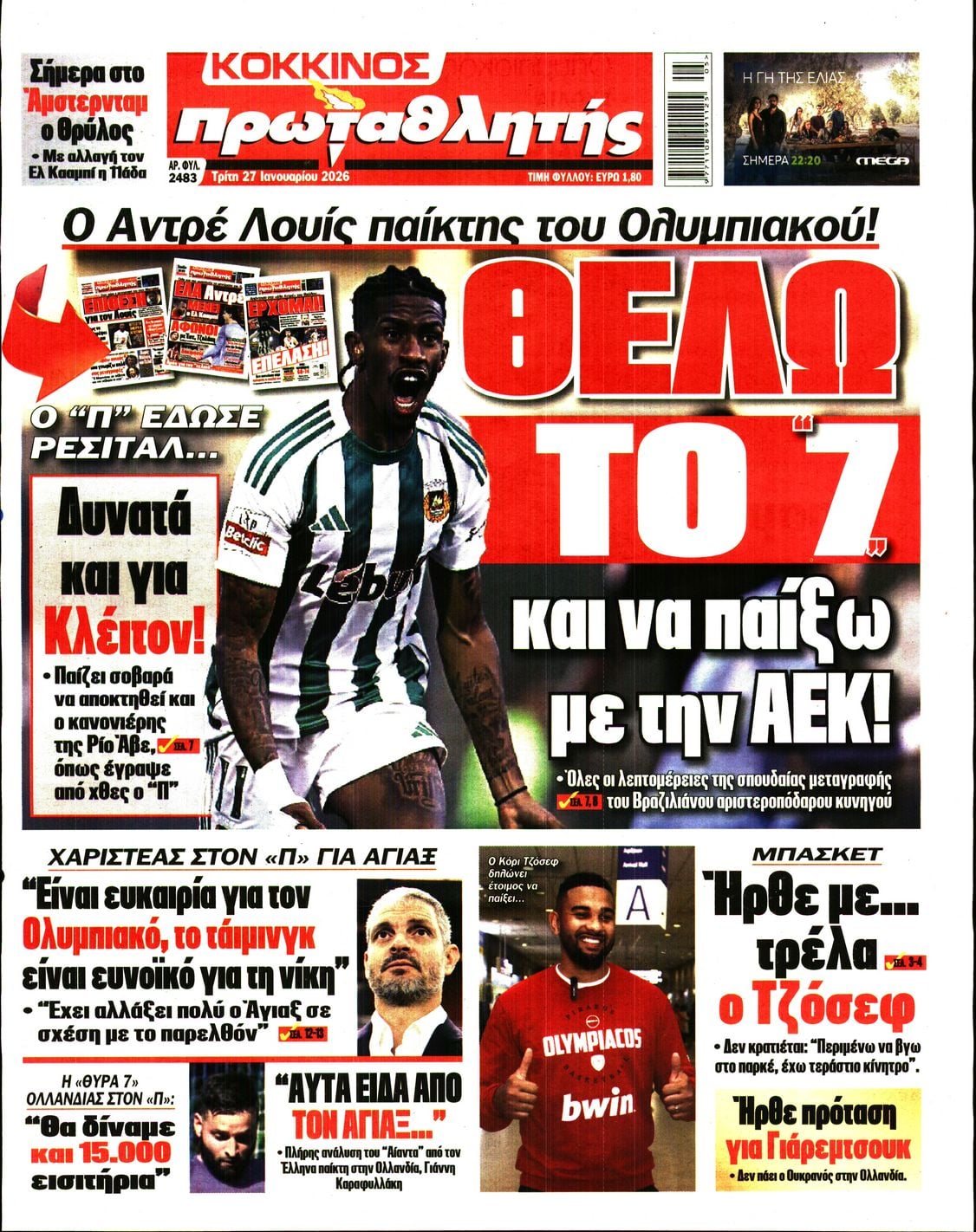 Οι αθλητικές εφημερίδες 27/1/2026 Enikos Newsroom 05:43, Τρίτη 27 Ιανουαρίου 2026 Media Διαβάστε τα πρωτοσέλιδα από τις αθλητικές εφημερίδες, σήμερα 27/1/2026. ΑΘΛΗΤΙΚΕΣ ΕΦΗΜΕΡΙΔΕΣ ΕΦΗΜΕΡΙΔΕΣ ΠΡΩΤΟΣΕΛΙΔΑ Μοιράσου το: Η Παρί Σεν Ζερμέν ανακοίνωσε την «αρπαγή» του 18χρονου Ντρο Φερνάντες απ’ την Μπαρτσελόνα Premier League: Απόλυτη και δίκαιη… μοιρασιά ανάμεσα σε Έβερτον και Λιντς (1-1) – Όλα τα αποτελέσματα και η βαθμολογία Άγνωστο το πότε θα επιστρέψει ο Γιάννης Αντετοκούνμπο μετά τον τραυματισμό του στη γάμπα σχολίασε κι εσύ (0 σχόλια) Ακολουθήστε το enikos.gr στο Google News και μάθετε πρώτοι όλες τις ειδήσεις Δείτε όλες τις τελευταίες ειδήσεις από την Ελλάδα και τον Κόσμο στο enikos.gr Ειδήσεις Ροή Ειδήσεων 9 ώρες πριν Τρίκαλα – Έκρηξη στο εργοστάσιο «Βιολάντα»: Θρήνος για τις 5 εργαζόμενες που δούλευαν νύχτα για να είναι κοντά στα παιδιά τους – Πού στρέφονται οι έρευνες 12 ώρες πριν Ανατολική Αττική: Οι δραματικές στιγμές διάσωσης των 2 επιβατών του αυτοκινήτου που παρασύρθηκε από χείμαρρο – «Αν δεν είχε “σφηνώσει” στα καλάμια, θα θρηνούσαμε θύματα» 8 ώρες πριν Τραμπ: Ισοπεδώνει το Σύνταγμα και αποδυναμώνει την ICE μετατρέποντάς την σε φόβητρο των πολιτών – Τα σχέδια νοθείας των ενδιάμεσων εκλογών 11 ώρες πριν Δήμαρχος Σιντικής στο enikos.gr: Περνάμε δύσκολες στιγμές, είναι κρίσιμη η κατάσταση – Εάν συνεχίσει η βροχή θα κινδυνεύσει το Σιδηρόκαστρο – ΒΙΝΤΕΟ 10 ώρες πριν ΗΠΑ: Τουλάχιστον 21 νεκροί από το πολικό ψύχος – Στο σκοτάδι πάνω από 800.000 νοικοκυριά, έχουν ακυρωθεί 19.000 πτήσεις – ΦΩΤΟ 50 λεπτά πριν Οπτική ψευδαίσθηση: Μόνο αν είσαι ο Σέρλοκ Χολμς θα βρεις τα 6 πουλάκια σε 15 δευτερόλεπτα 1 ώρα πριν Μακροζωία: Η τροφή που μπορεί να σας βοηθήσει να ζήσετε μέχρι τα 100, σύμφωνα με ειδικό 4 ώρες πριν Τα ζώδια σήμερα, Τρίτη 27 Ιανουαρίου 2026: Αιγόκεροι, μην περιμένετε από τους άλλους να σας πουν αν αξίζετε 10 ώρες πριν Αριθμολογία: Οι γρουσούζικοι αριθμοί για κάθε ζώδιο – «Καλύτερα να τους αποφεύγετε» 35 λεπτά πριν ΔΕΔΔΗΕ: Διακοπές ρεύματος σήμερα (27/1) στην Αθήνα και σε άλλες 8 περιοχές της Αττικής 50 λεπτά πριν Οπτική ψευδαίσθηση: Μόνο αν είσαι ο Σέρλοκ Χολμς θα βρεις τα 6 πουλάκια σε 15 δευτερόλεπτα 57 λεπτά πριν Είδος πολυτελείας για τους Έλληνες καταναλωτές ο καθημερινός καφές – Ανατιμήθηκε 20,9% σε ένα χρόνο, ενώ παγκοσμίως η τιμή του πέφτει – Δείτε βίντεο 1 ώρα πριν Μακροζωία: Η τροφή που μπορεί να σας βοηθήσει να ζήσετε μέχρι τα 100, σύμφωνα με ειδικό 1 ώρα πριν Σαν σήμερα 27 Ιανουαρίου: Τα σημαντικότερα γεγονότα της ημέρας ENIKOS NETWORK Βρείτε τις 3 διαφορές στη φωτό με το αγόρι που φωνάζει στην κορυφή του βουνού μέσα σε 29″ και λύστε το τεστ παρατηρητικότητ... Το βότανο της μεσαιωνικής Ευρώπης που μπορεί να μειώσει τη φλεγμονή και να έχει αντικαρκινική δράση Συντάξεις: Πόσο βελτιωμένες αναμένονται το 2026, λόγω των αυξήσεων – Οι μεγαλύτερες και οι μικρότερες Επίδομα παιδιού: Πότε αναμένονται οι αλλαγές για το 2026 – Τι μένει ίδιο AI: Ολοκληρώστε τις δουλειές σας φωνάζοντας στο τηλέφωνό σας – Πώς λειτουργεί το Todoist Ramble Κουίζ: Πόσο καλοί είστε στην ελληνική μυθολογία; Δοκιμάστε τις γνώσεις σας και κάντε το 3 στα 3 περισσότερα 04:50 , Τρίτη 27 Ιανουαρίου 2026 MasterChef: Ποιοί είναι οι δύο πρώτοι διαγωνιζόμενοι που αποχώρησαν με το «καλημέρα» – Δείτε βίντεο Απαιτητική από τα πρώτα ήδη λεπτά αποδείχθηκε η πρώτη μαγειρική δοκιμασία του MasterChef τη Δε... 21:30 , Δευτέρα 26 Ιανουαρίου 2026 Άγιος έρωτας: Ο Μαρκόπουλος συναντά για πρώτη φορ